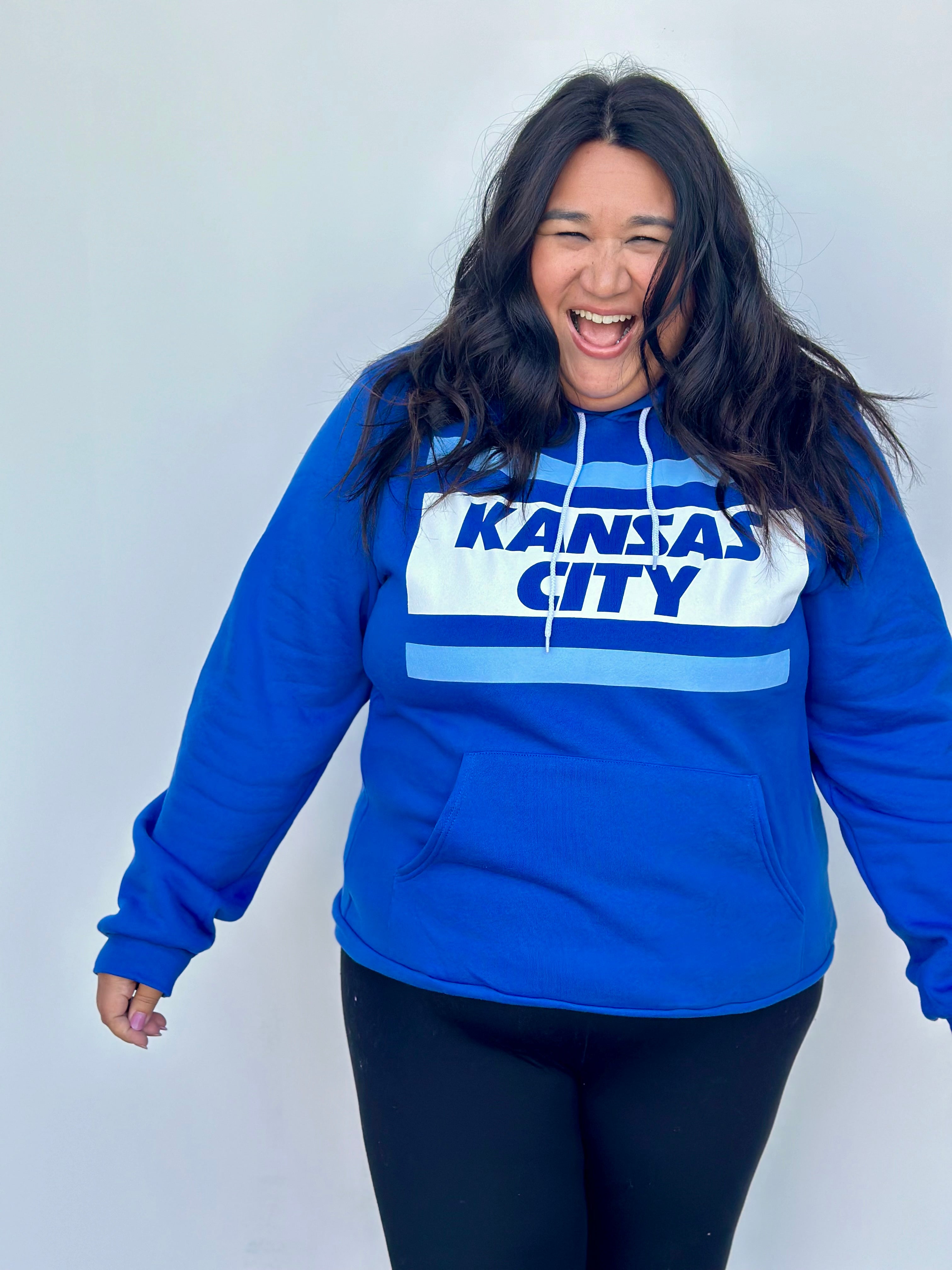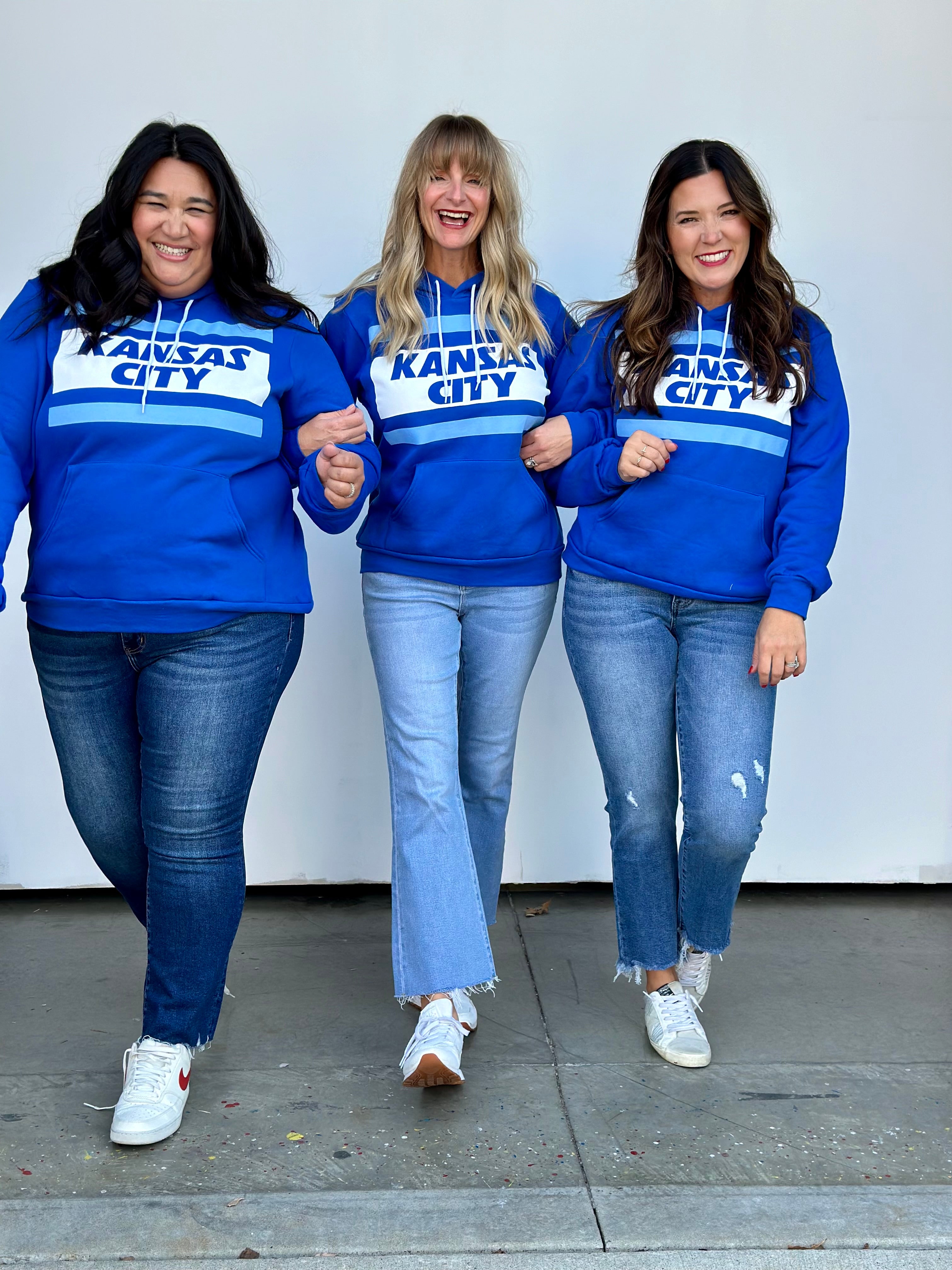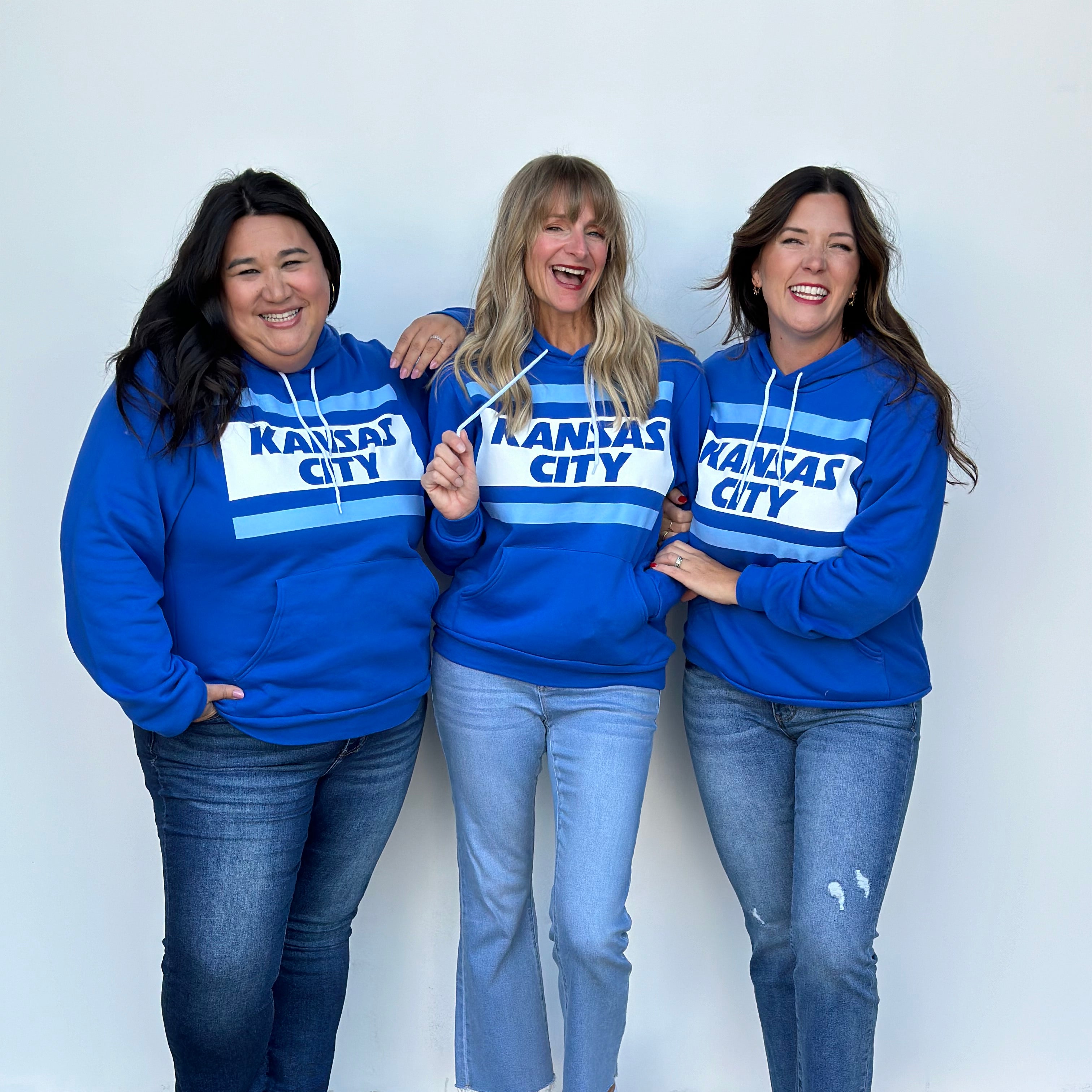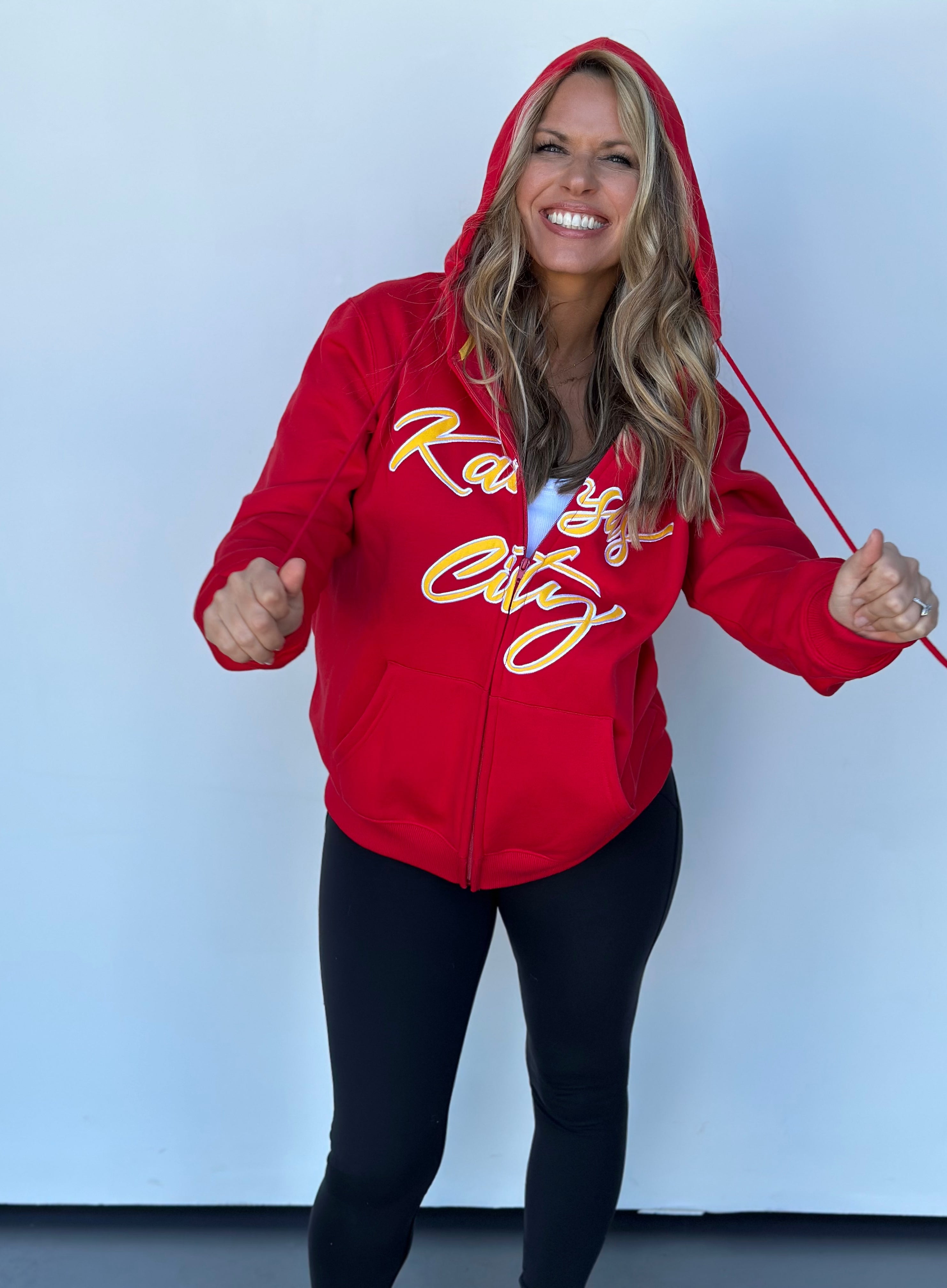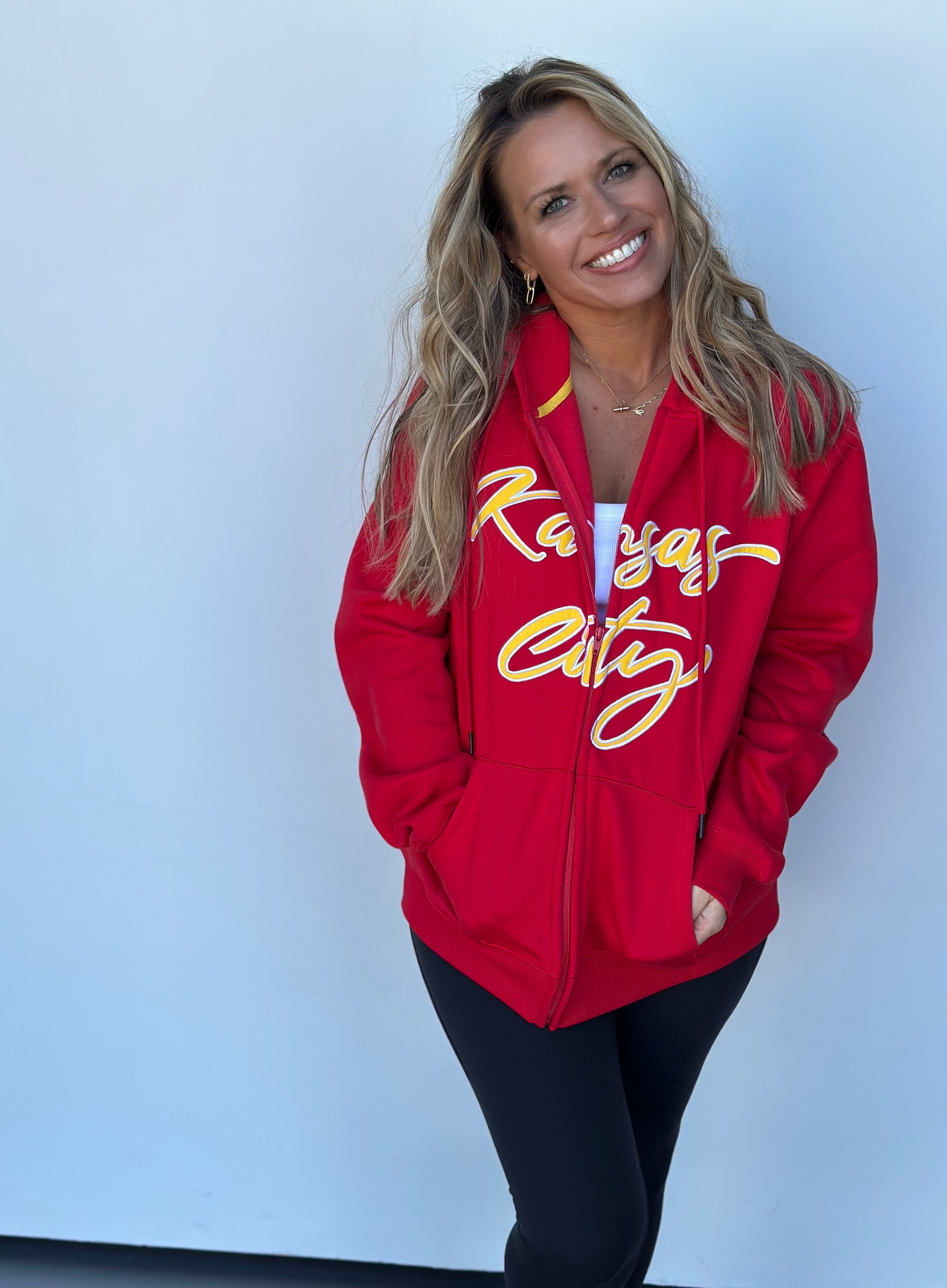 This oversized button-up cardi brings that vintage varsity vibe with a bold KC twist. Made in a vibrant game-day red with gold and white striping on the sleeves and hem, it features a detailed embroidered helmet patch on the front and “Kansas City” across the back for the ultimate fan finish.