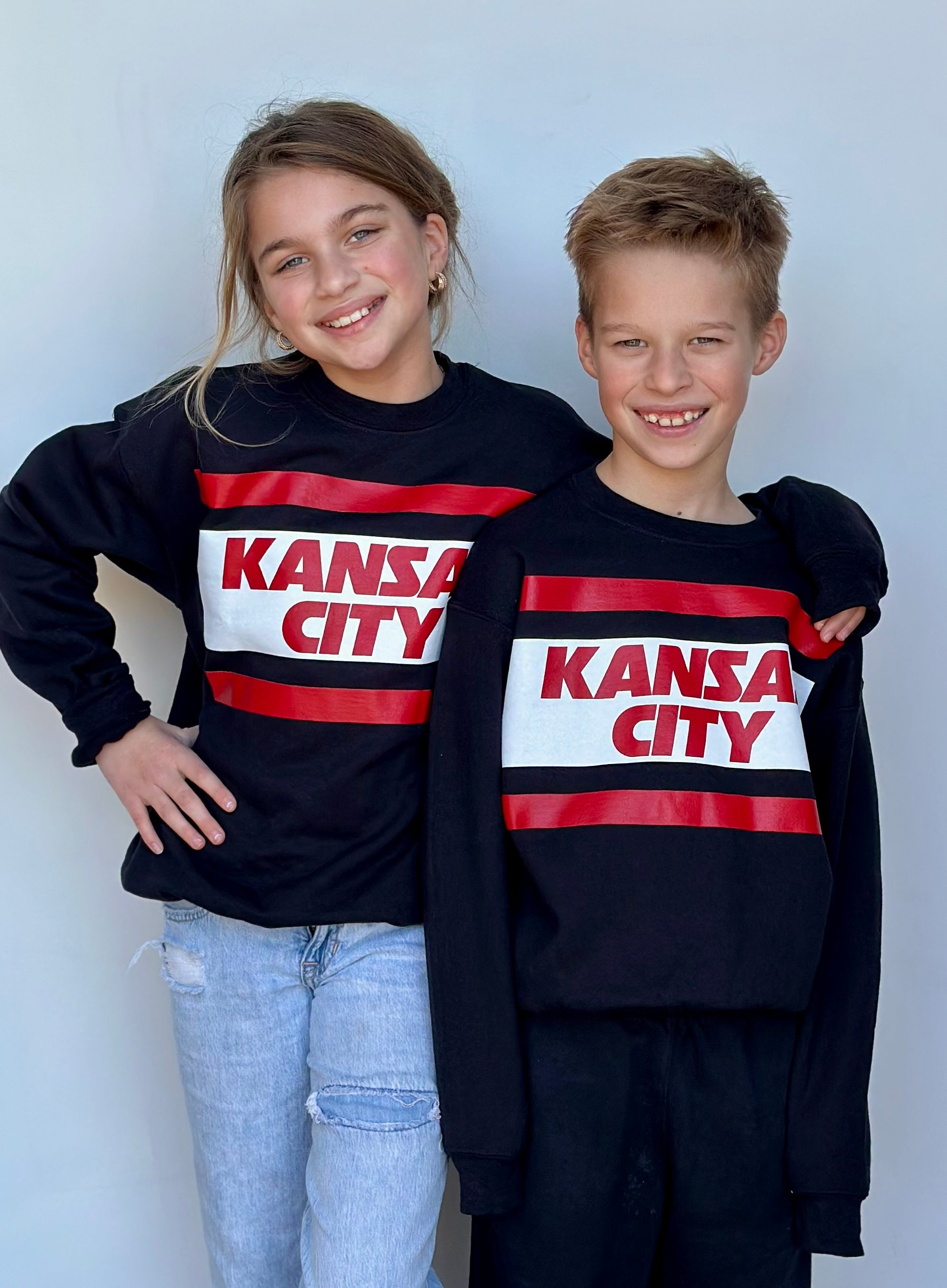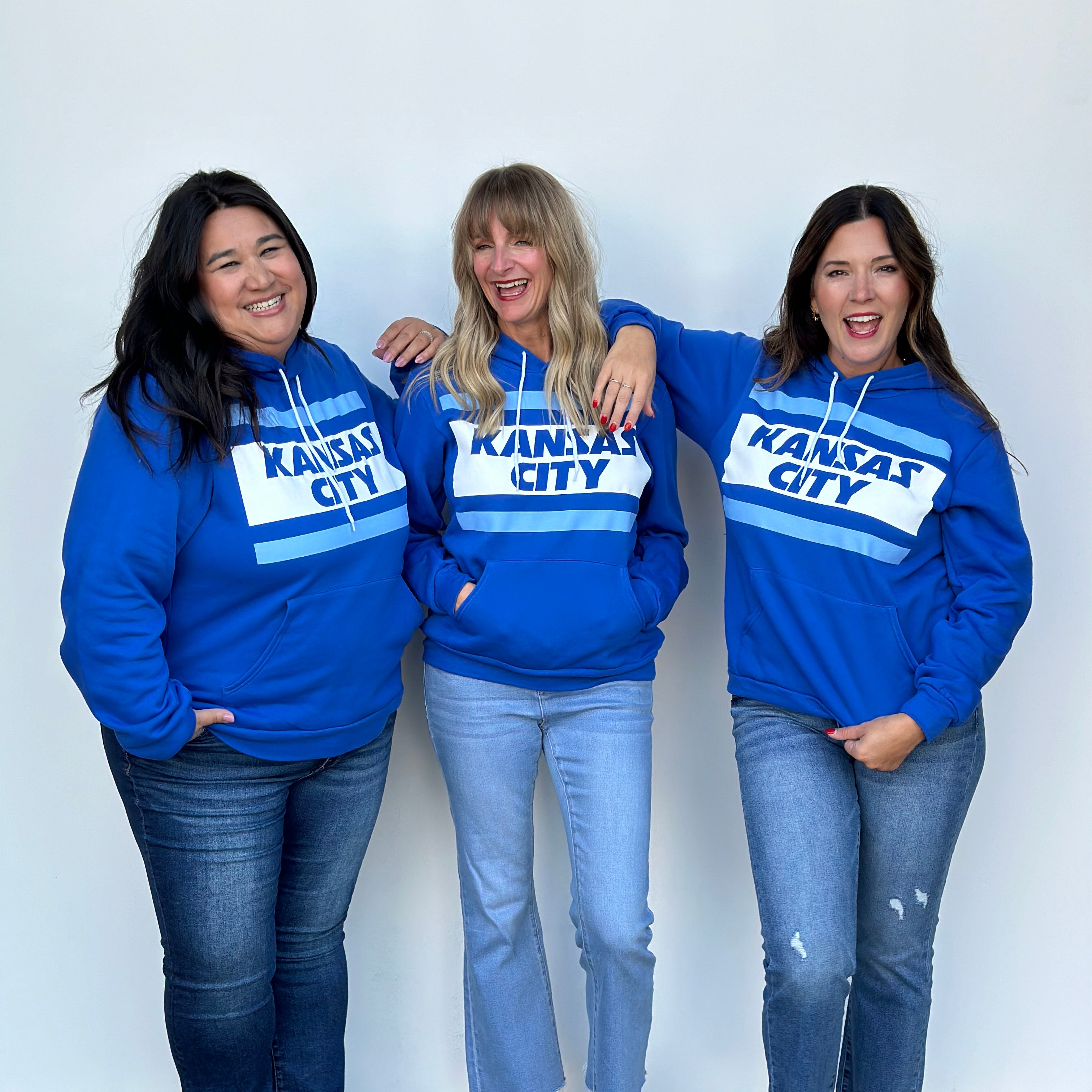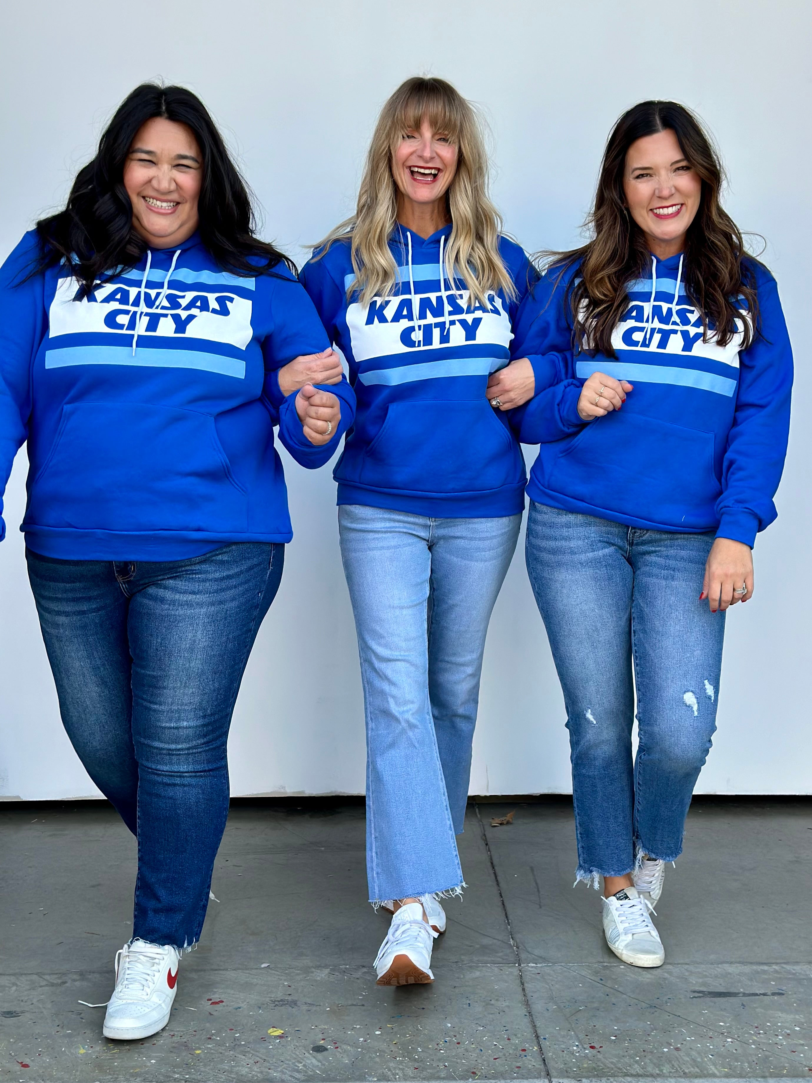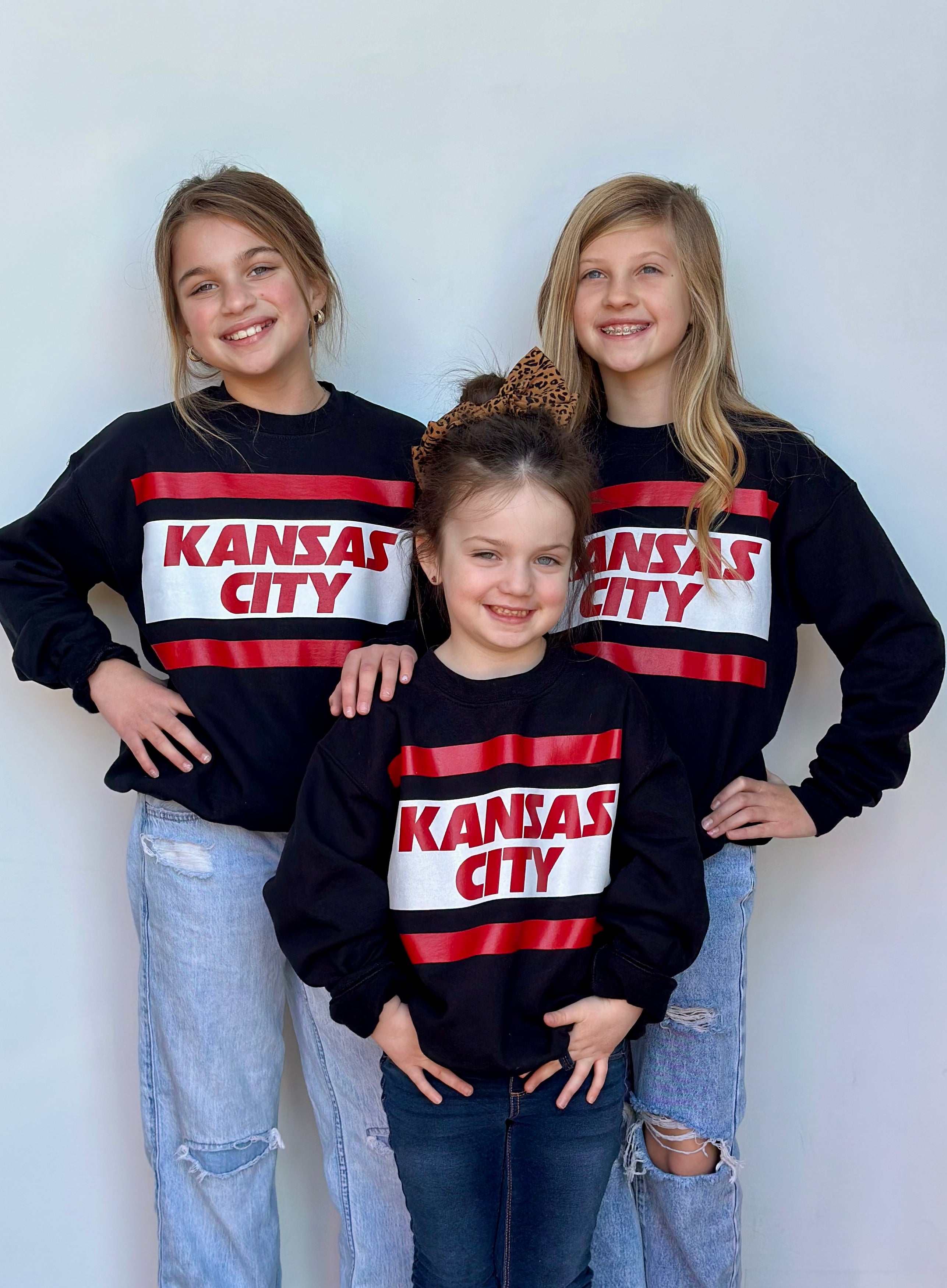 This oversized button-up cardi brings that vintage varsity vibe with a bold KC twist. Made in a vibrant game-day red with gold and white striping on the sleeves and hem, it features a detailed embroidered helmet patch on the front and “Kansas City” across the back for the ultimate fan finish.