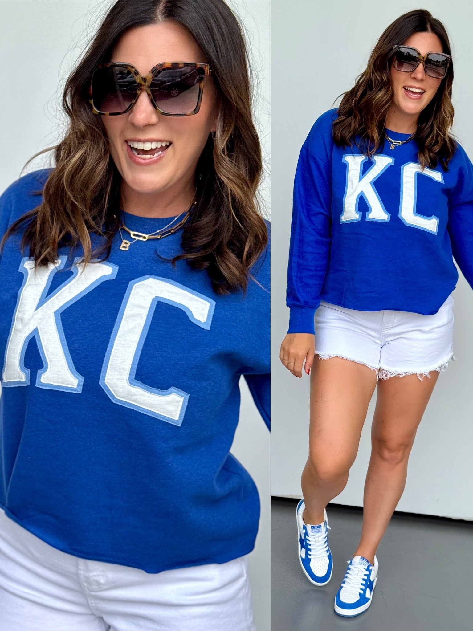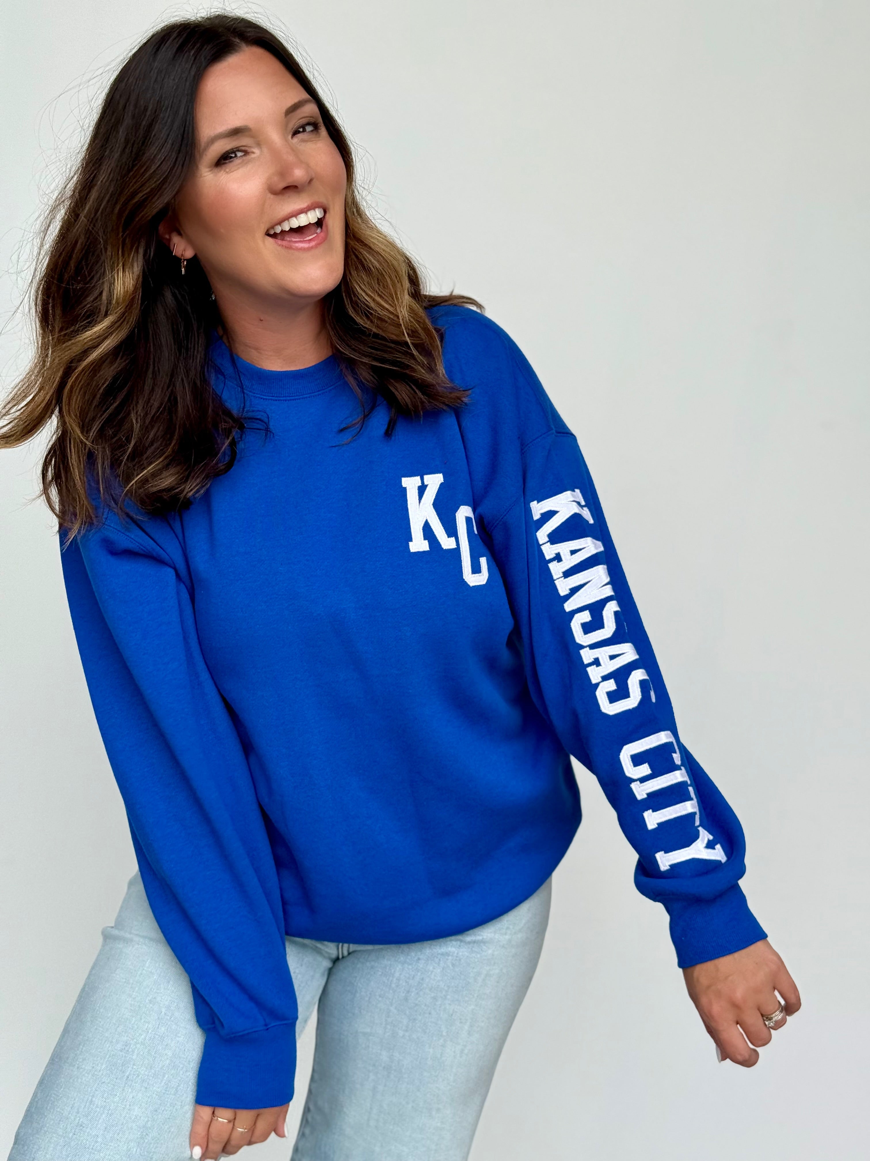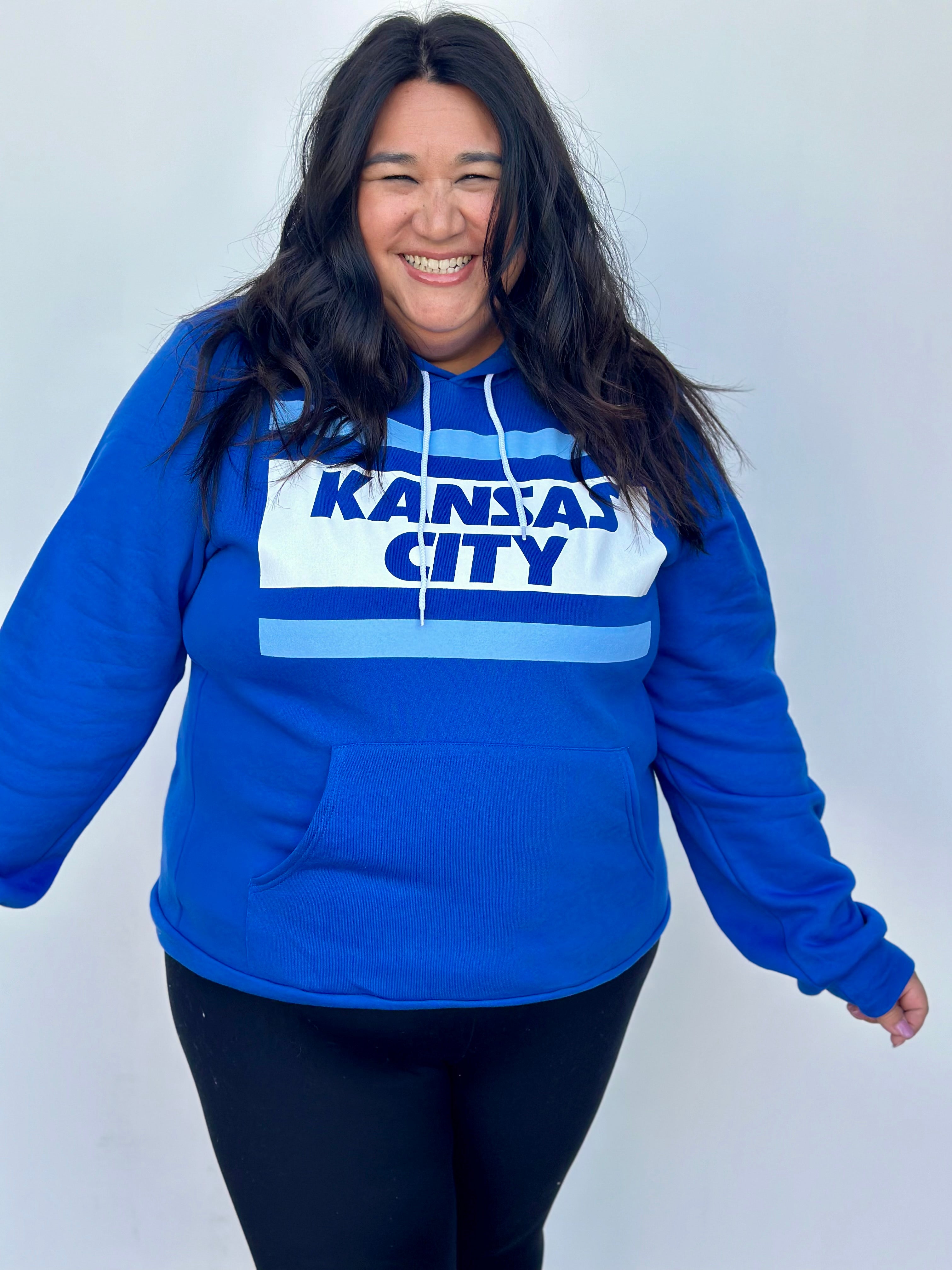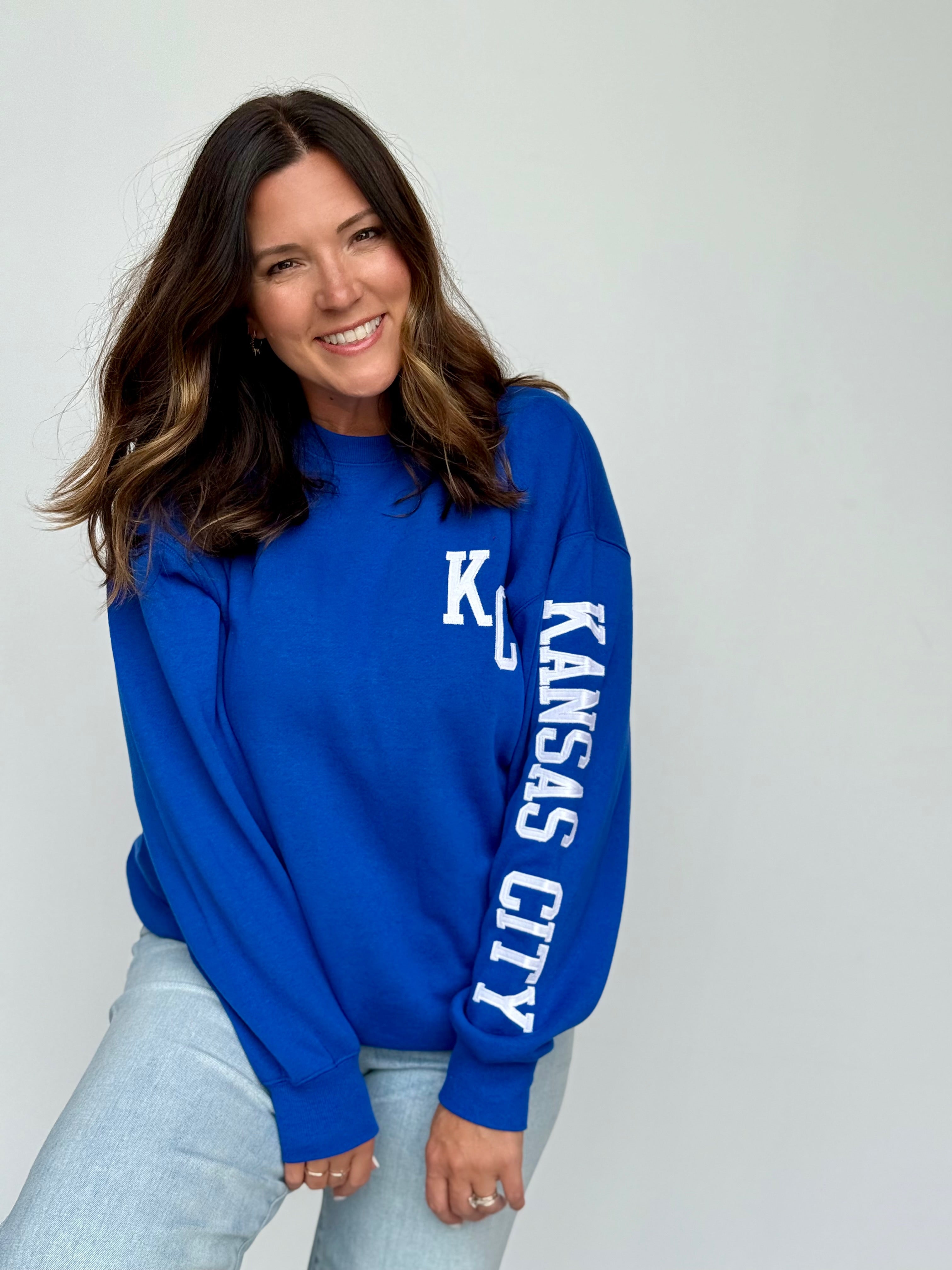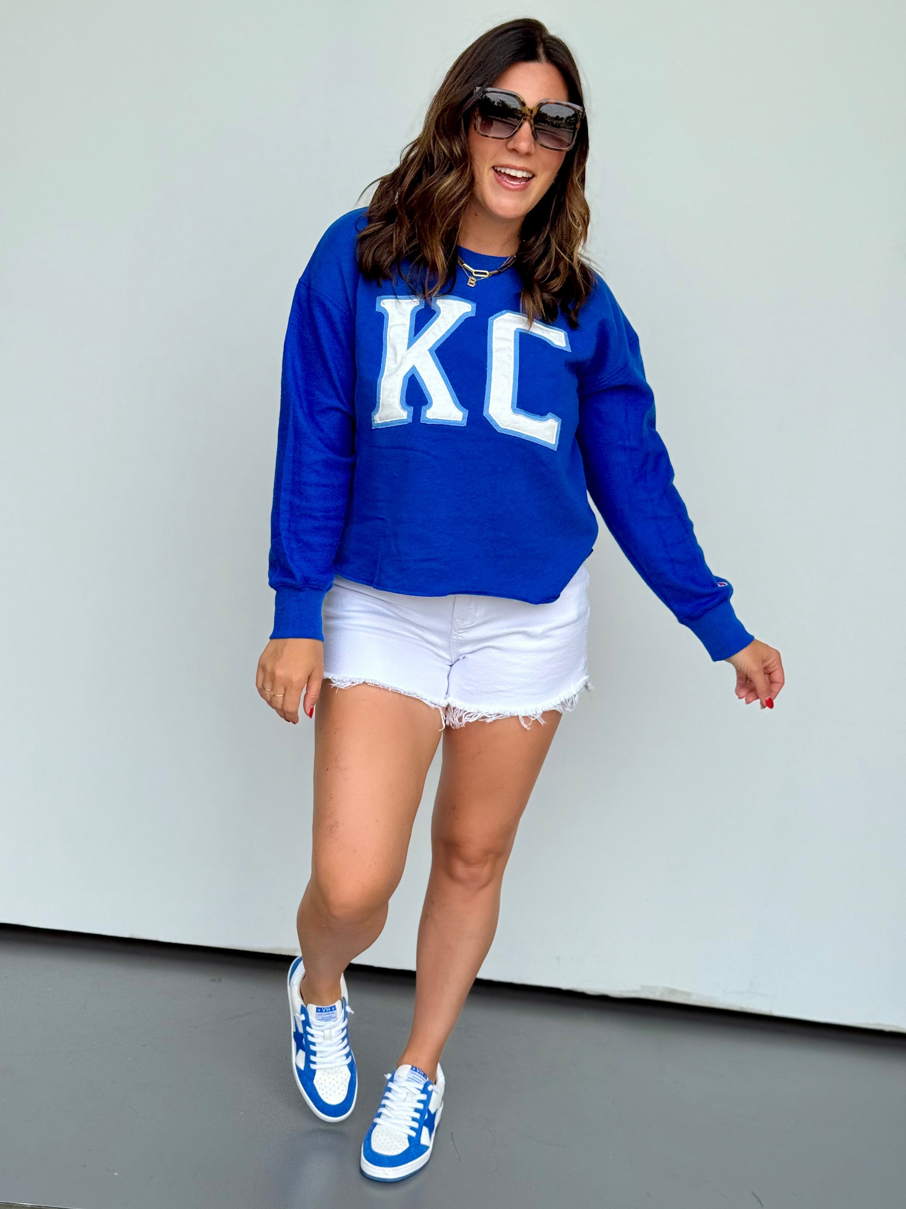 This oversized button-up cardi brings that vintage varsity vibe with a bold KC twist. Made in a vibrant game-day red with gold and white striping on the sleeves and hem, it features a detailed embroidered helmet patch on the front and “Kansas City” across the back for the ultimate fan finish.