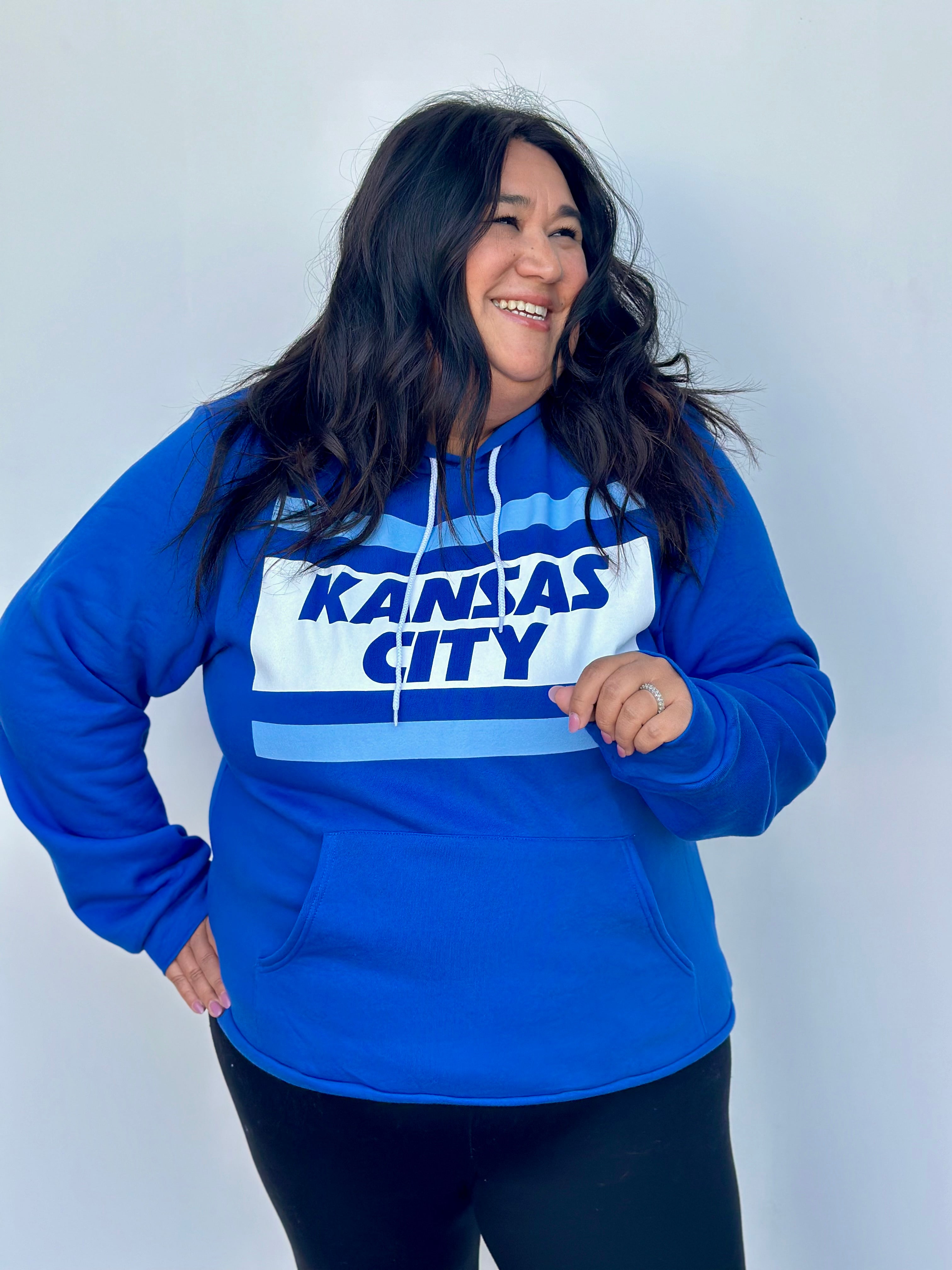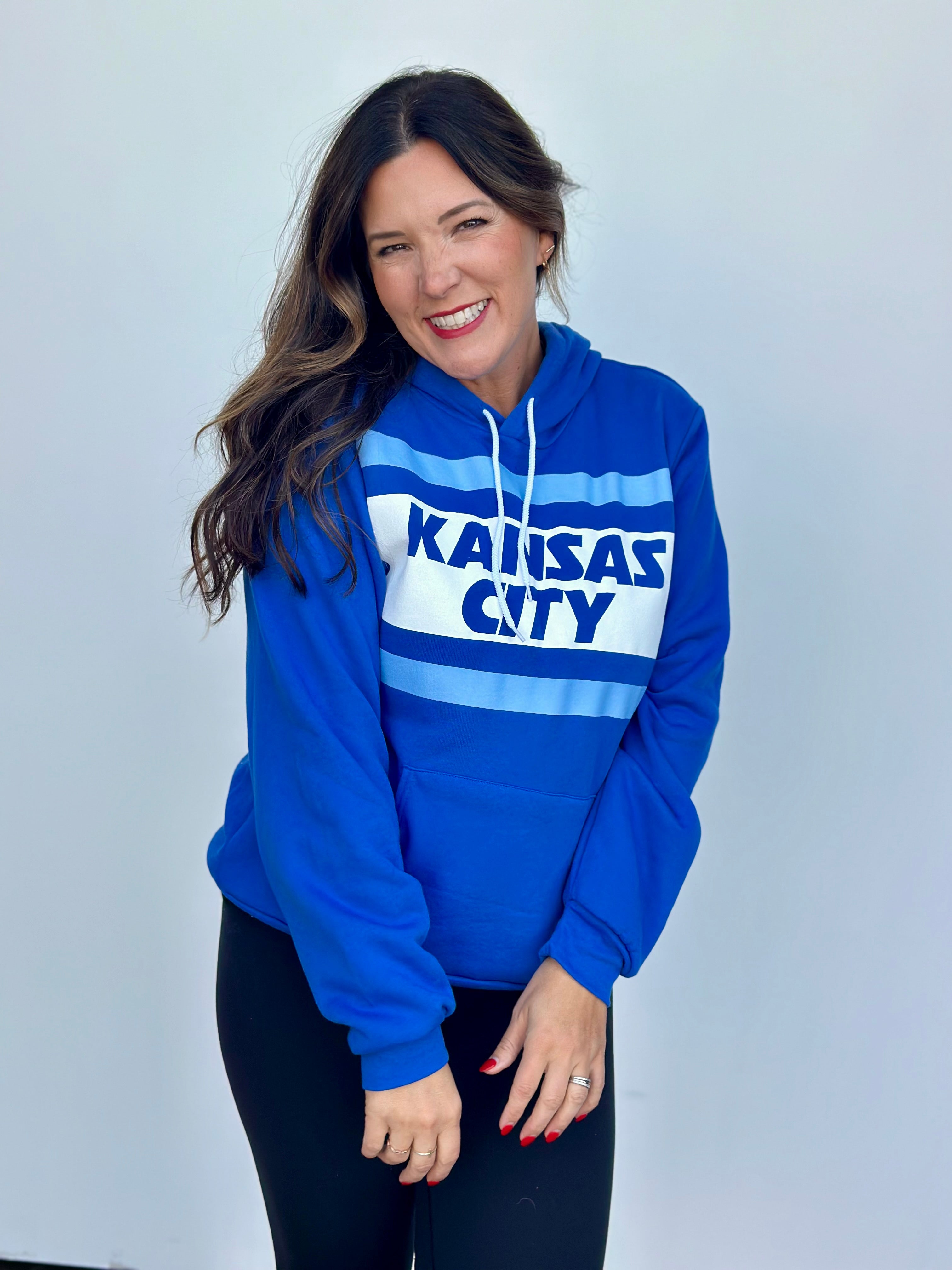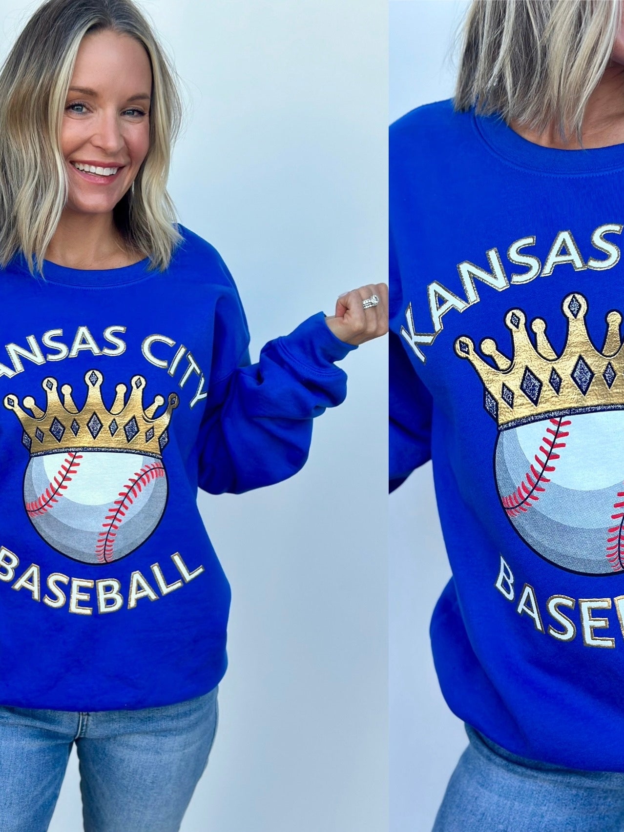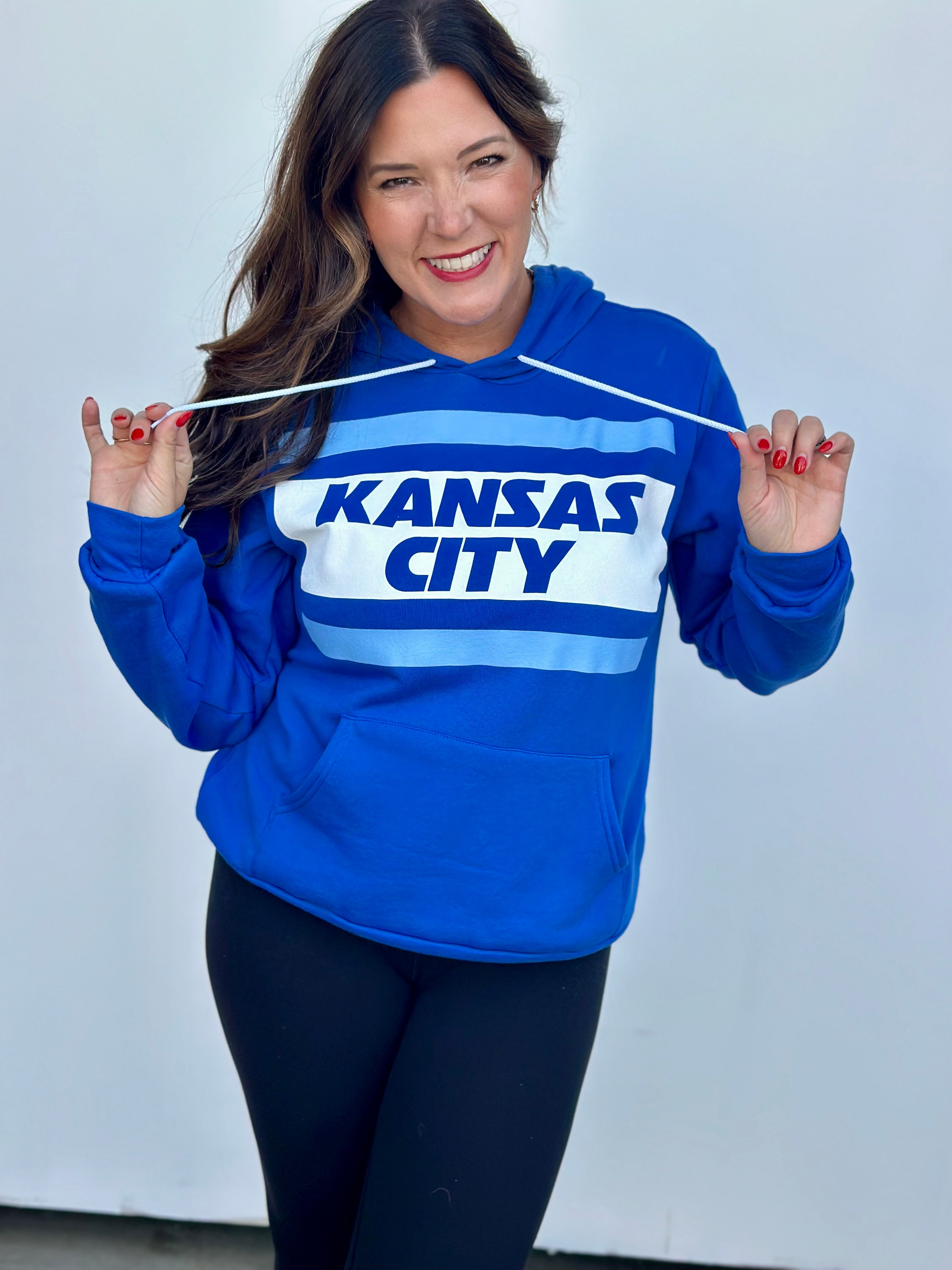This oversized button-up cardi brings that vintage varsity vibe with a bold KC twist. Made in a vibrant game-day red with gold and white striping on the sleeves and hem, it features a detailed embroidered helmet patch on the front and “Kansas City” across the back for the ultimate fan finish.