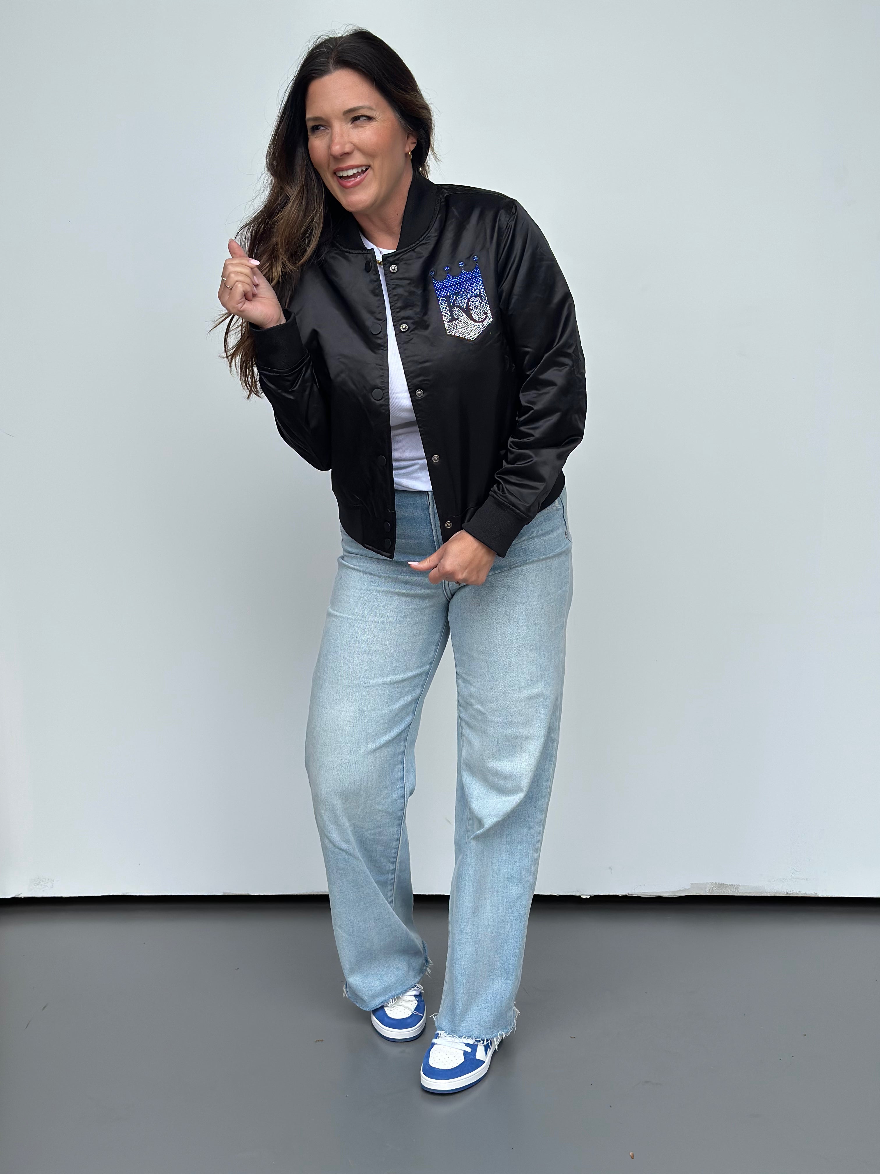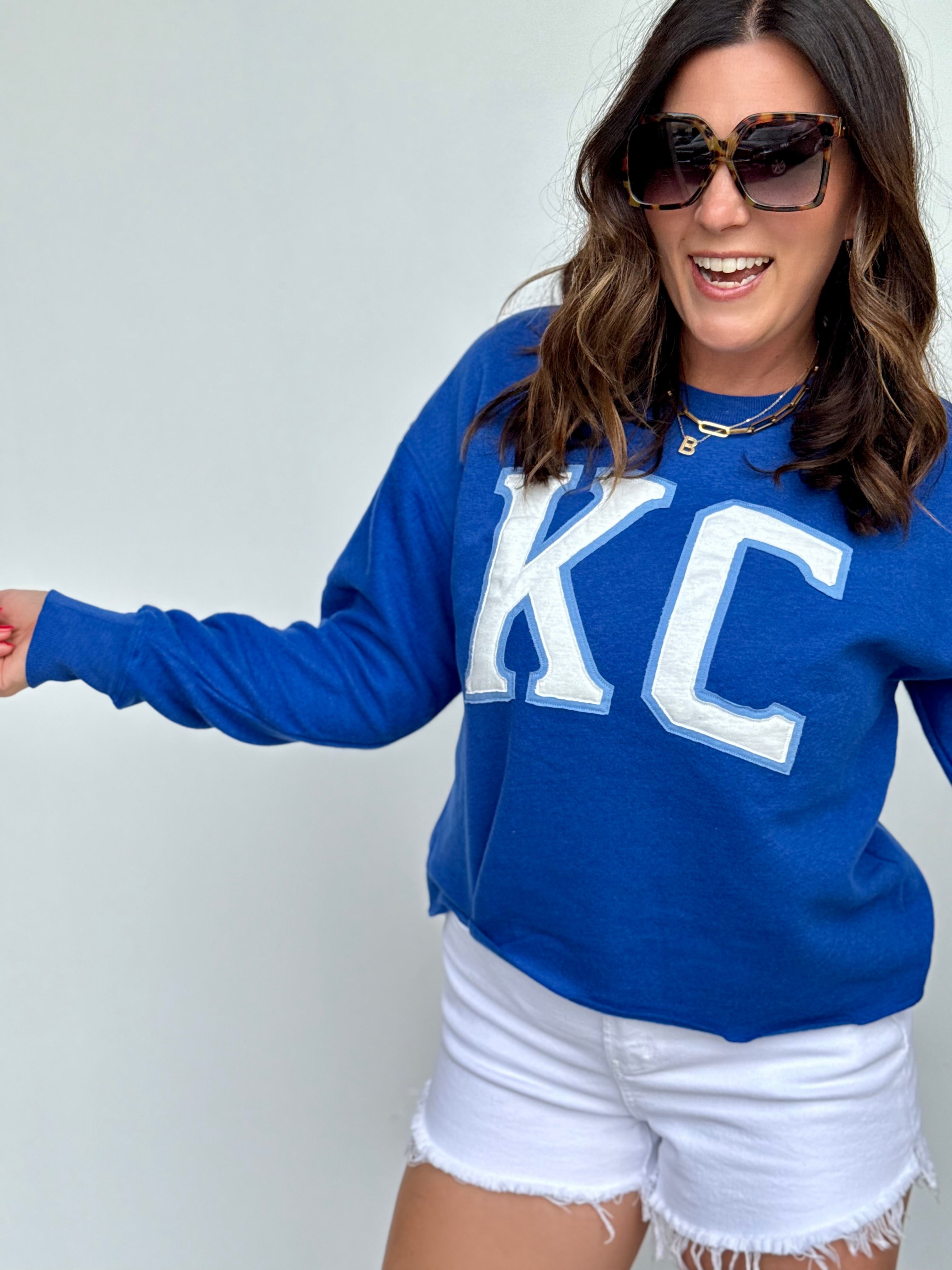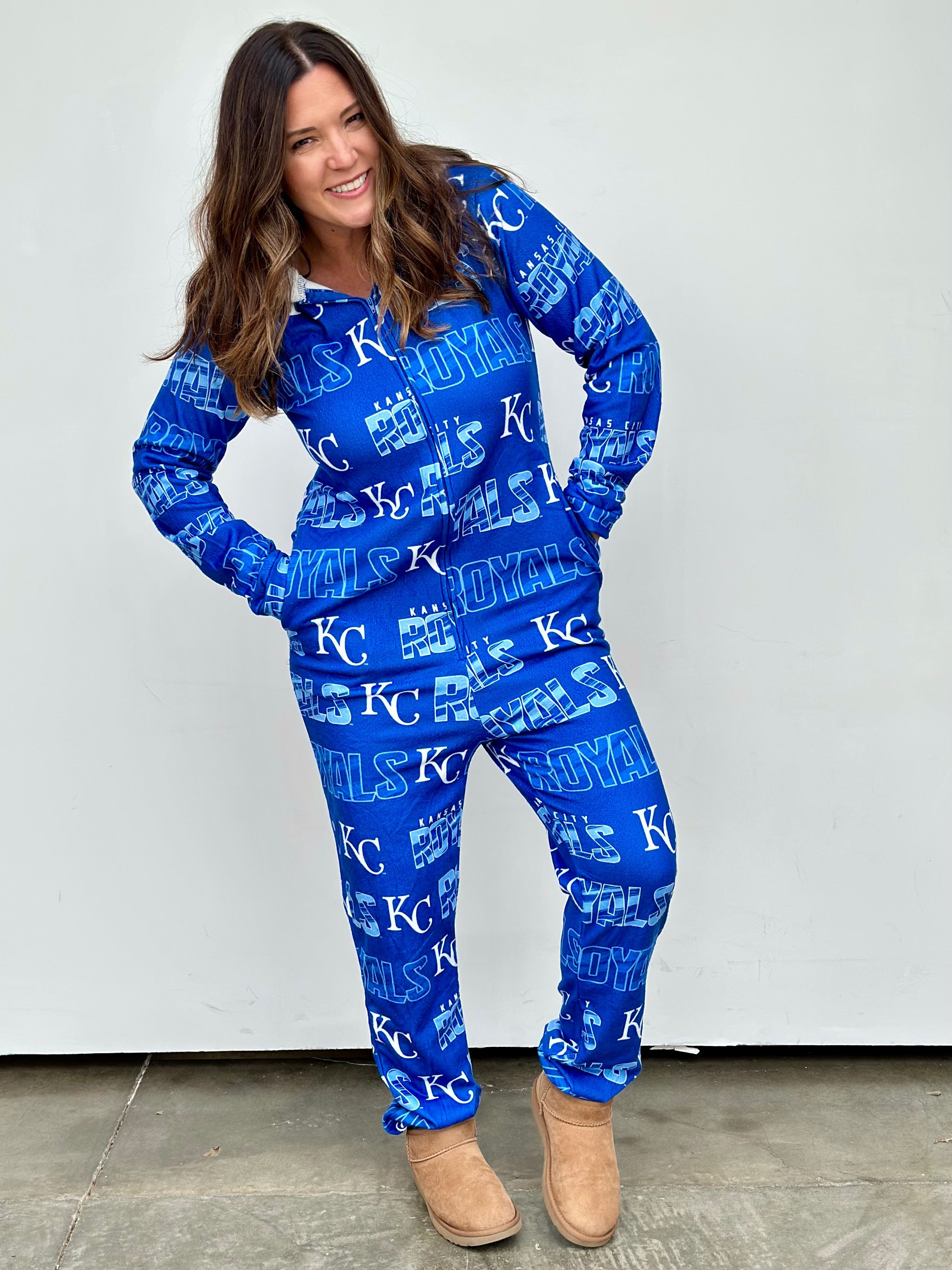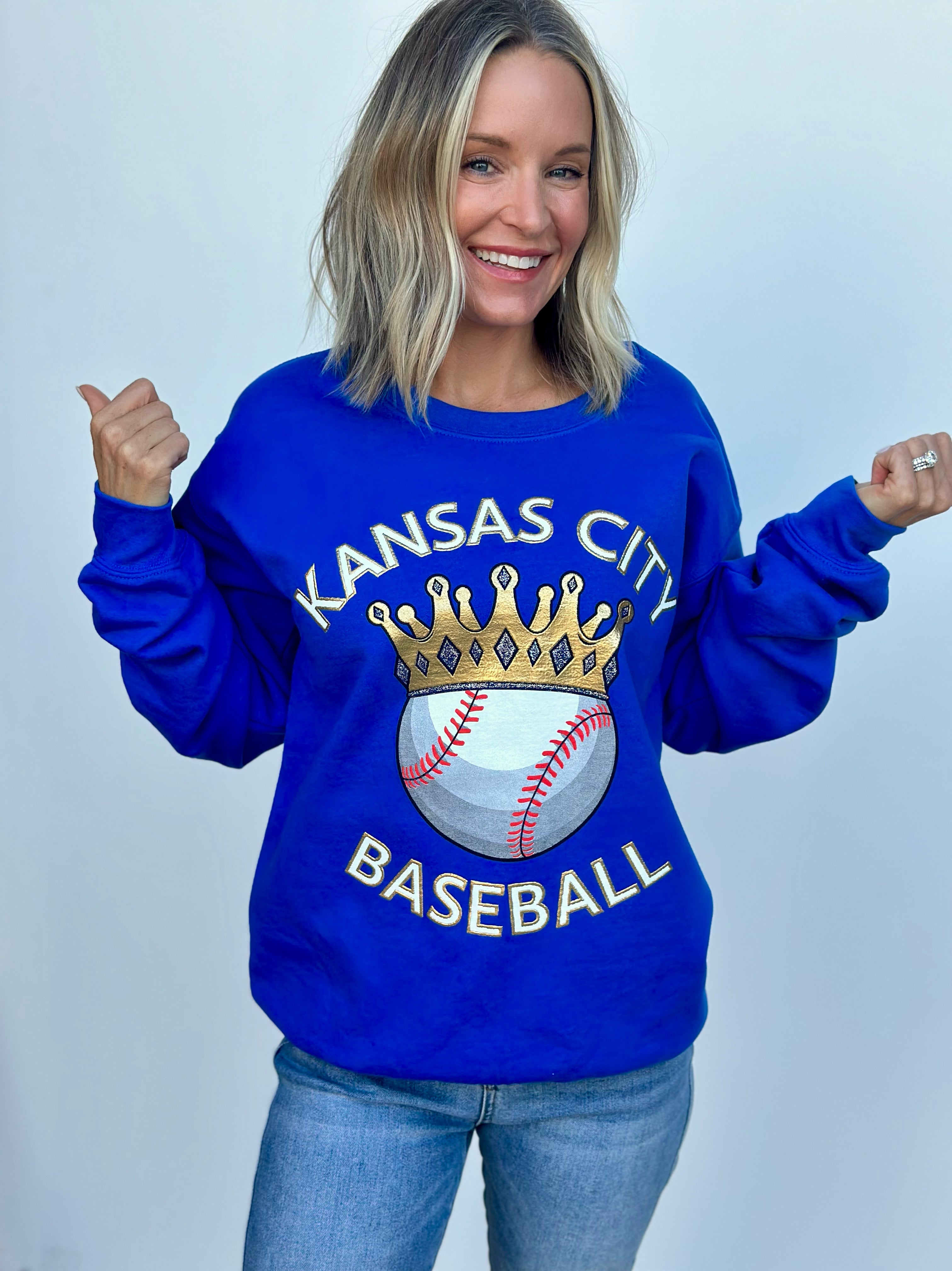 This oversized button-up cardi brings that vintage varsity vibe with a bold KC twist. Made in a vibrant game-day red with gold and white striping on the sleeves and hem, it features a detailed embroidered helmet patch on the front and “Kansas City” across the back for the ultimate fan finish.