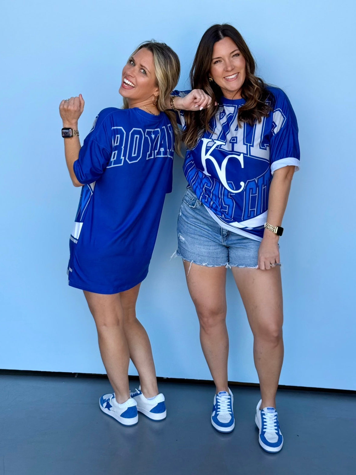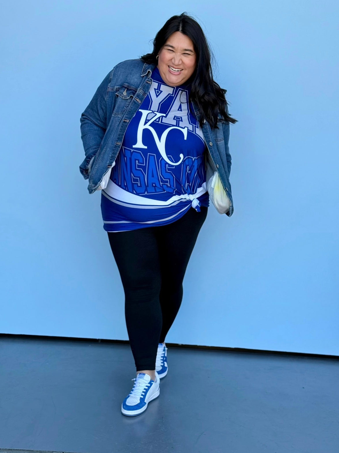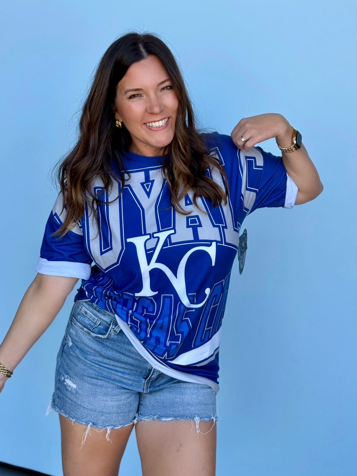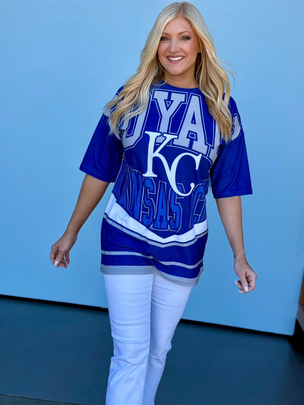 This oversized button-up cardi brings that vintage varsity vibe with a bold KC twist. Made in a vibrant game-day red with gold and white striping on the sleeves and hem, it features a detailed embroidered helmet patch on the front and “Kansas City” across the back for the ultimate fan finish.