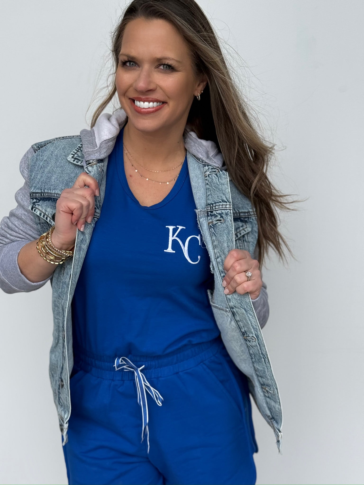 Stay cool and comfortable while showing off your love for the KC Royals with our shorts romper. Features pockets and a tank design, perfect for game days and everyday wear. Made with high-quality materials for durability and style. A must-have for any true fan! Fits true to size!