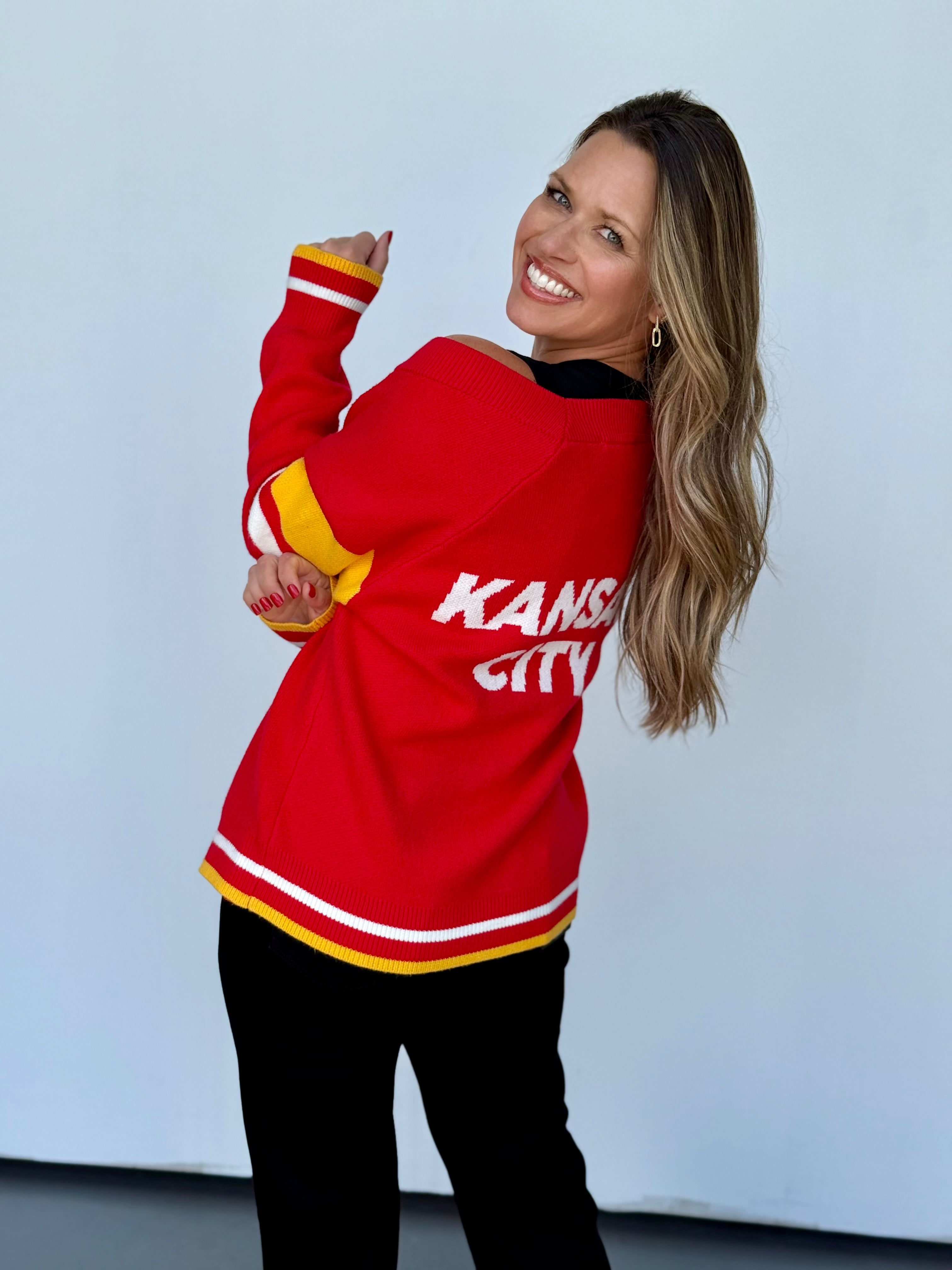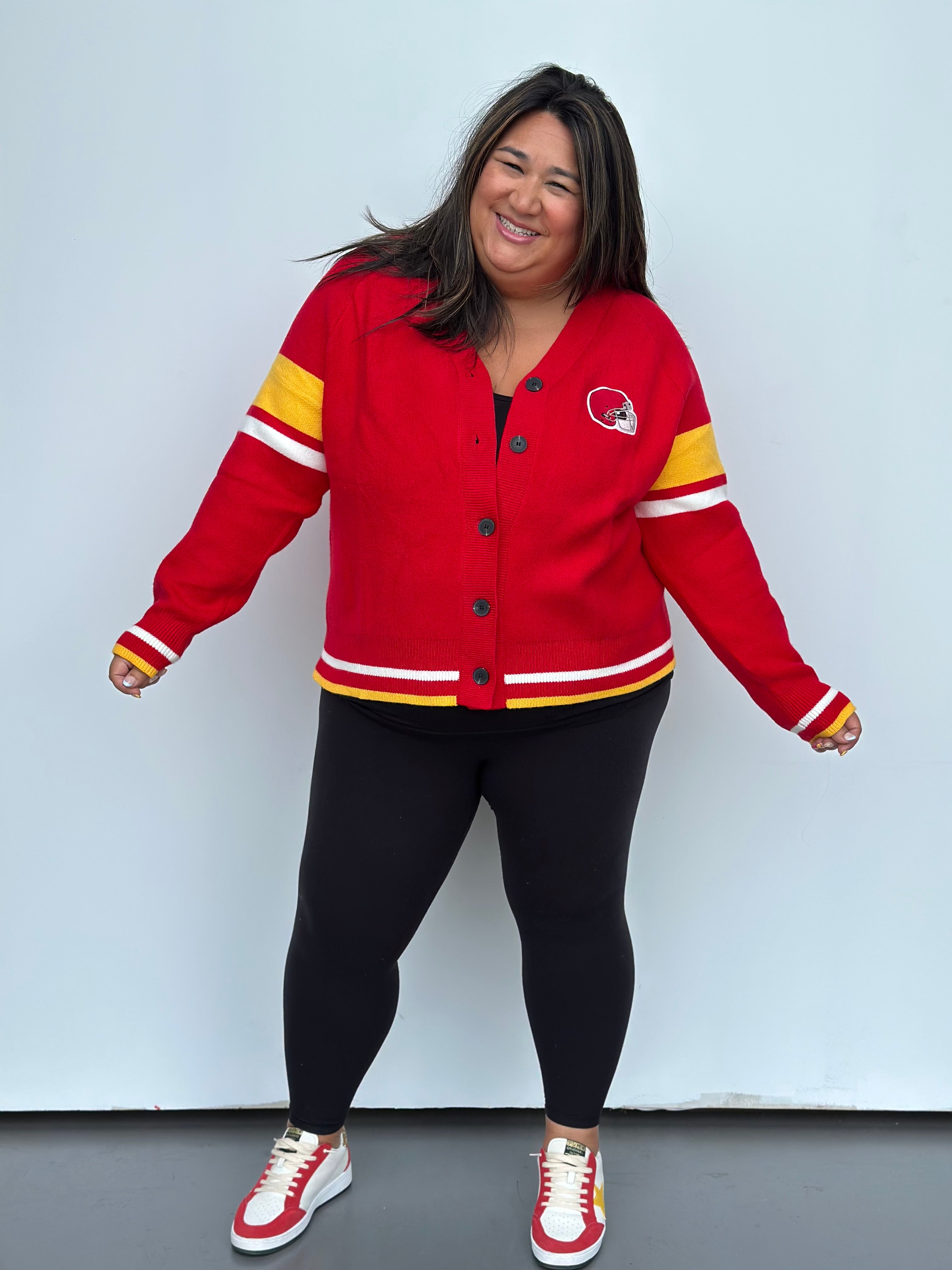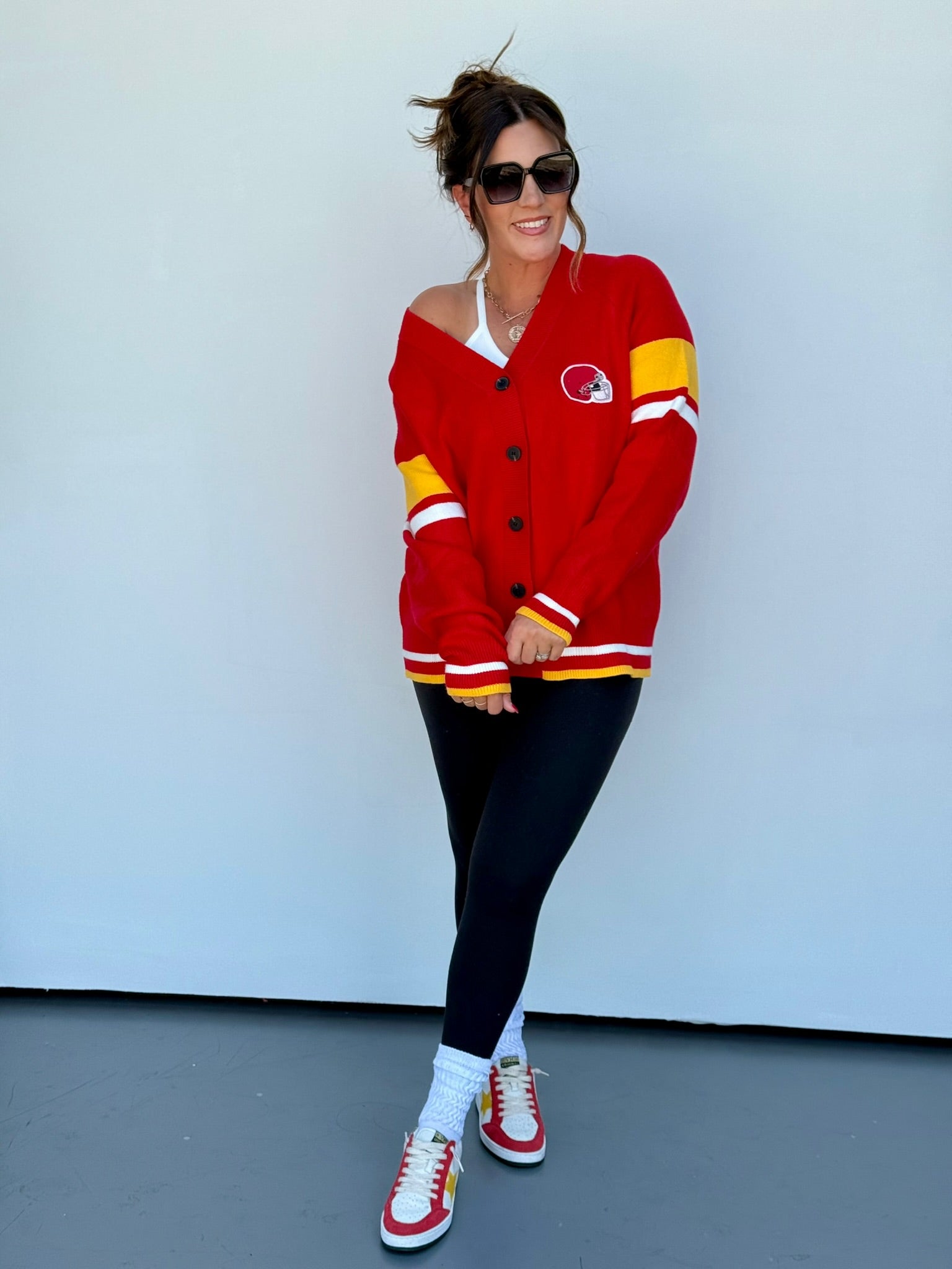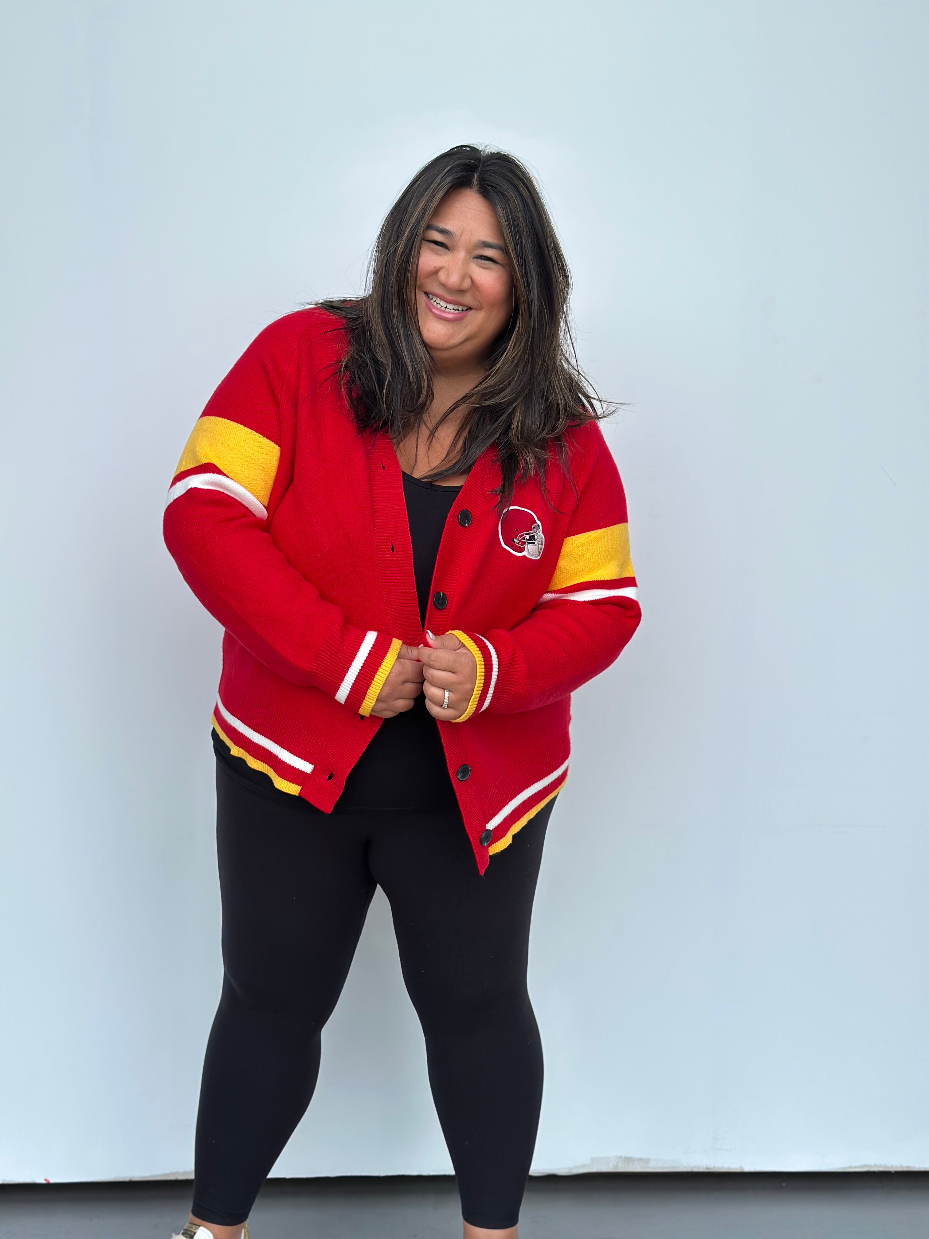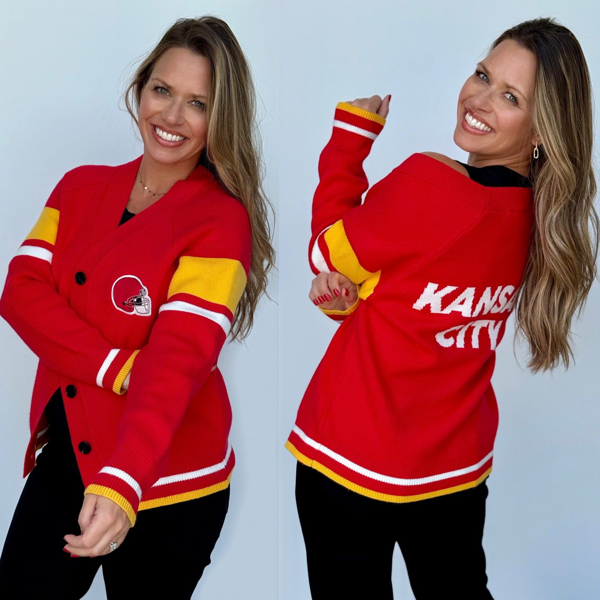 This oversized button-up cardi brings that vintage varsity vibe with a bold KC twist. Made in a vibrant game-day red with gold and white striping on the sleeves and hem, it features a detailed embroidered helmet patch on the front and “Kansas City” across the back for the ultimate fan finish.