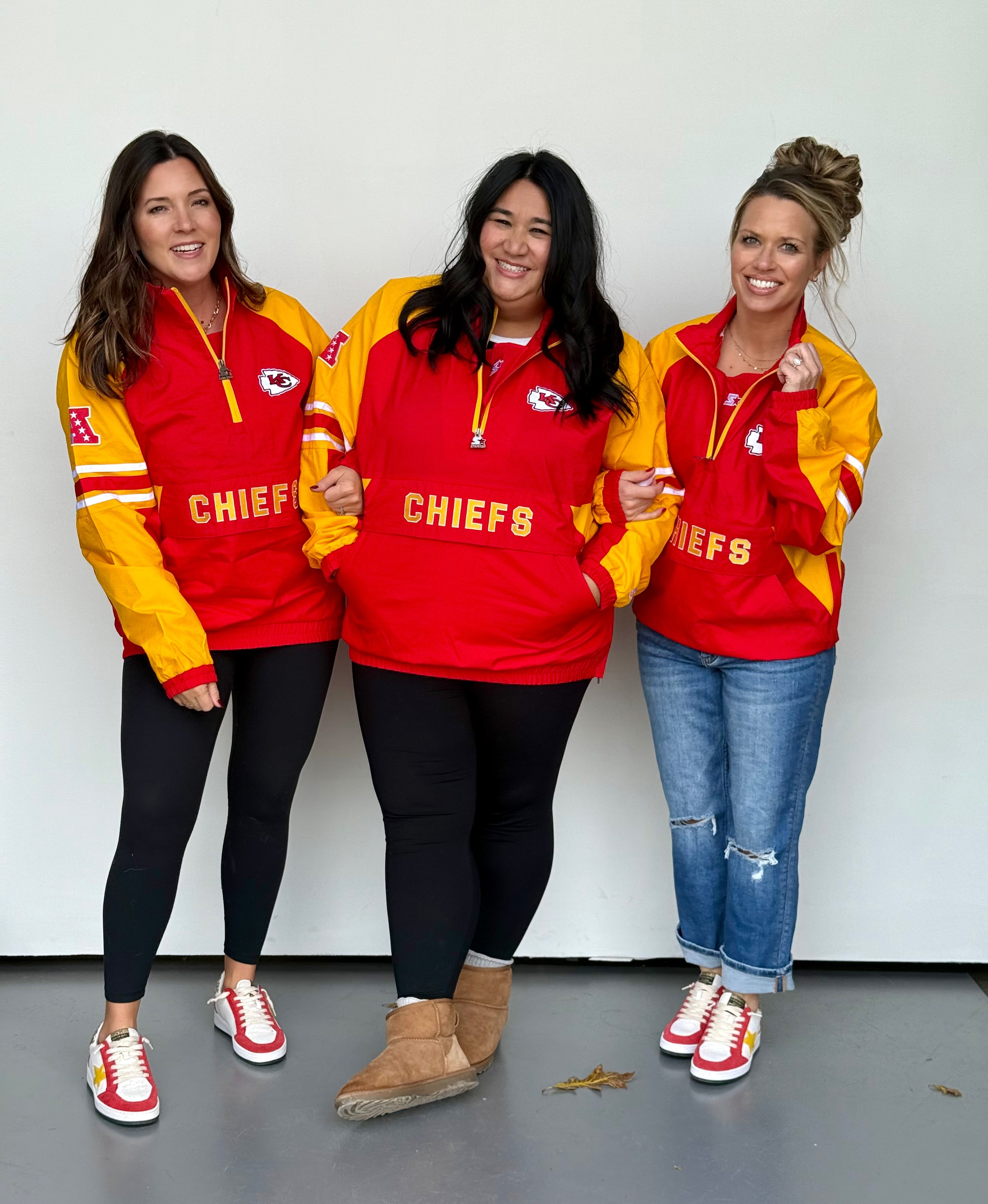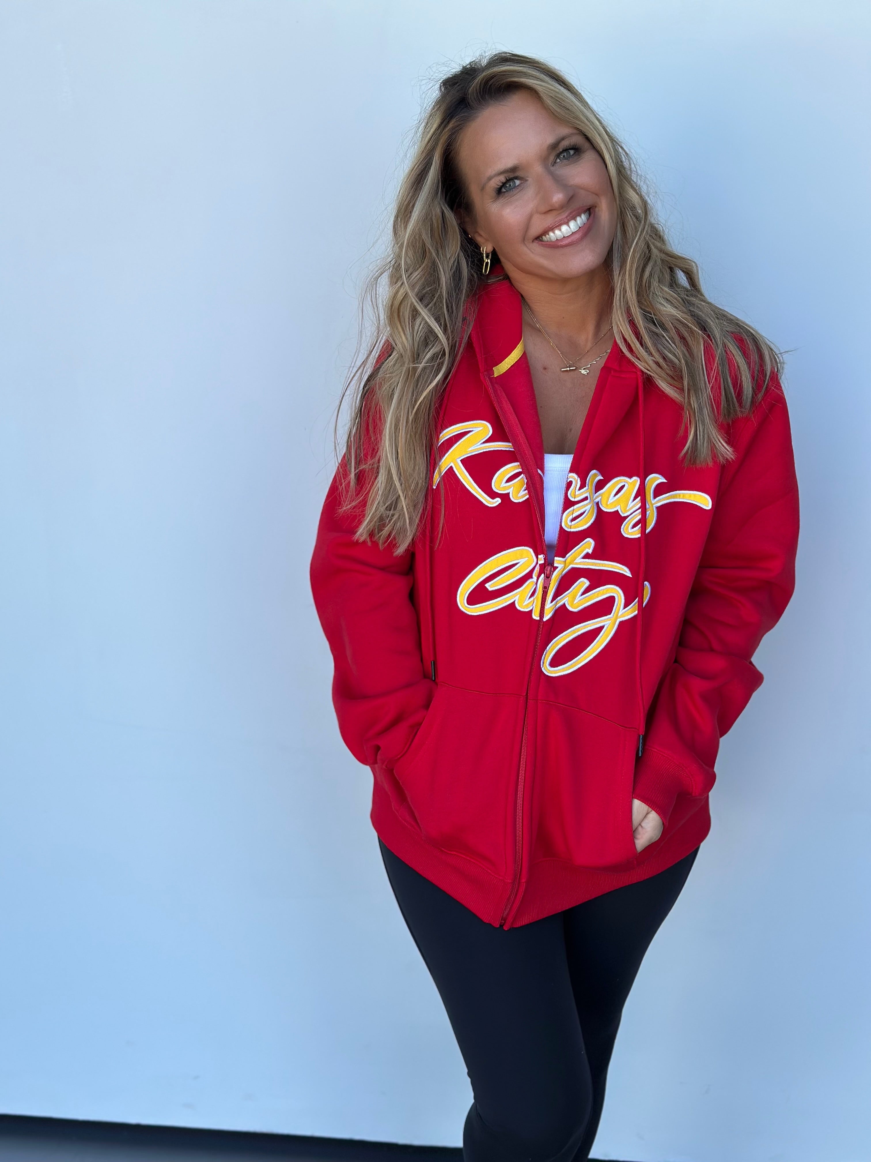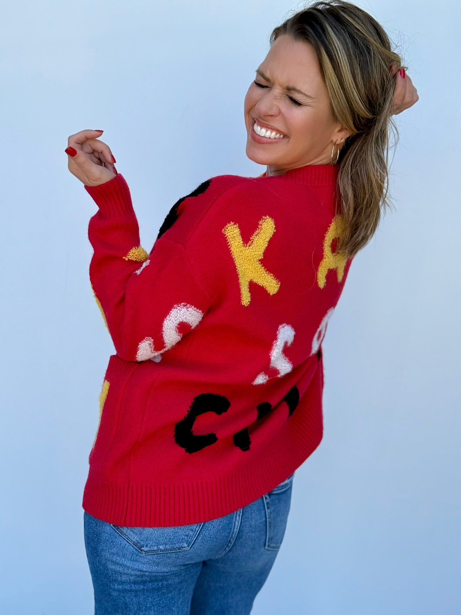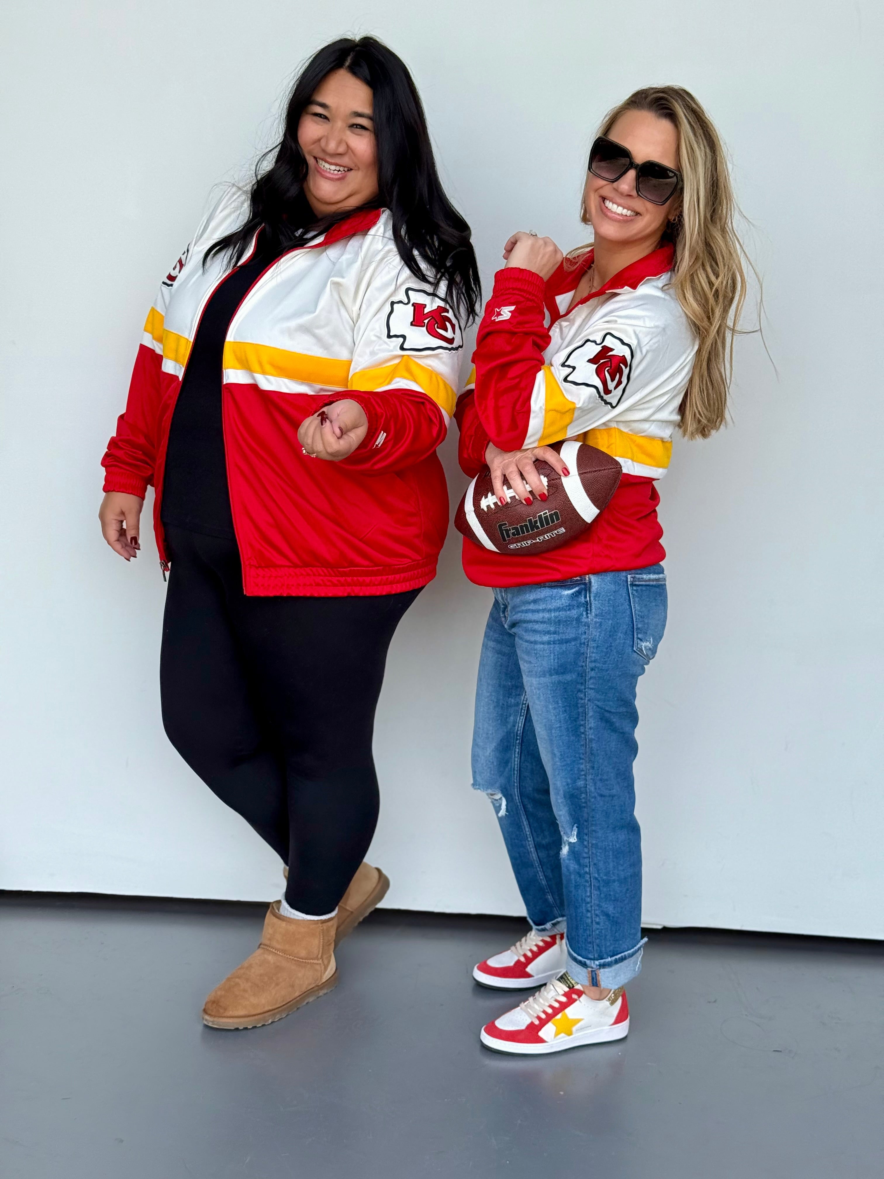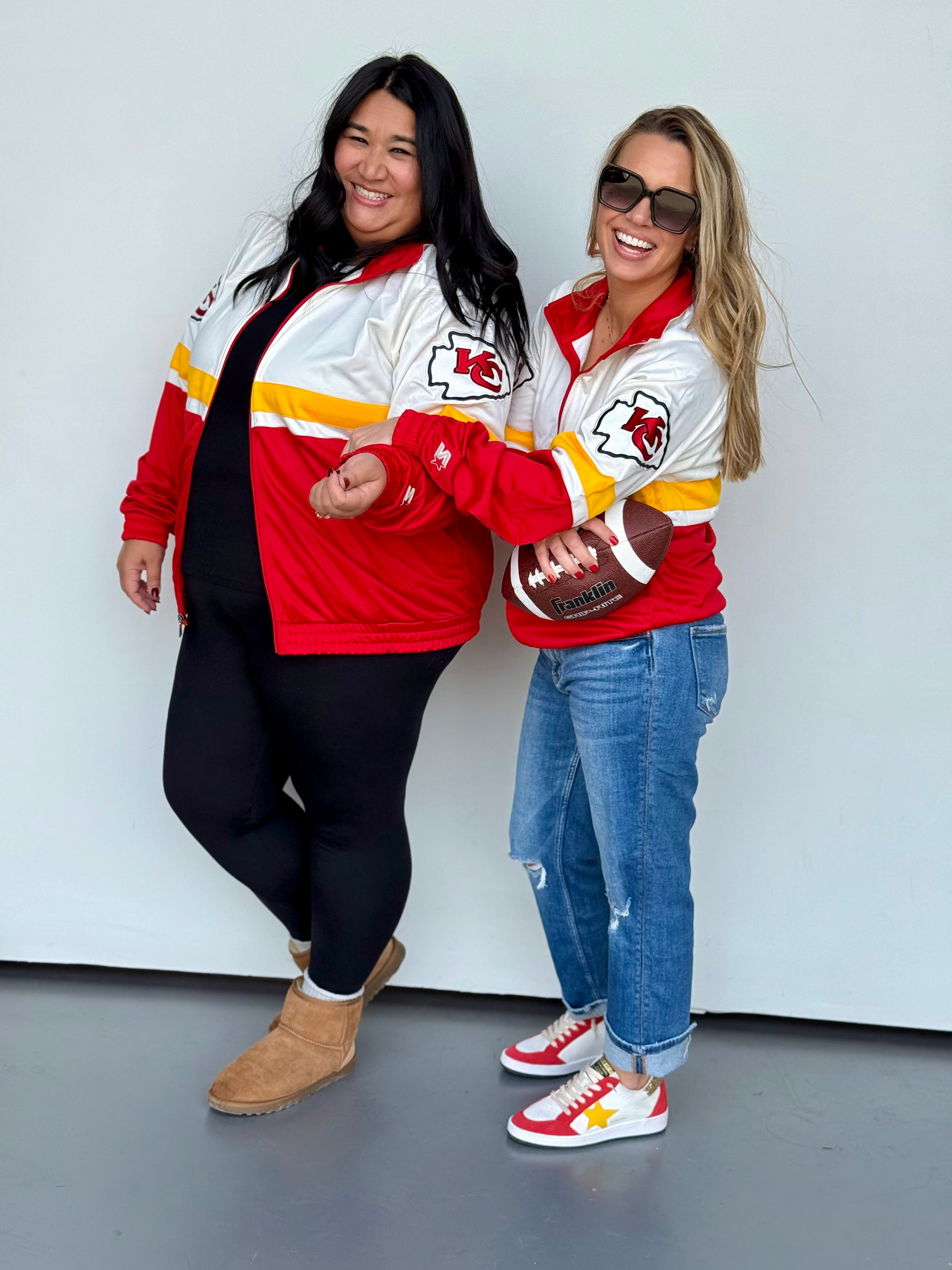 This oversized button-up cardi brings that vintage varsity vibe with a bold KC twist. Made in a vibrant game-day red with gold and white striping on the sleeves and hem, it features a detailed embroidered helmet patch on the front and “Kansas City” across the back for the ultimate fan finish.