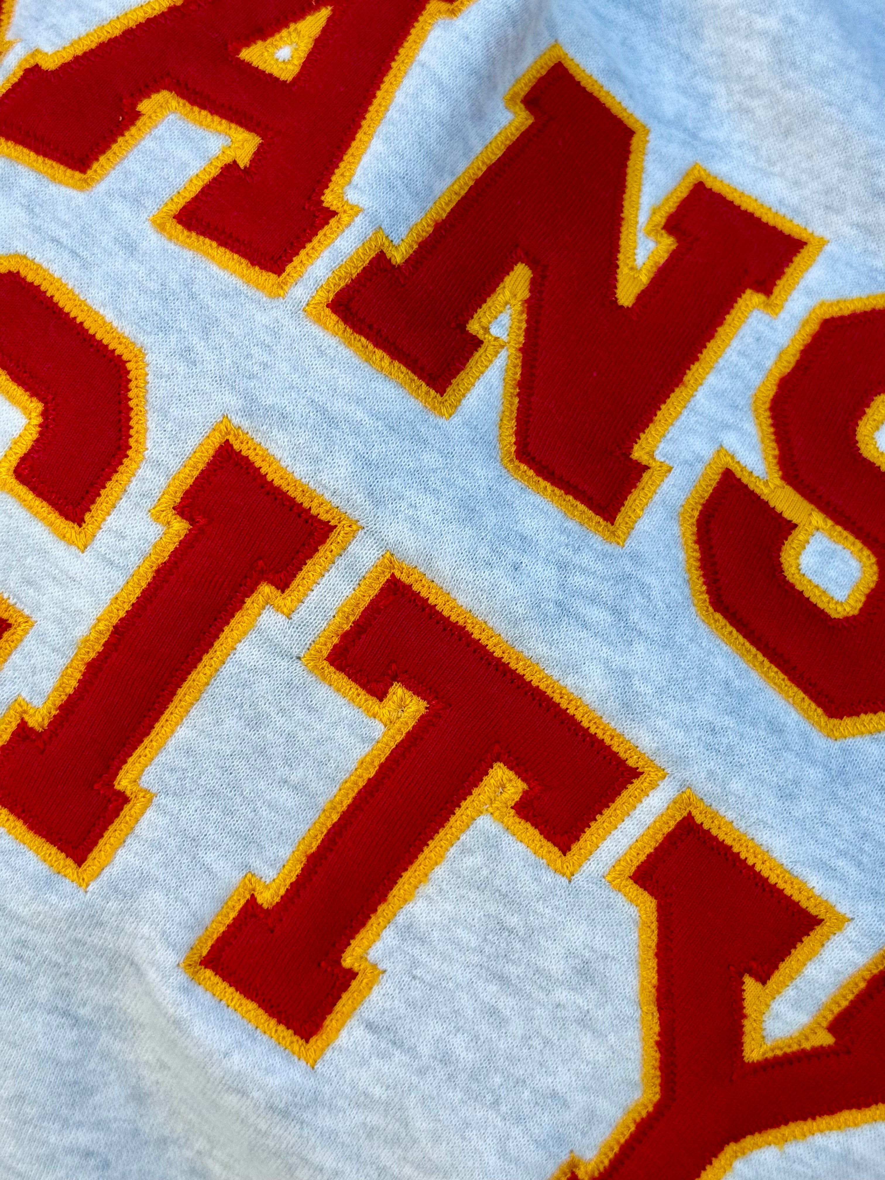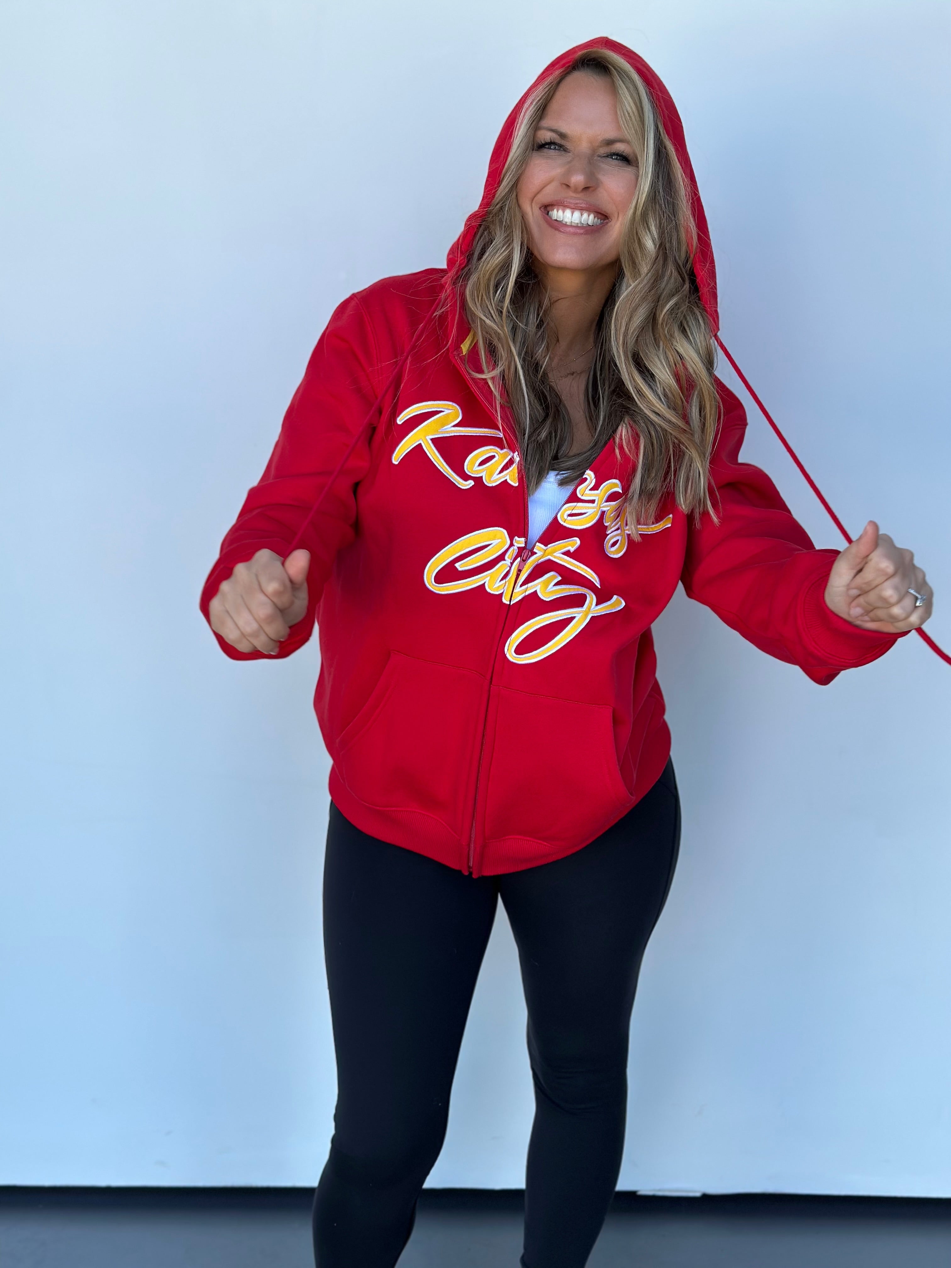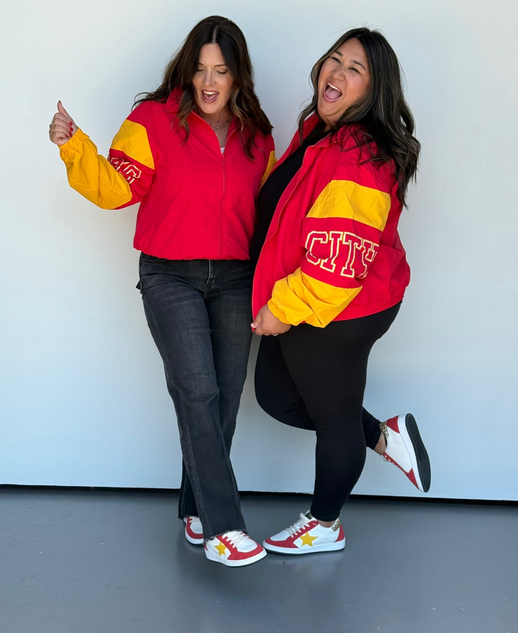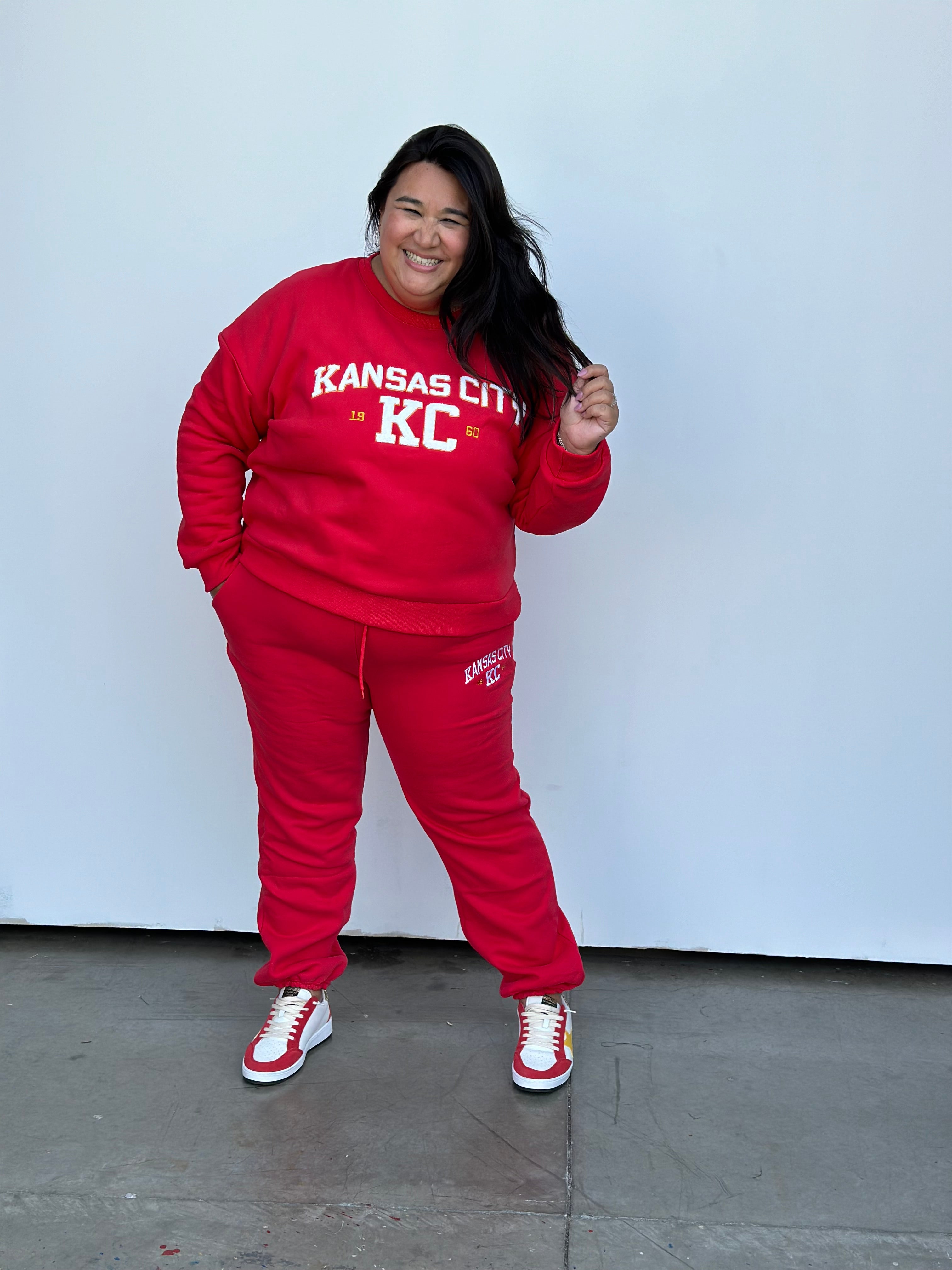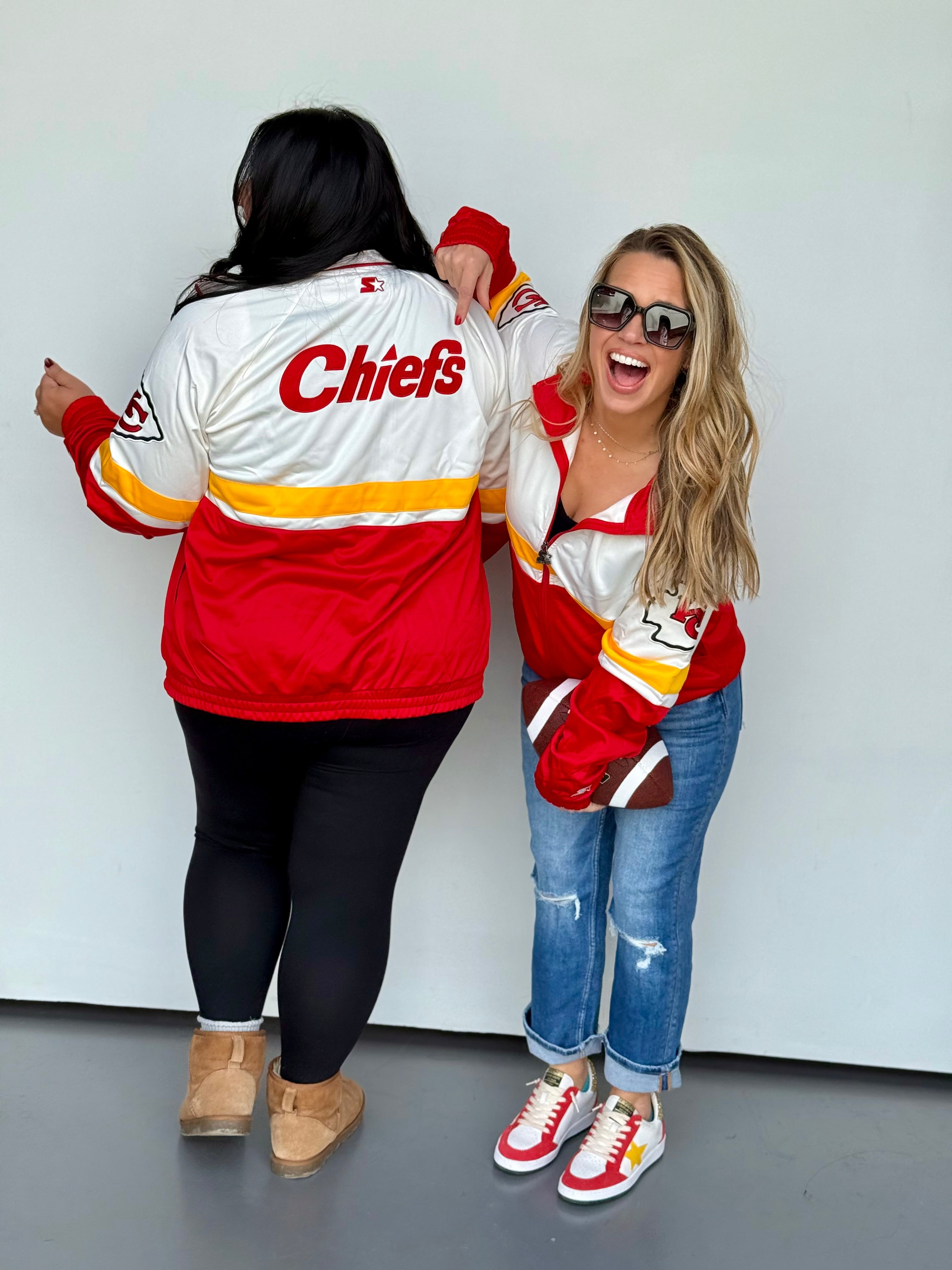 This oversized button-up cardi brings that vintage varsity vibe with a bold KC twist. Made in a vibrant game-day red with gold and white striping on the sleeves and hem, it features a detailed embroidered helmet patch on the front and “Kansas City” across the back for the ultimate fan finish.
