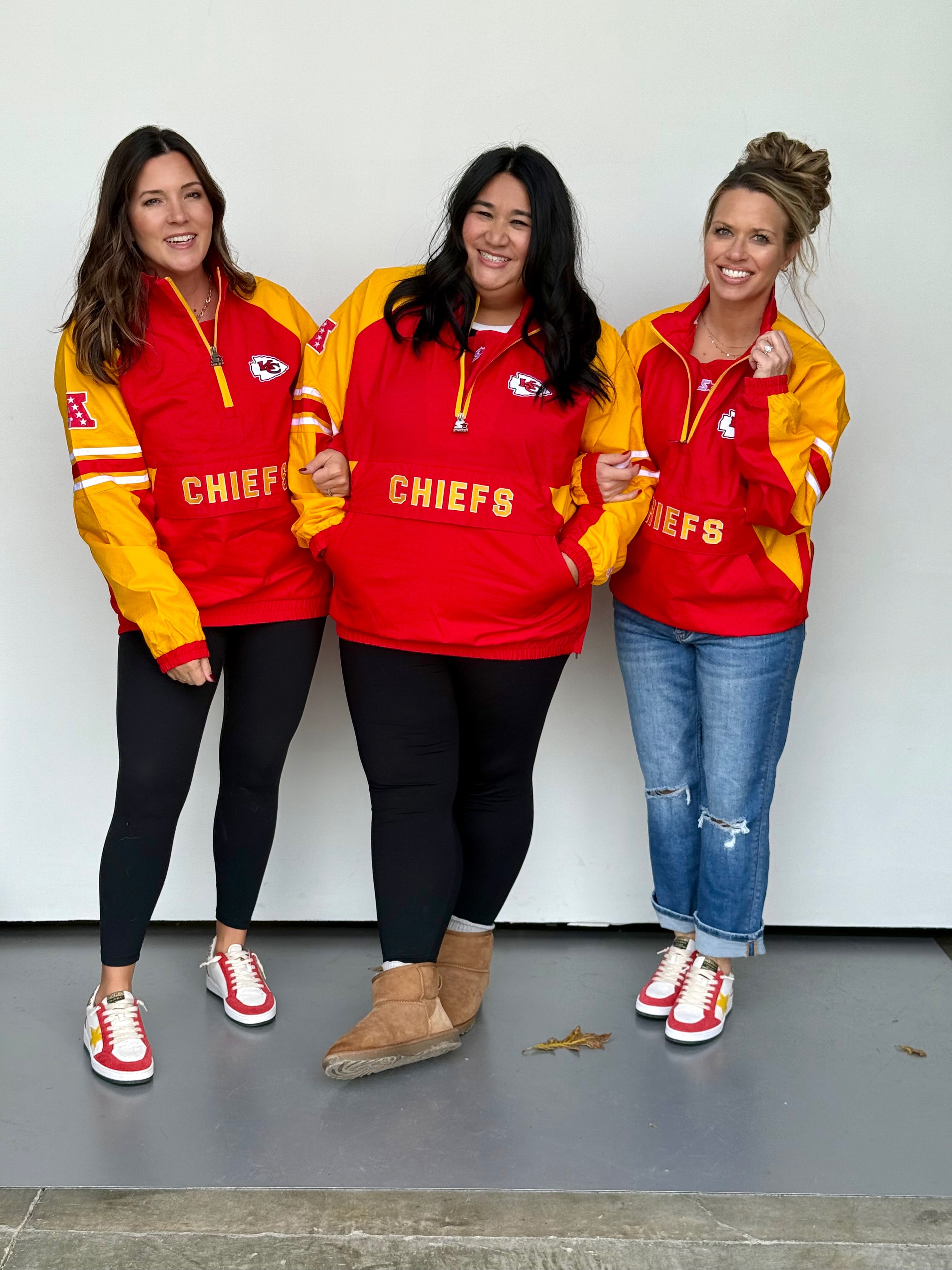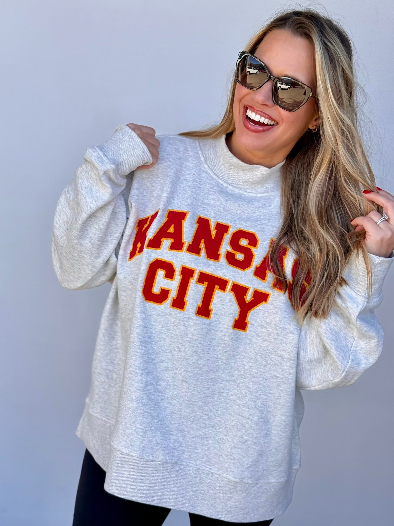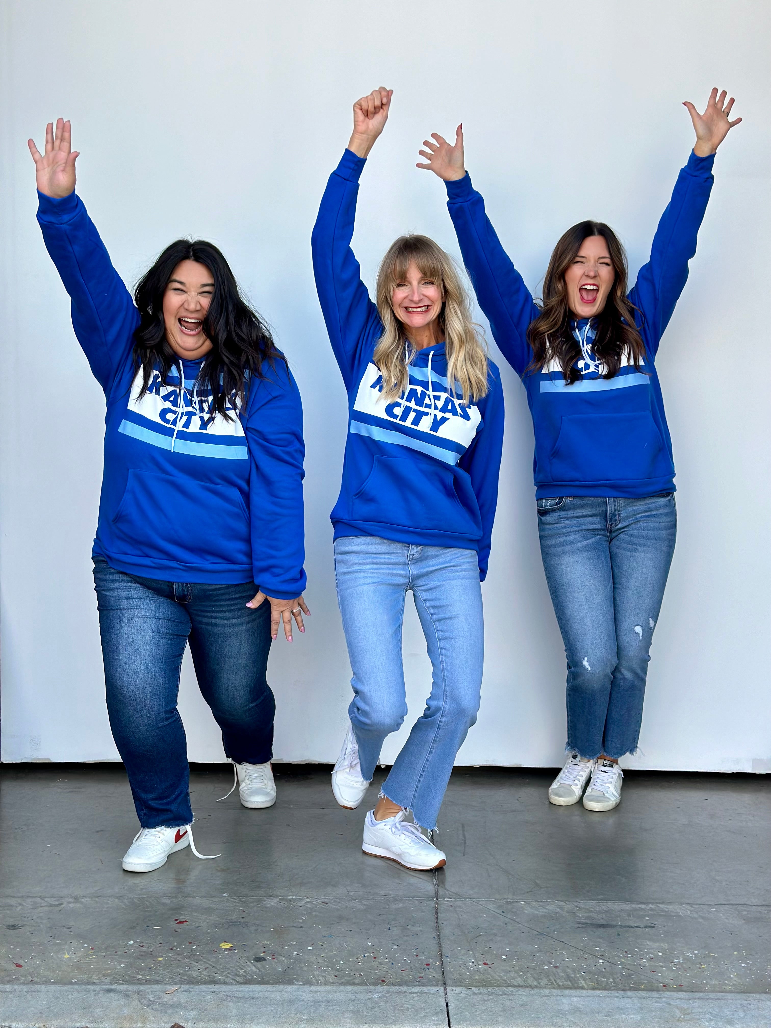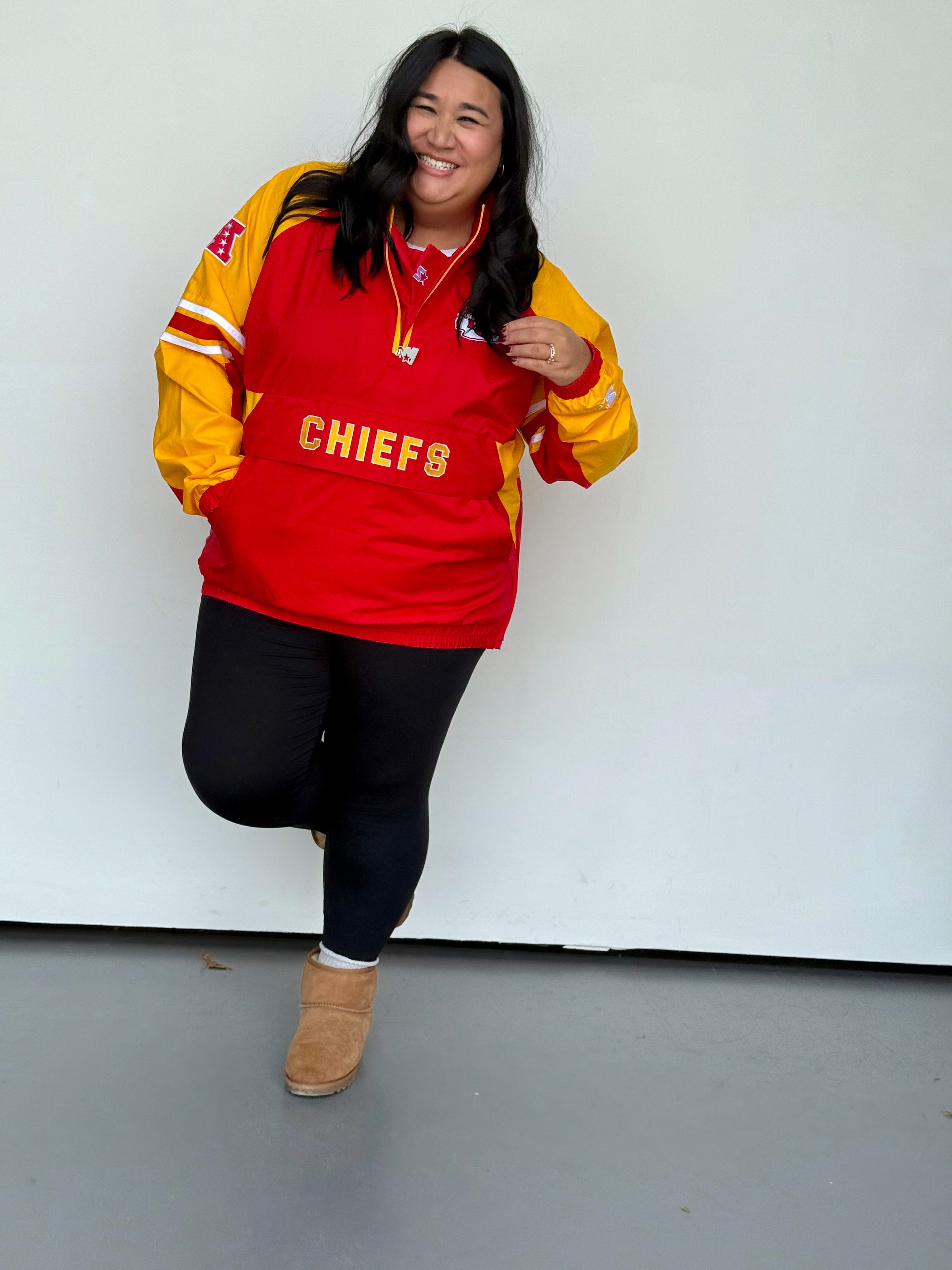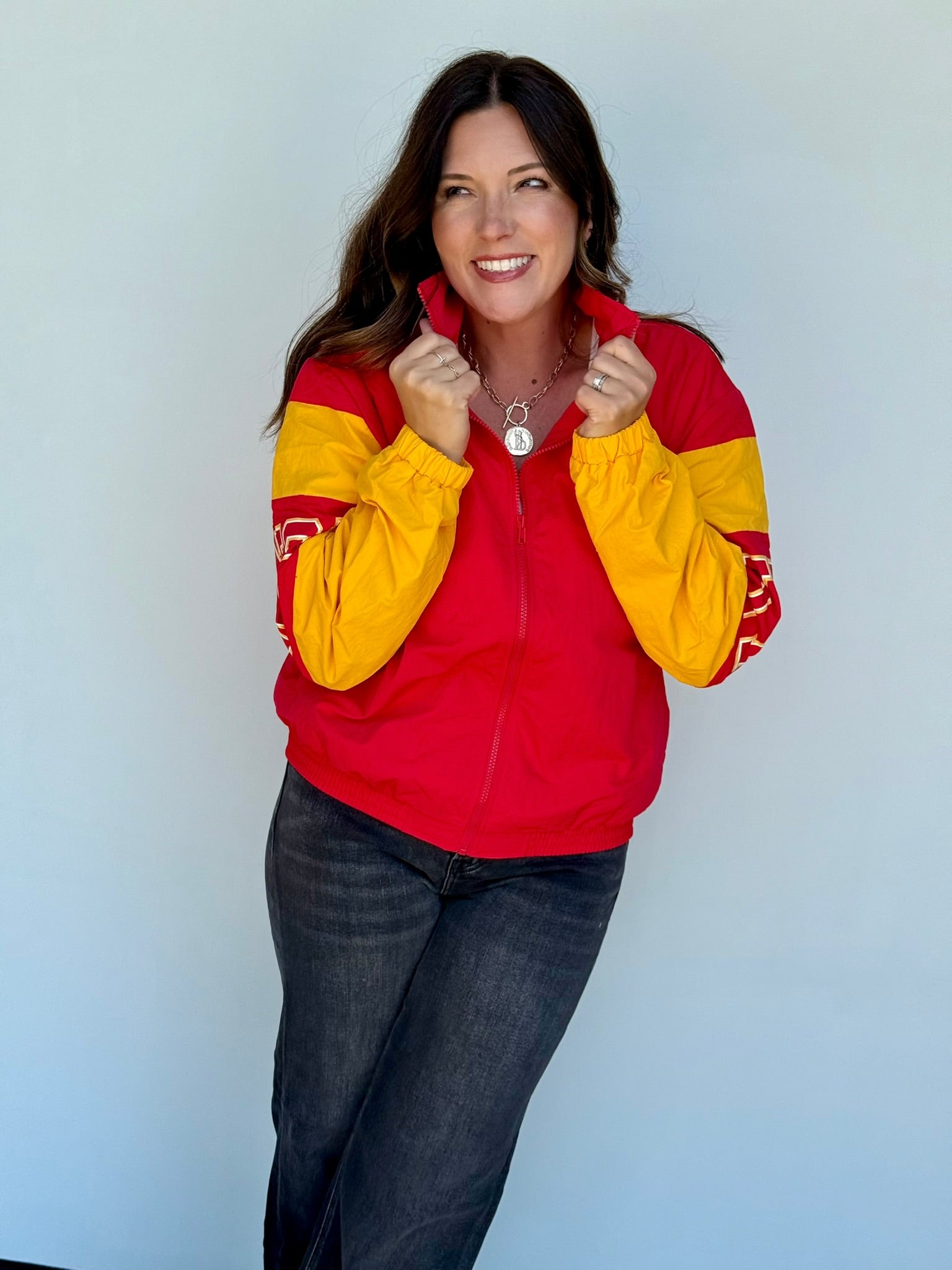 This oversized button-up cardi brings that vintage varsity vibe with a bold KC twist. Made in a vibrant game-day red with gold and white striping on the sleeves and hem, it features a detailed embroidered helmet patch on the front and “Kansas City” across the back for the ultimate fan finish.