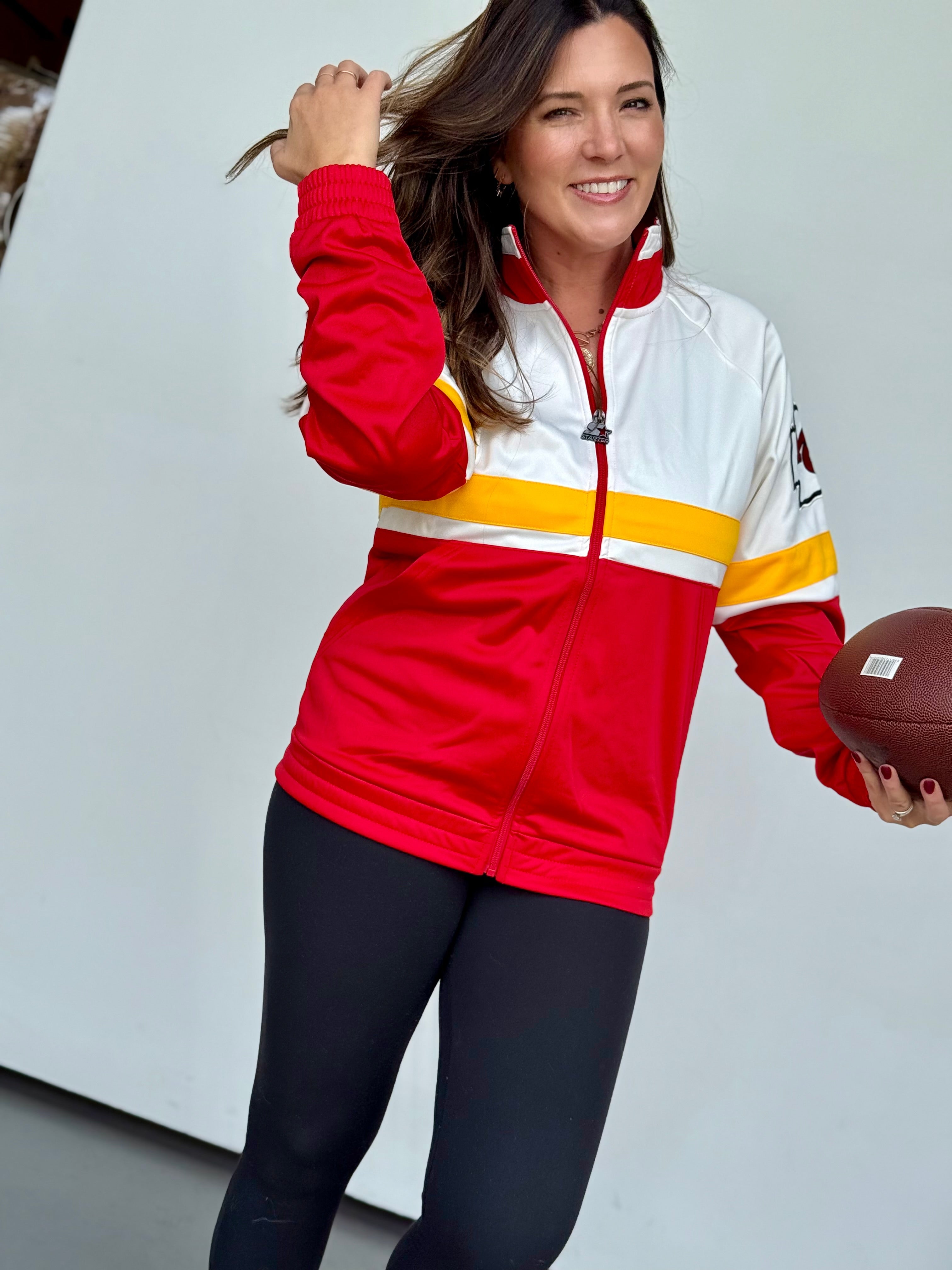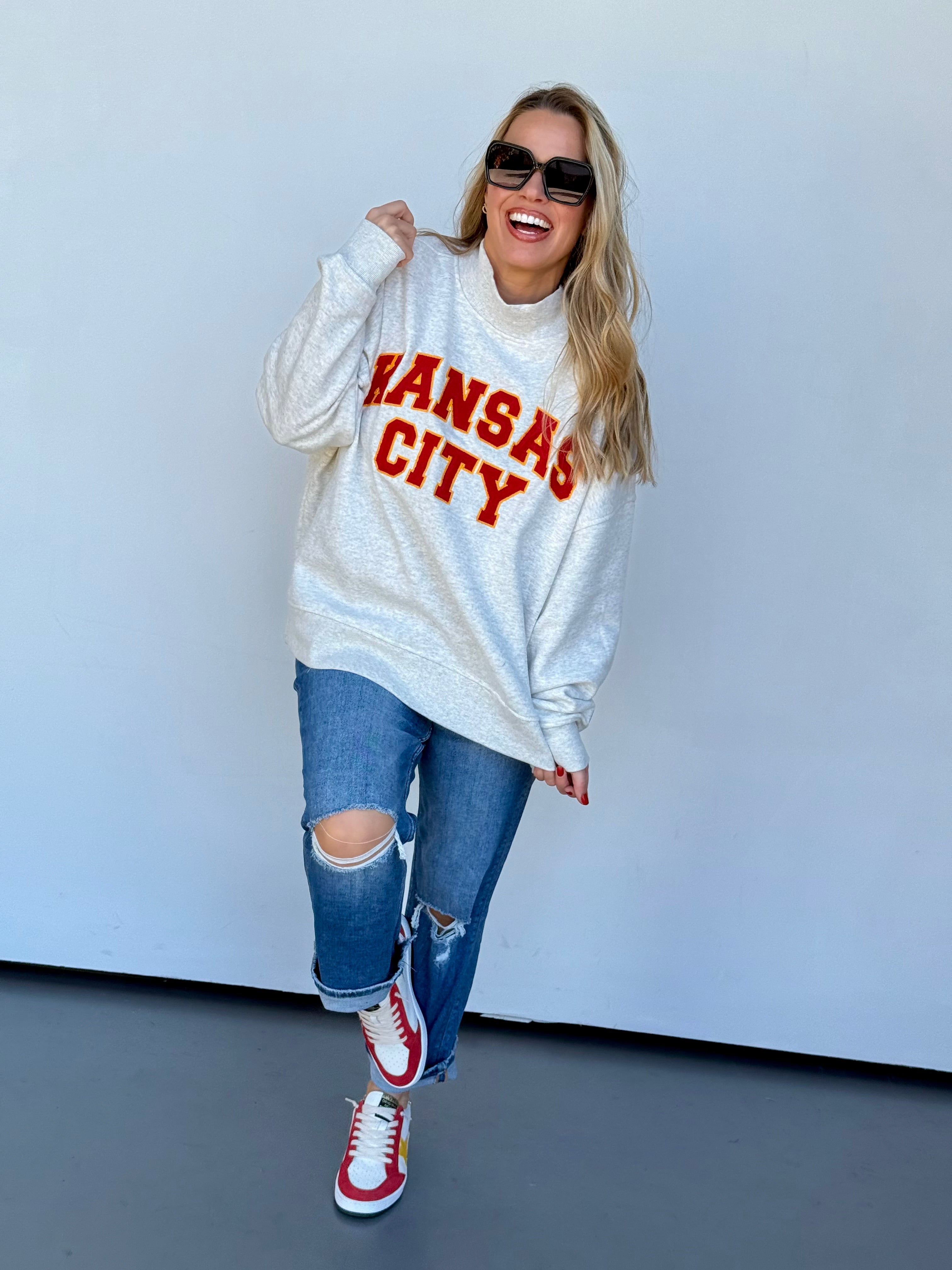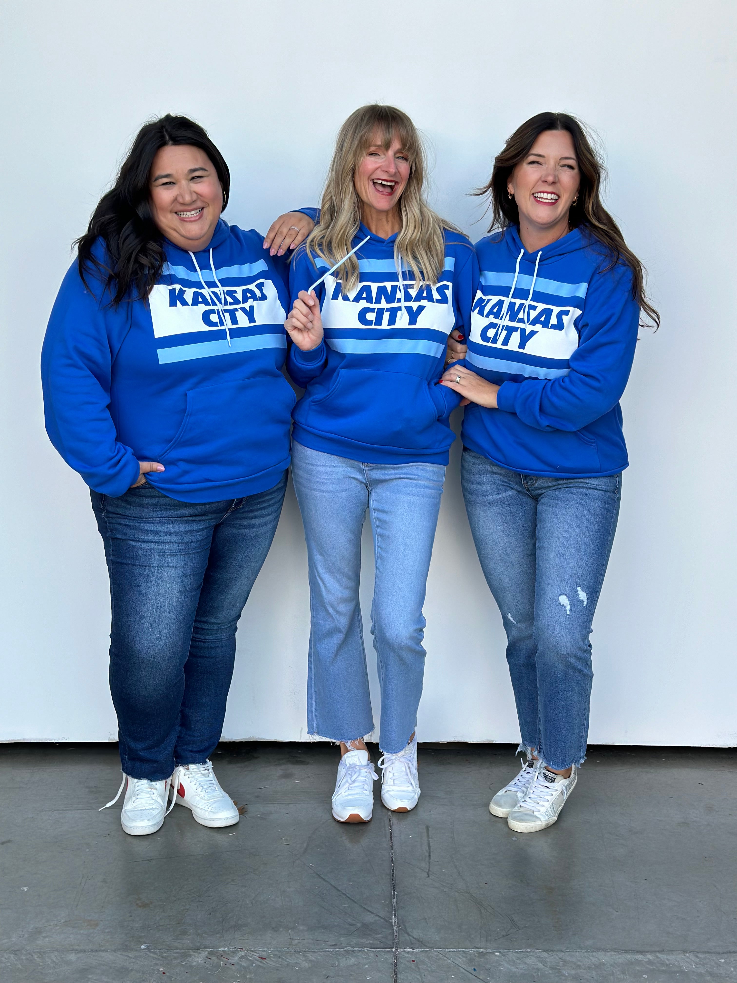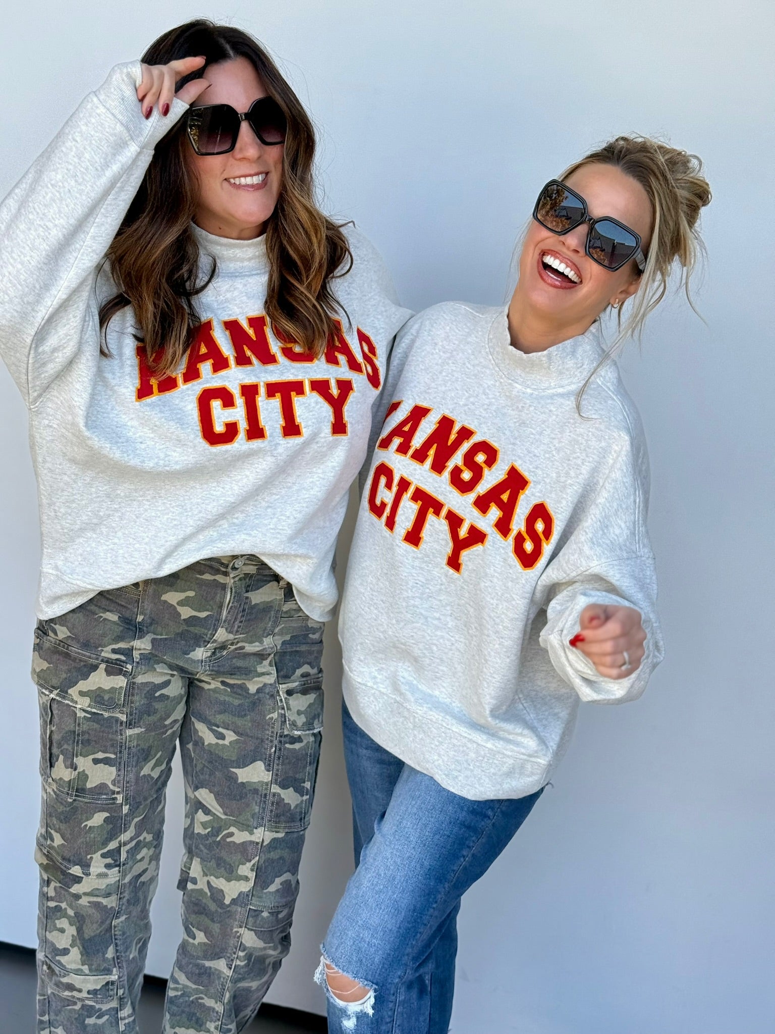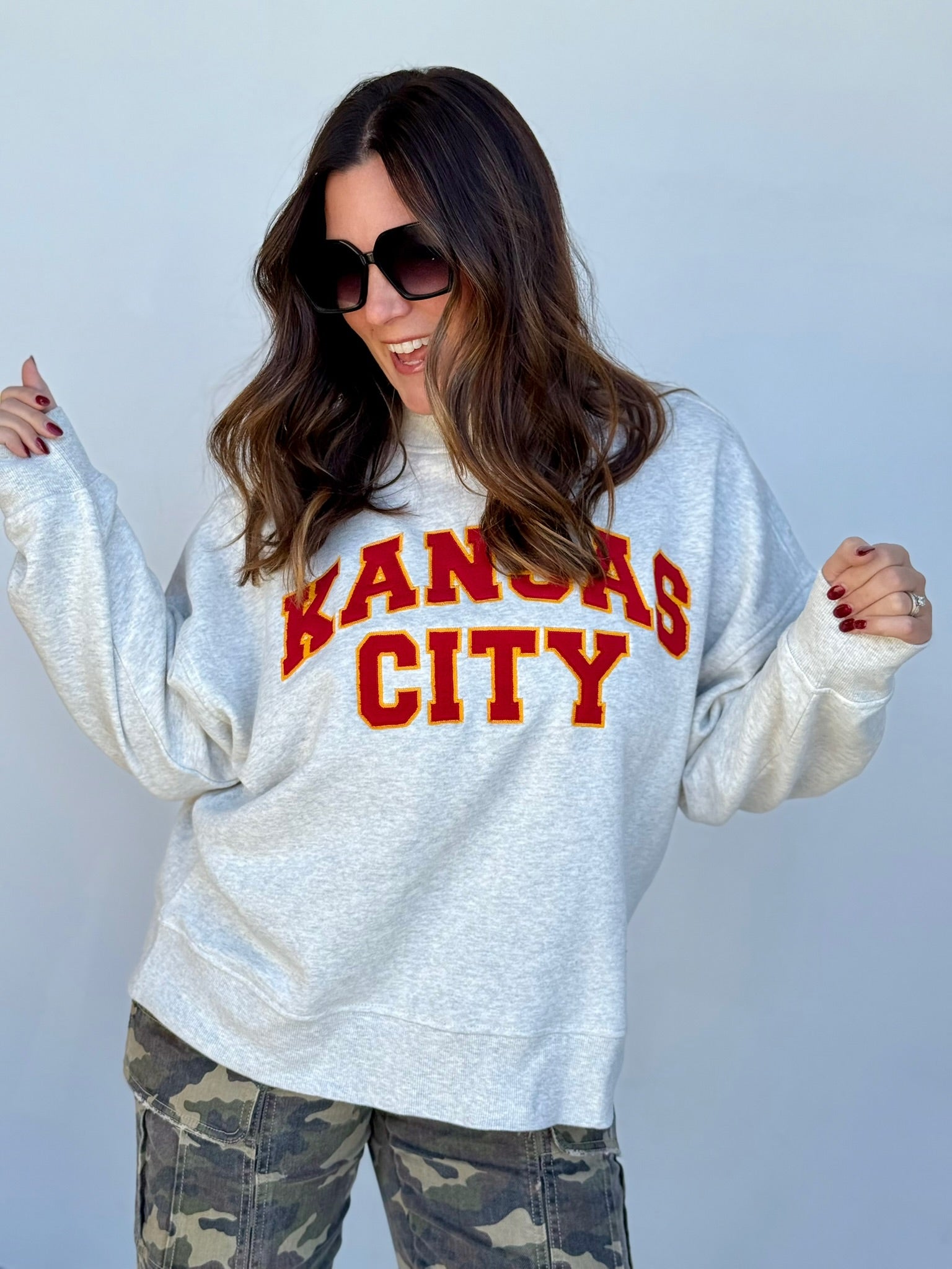 This oversized button-up cardi brings that vintage varsity vibe with a bold KC twist. Made in a vibrant game-day red with gold and white striping on the sleeves and hem, it features a detailed embroidered helmet patch on the front and “Kansas City” across the back for the ultimate fan finish.