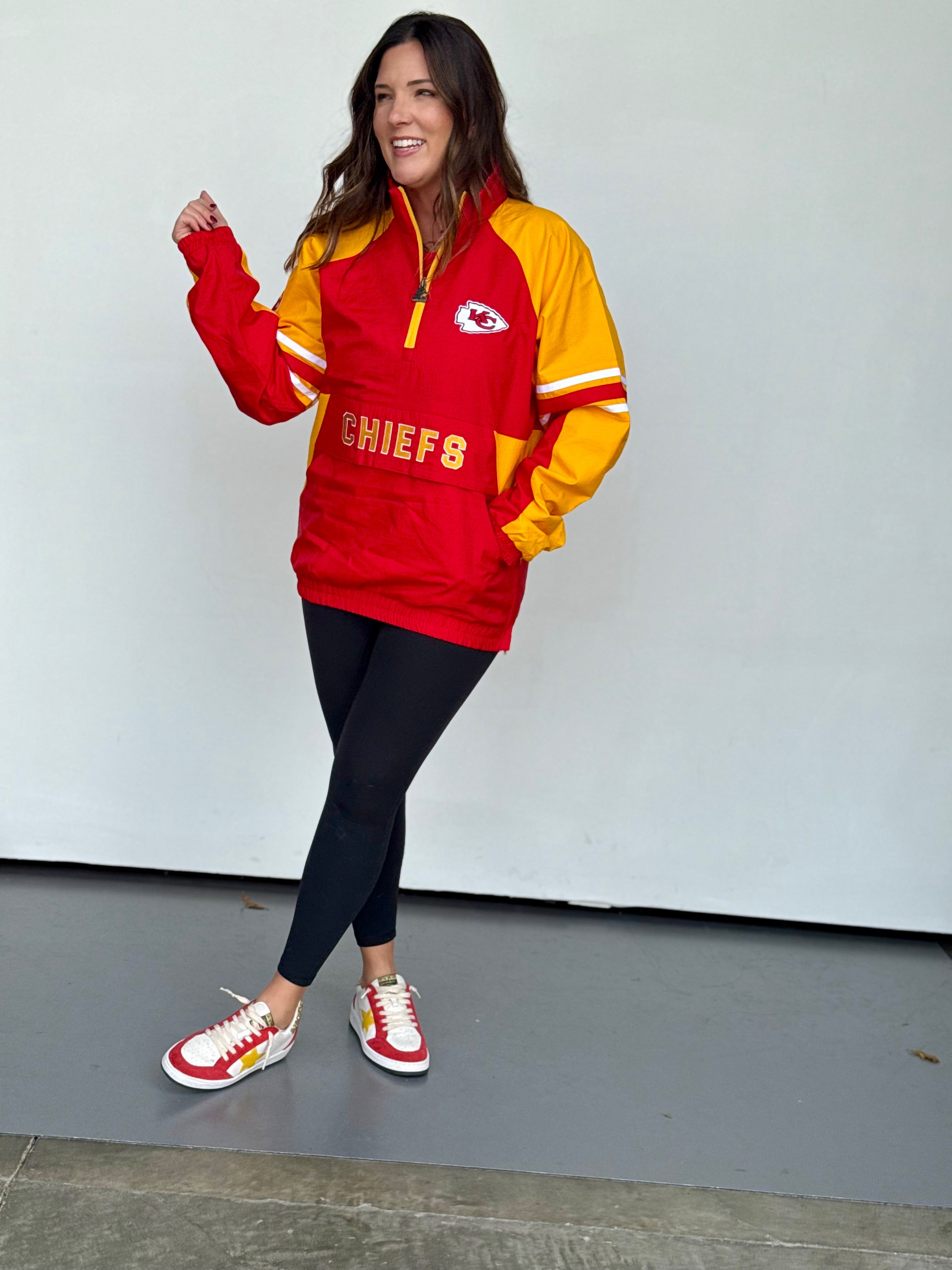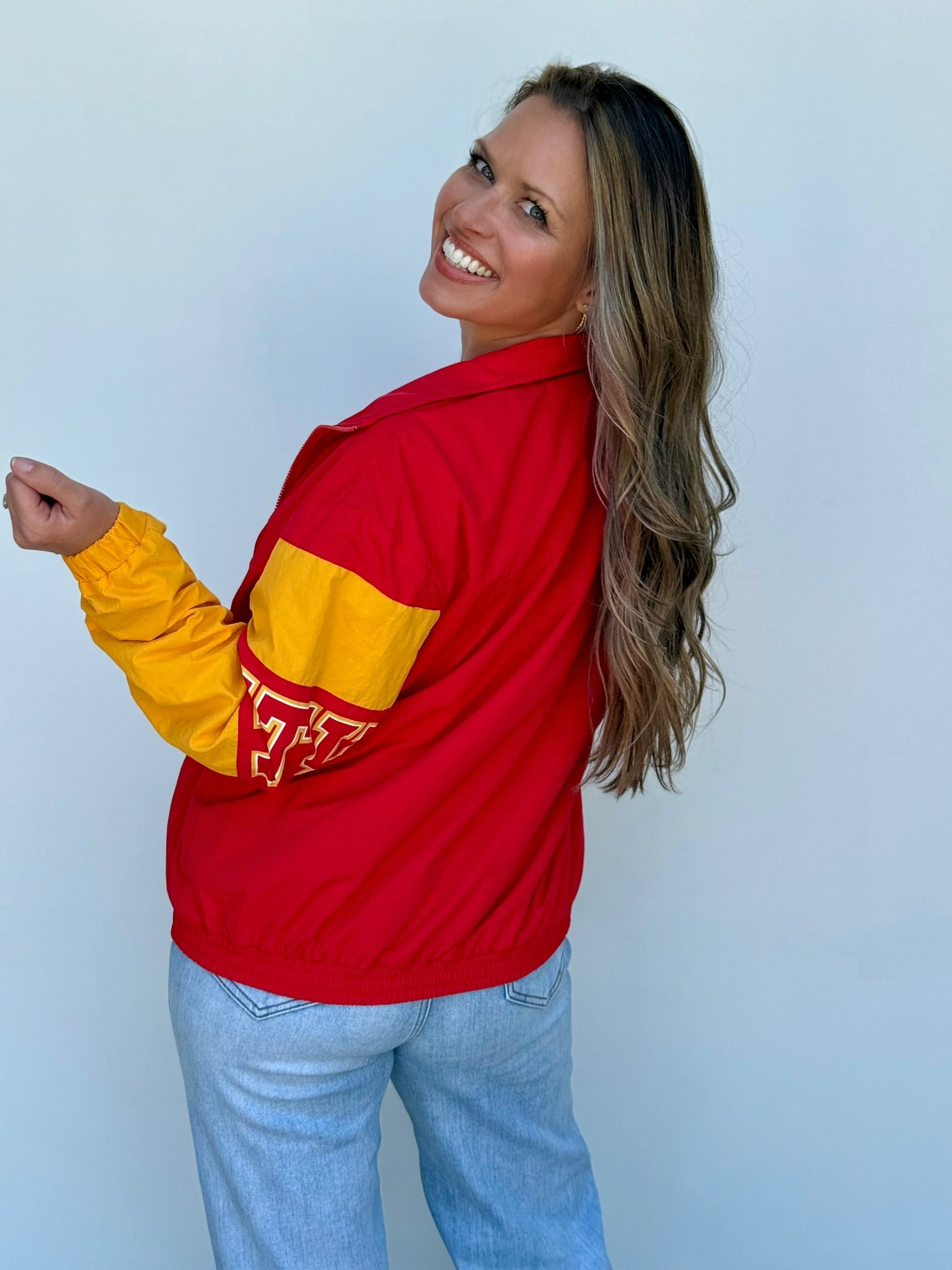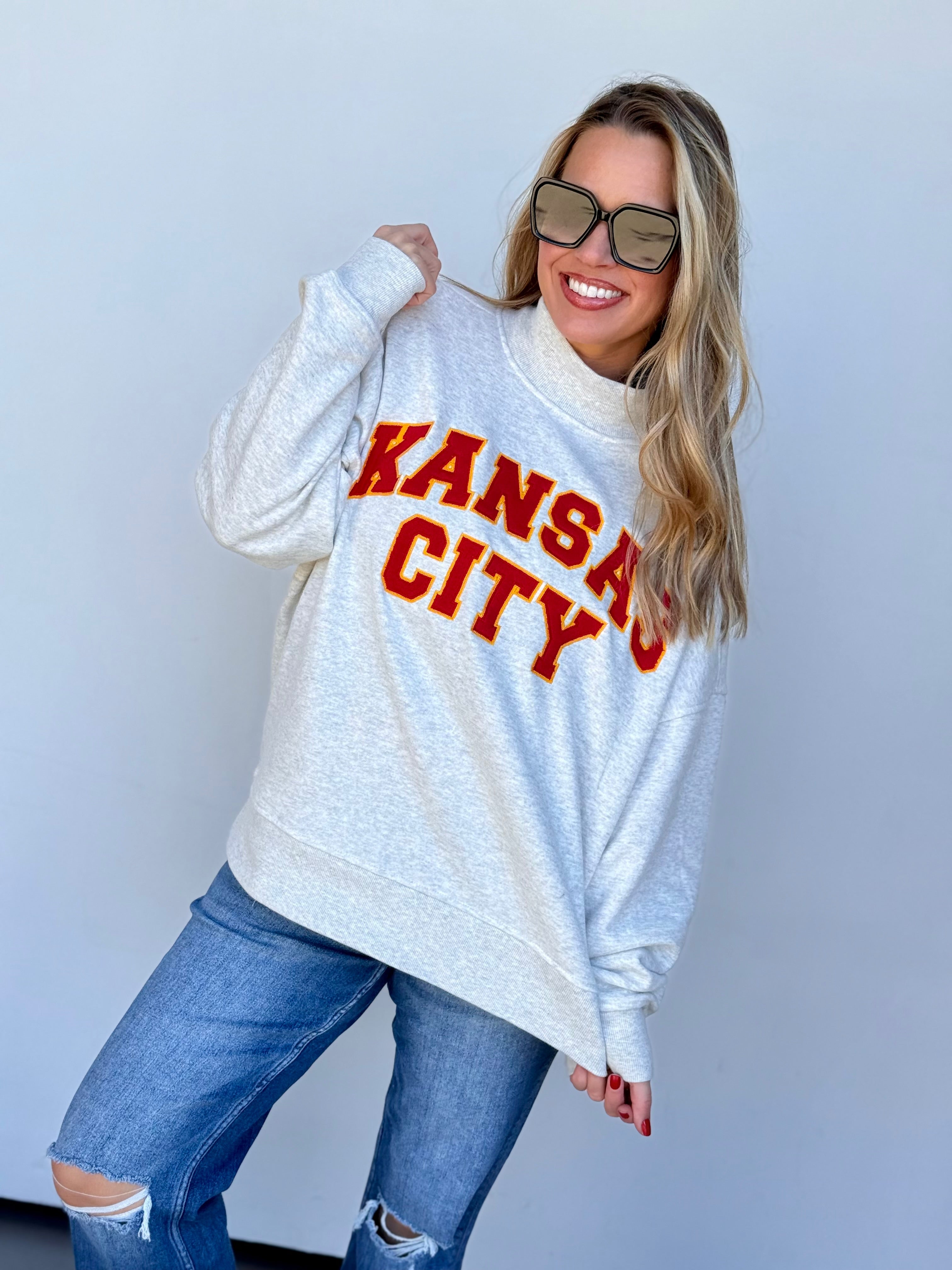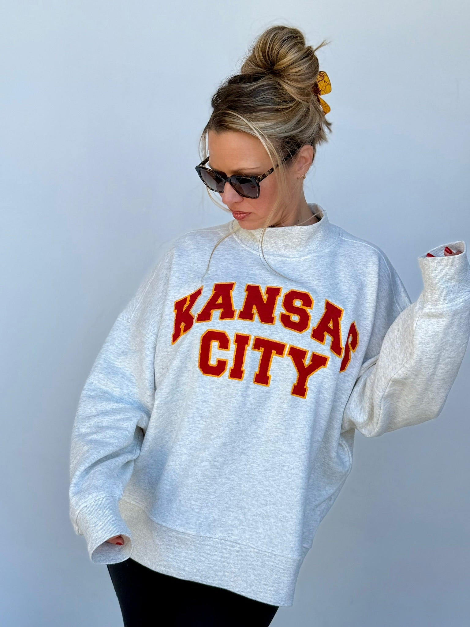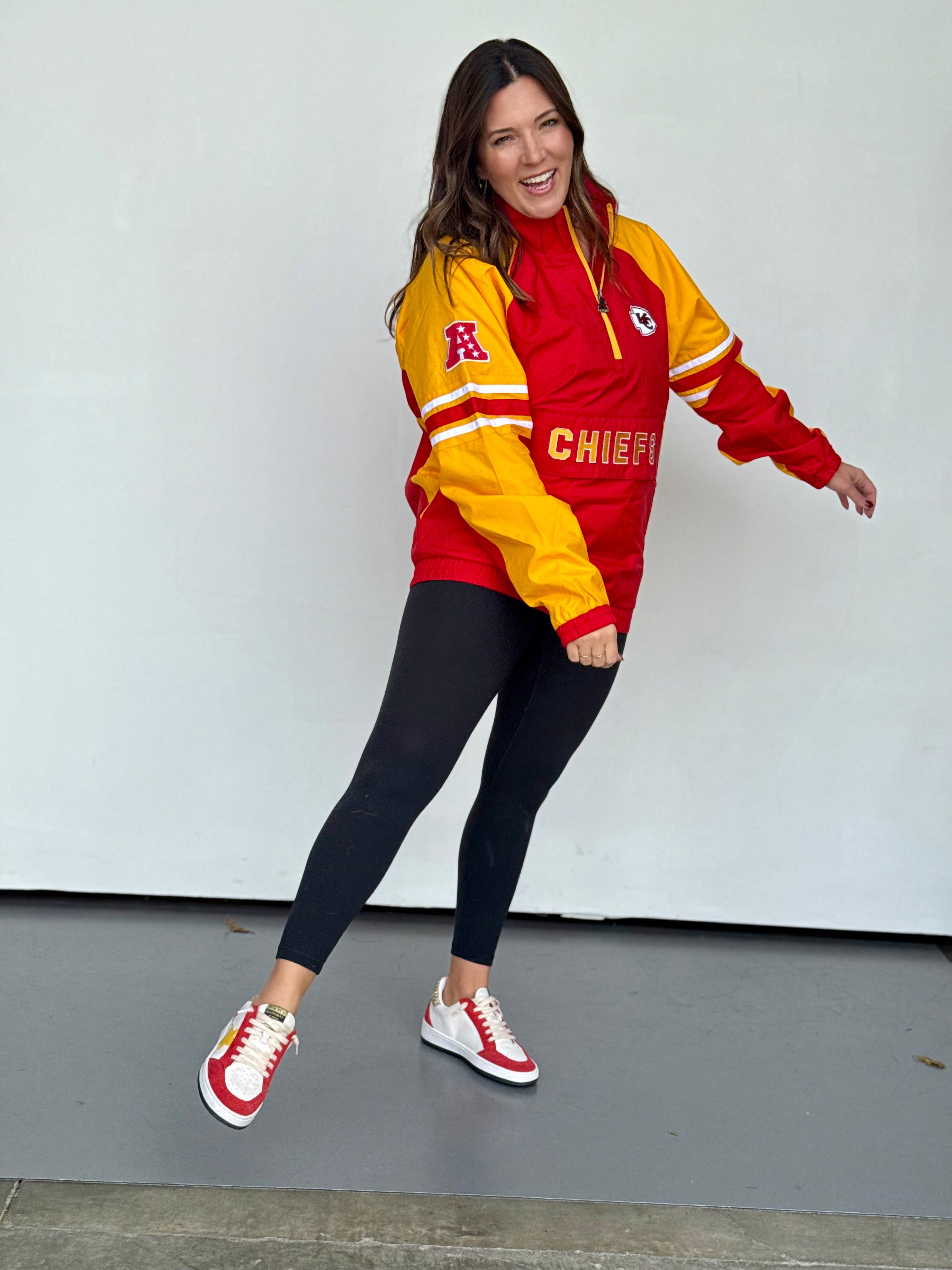 This oversized button-up cardi brings that vintage varsity vibe with a bold KC twist. Made in a vibrant game-day red with gold and white striping on the sleeves and hem, it features a detailed embroidered helmet patch on the front and “Kansas City” across the back for the ultimate fan finish.