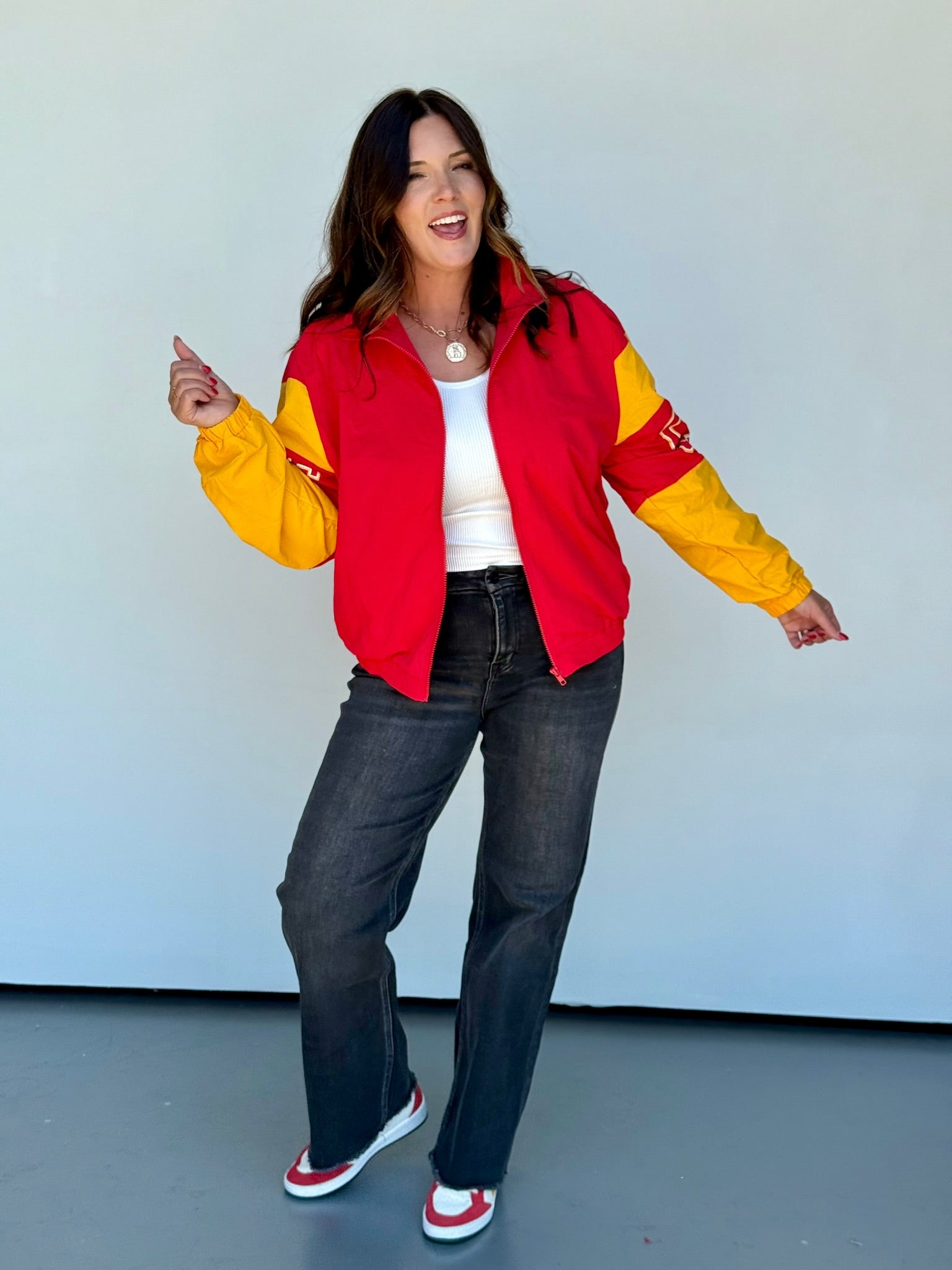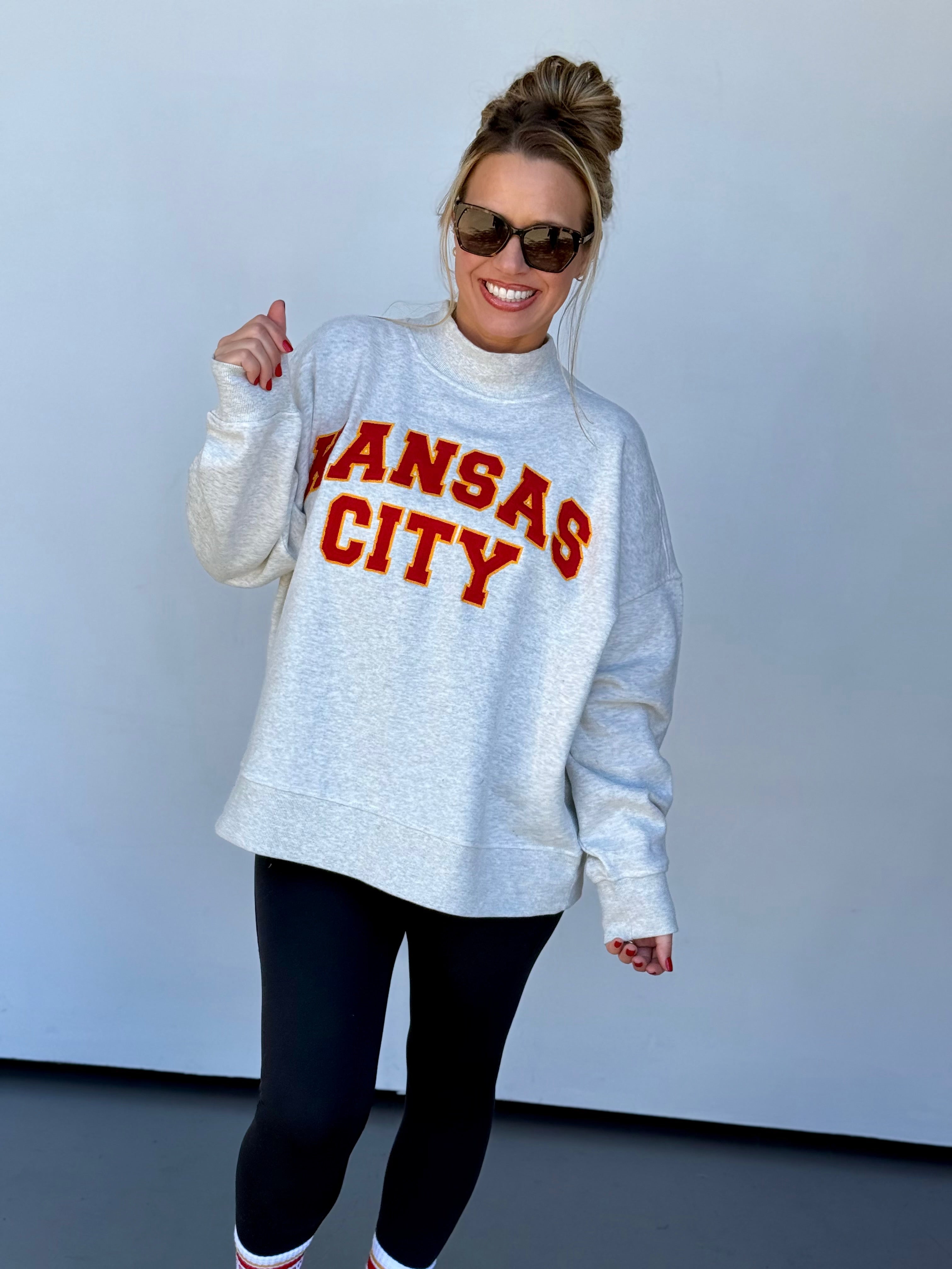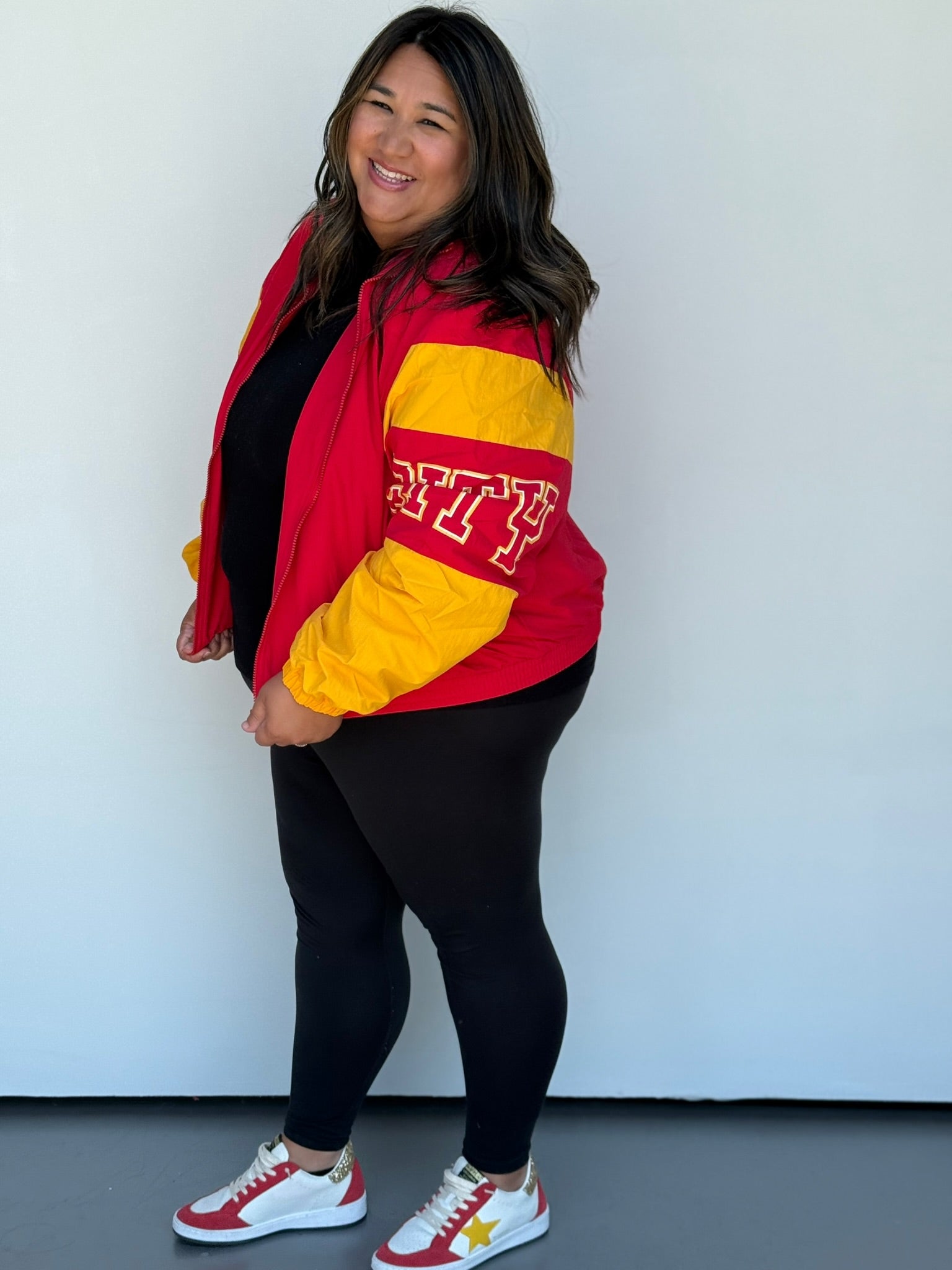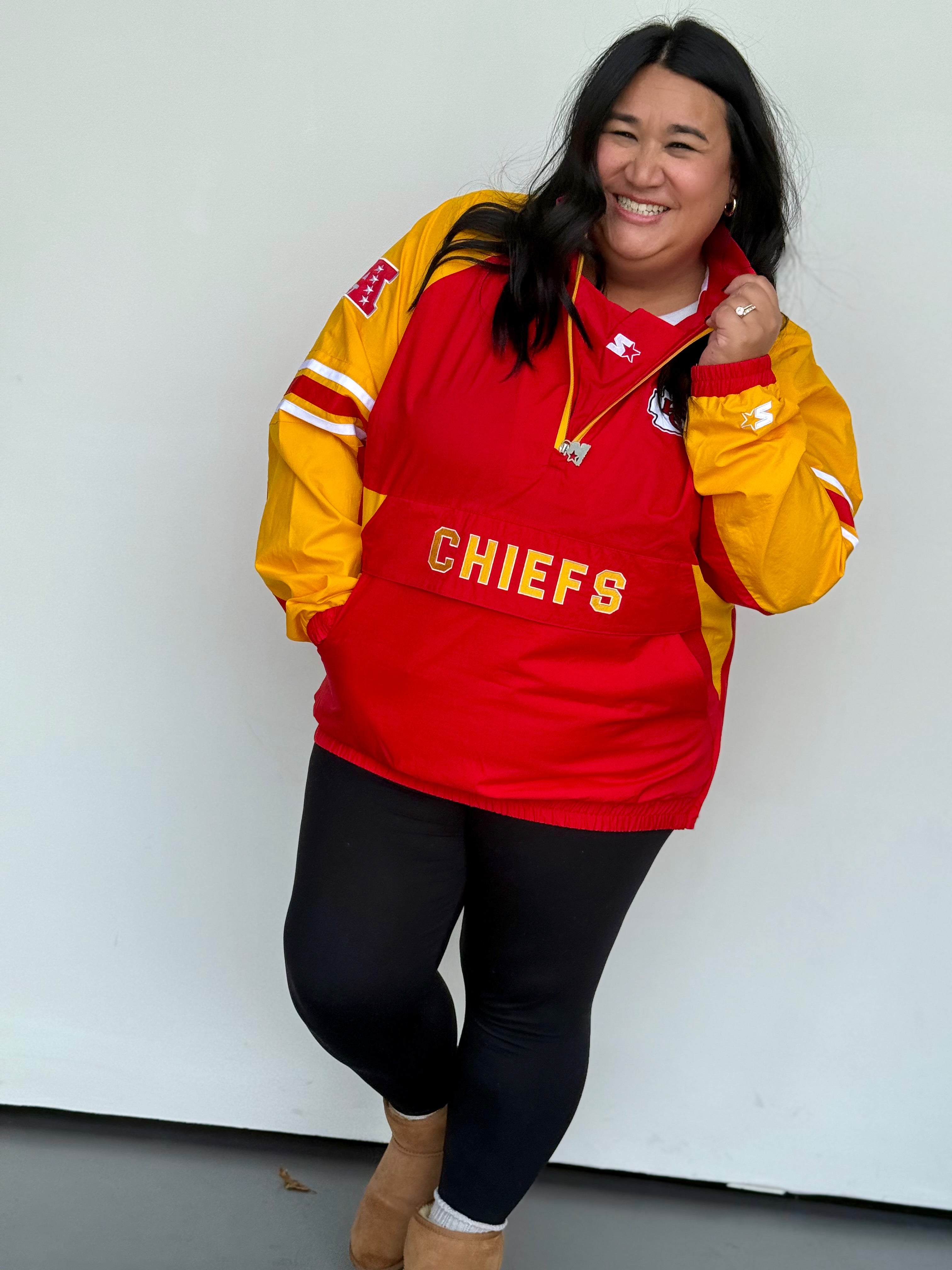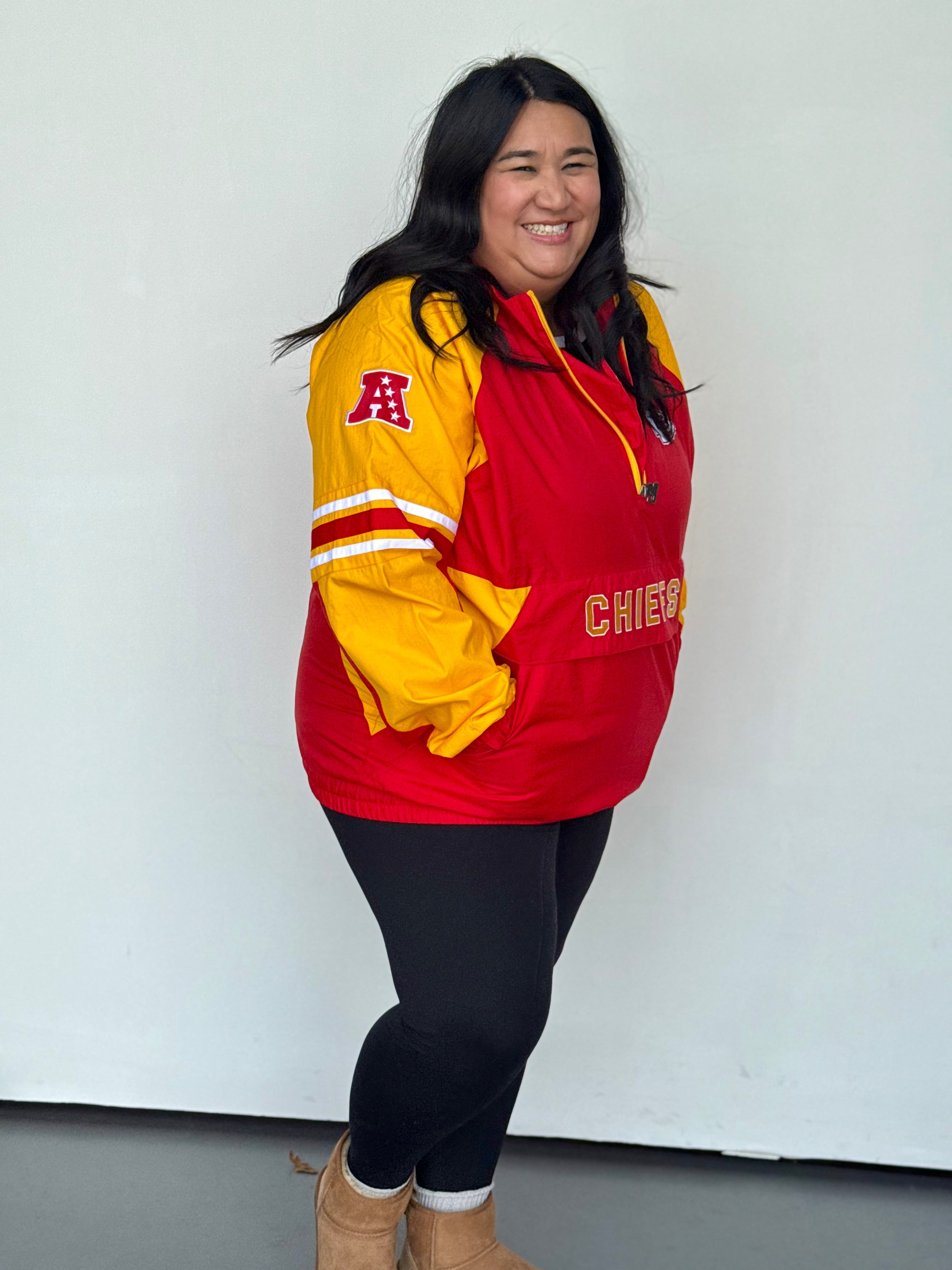 This oversized button-up cardi brings that vintage varsity vibe with a bold KC twist. Made in a vibrant game-day red with gold and white striping on the sleeves and hem, it features a detailed embroidered helmet patch on the front and “Kansas City” across the back for the ultimate fan finish.