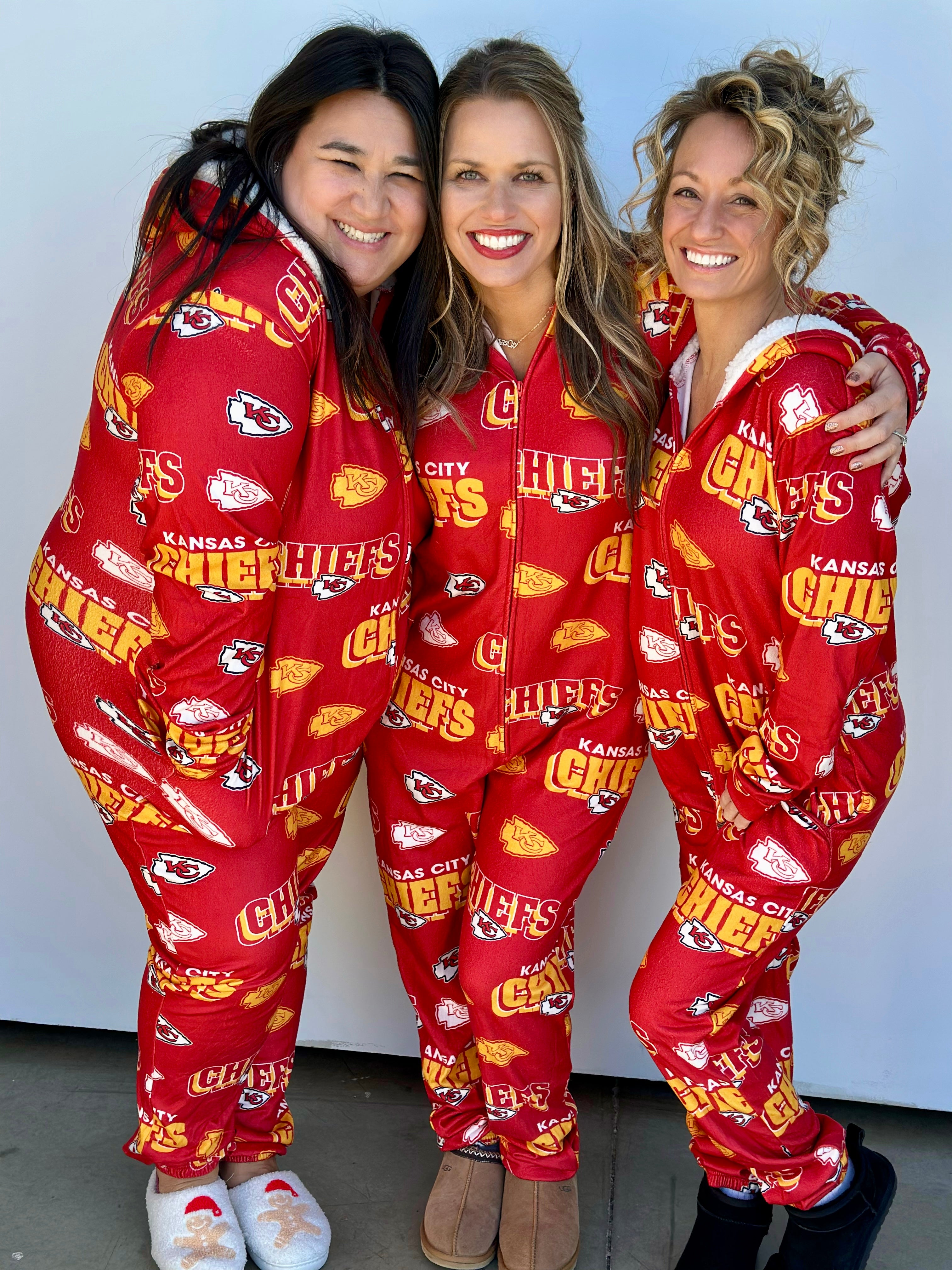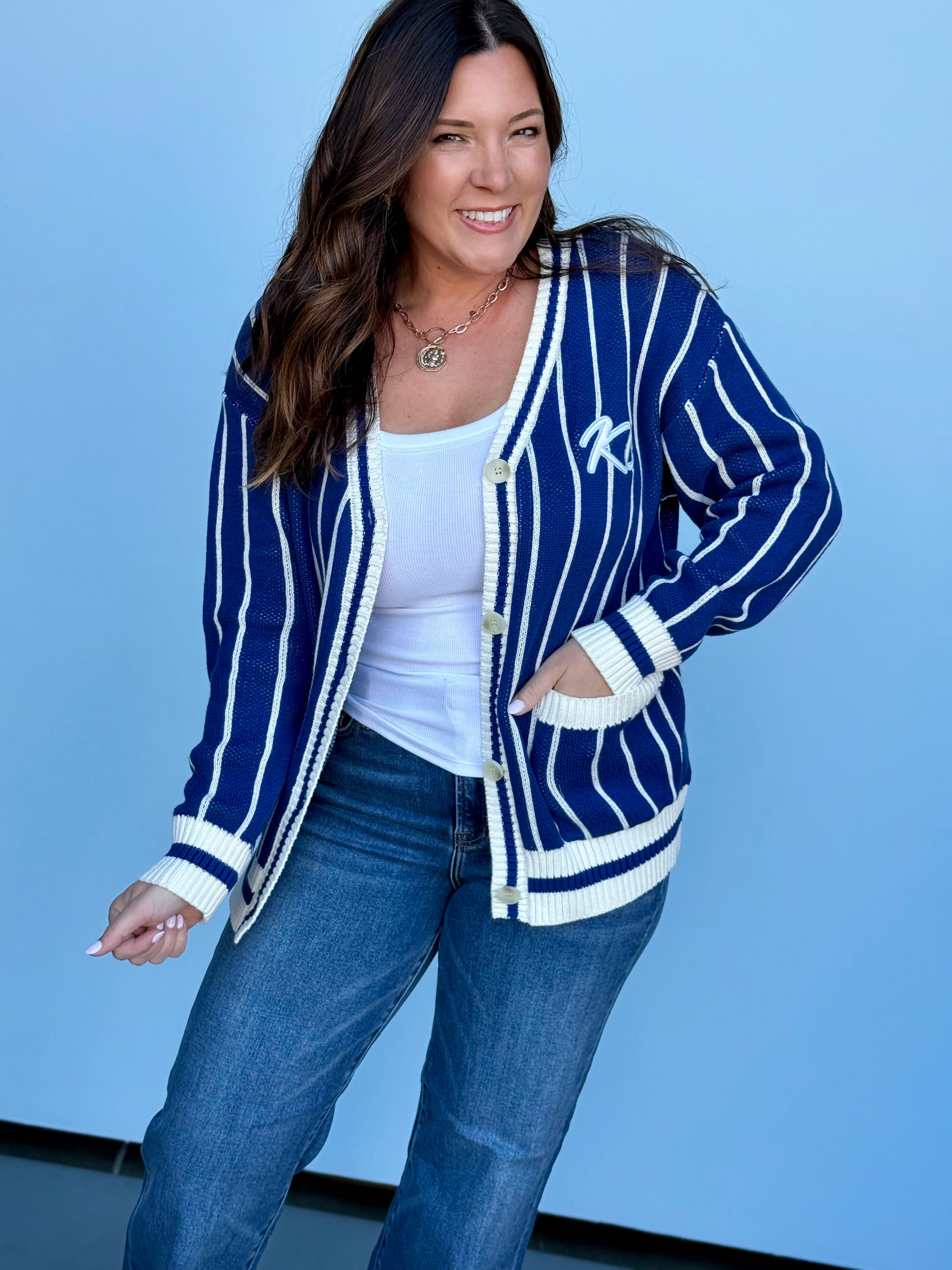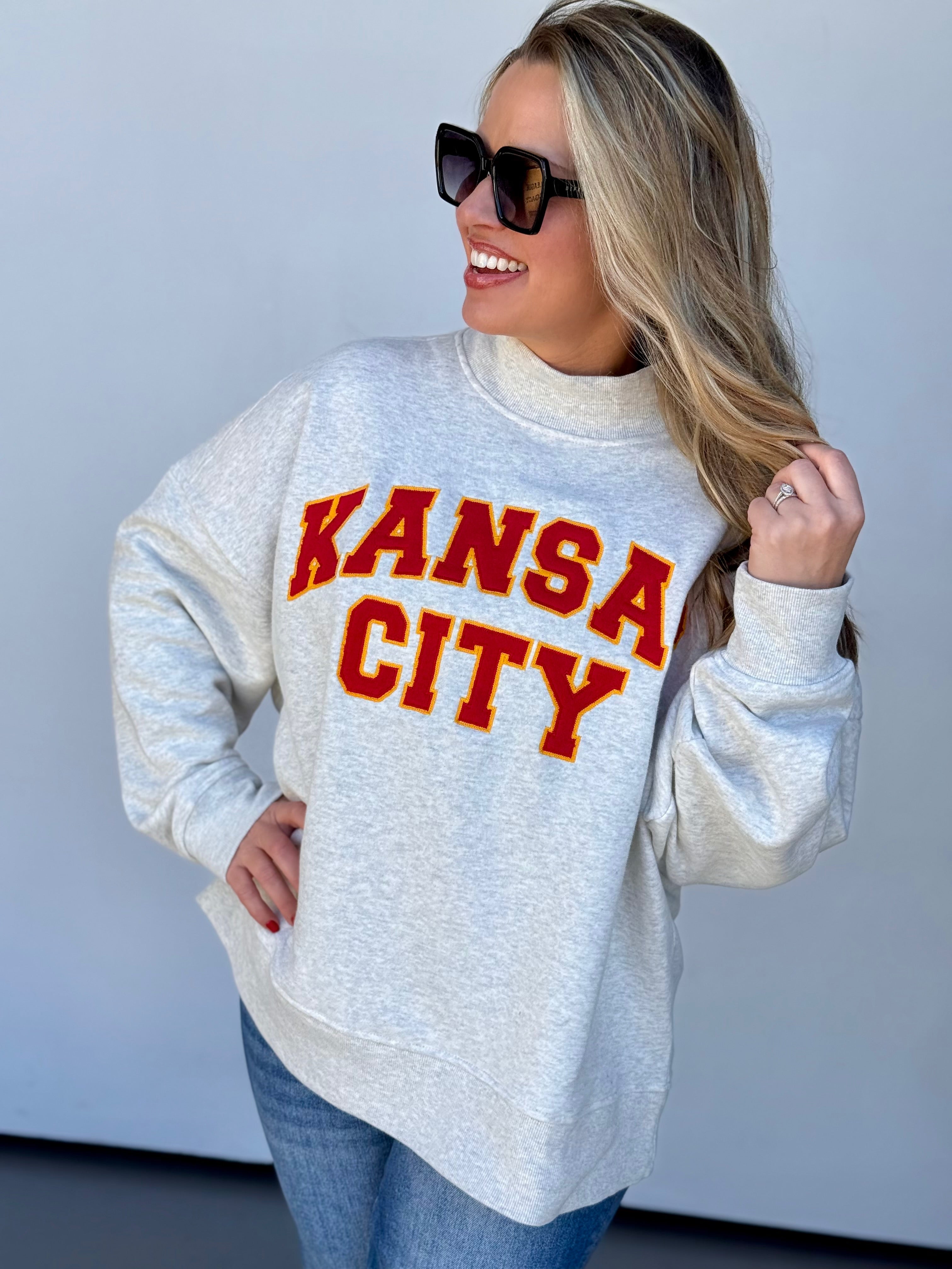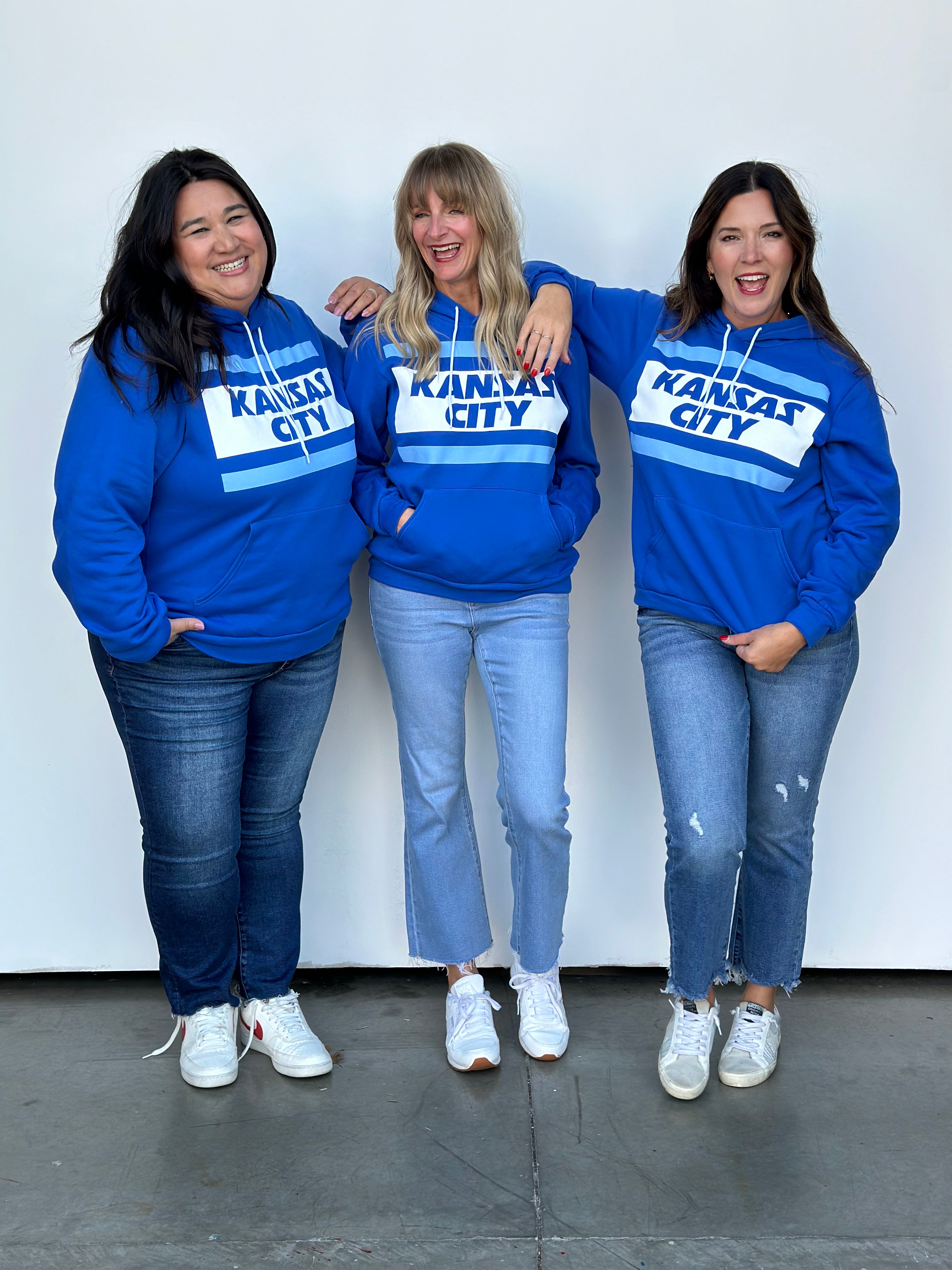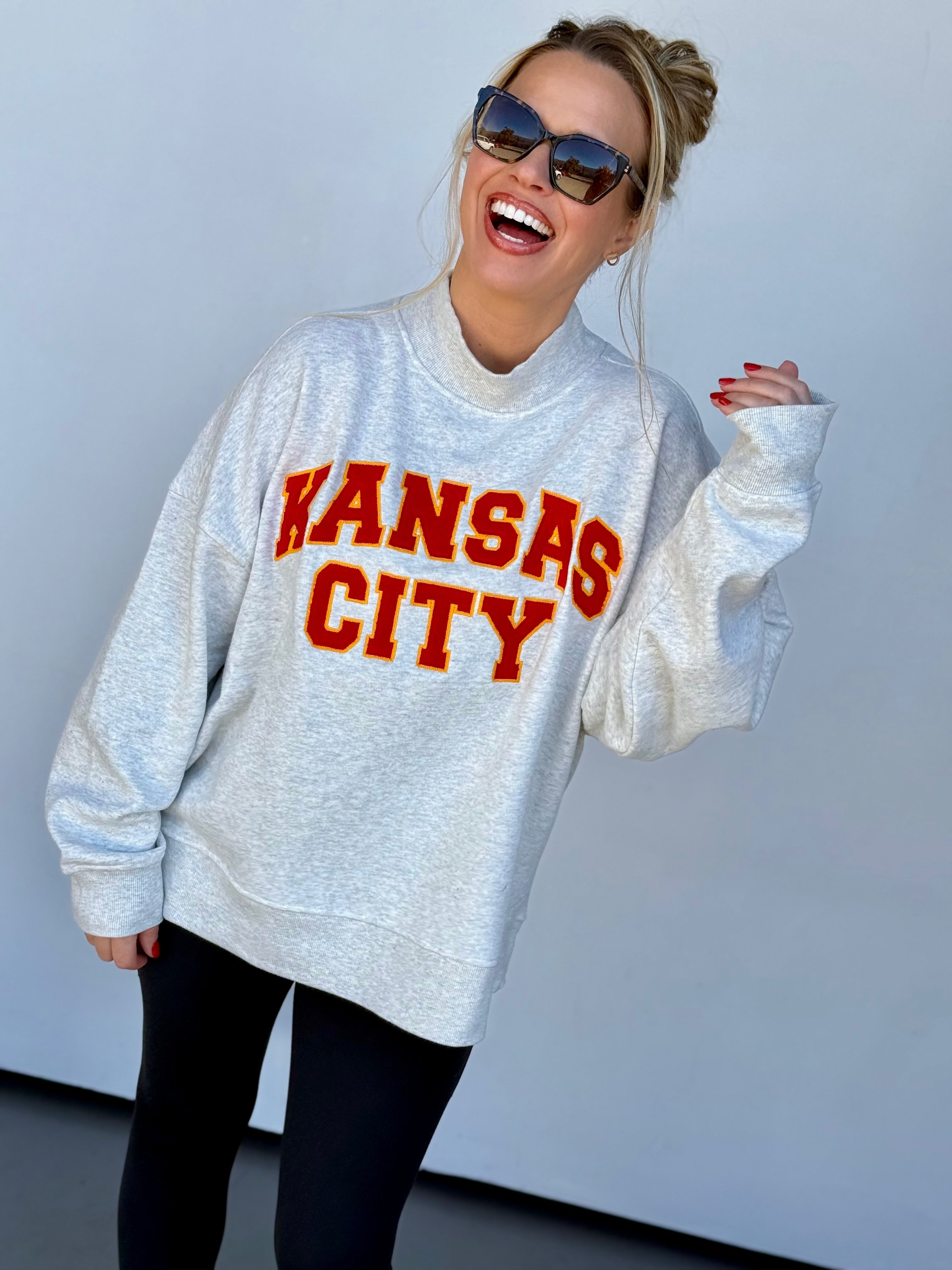 This oversized button-up cardi brings that vintage varsity vibe with a bold KC twist. Made in a vibrant game-day red with gold and white striping on the sleeves and hem, it features a detailed embroidered helmet patch on the front and “Kansas City” across the back for the ultimate fan finish.