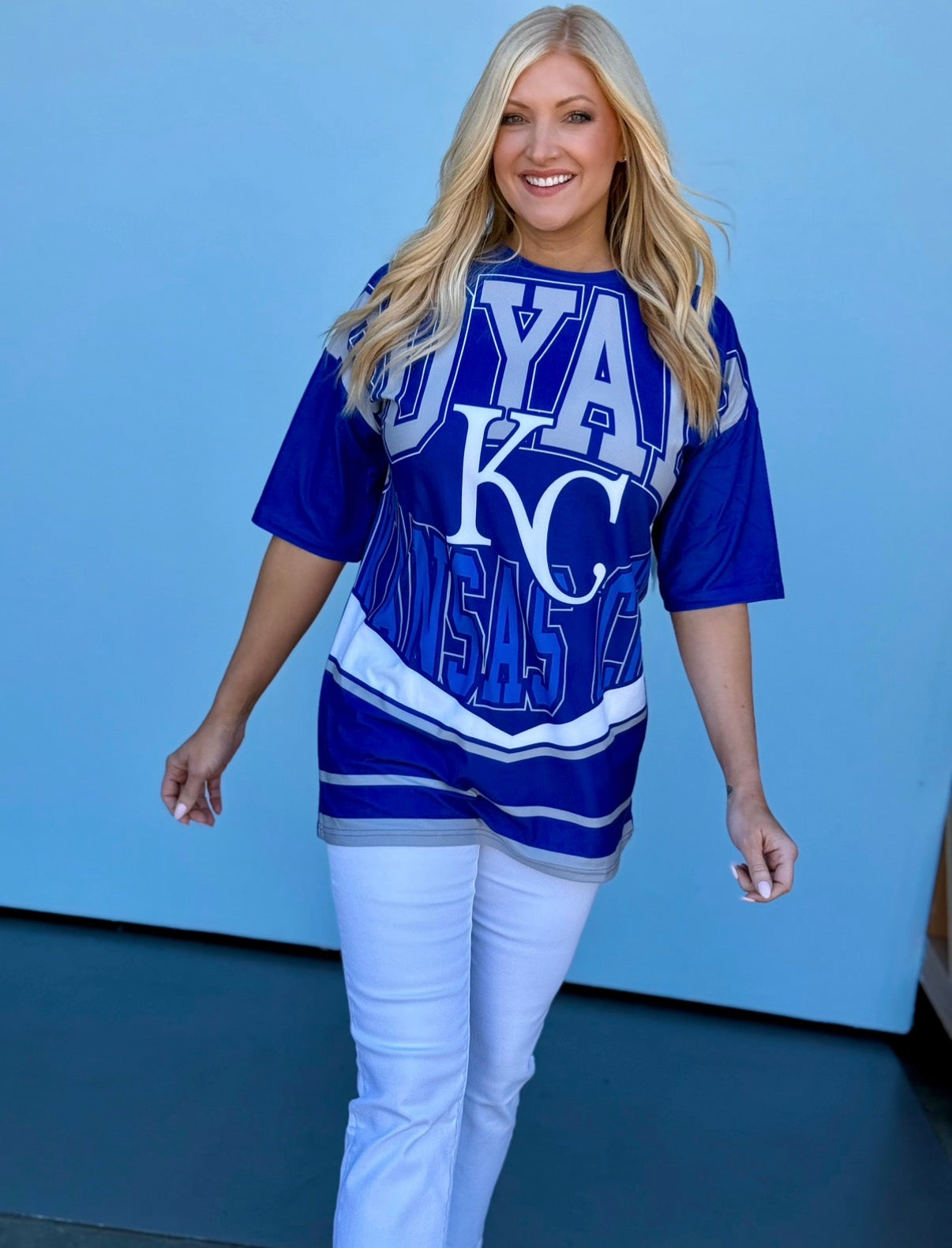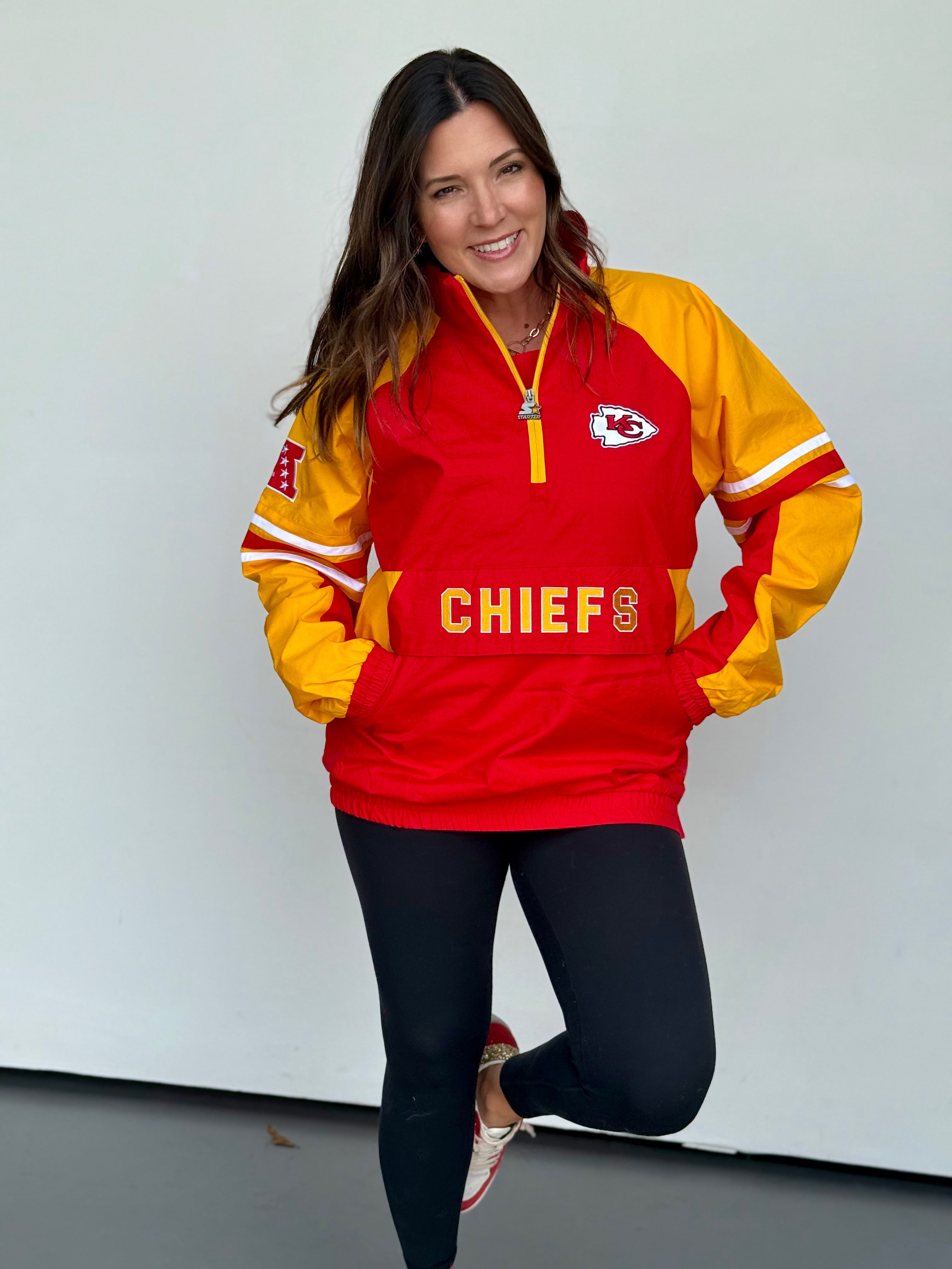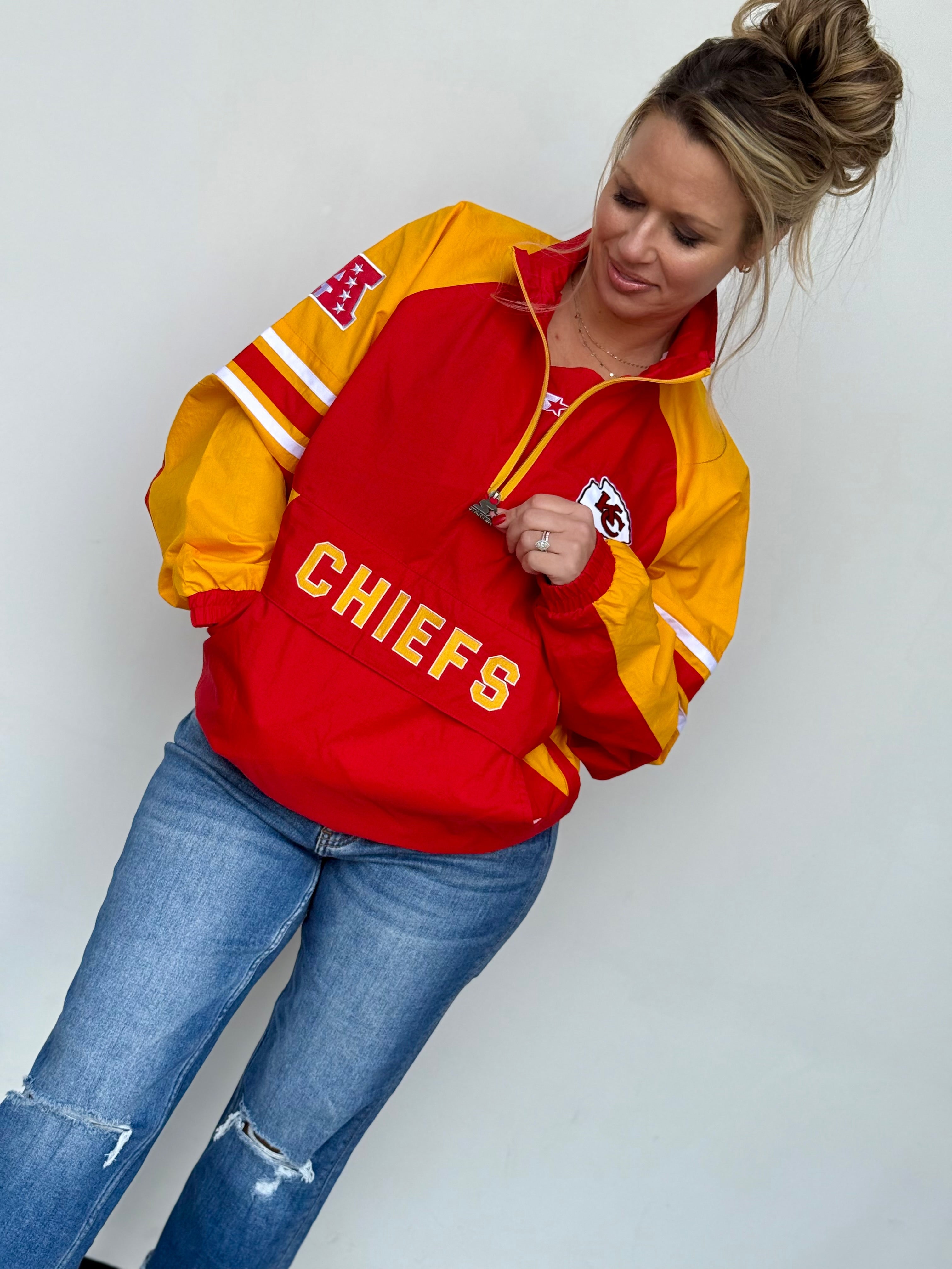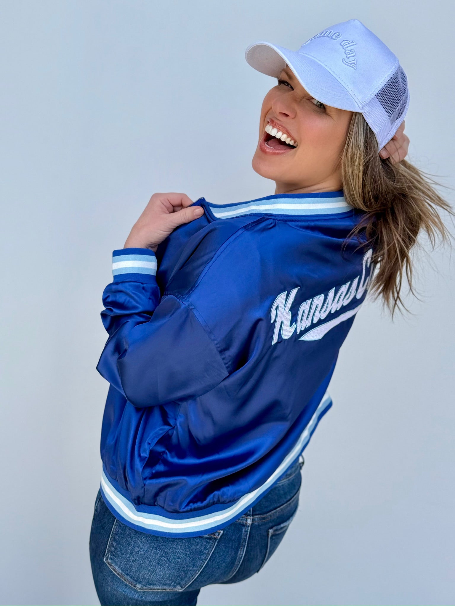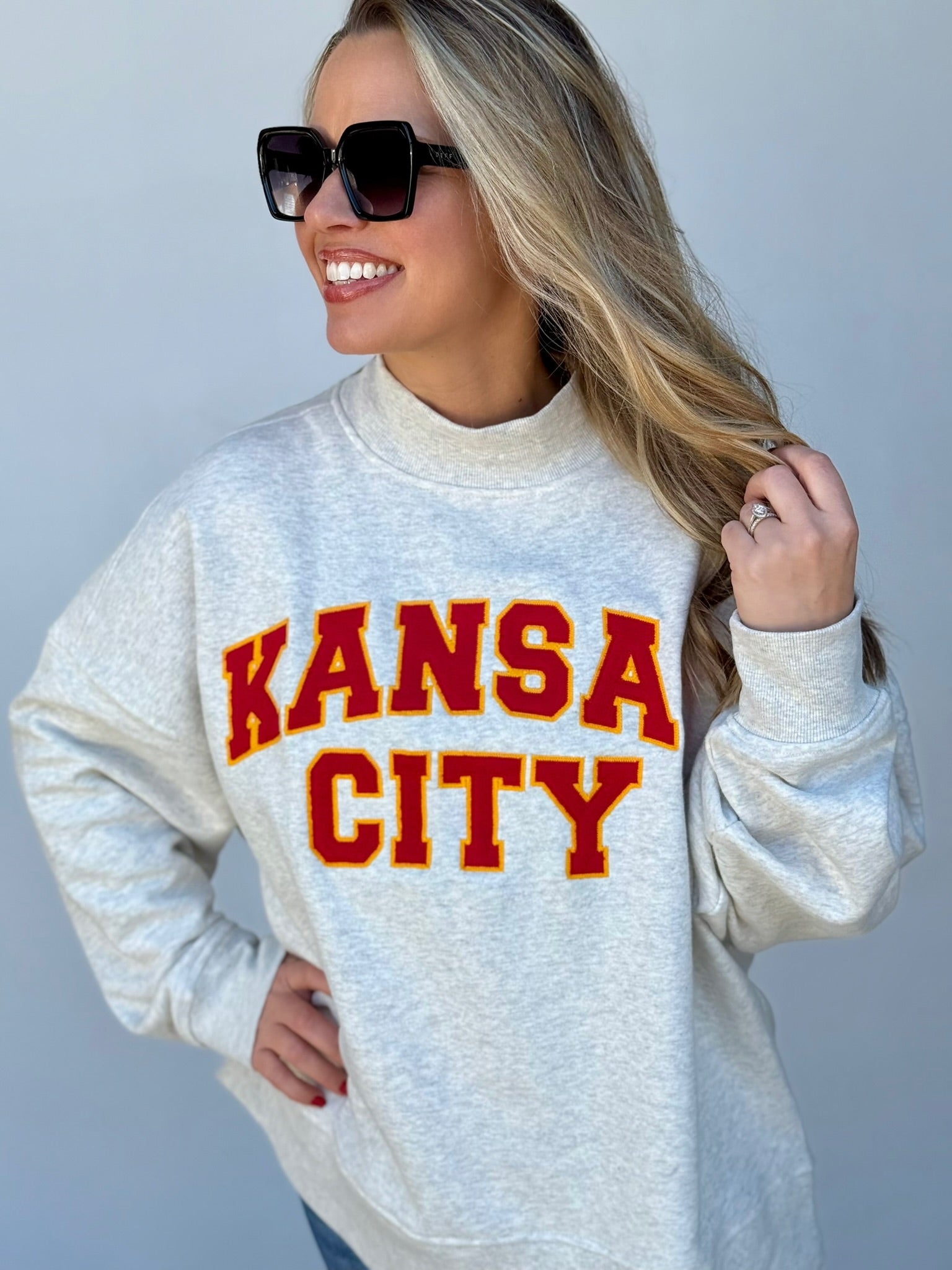 This oversized button-up cardi brings that vintage varsity vibe with a bold KC twist. Made in a vibrant game-day red with gold and white striping on the sleeves and hem, it features a detailed embroidered helmet patch on the front and “Kansas City” across the back for the ultimate fan finish.