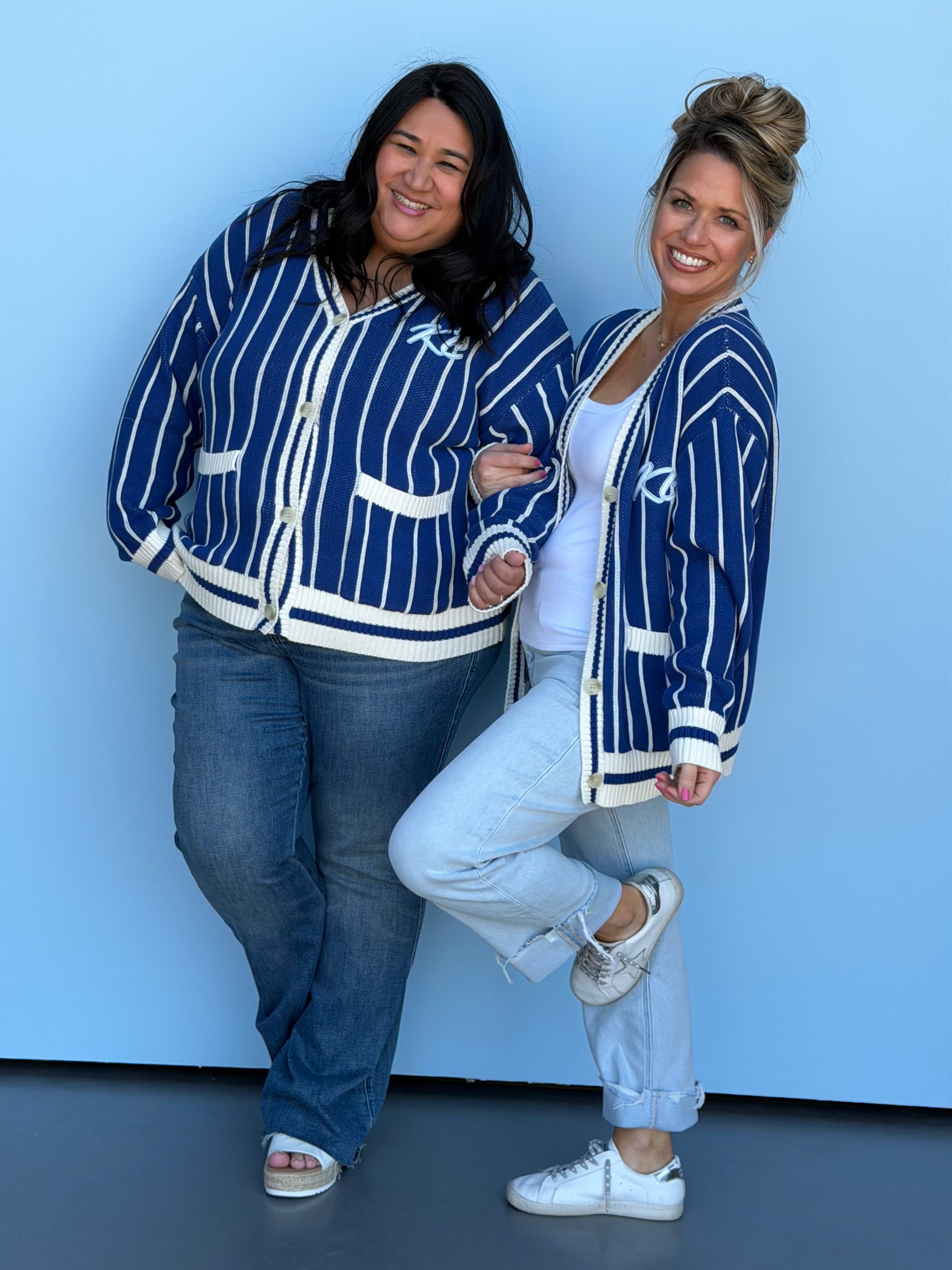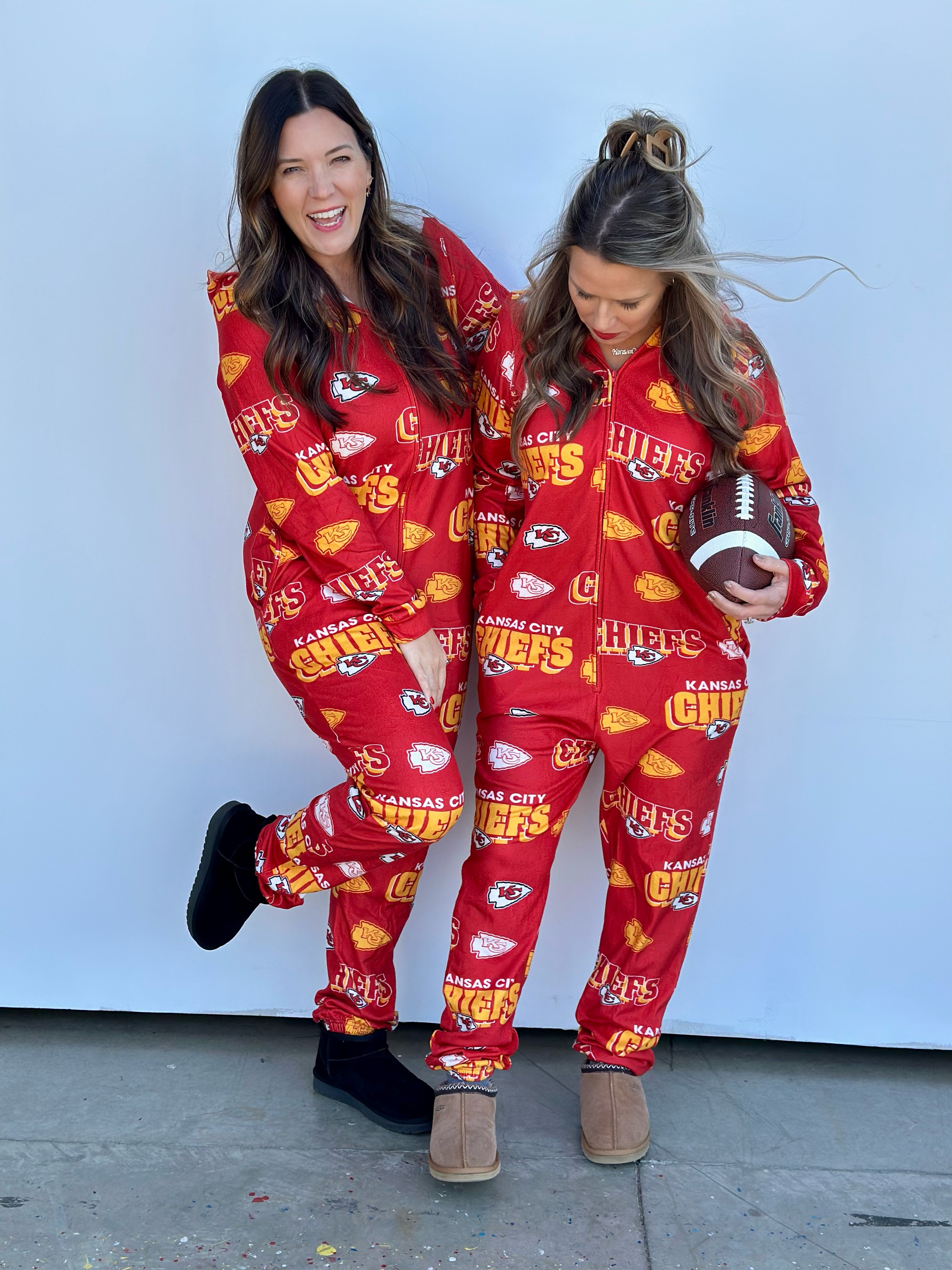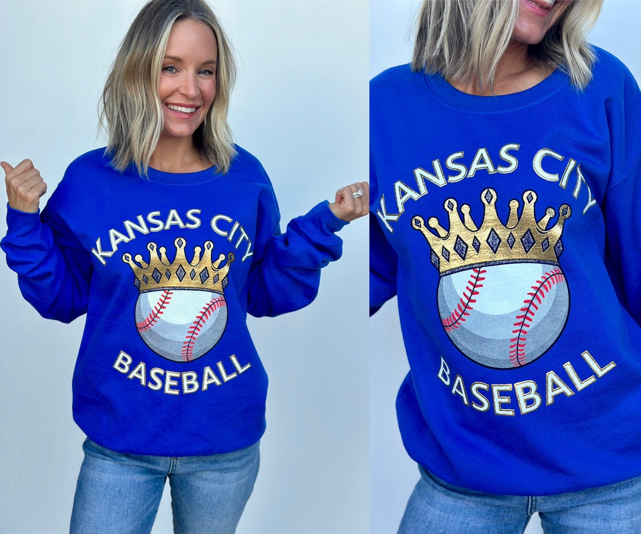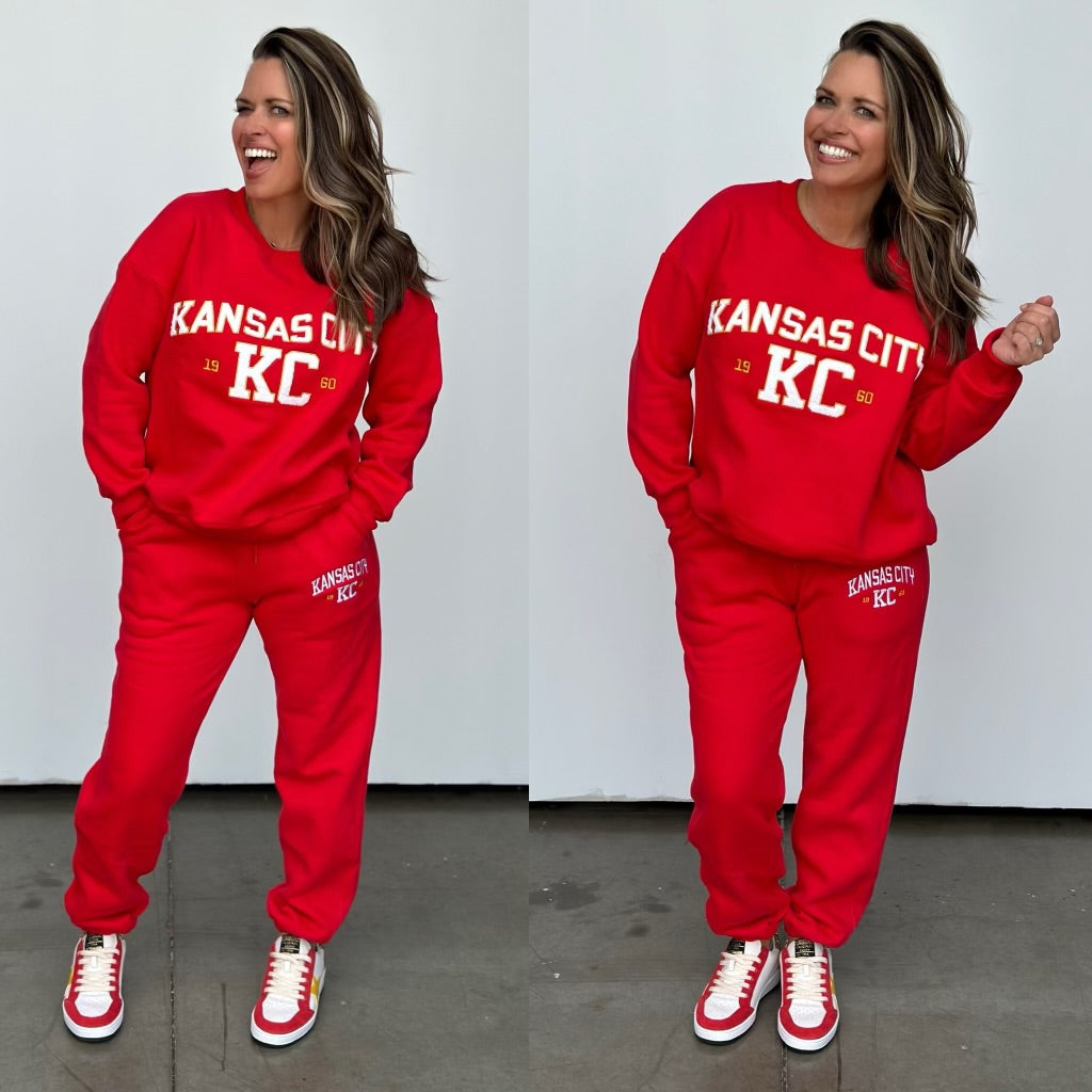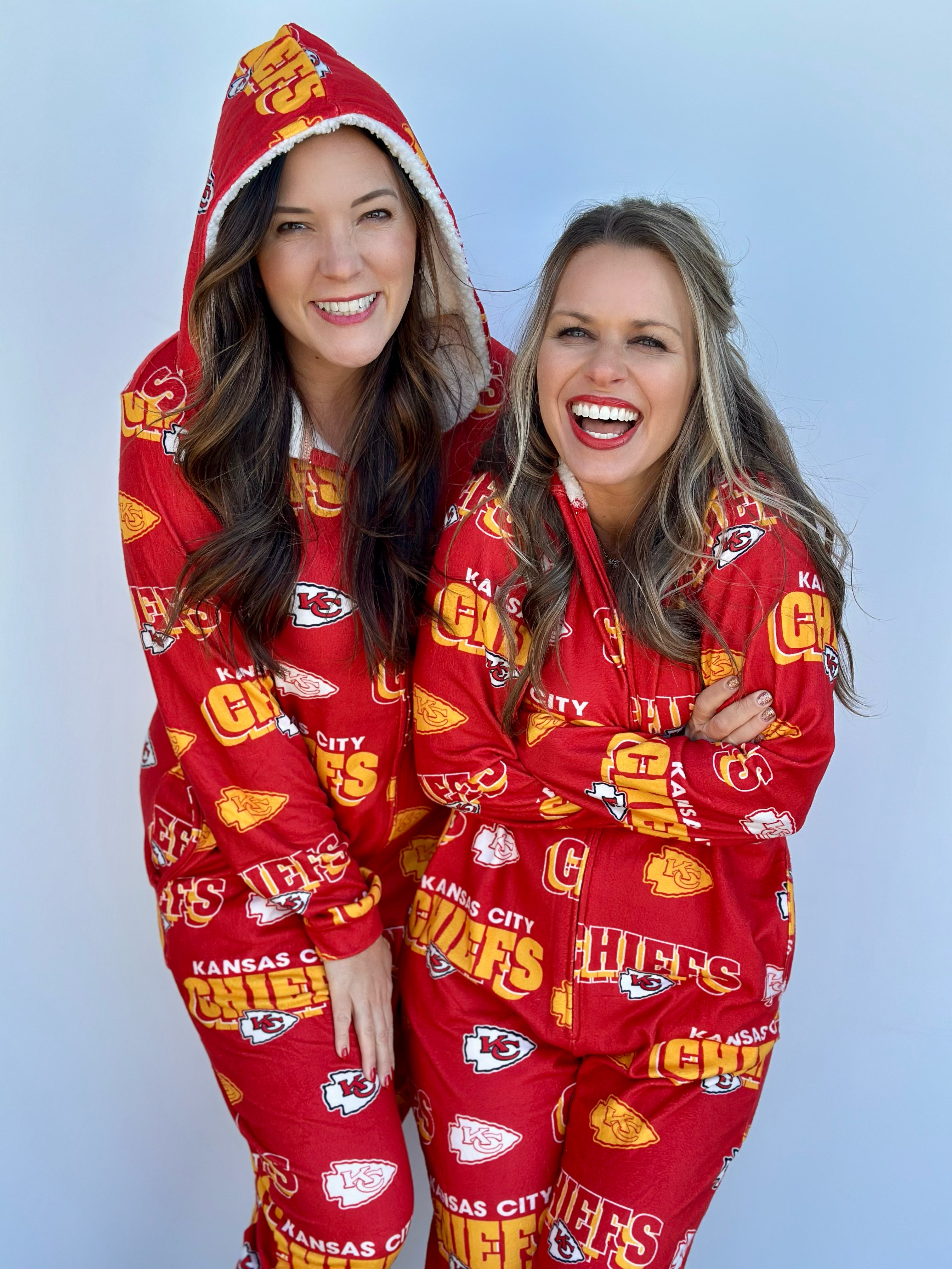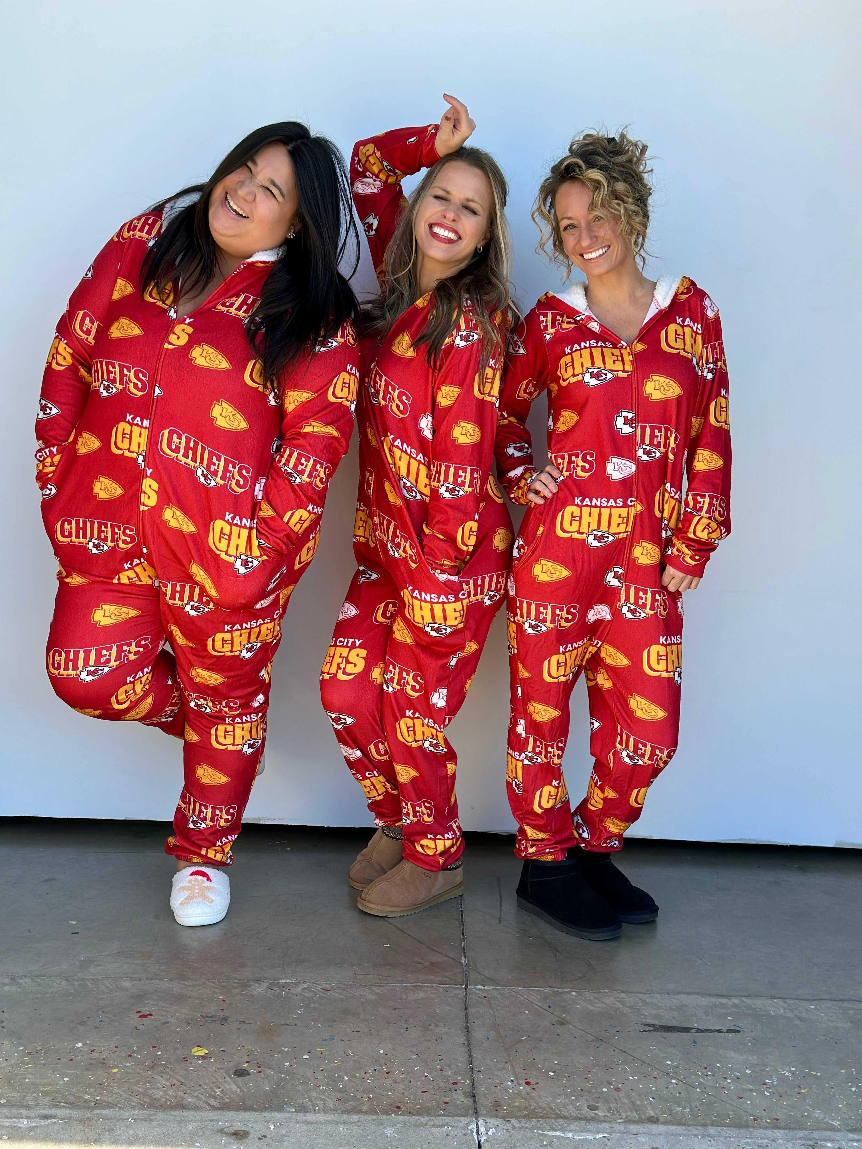 This oversized button-up cardi brings that vintage varsity vibe with a bold KC twist. Made in a vibrant game-day red with gold and white striping on the sleeves and hem, it features a detailed embroidered helmet patch on the front and “Kansas City” across the back for the ultimate fan finish.