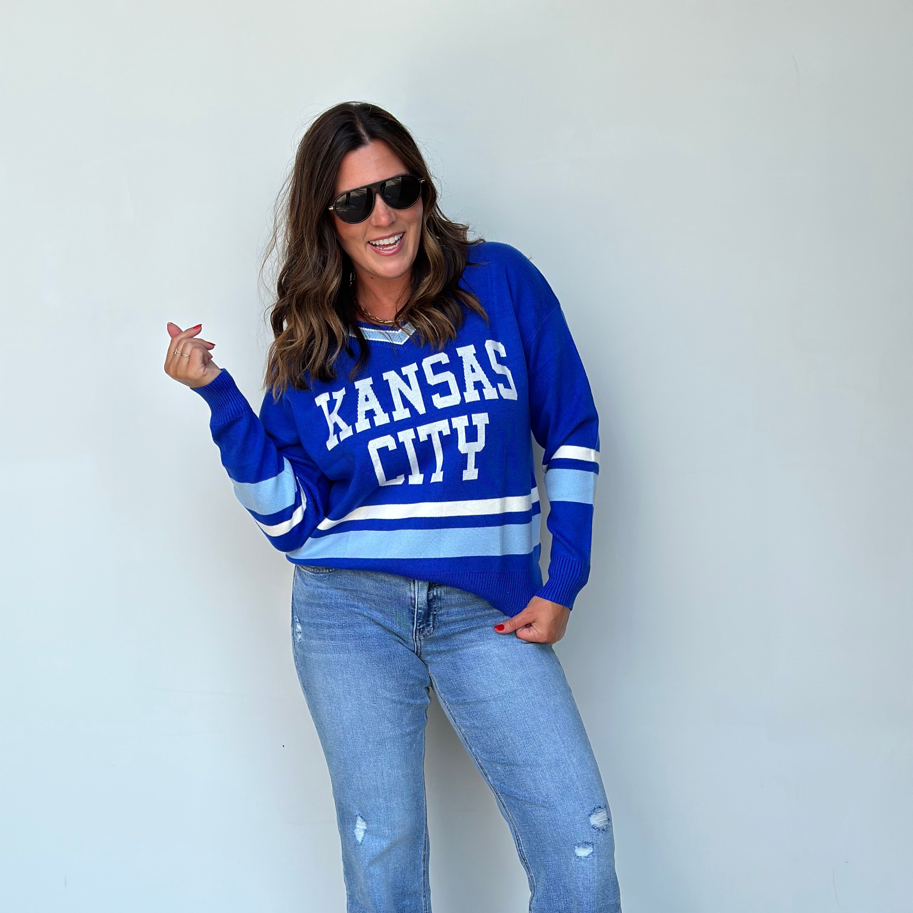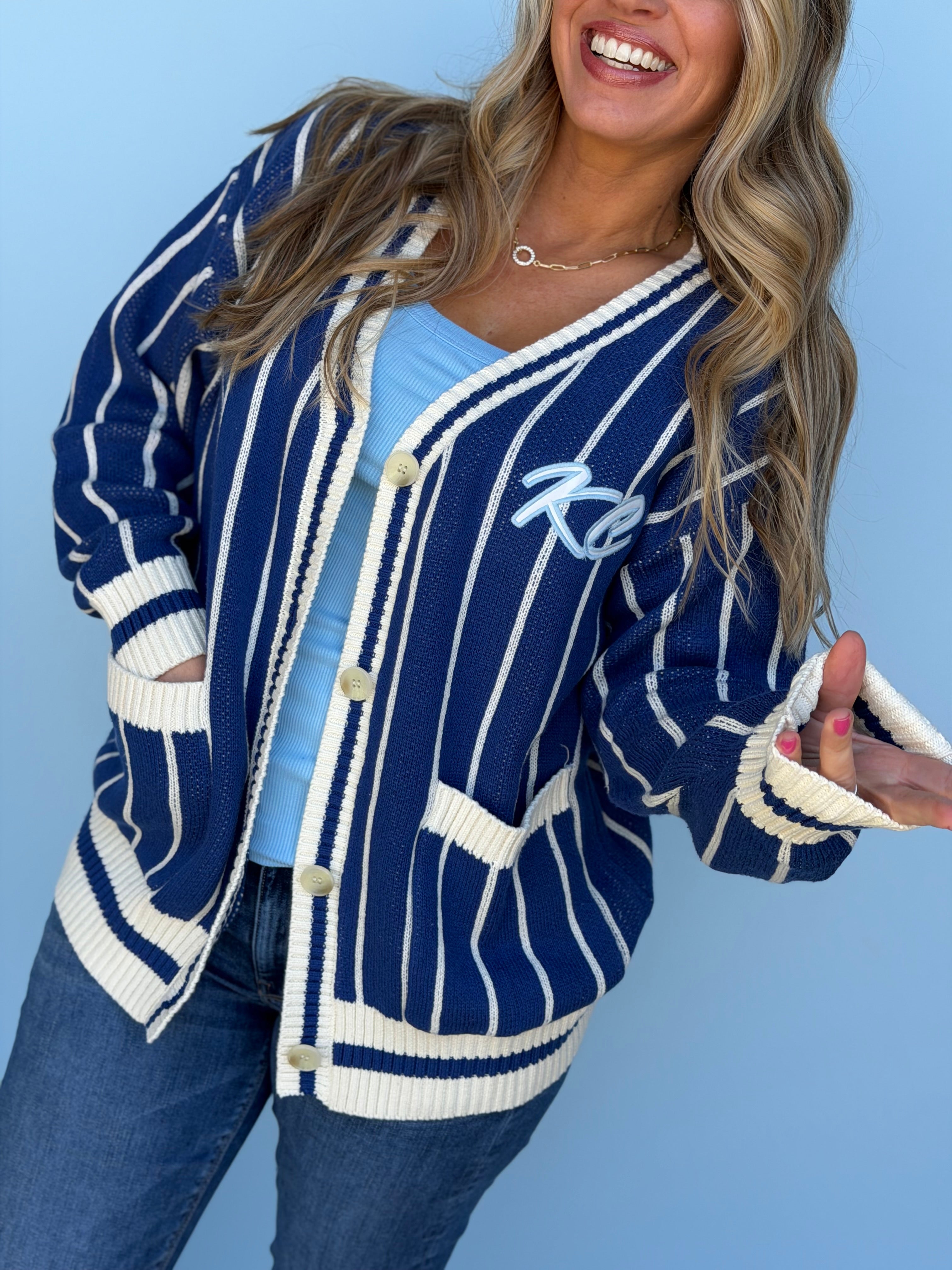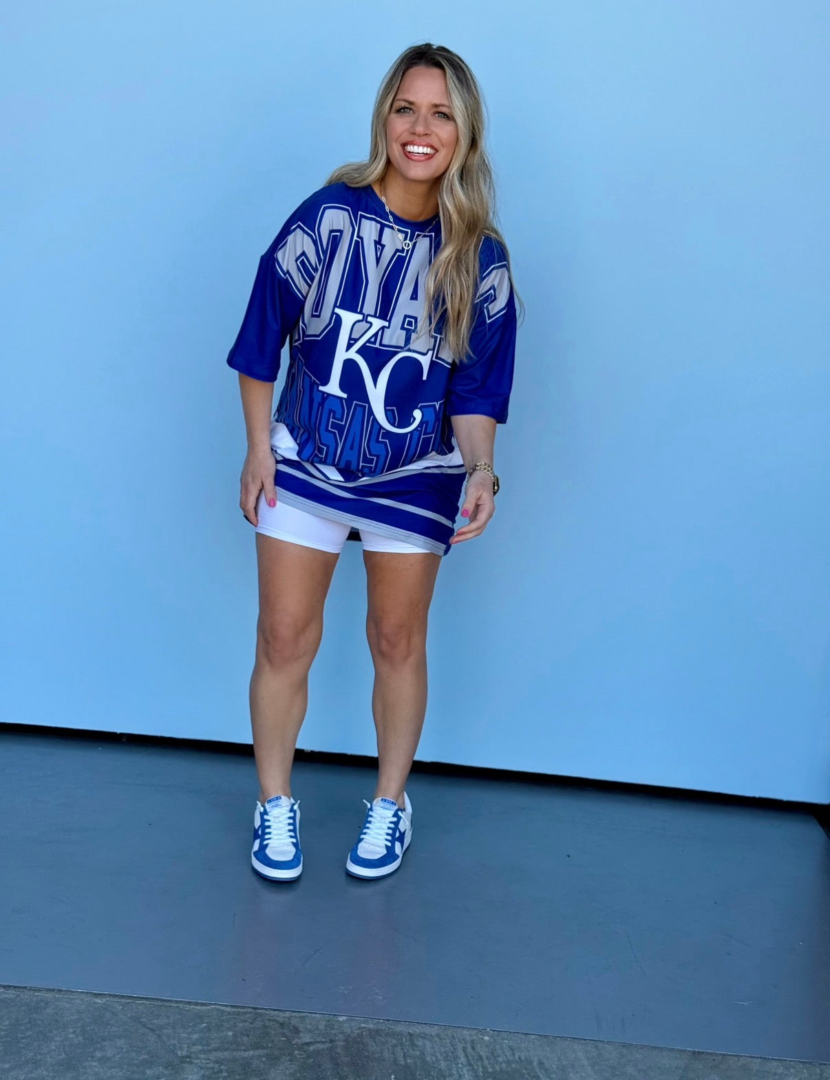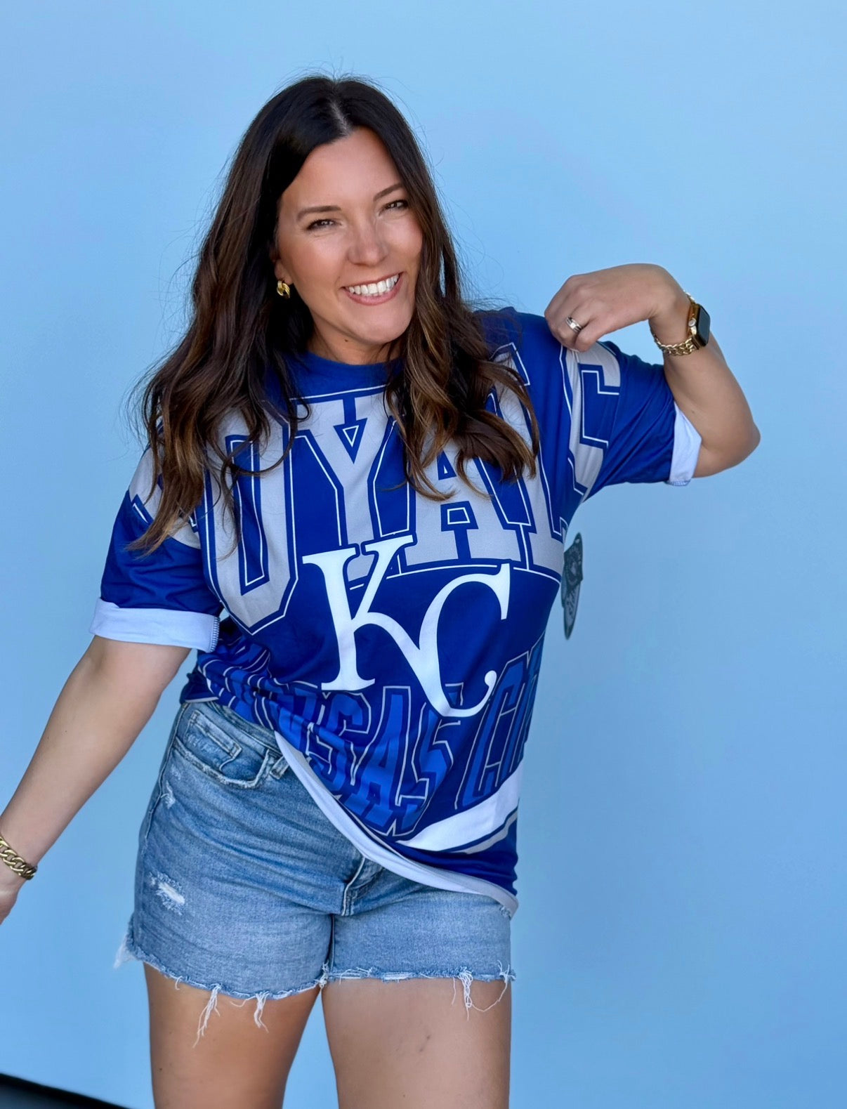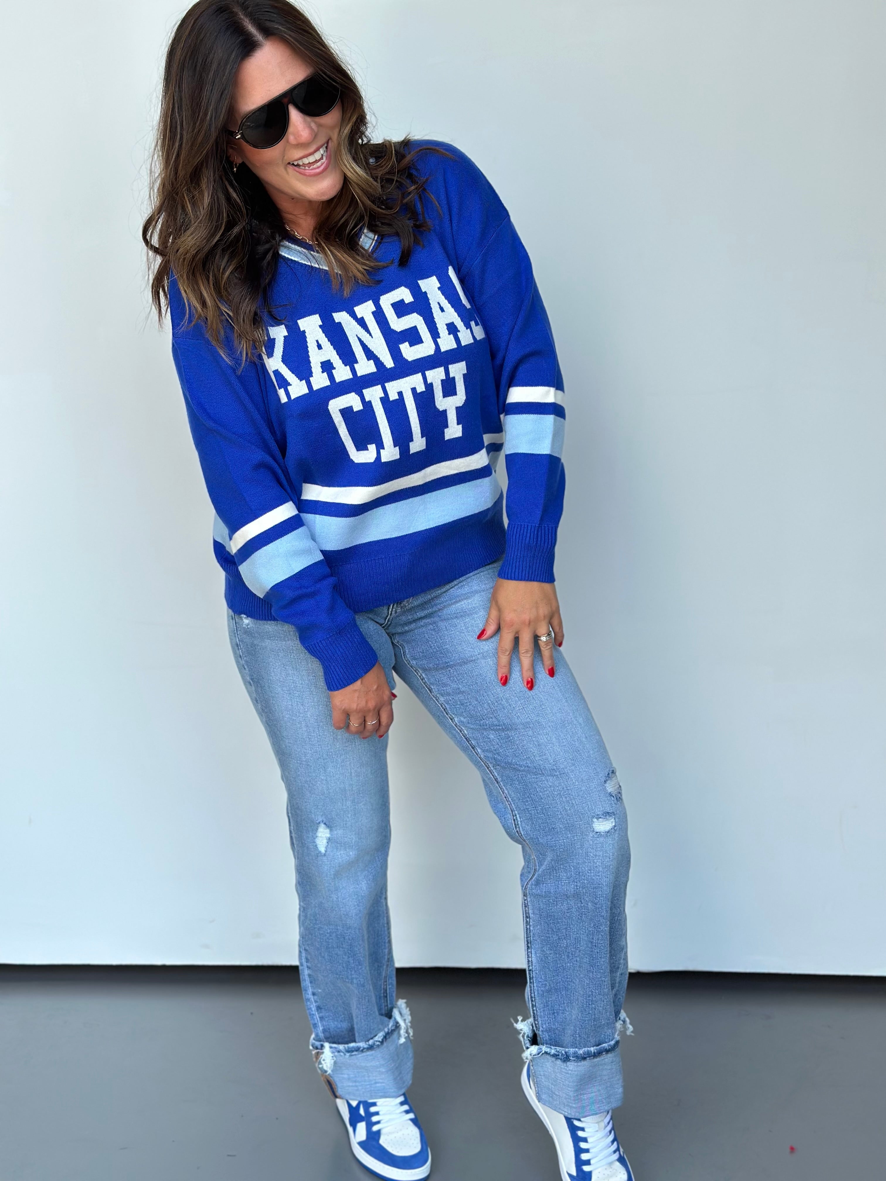 This oversized button-up cardi brings that vintage varsity vibe with a bold KC twist. Made in a vibrant game-day red with gold and white striping on the sleeves and hem, it features a detailed embroidered helmet patch on the front and “Kansas City” across the back for the ultimate fan finish.
