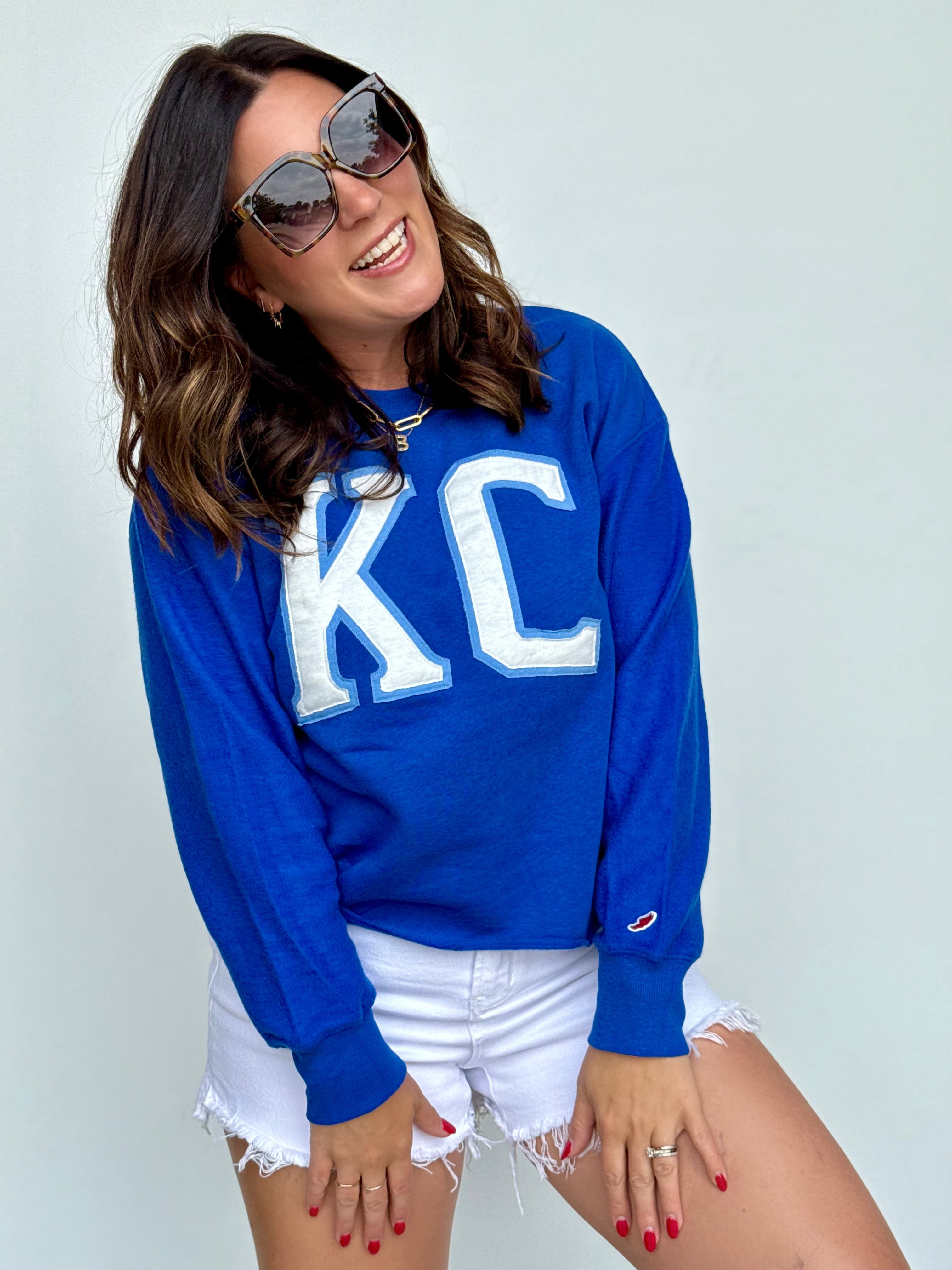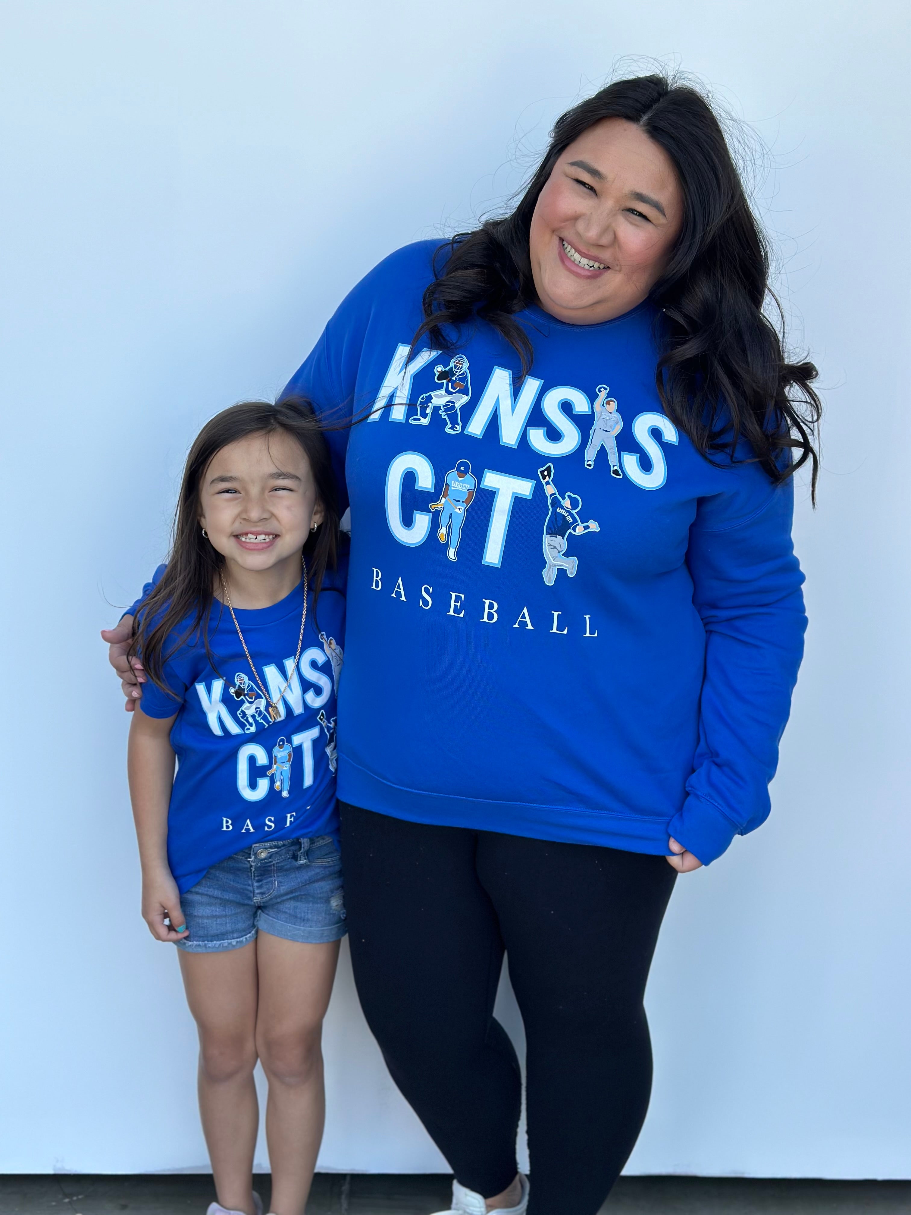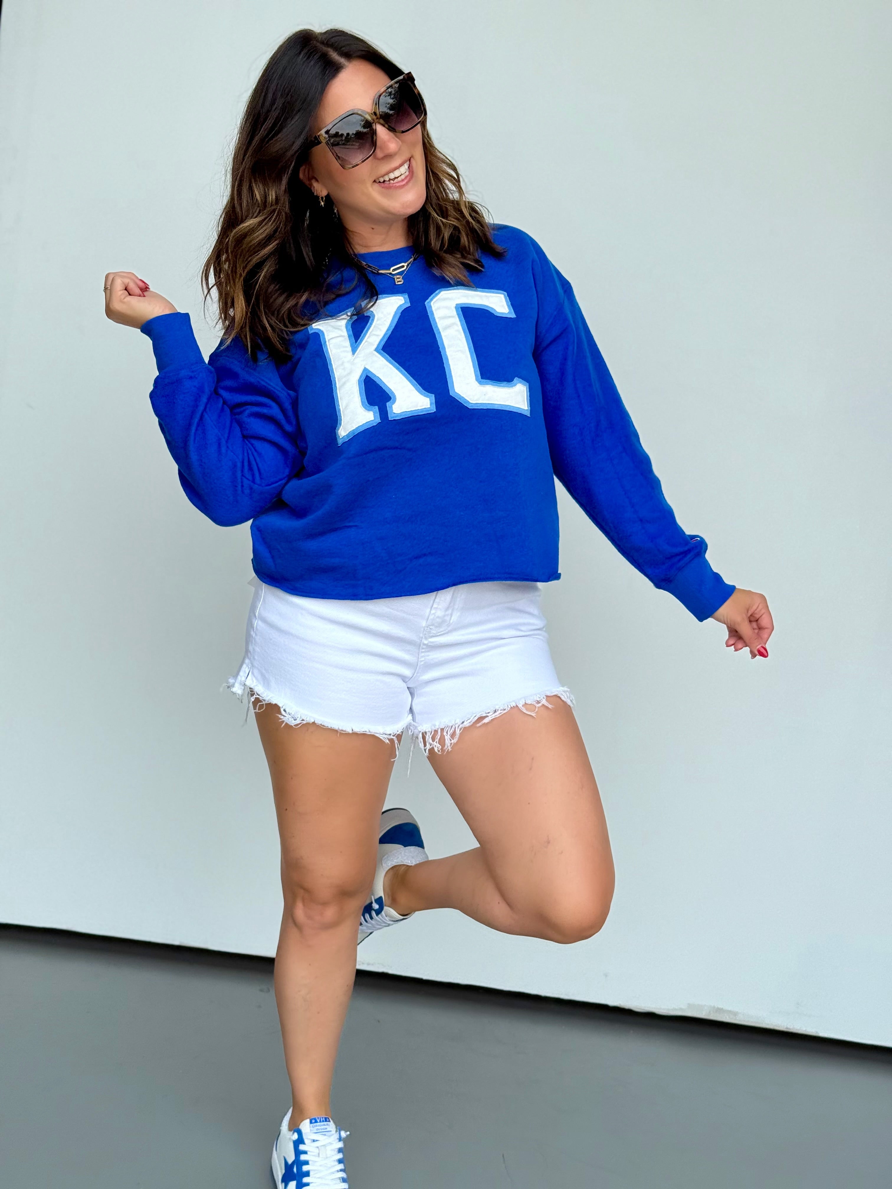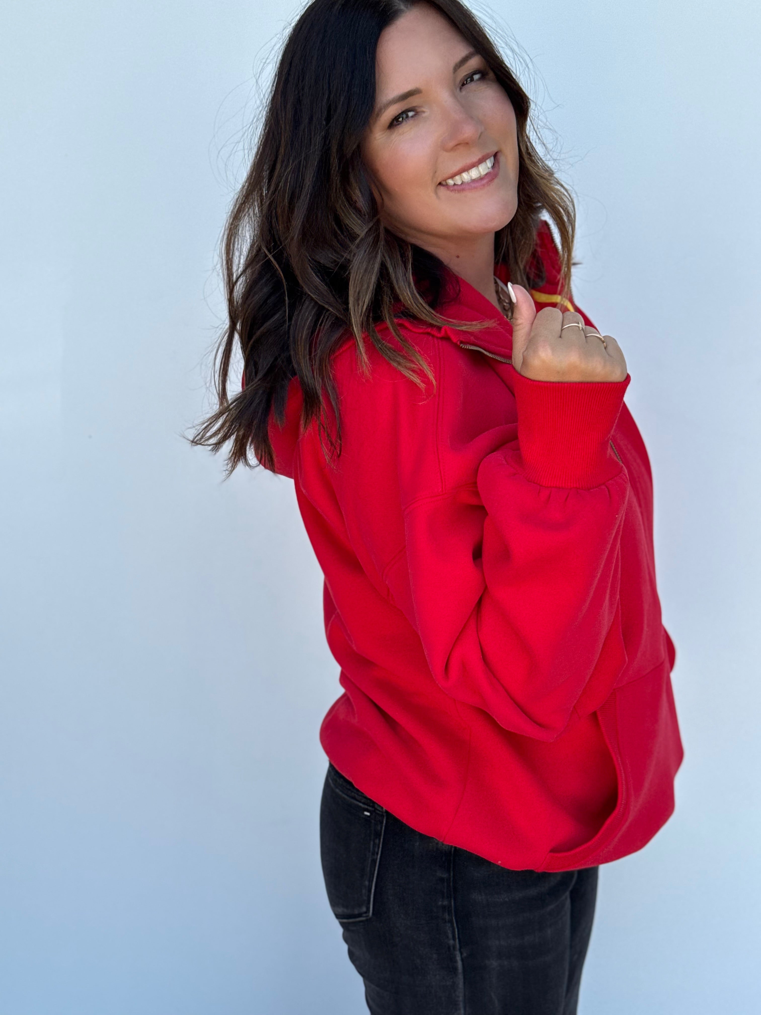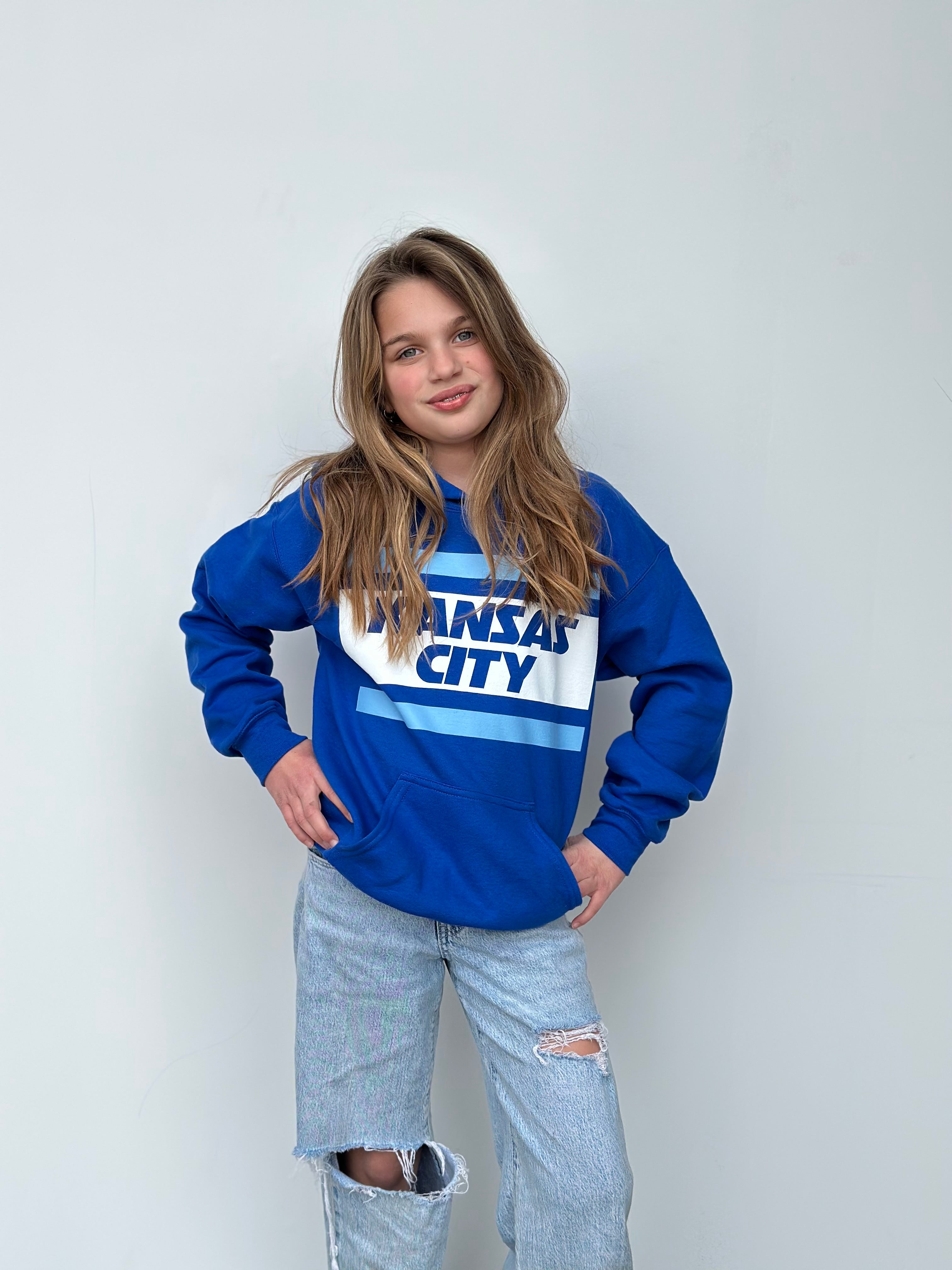 This oversized button-up cardi brings that vintage varsity vibe with a bold KC twist. Made in a vibrant game-day red with gold and white striping on the sleeves and hem, it features a detailed embroidered helmet patch on the front and “Kansas City” across the back for the ultimate fan finish.
