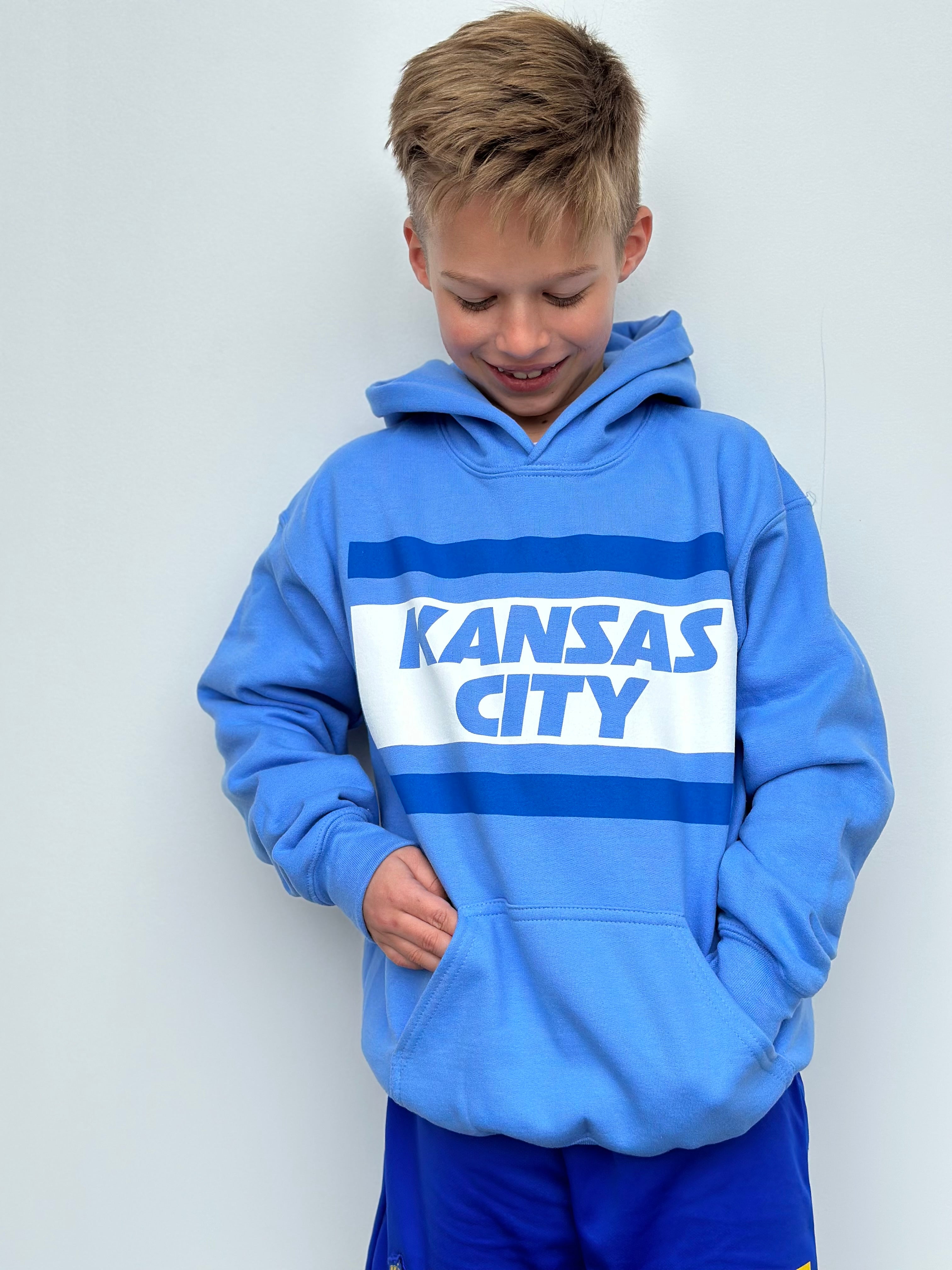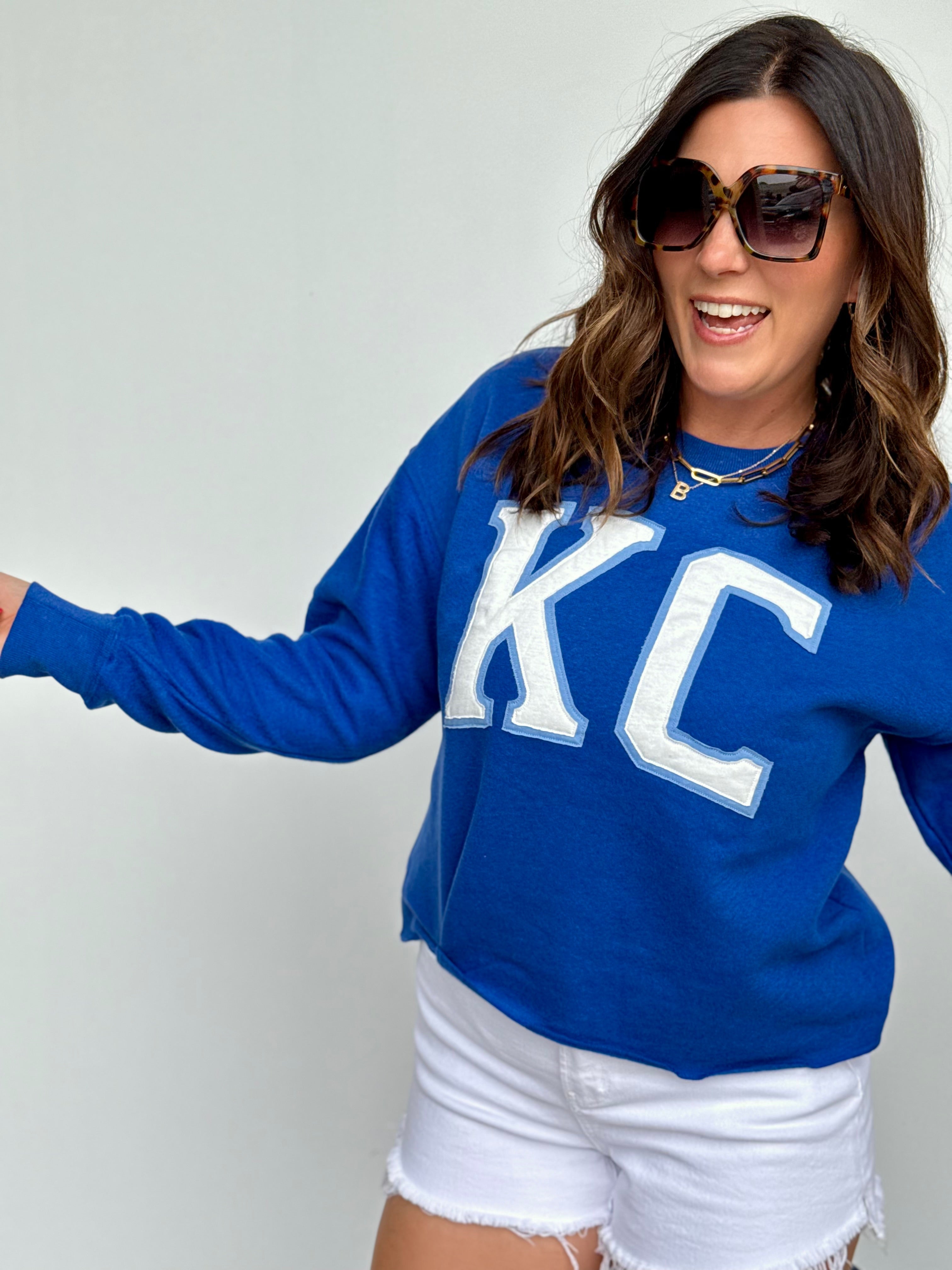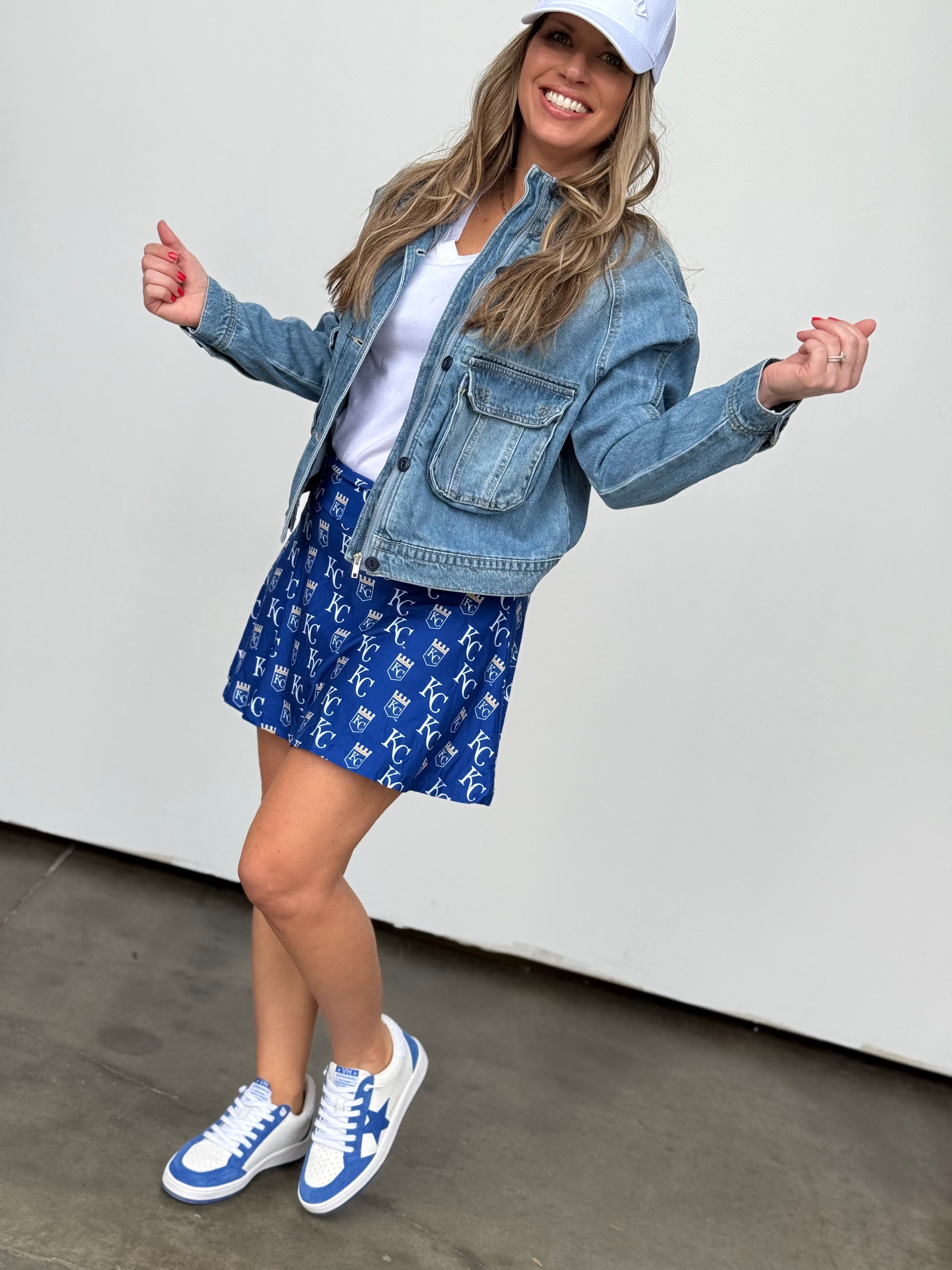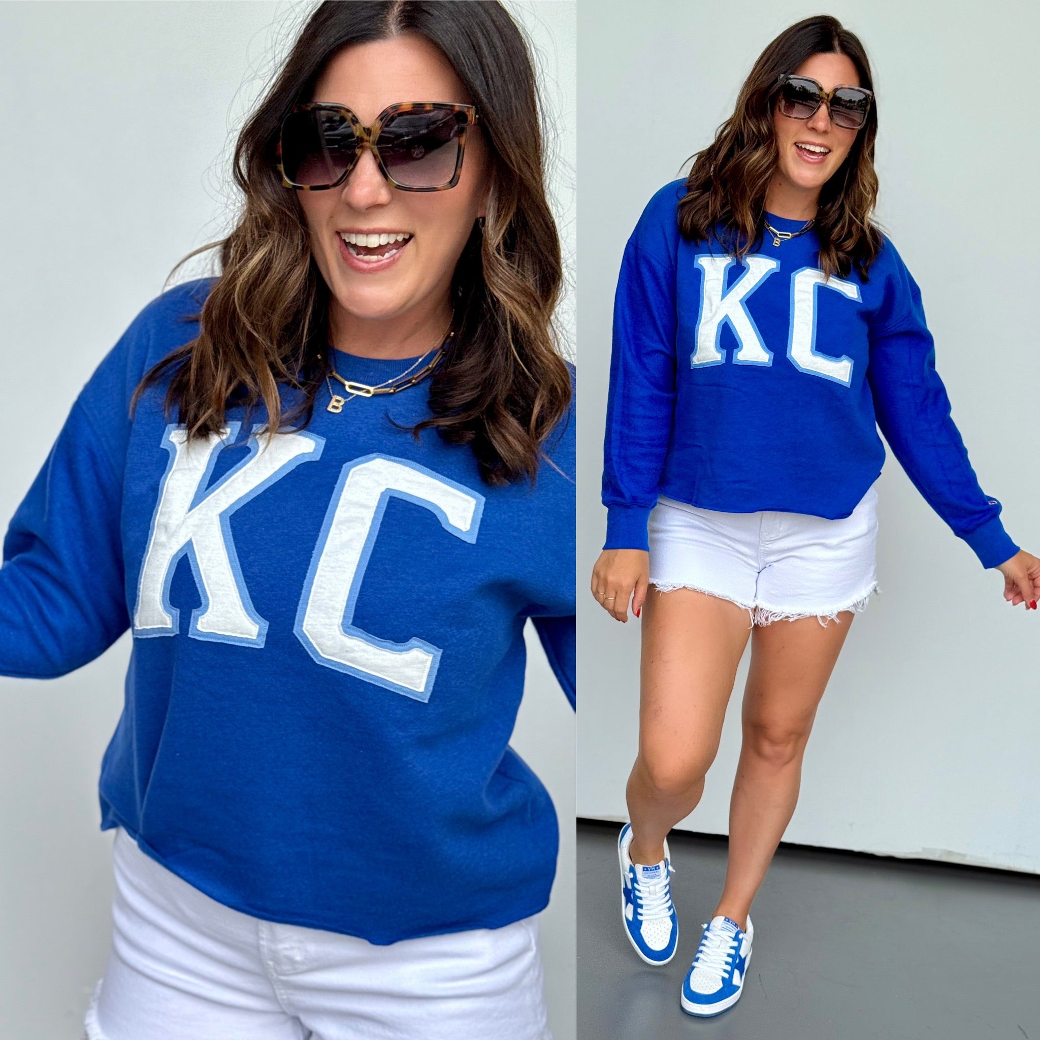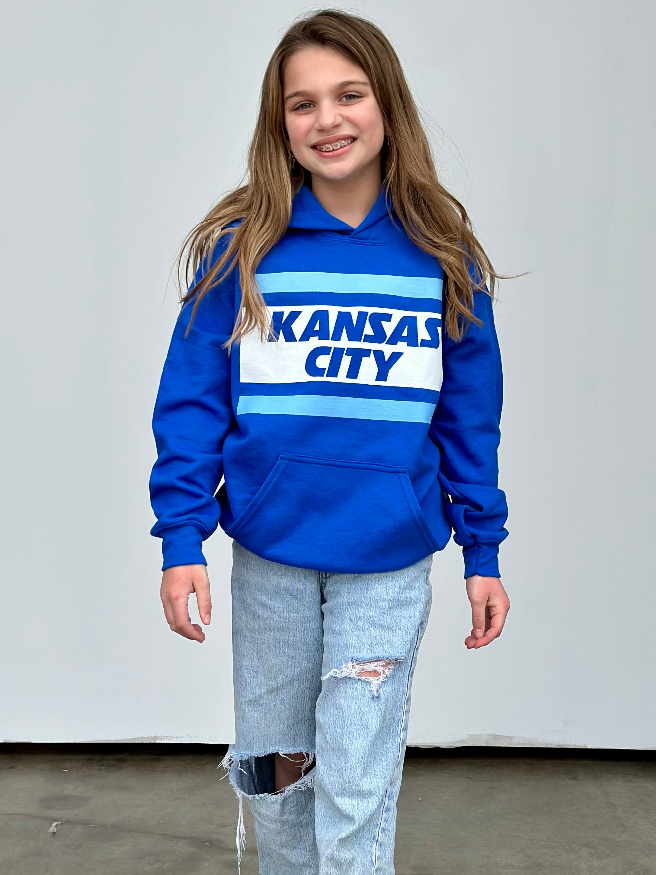 This oversized button-up cardi brings that vintage varsity vibe with a bold KC twist. Made in a vibrant game-day red with gold and white striping on the sleeves and hem, it features a detailed embroidered helmet patch on the front and “Kansas City” across the back for the ultimate fan finish.