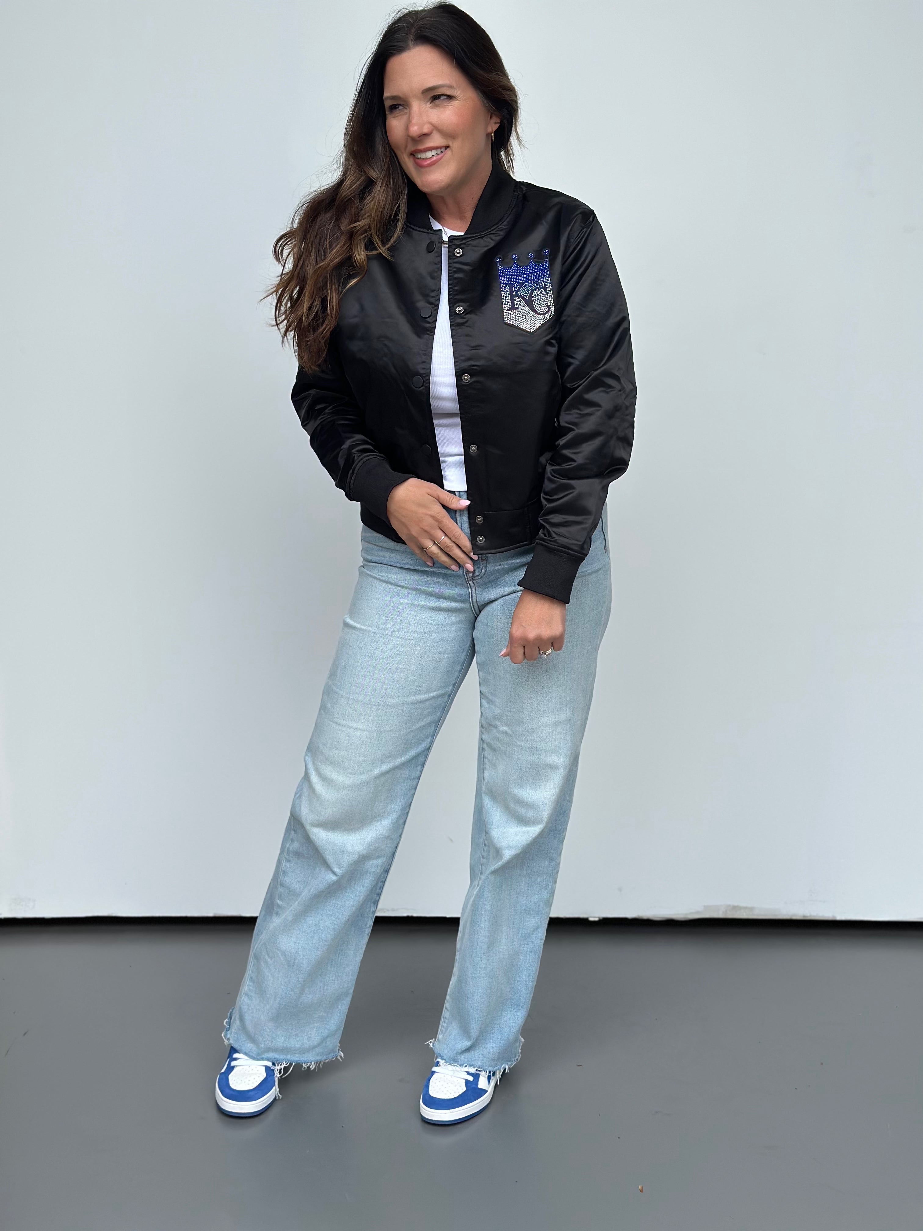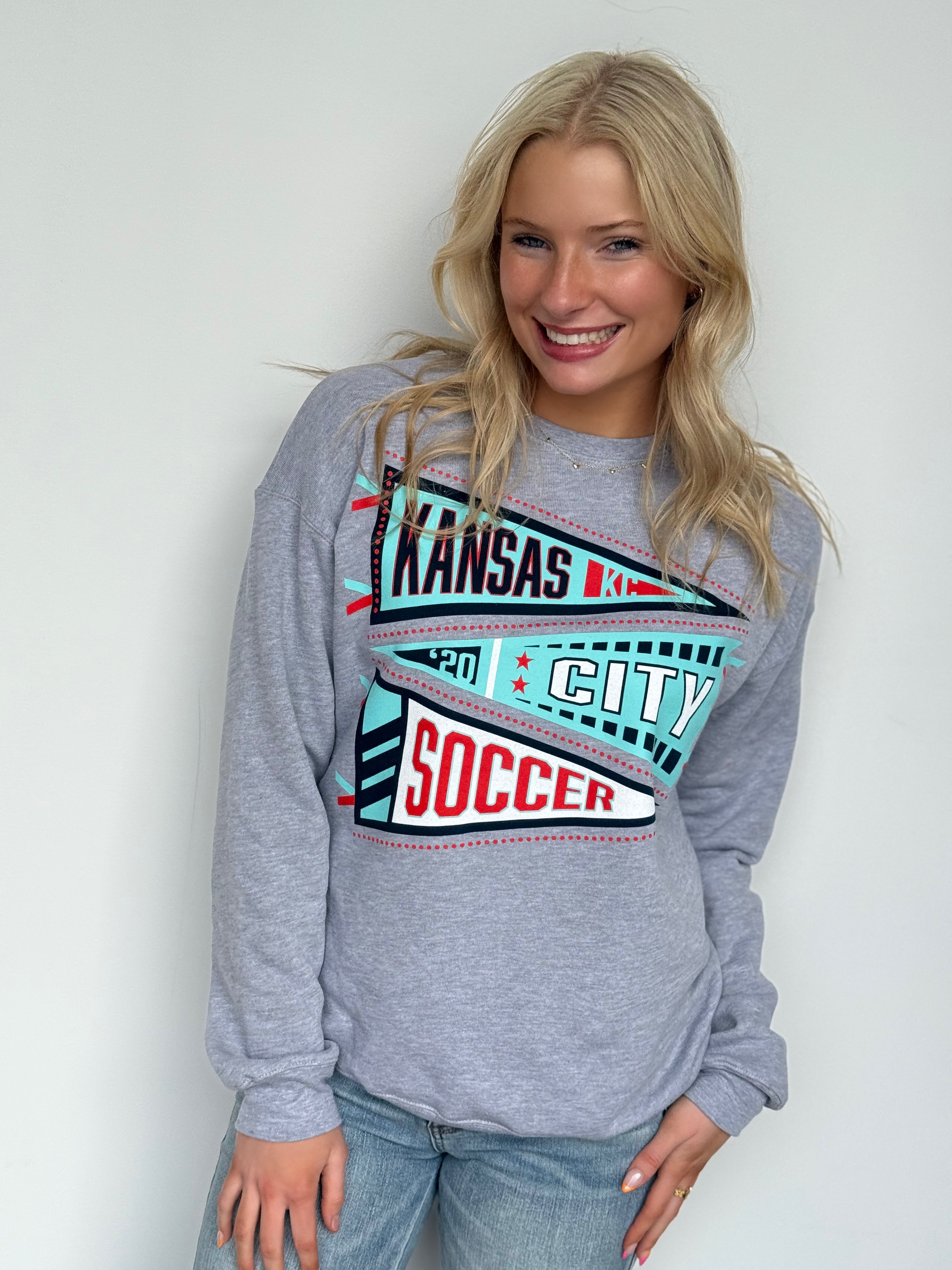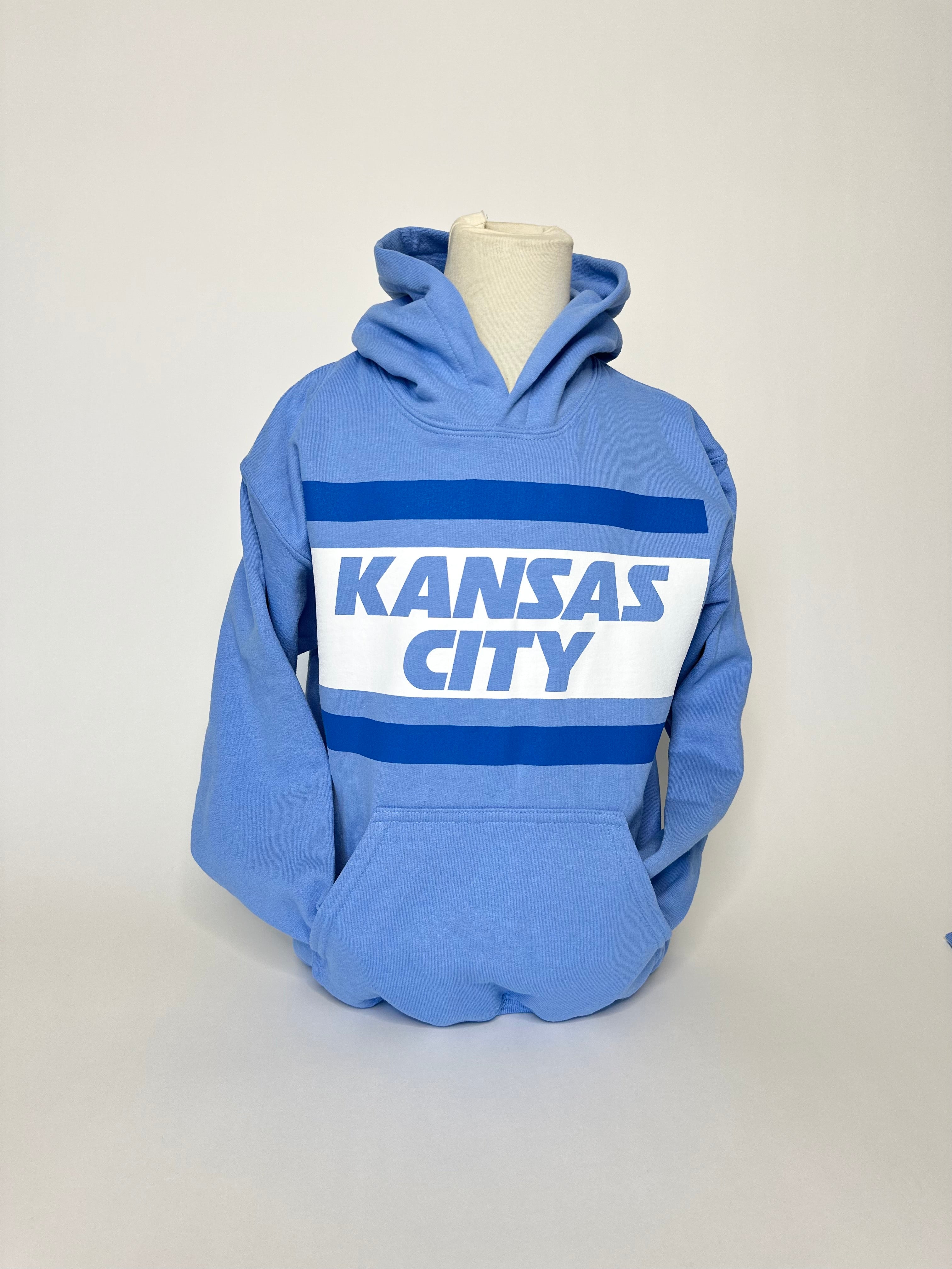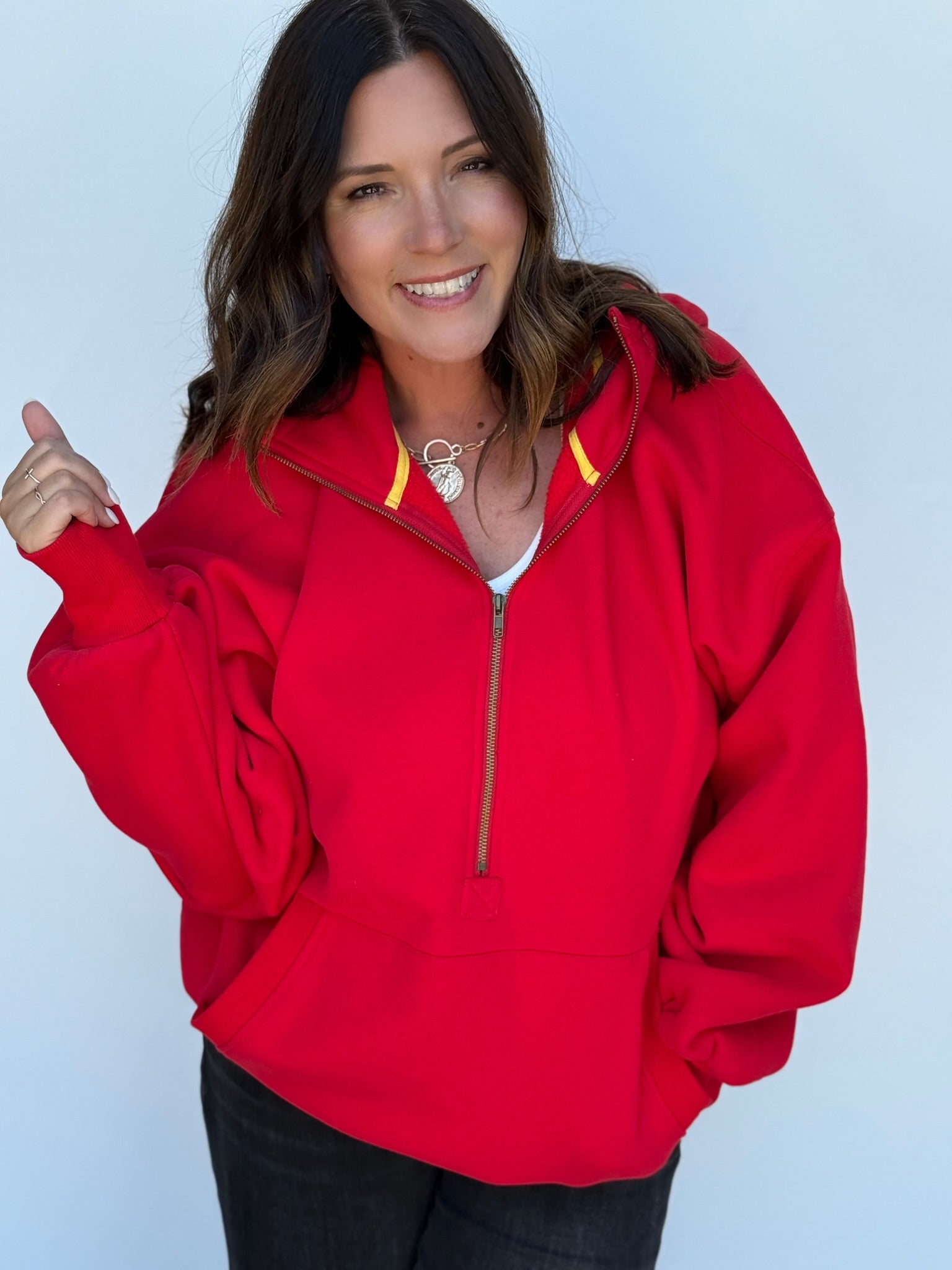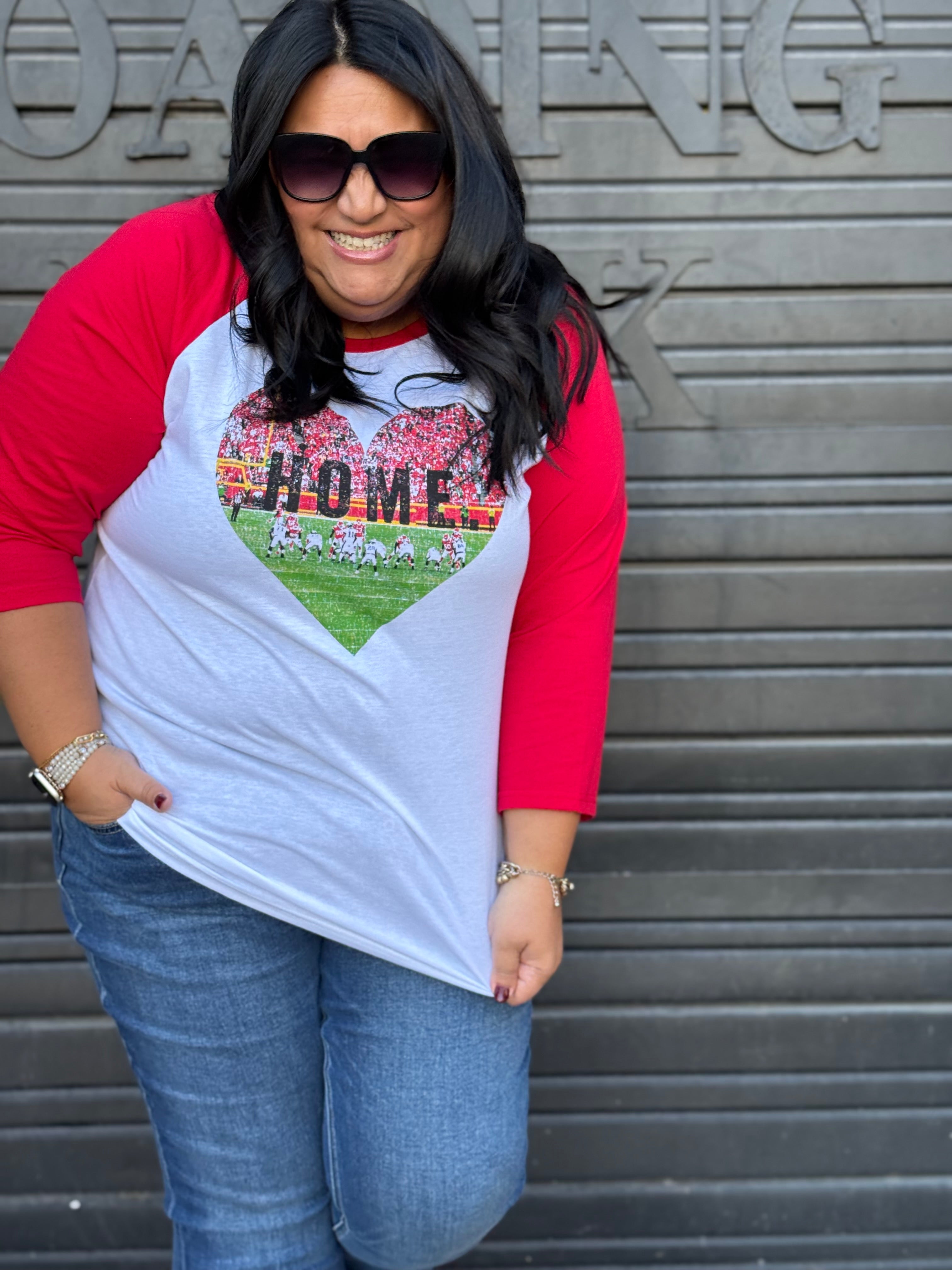 This oversized button-up cardi brings that vintage varsity vibe with a bold KC twist. Made in a vibrant game-day red with gold and white striping on the sleeves and hem, it features a detailed embroidered helmet patch on the front and “Kansas City” across the back for the ultimate fan finish.