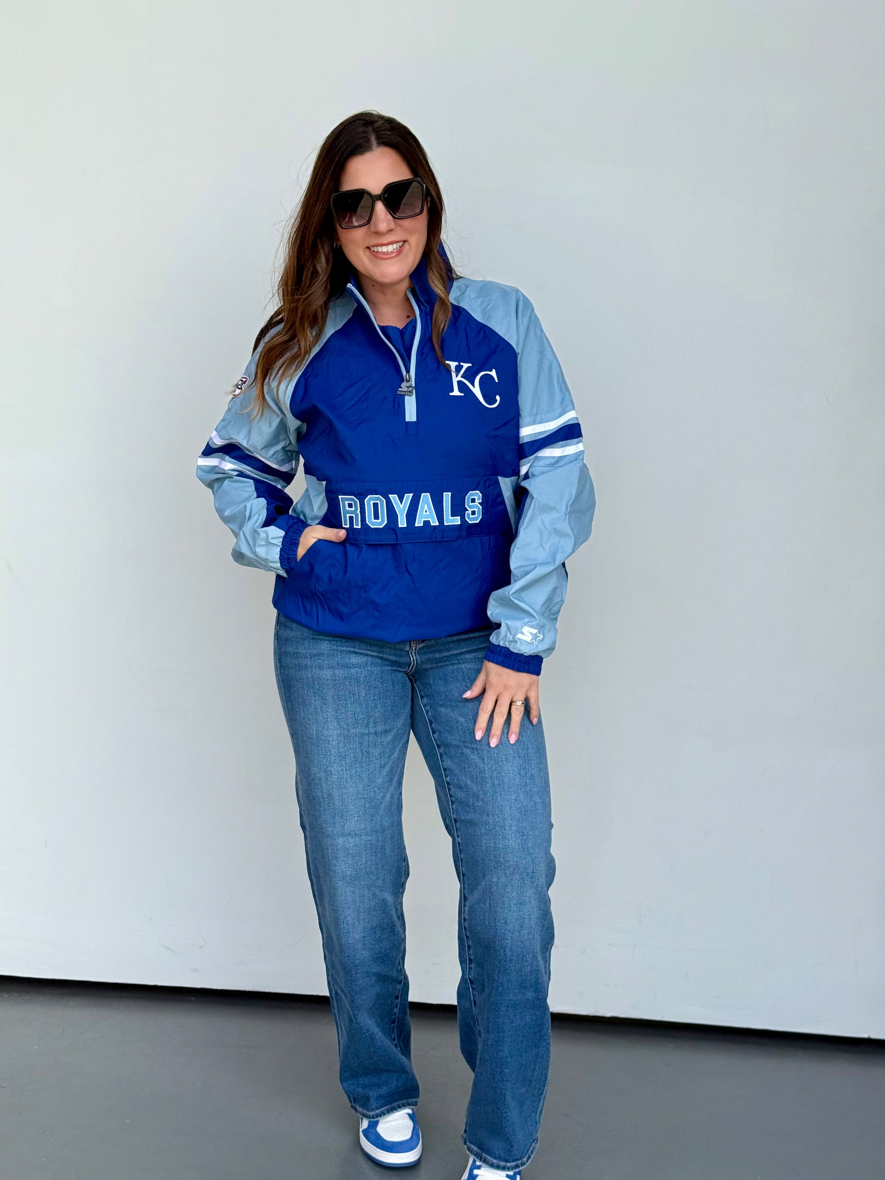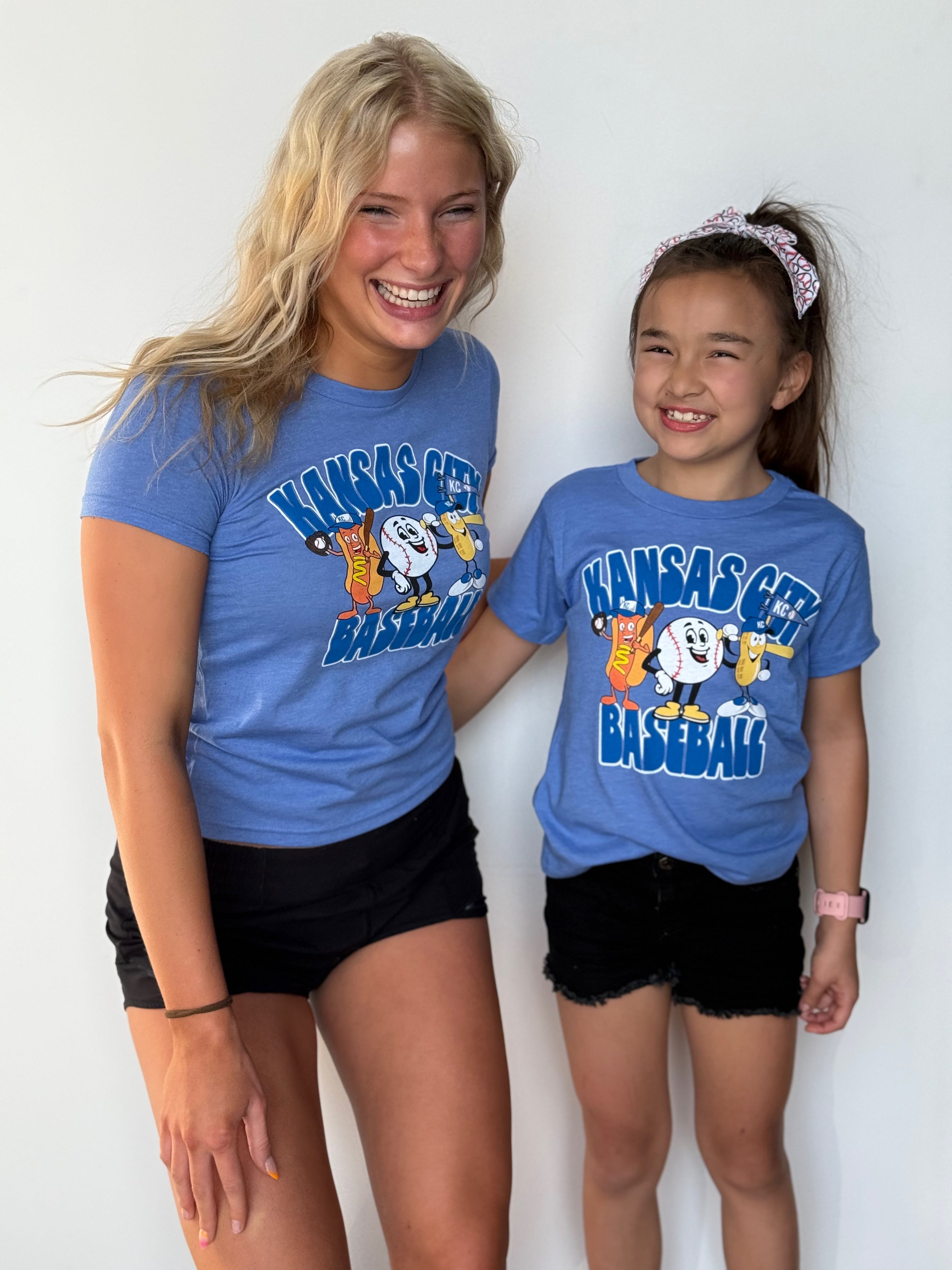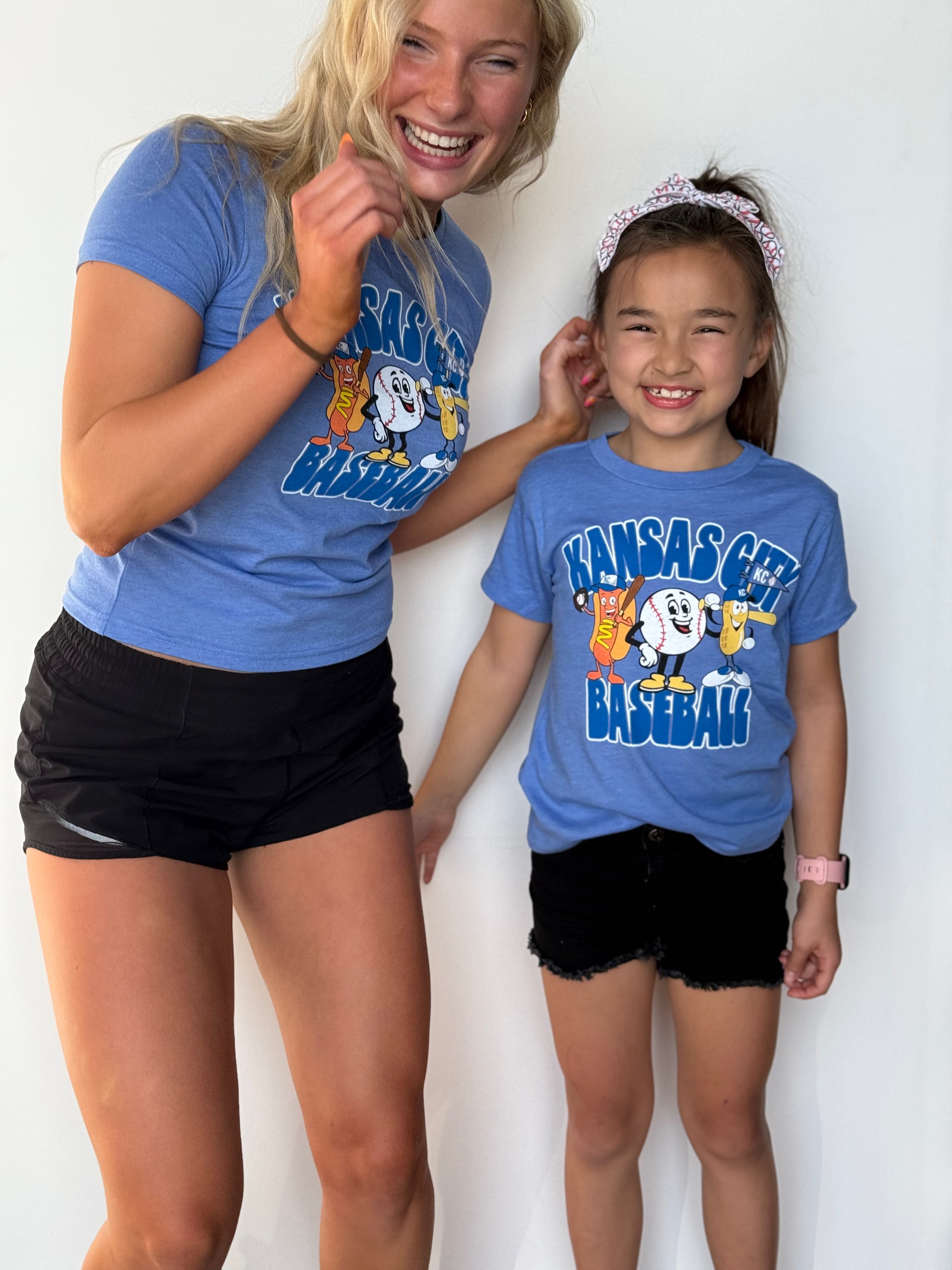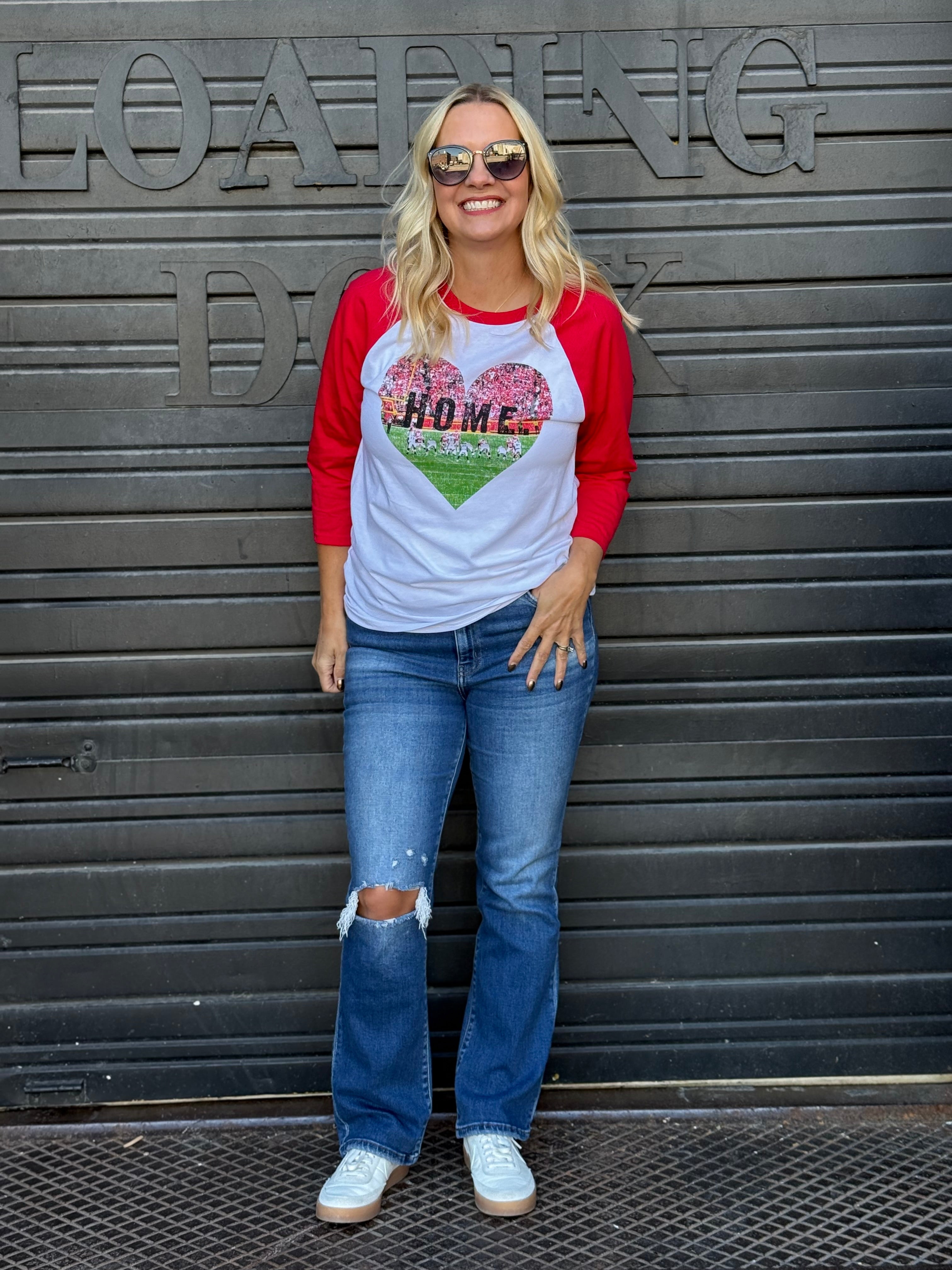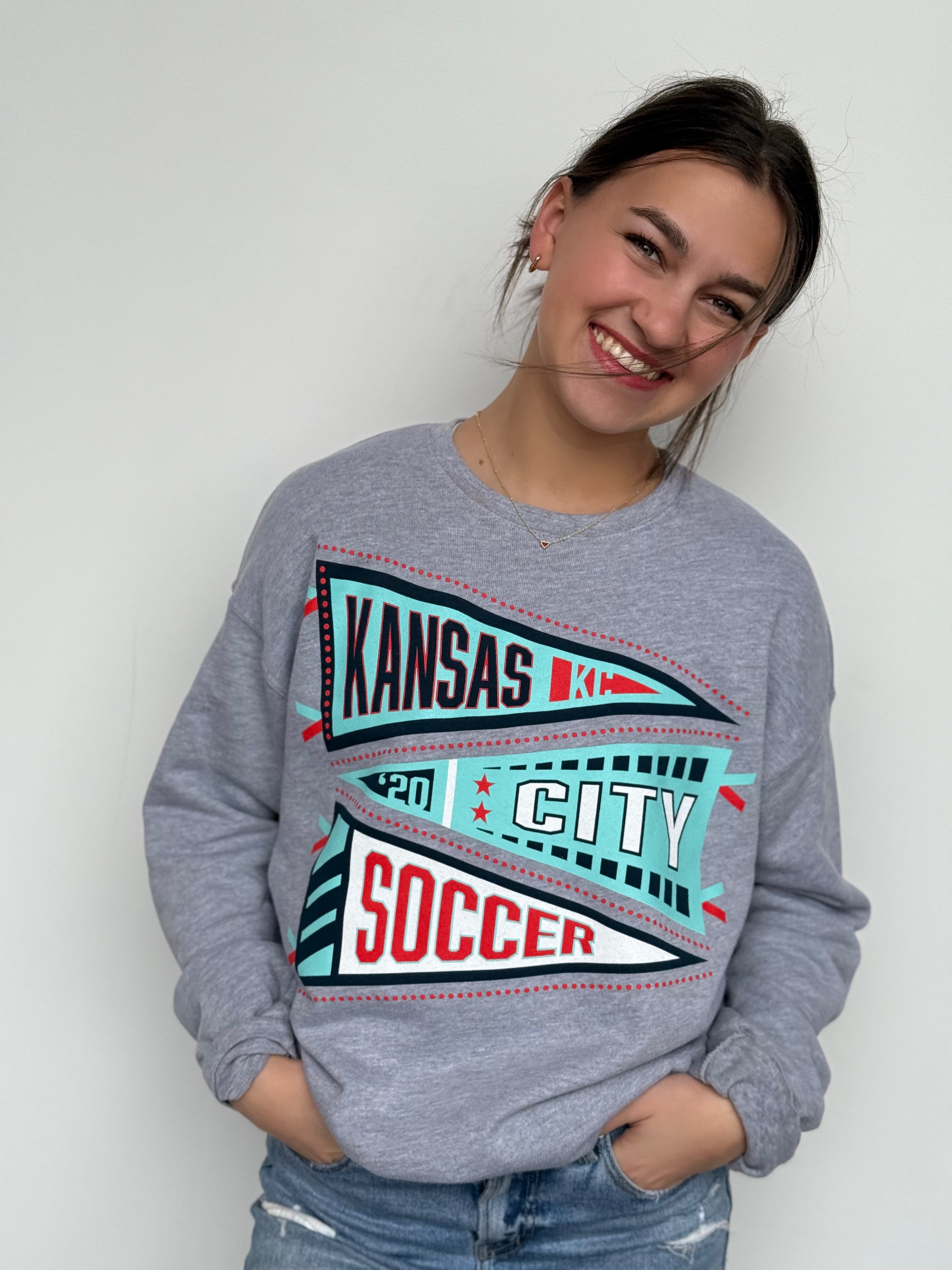 This oversized button-up cardi brings that vintage varsity vibe with a bold KC twist. Made in a vibrant game-day red with gold and white striping on the sleeves and hem, it features a detailed embroidered helmet patch on the front and “Kansas City” across the back for the ultimate fan finish.