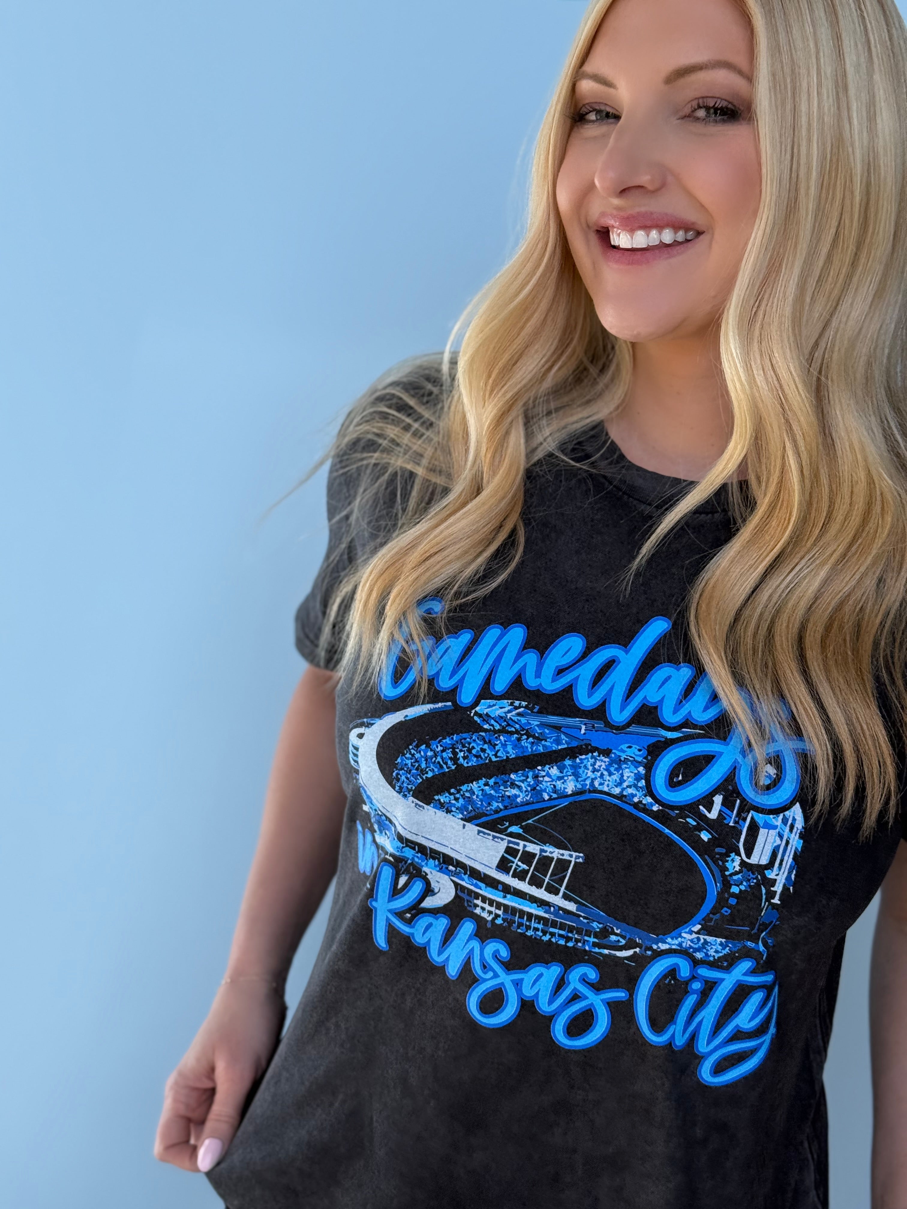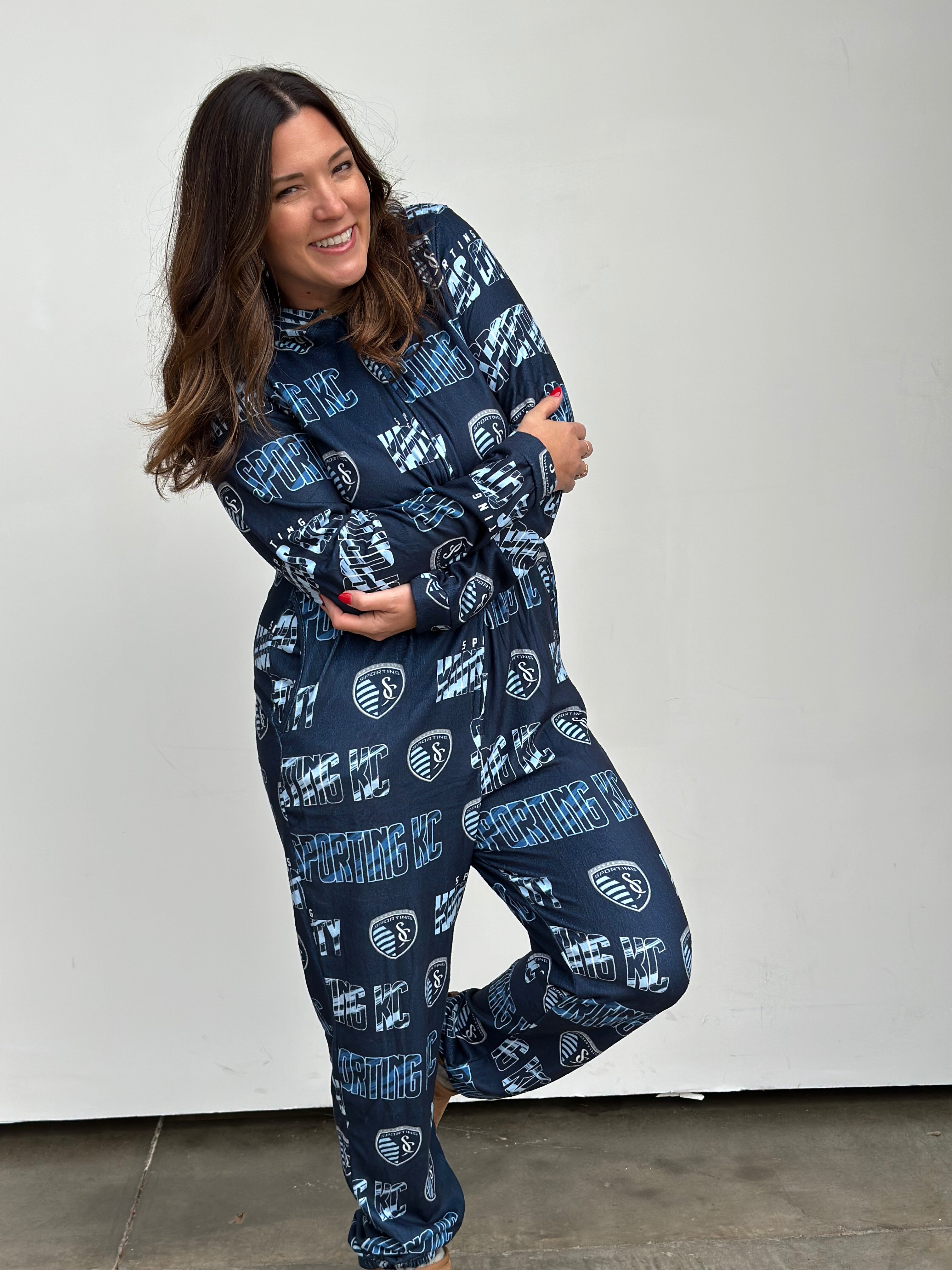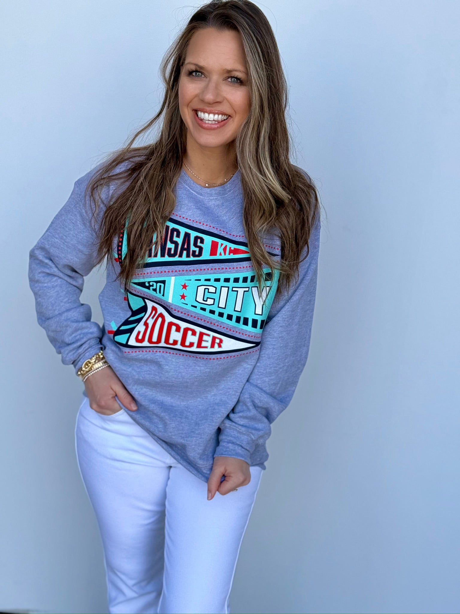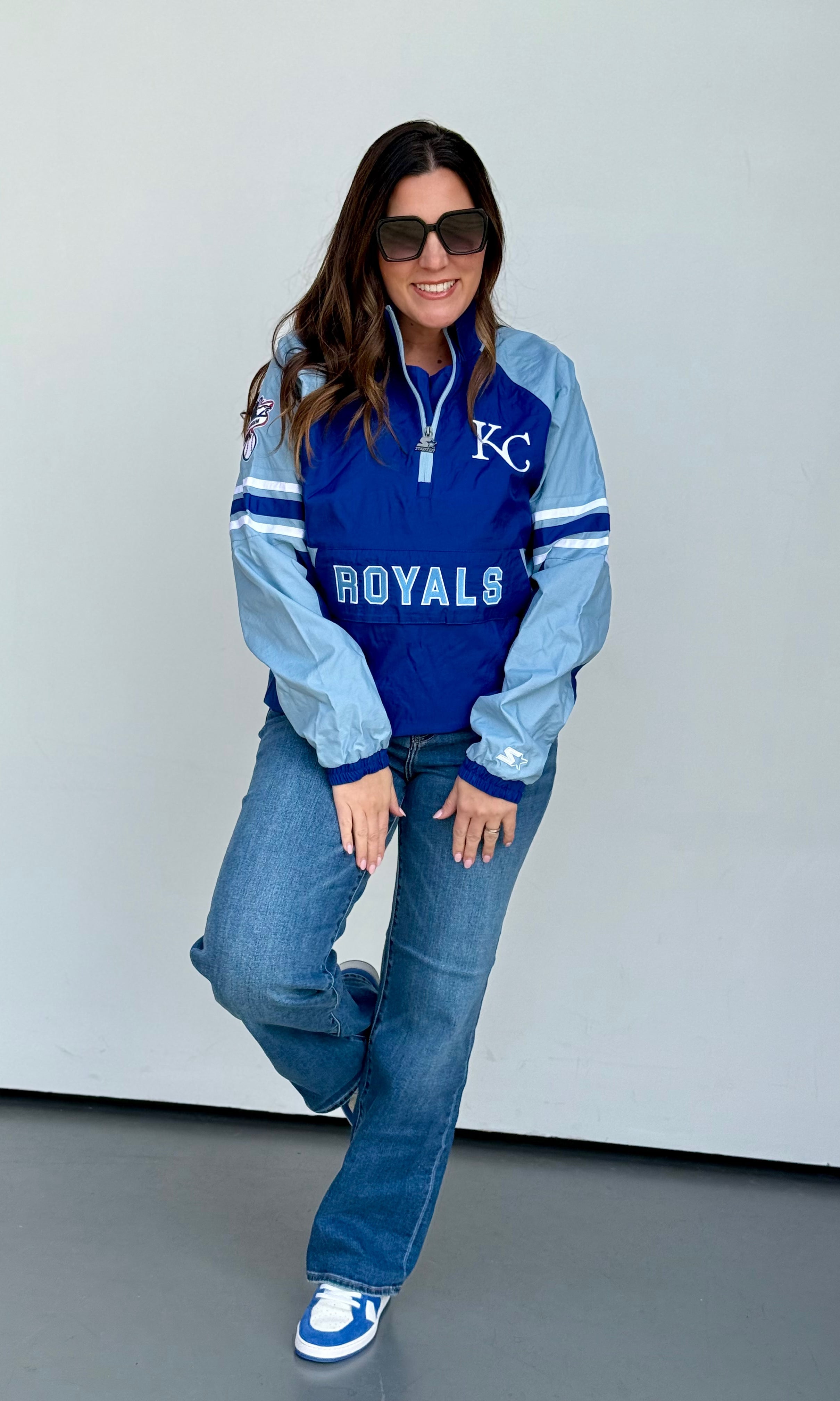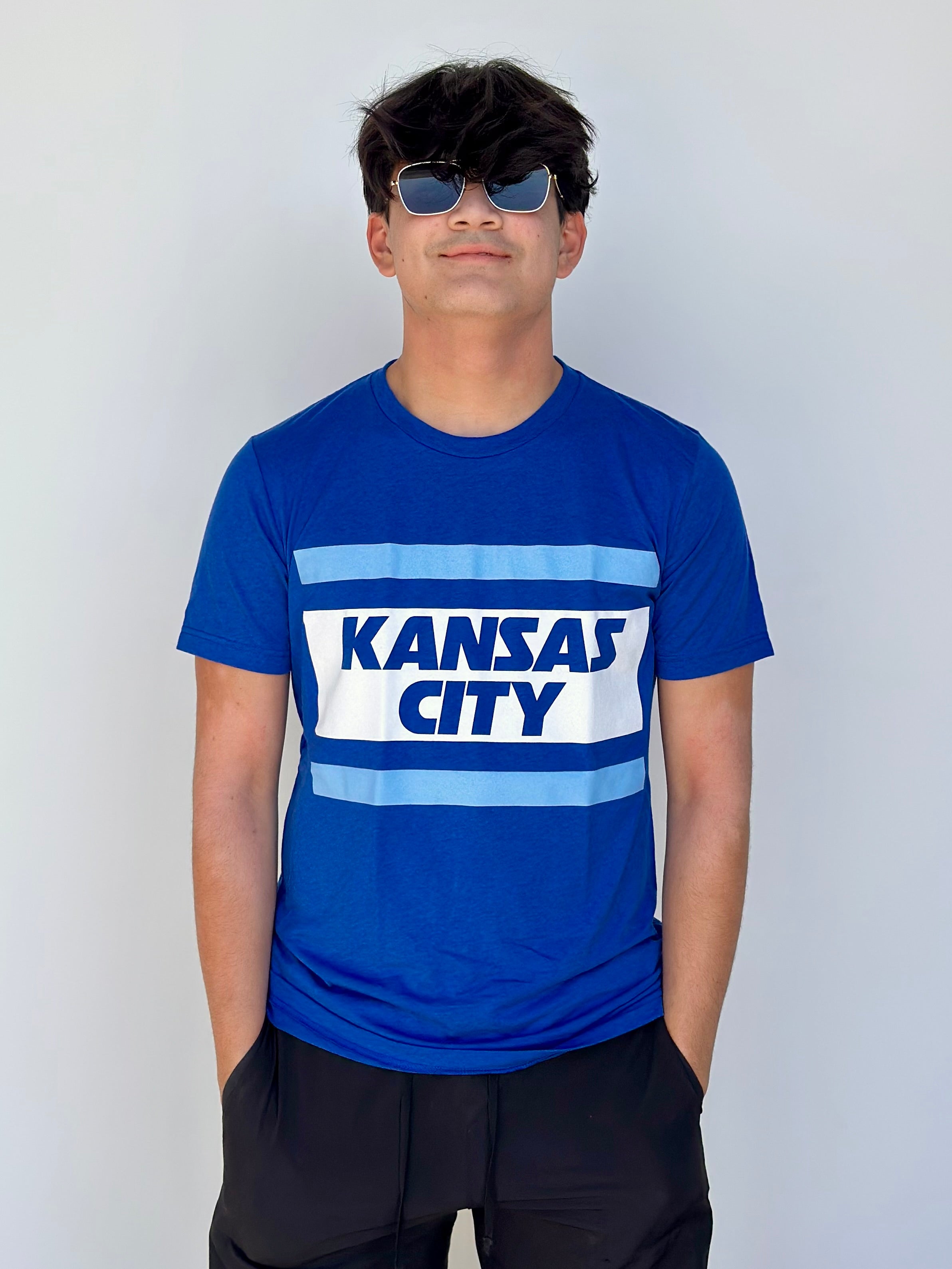 This oversized button-up cardi brings that vintage varsity vibe with a bold KC twist. Made in a vibrant game-day red with gold and white striping on the sleeves and hem, it features a detailed embroidered helmet patch on the front and “Kansas City” across the back for the ultimate fan finish.