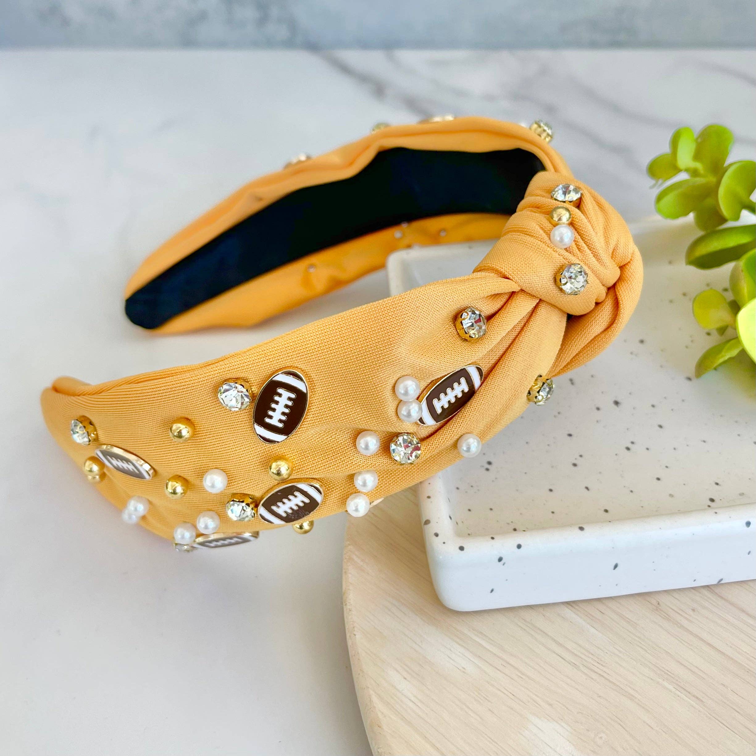 ✦ Elevate your hair style! ✦ Golden yellow fabric headband with beaded football accents and a knot detail ✦