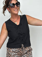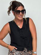 This versatile black sleeveless top features an elegant tie closure at the front and a flattering V-neckline. The loose silhouette offers comfortable wear while maintaining a true-to-size fit. Perfect for transitioning between casual and formal settings, this adaptable piece effortlessly complements various styling options in your wardrobe.