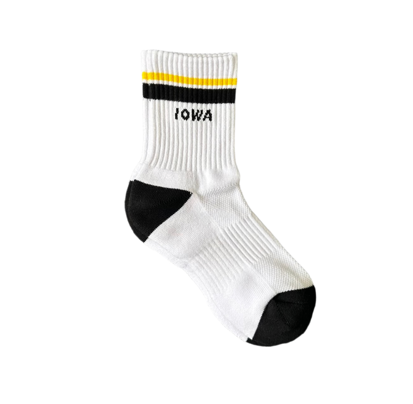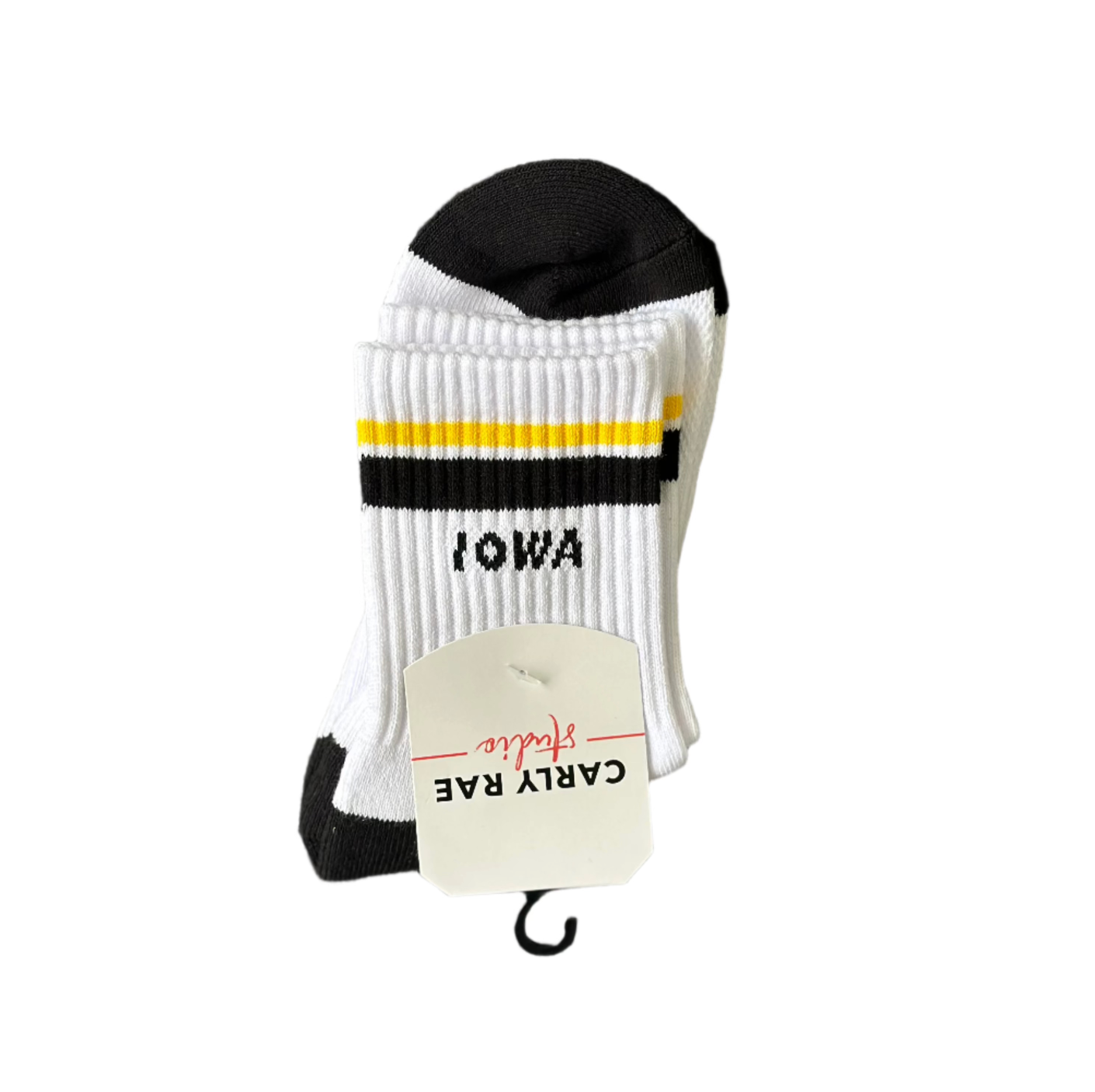 Embrace the vibrant spirit of Iowa City with Black & Yellow Crew Socks from Carly Rae Studio. Inspired by the city's lively hues, these socks are a delightful blend of comfort and style. Crafted from a soft cotton blend, they ensure your feet stay cozy throughout the day. Designed to fit women's sizes 6-9 and men's sizes 4.5-8, they make a versatile addition to any wardrobe. The playful colors and whimsical design reflect Carly's love for patterns, nature, and sports. Enjoy a touch of artistic charm with every step you take!
