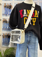Whether you're cheering on your favorite team or dancing at a music festival, this White & Clear Stadium Bag has got you covered. The faux white leather gives it a classy touch, while the stadium clear material keeps your belongings safe and compliant. Don't forget to flaunt the fringe tassel and gold zipper for some added flair!