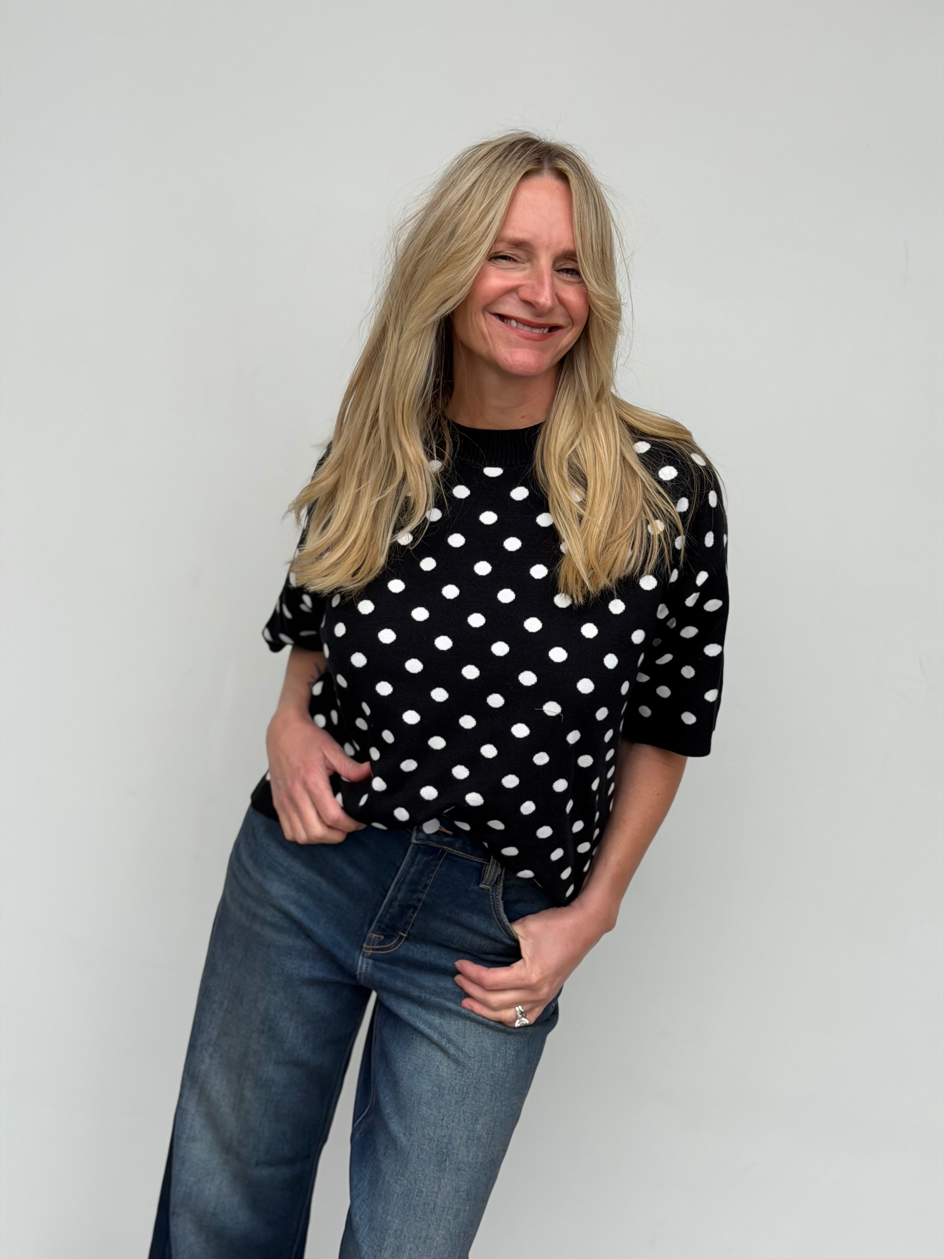 Embrace effortless spring style with this lightweight polka dot sweater. Featuring a classic crew neck and trendy polka dot pattern, it's designed with wide short sleeves and a gently loose fit for comfortable, flattering wear. True to size and perfect for layering or wearing solo as temperatures warm up.