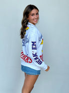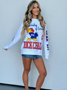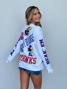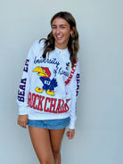 Show off your team spirit with the KU Kelcey Crew! This soft crewneck features a fun print with the iconic Jayhawks logo. Perfect for game day or any day, this crew is a must-have for any KU fan. Rock it with pride!