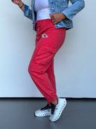 Get ready to lounge in style with our Officially licensed KC Cargo Sweats. In a washed red color and featuring cargo pockets, these sweats are perfect for a day of relaxation. The super soft material adds an extra level of comfort, and the drawstring and cuffed pantleg provide a customizable fit. Officially licensed for the ultimate fan! Size up!