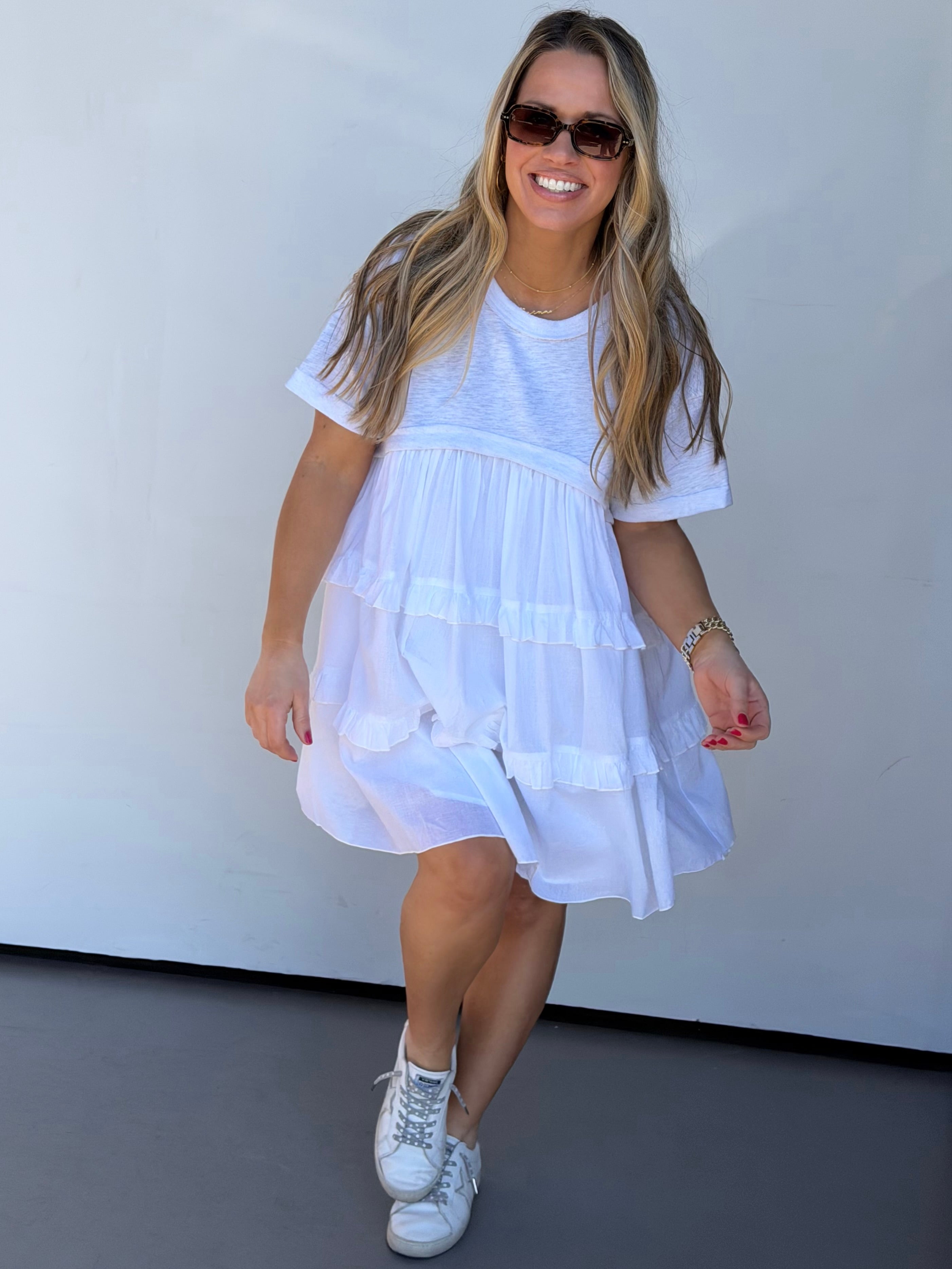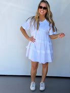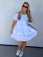 Effortless style meets everyday comfort in this babydoll dress, featuring a soft jersey top paired with a crisp poplin body for a flattering silhouette. Practical pockets keep your essentials close, while the wide neckline offers a relaxed, modern look. True to size and perfect with tennis shoes for a casual, put-together vibe.