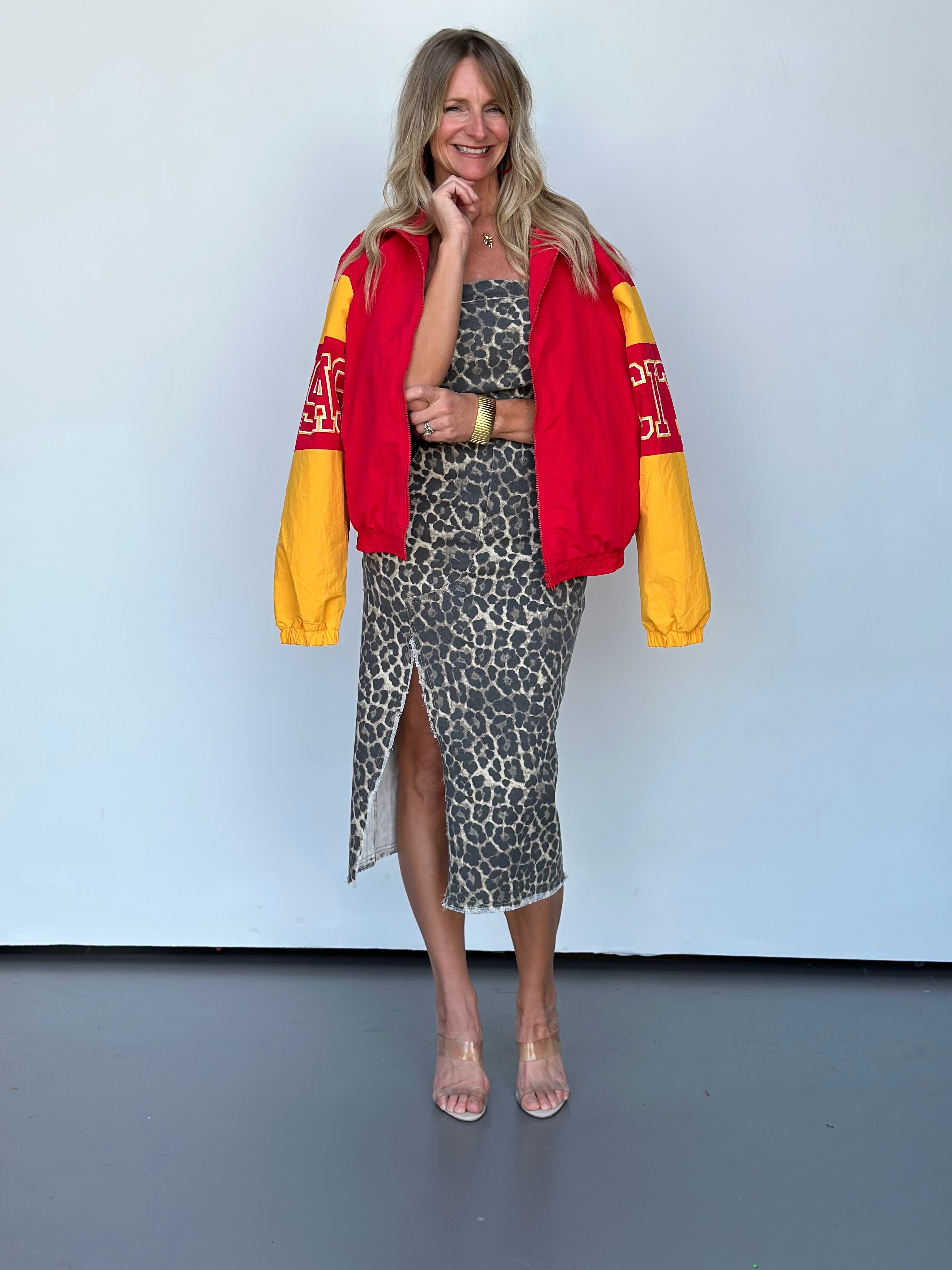 This expertly crafted Leopard Denim Tube Dress combines fashion-forward design with practical comfort. Featuring a distinctive leopard pattern on durable denim, the dress is enhanced with functional pockets and a secure zipper and eyelet closure. The raw hem adds an edgy, contemporary touch while the generous stretch ensures a flattering, true-to-size fit that moves with your body throughout the day.