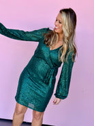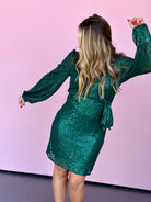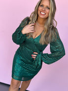 Twirl into the spotlight in this show-stopping Sequin Surplice Dress! Featuring dramatic sheer balloon sleeves that float with every move, a flattering surplice neckline, and a cinched tie waist that defines your silhouette. The snap button front closure makes getting ready effortless, while the knee-grazing hemline strikes the perfect balance between chic and flirty. Crafted with a touch of stretch for all-day comfort, this true-to-size stunner comes in rich red and hunter green. Whether you're heading to a party or turning