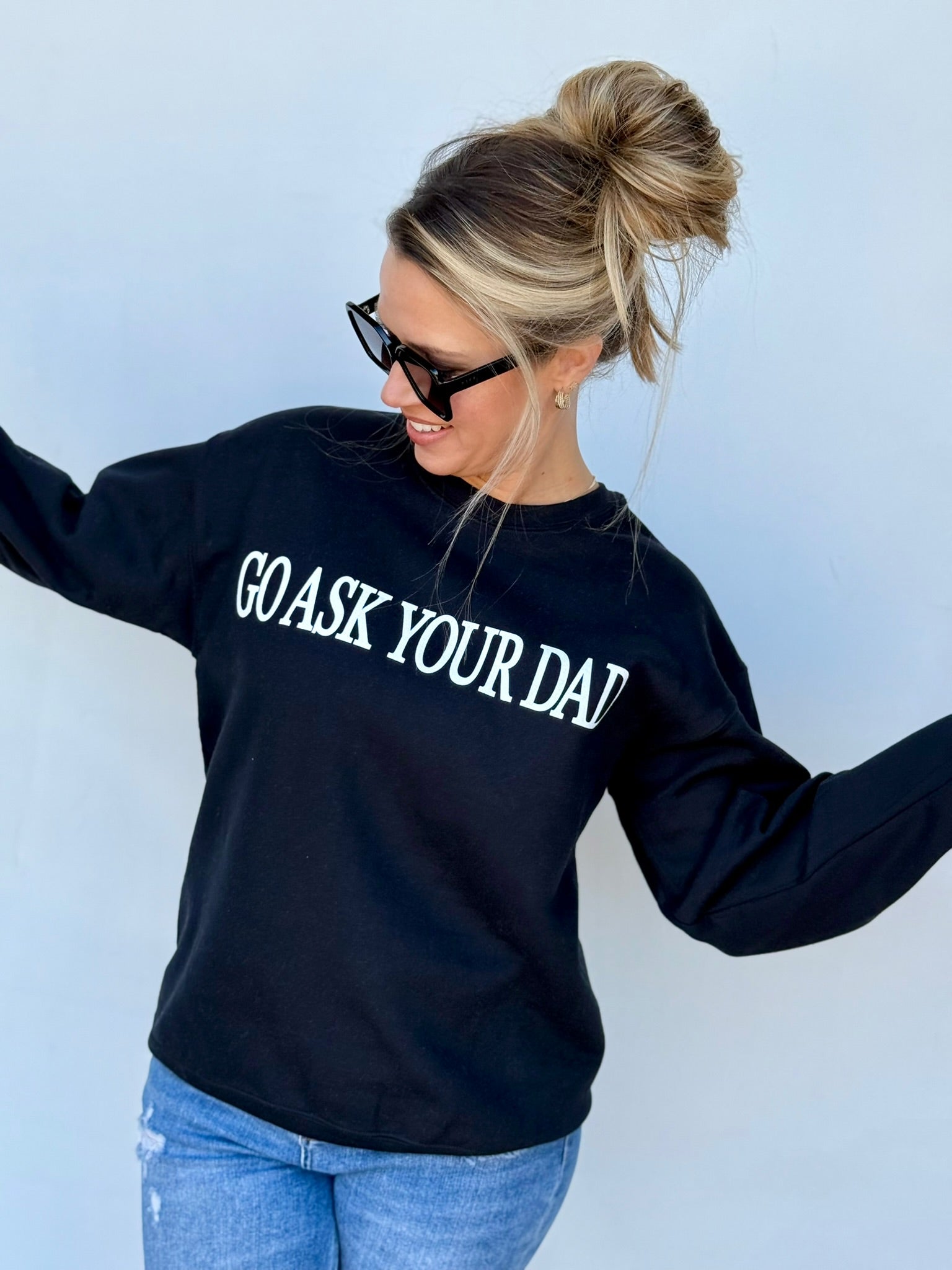 "Let this Go Ask Your Dad sweatshirt do the talking for you (because sometimes it's just easier that way). This quirky crewneck is perfect for those who like to keep it light and playful. Go ahead, ask your dad - and don't forget to wear this sweatshirt while doing so!"