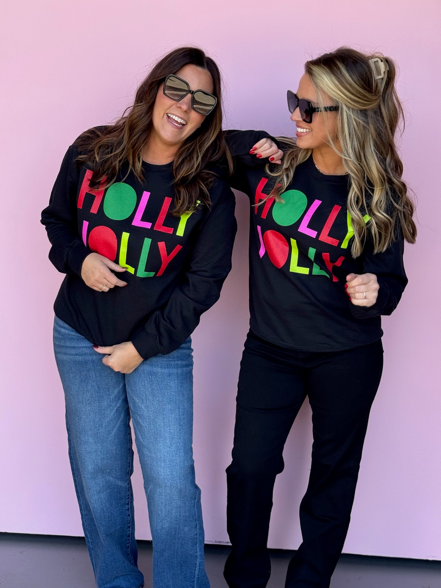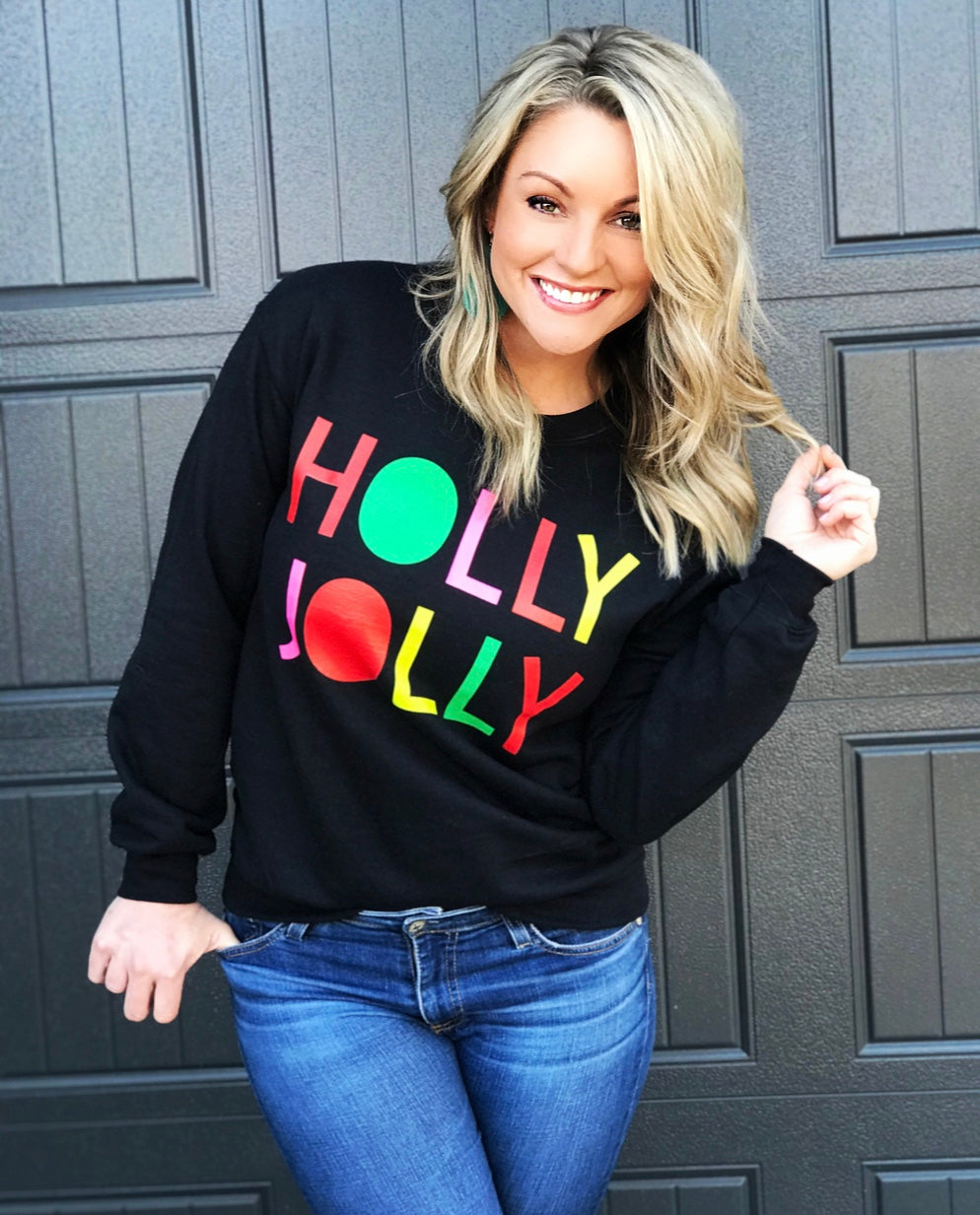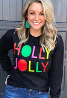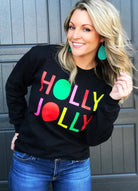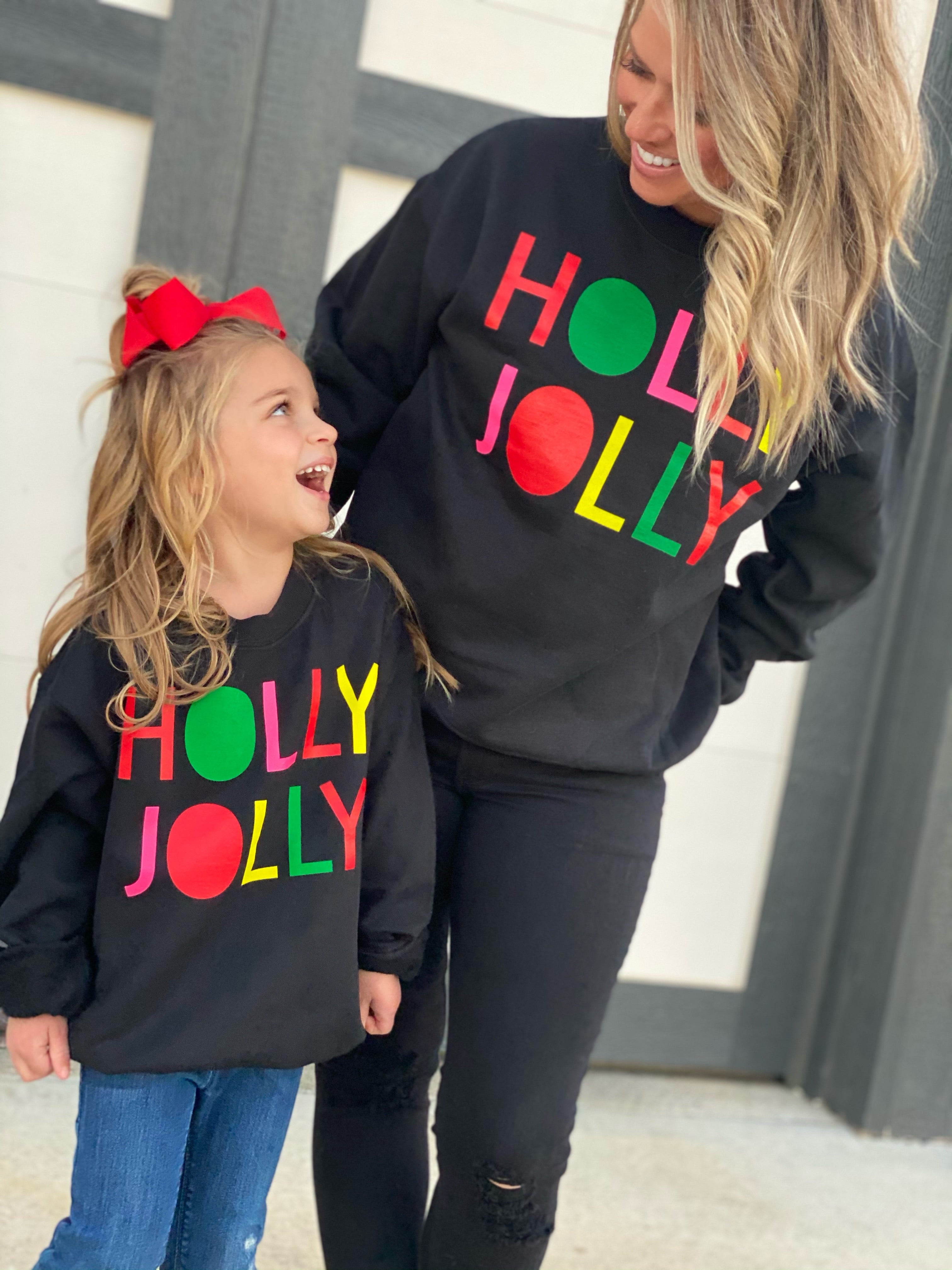 This sweatshirt might just be our most favorite sweatshirt ever. The black sweatshirt with the brightly colored font, will keep you HOLLY and JOLLY all year long!!!!!!