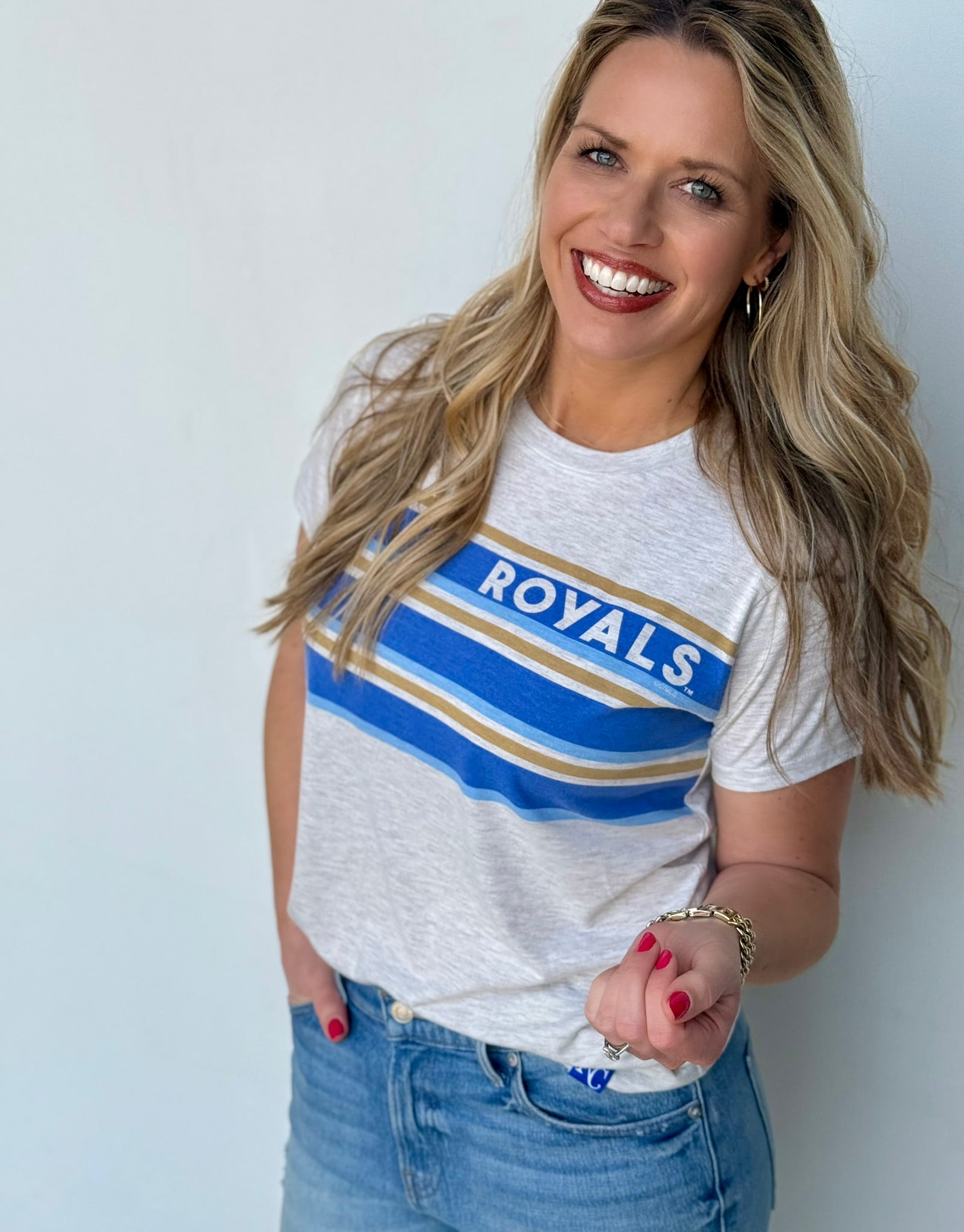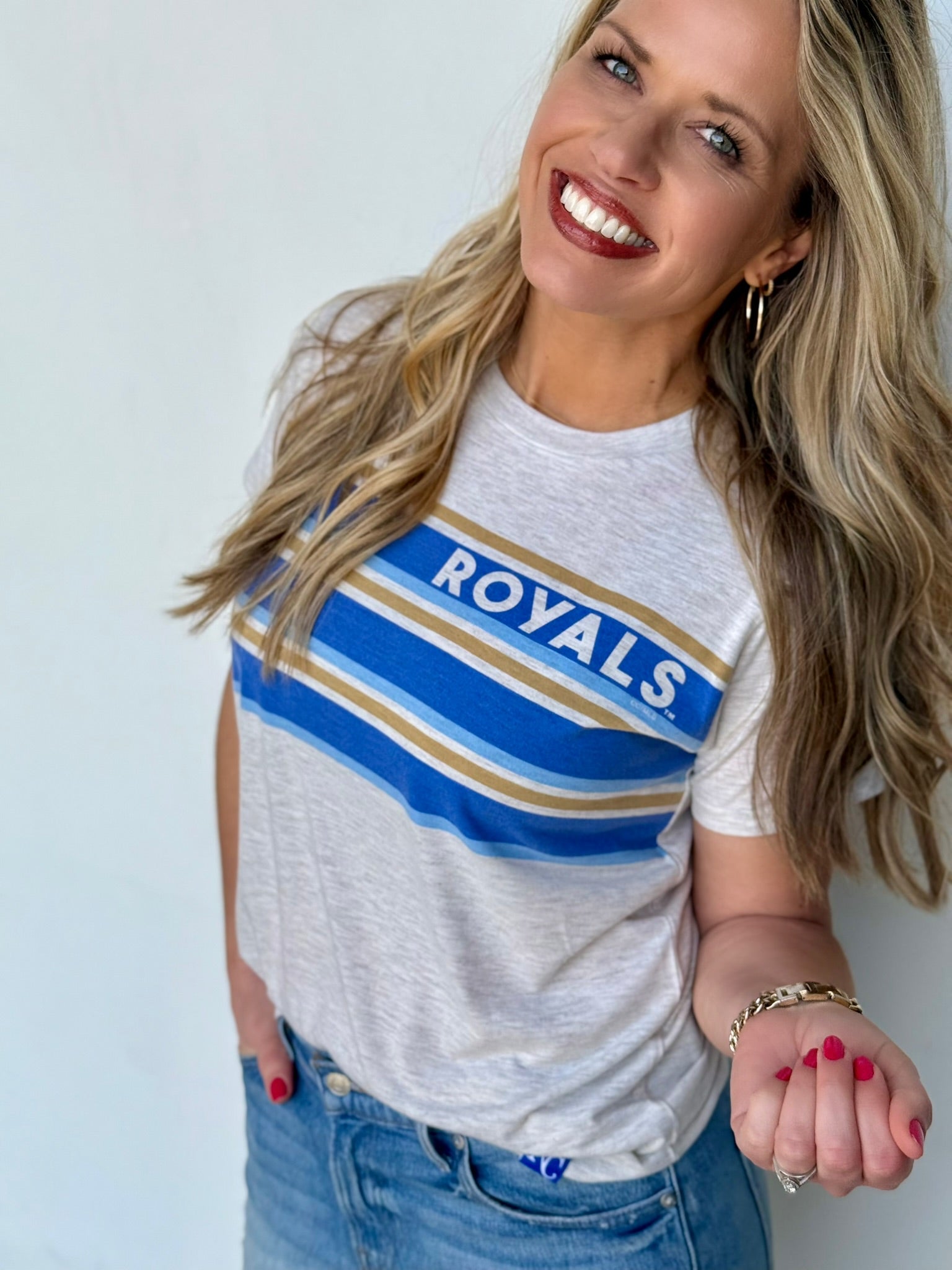 Throw on this officially licensed Royals tee and celebrate in style. Crafted from super soft fabric that feels as good as it looks, it's cut slightly cropped and keeps things light with a breathable, weightless feel. A playful stripe detail runs across the front for that extra touch of personality. True to size, it's the perfect piece for game day or everyday wear.
