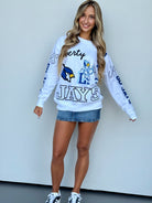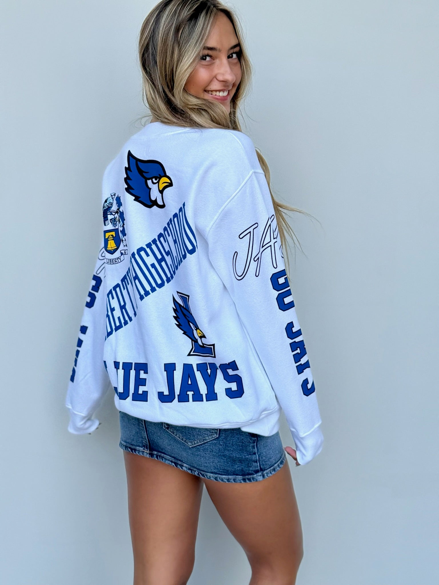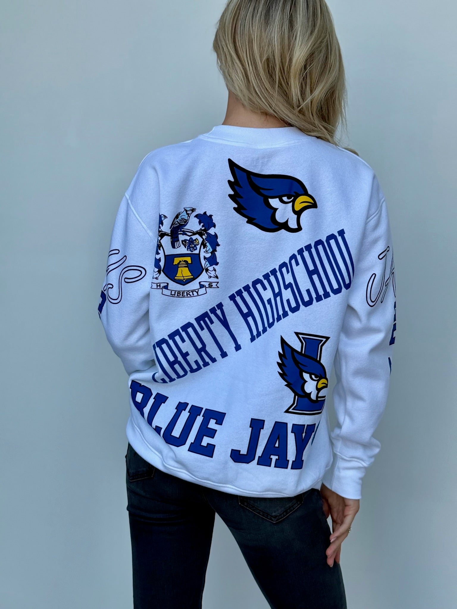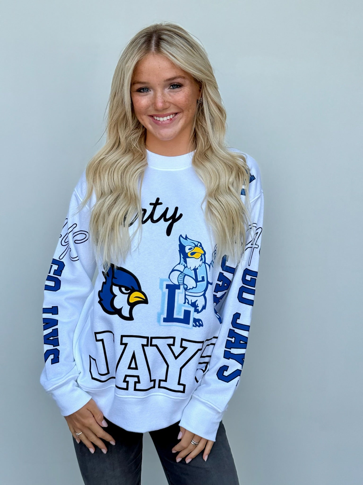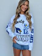 Score a touchdown in style with the Jays Kelcey Crew! This crewneck sweatshirt features a fun Liberty blue jays design and is made from soft, comfortable material. Perfect for high school students looking to add some fun to their wardrobe. (Go team!)