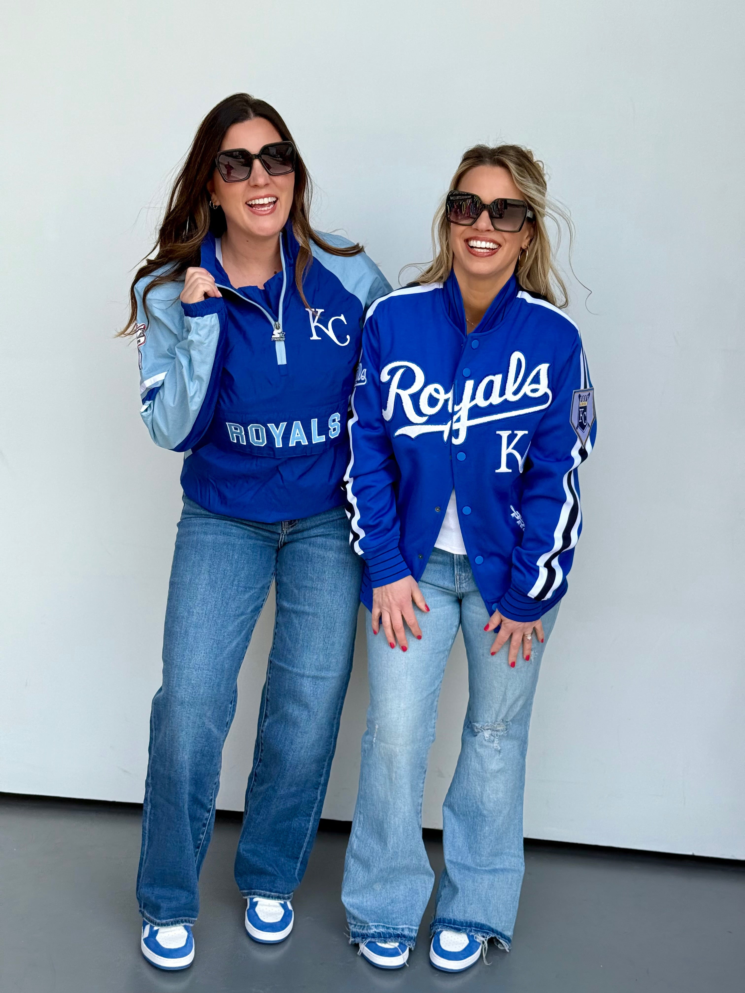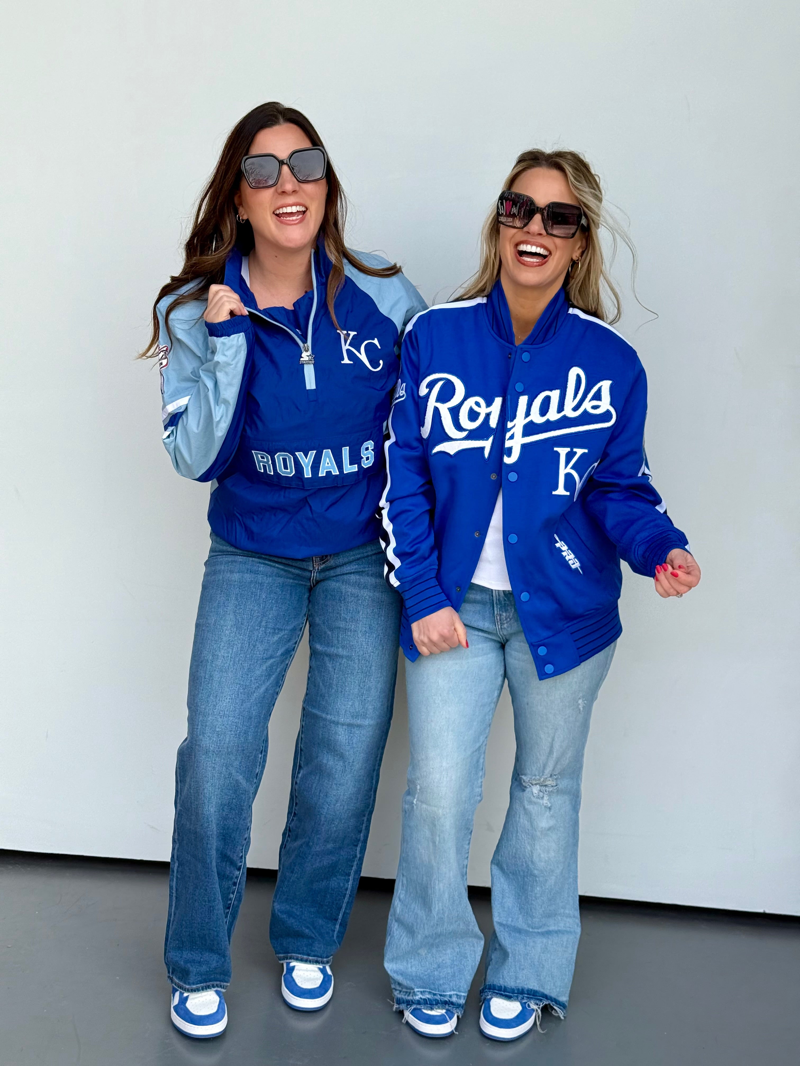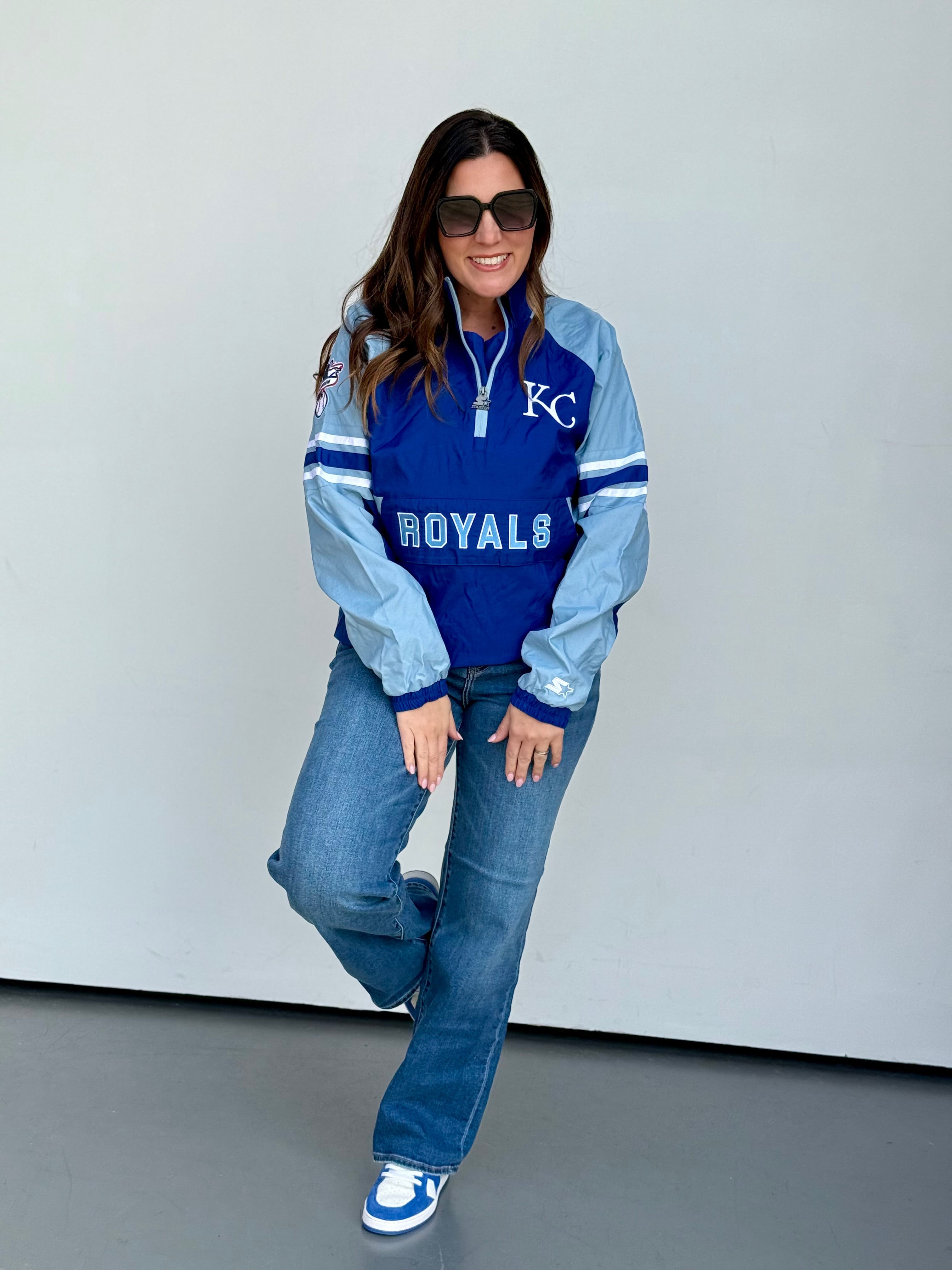 Layer up in vintage-inspired style with this oversized Starter nylon pullover in rich royal blue. Featuring a playful patchwork design accented with embroidery details, this piece brings nostalgic charm to your everyday rotation. The 1/4 zip front makes it easy to adjust your warmth, while functional side pockets and a convenient side zip keep your essentials within reach. Perfect for those who love mixing retro vibes with modern comfort.