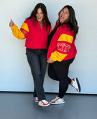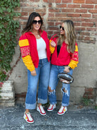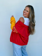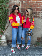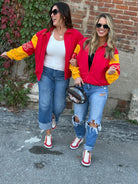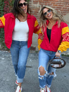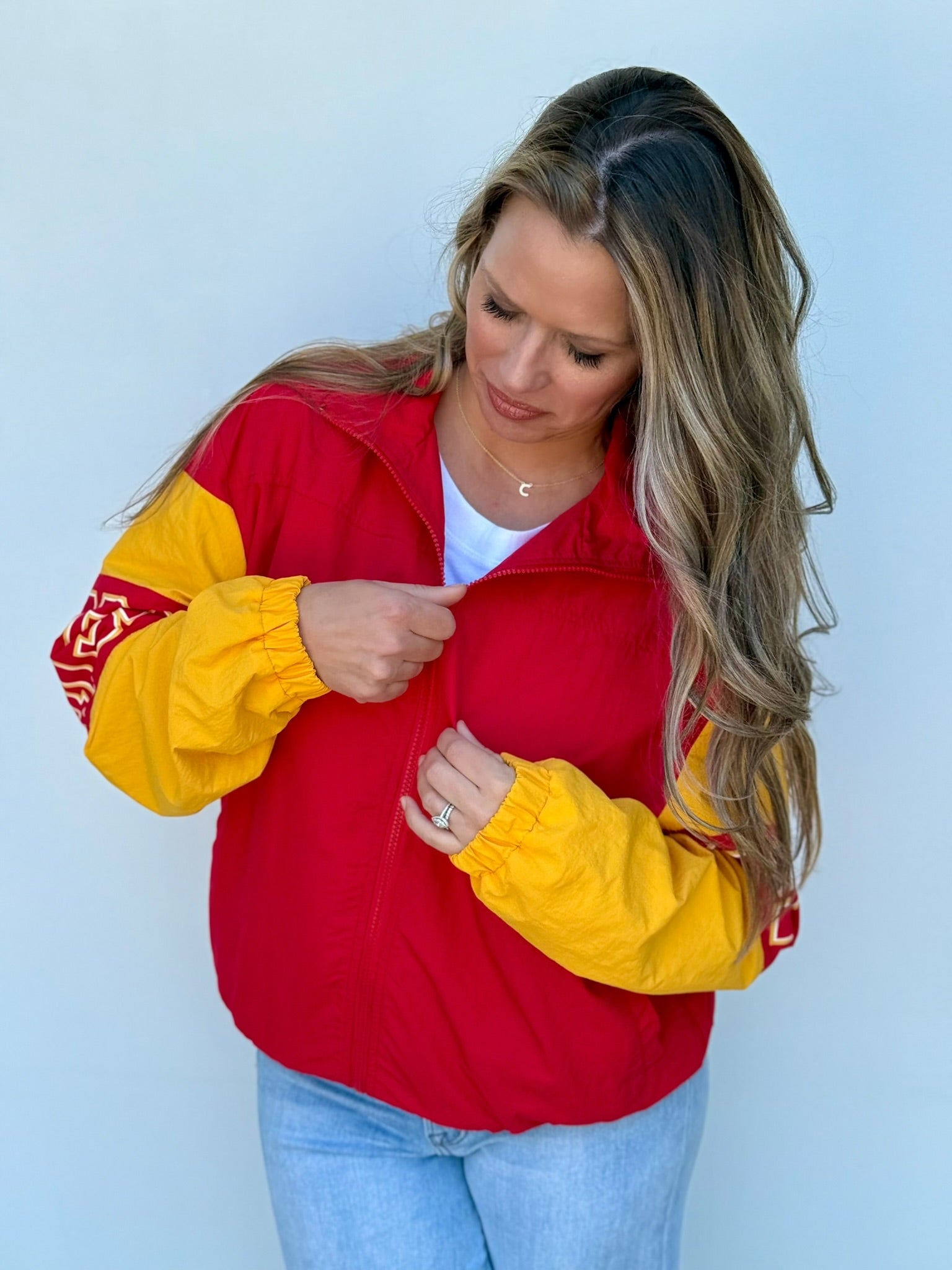 Bold, vintage, and game day ready — our Custom Retro KC Jacket is a Love Letters exclusive you won’t find anywhere else. With its throwback red and yellow color blocking and Kansas City sleeve lettering, this sporty zip-up brings all the retro vibes.