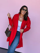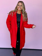 Wrap yourself in cozy luxury with our Red Coatigan—the perfect blend of cardigan comfort and coat sophistication. Crafted from sumptuous soft fabric that feels like a warm hug, this custom-made piece features a flattering true-to-size fit, practical pockets for your essentials, and a sleek button closure. Whether you're layering for chilly days or making a bold fashion statement, this vibrant red stunner keeps you toasty and stylish. Your new favorite piece is here!