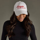 White baseball hat Red "Tailgates & Touchdowns" embroidered on front 100% Cotton Adjustable closure Min. Qty. 2