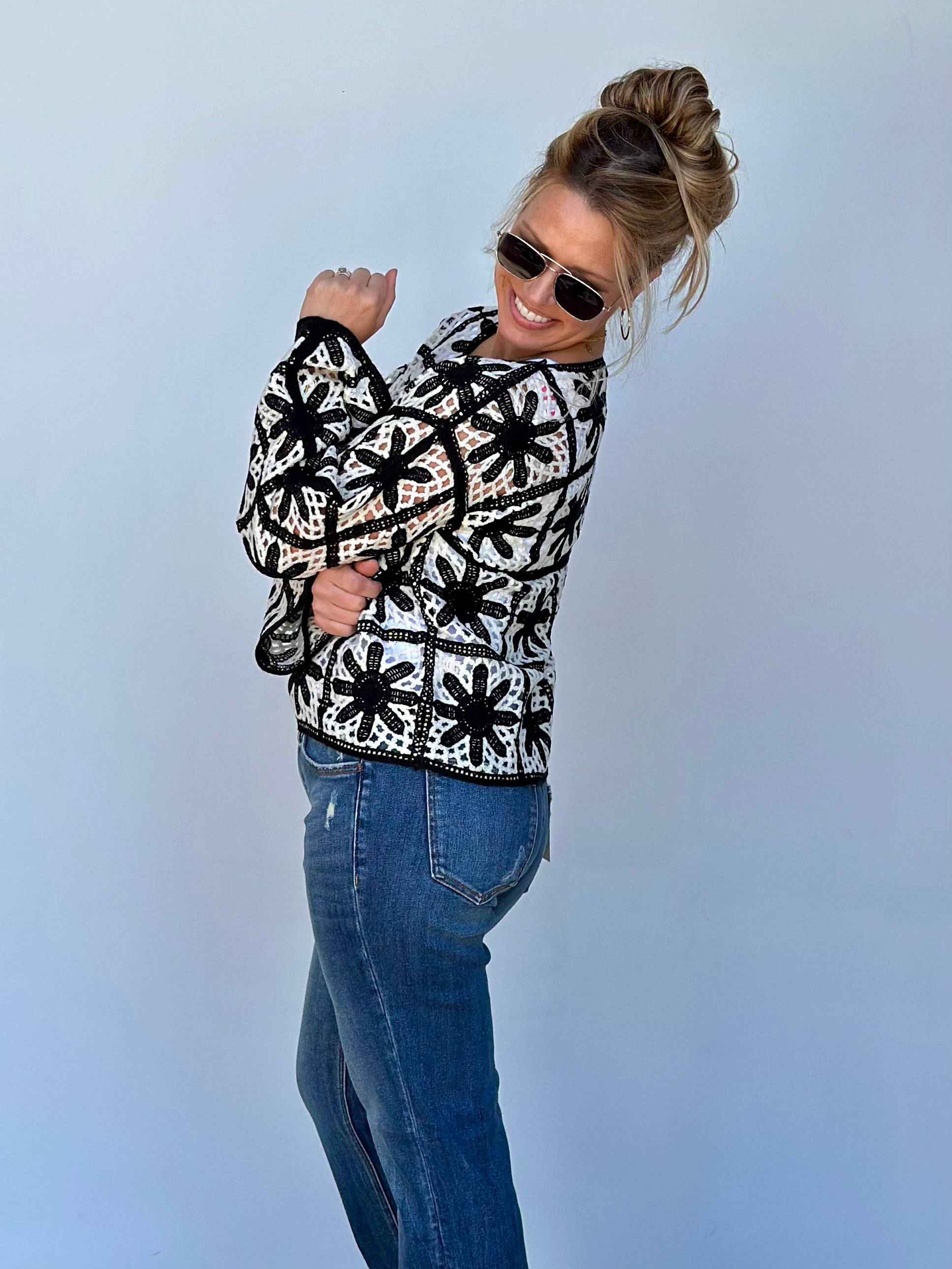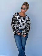 Embrace your inner flower child with this delightful crochet knit top! The playful black and white flower pattern adds vintage charm while the loose fit keeps you comfy. Slight bell sleeves flutter with your every move, making this top perfect for sunny days or layering when the breeze picks up. Pair with your favorite jeans for an effortlessly cool look!