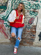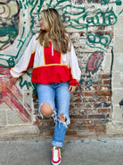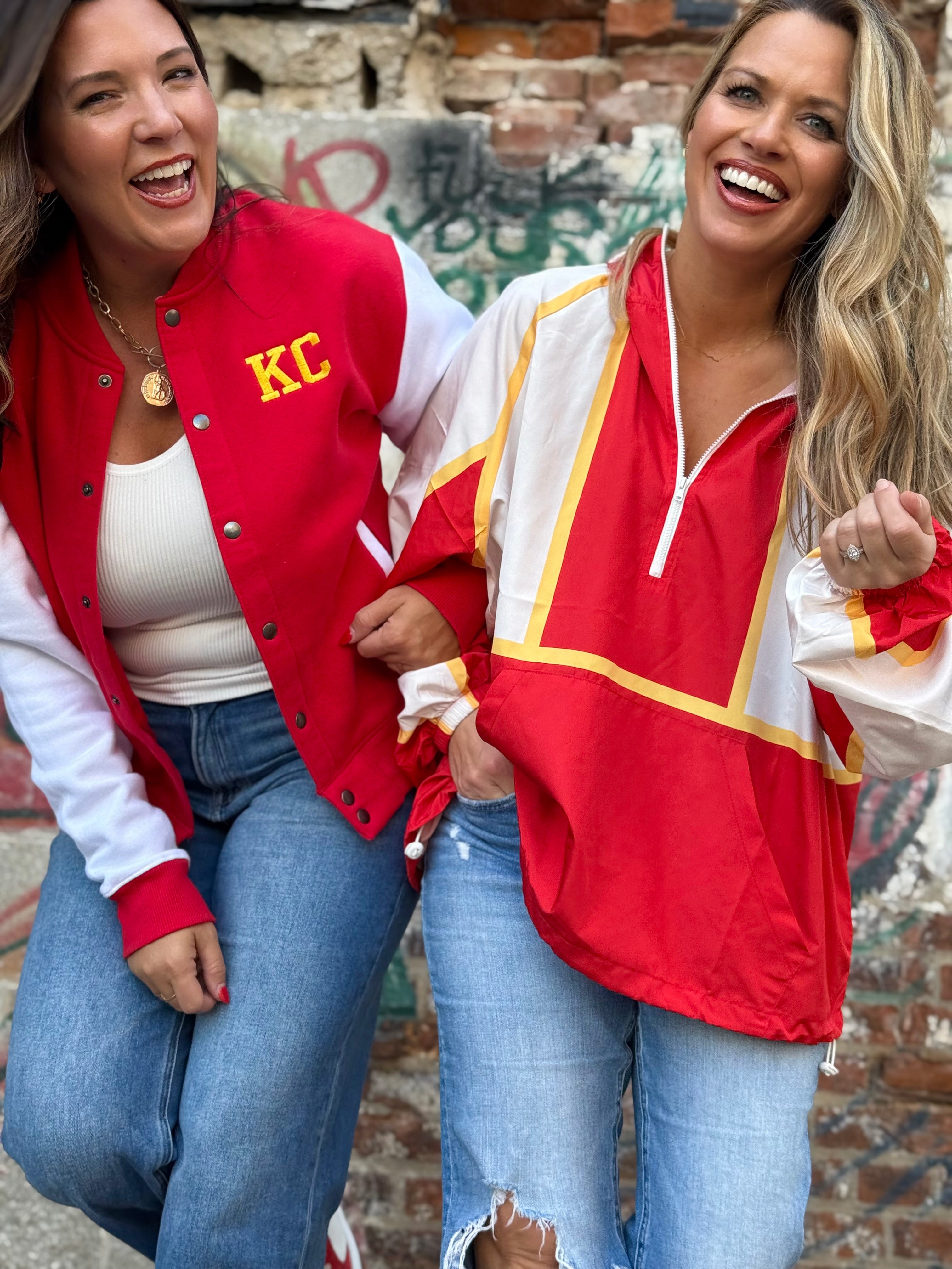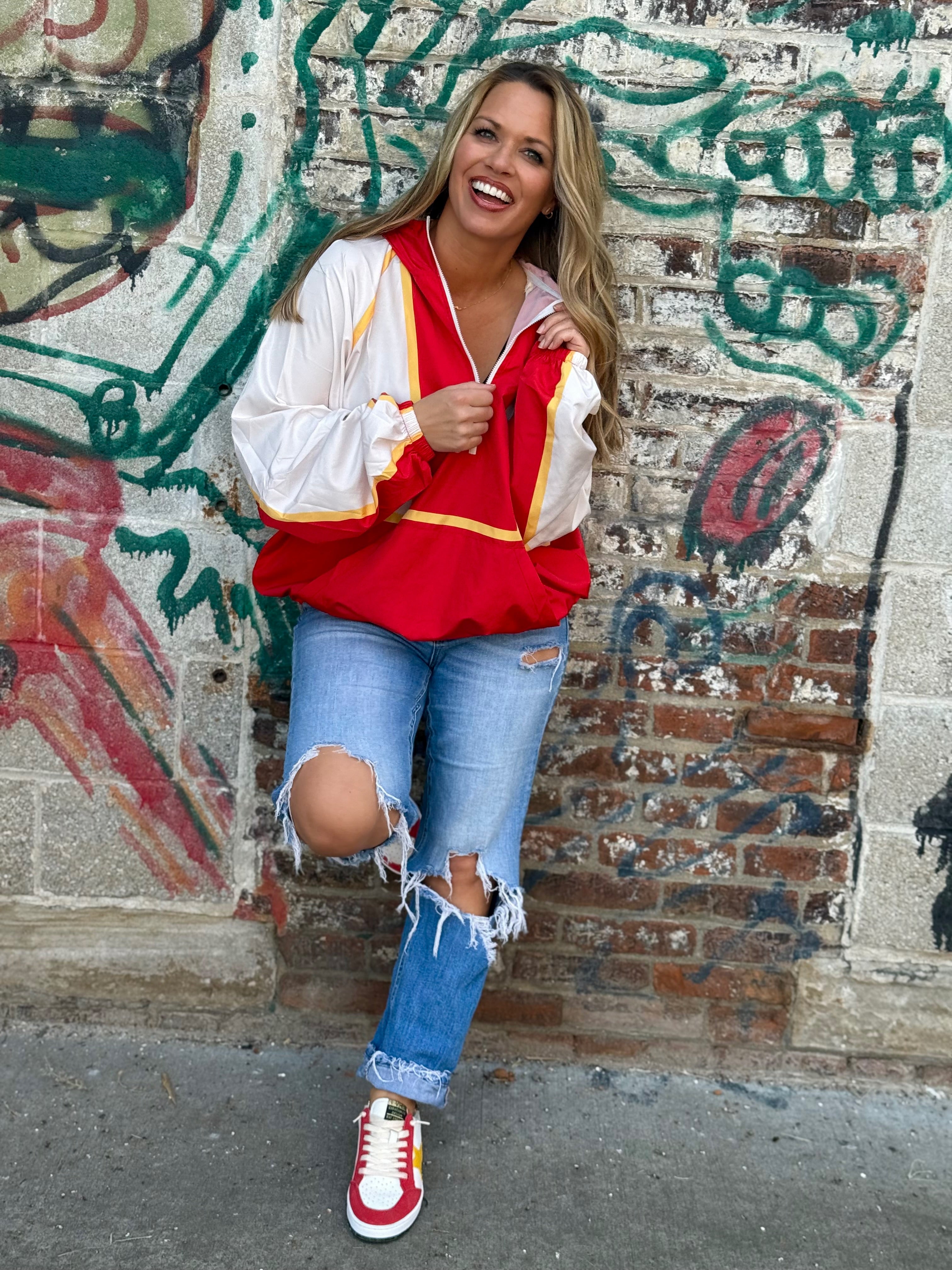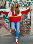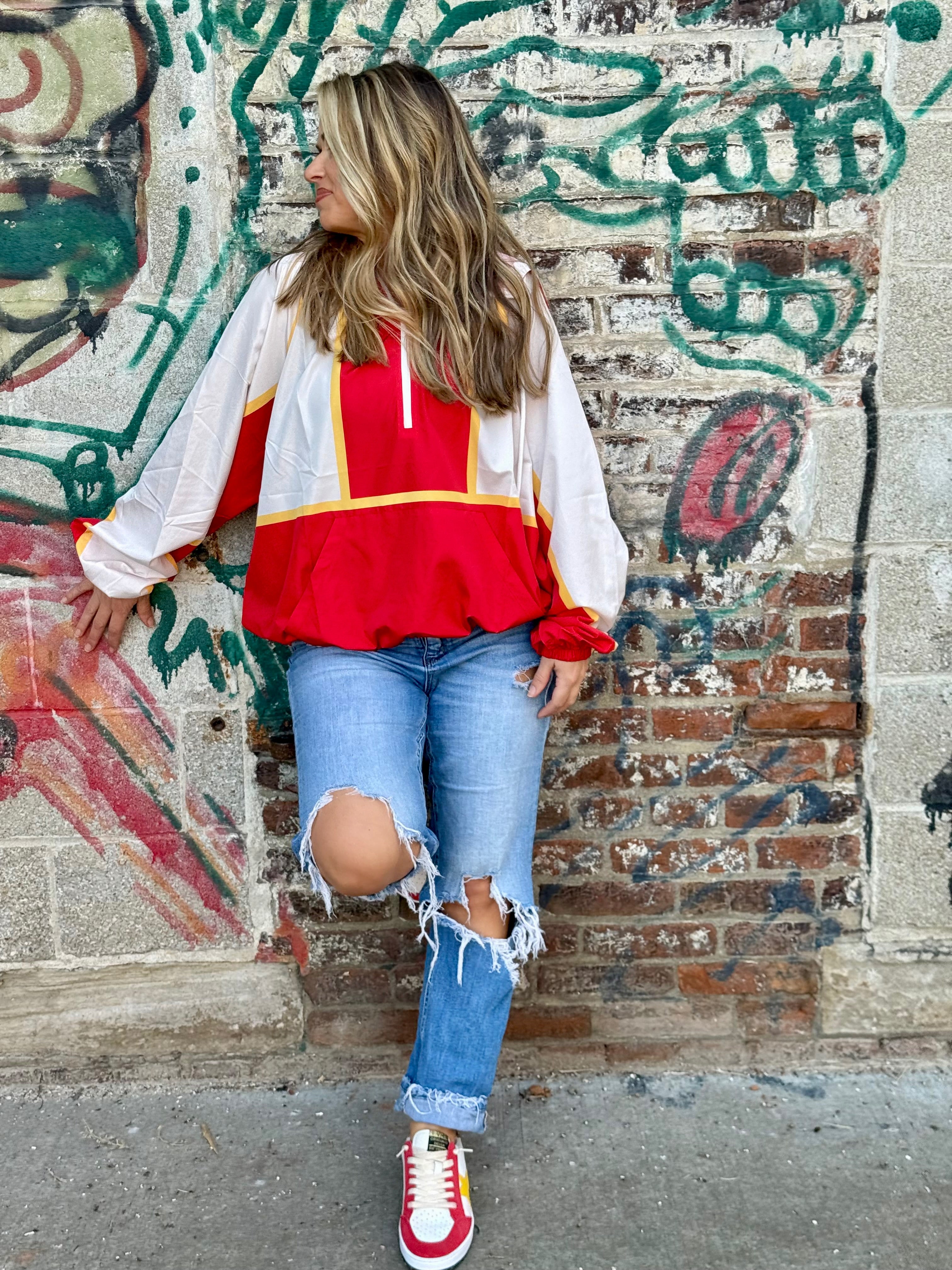 Don't let the weather weigh you down. Stay light and breezy with our oversized First Down Windbreaker. With a half zip pullover design, hood, and pockets, this lightweight windbreaker features a playful color block pattern. Rain or shine, you'll be effortlessly cool.