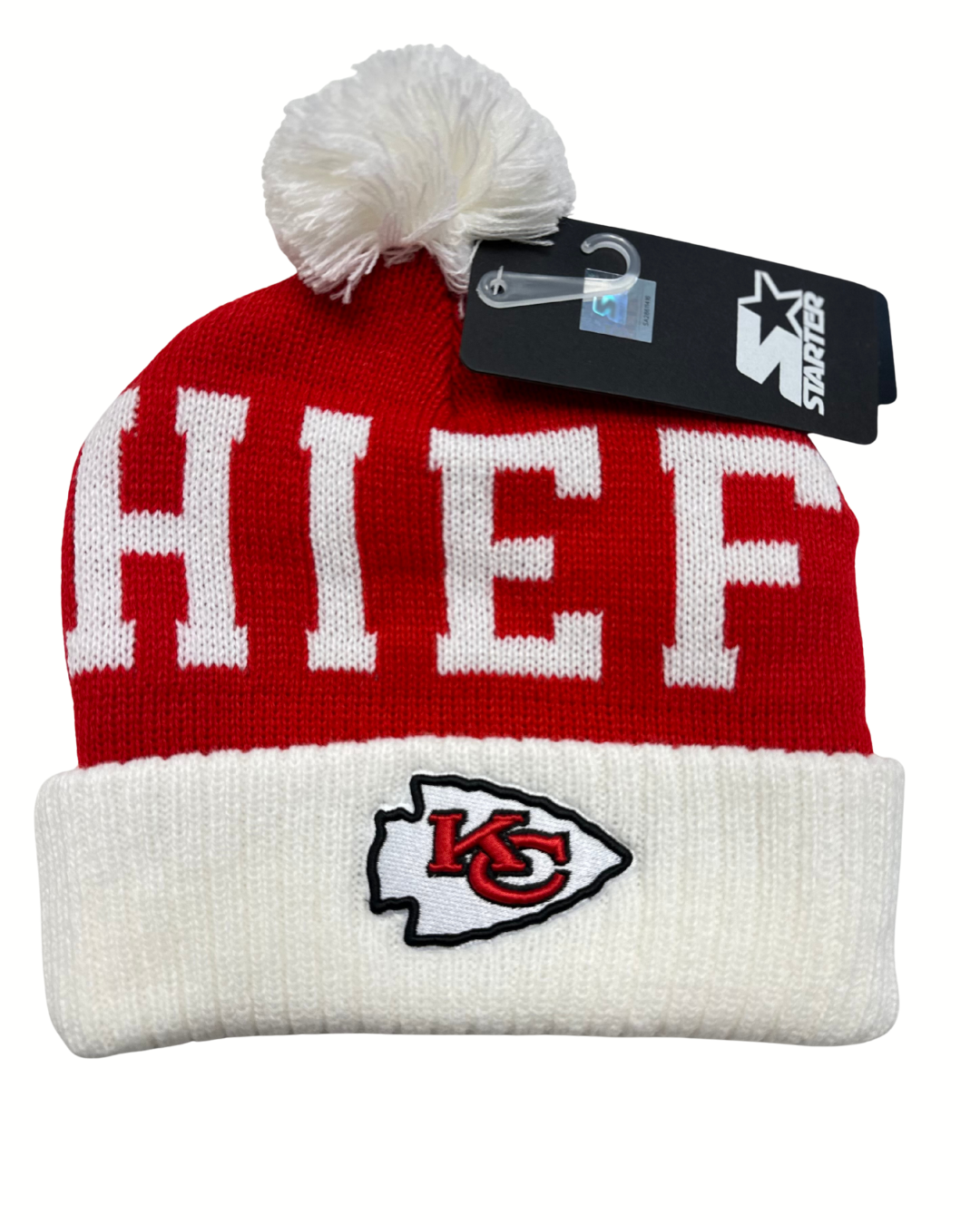 Stay warm and rep your Chiefs pride with this classic Starter beanie! Featuring the iconic arrowhead patch front and center, this red and white knit cap keeps the cold at bay while showing your team spirit. The fluffy white pom on top adds a playful touch that catches every eye in the stadium or on the street. One size fits most, making it the perfect grab-and-go accessory for any fan. Game day essential or everyday wear—this beanie's got you covered.