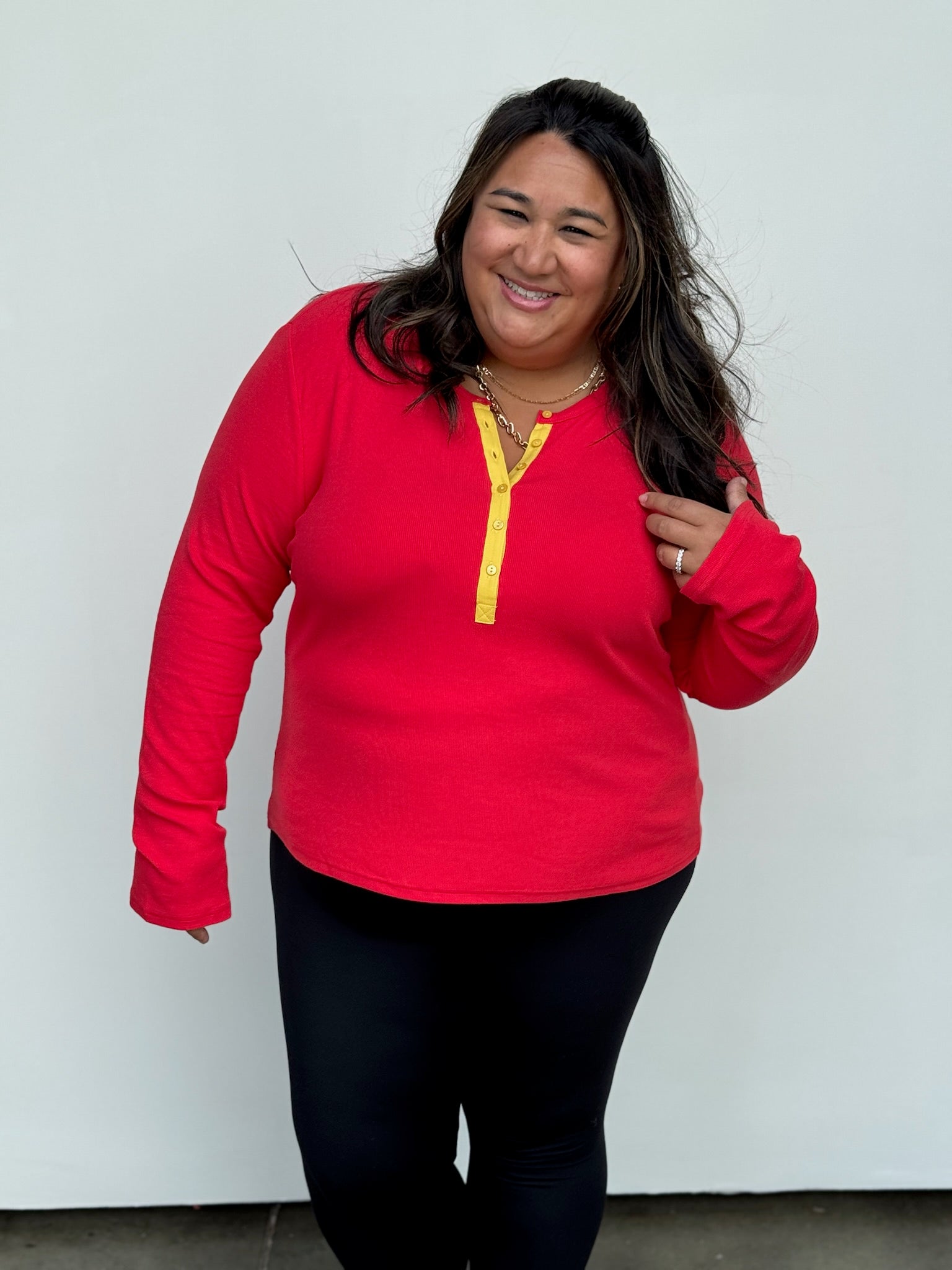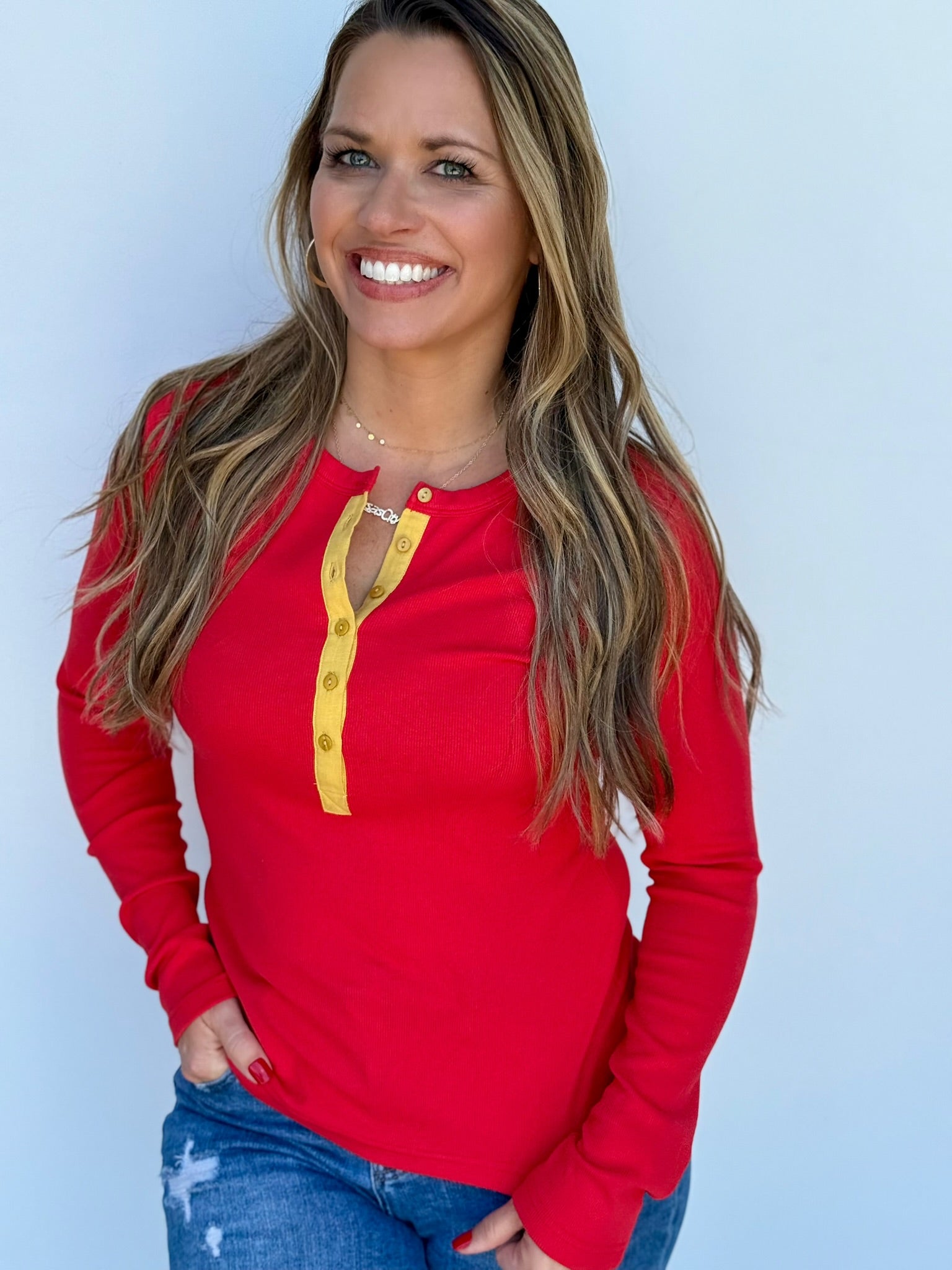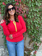 Introducing the Pick 6 Red Henley: the perfect blend of casual and stylish! With its 1/4 button up and vibrant red color, this shirt is sure to make a statement. Plus, the pop of yellow adds a playful touch. Upgrade your wardrobe with this quirky addition today!