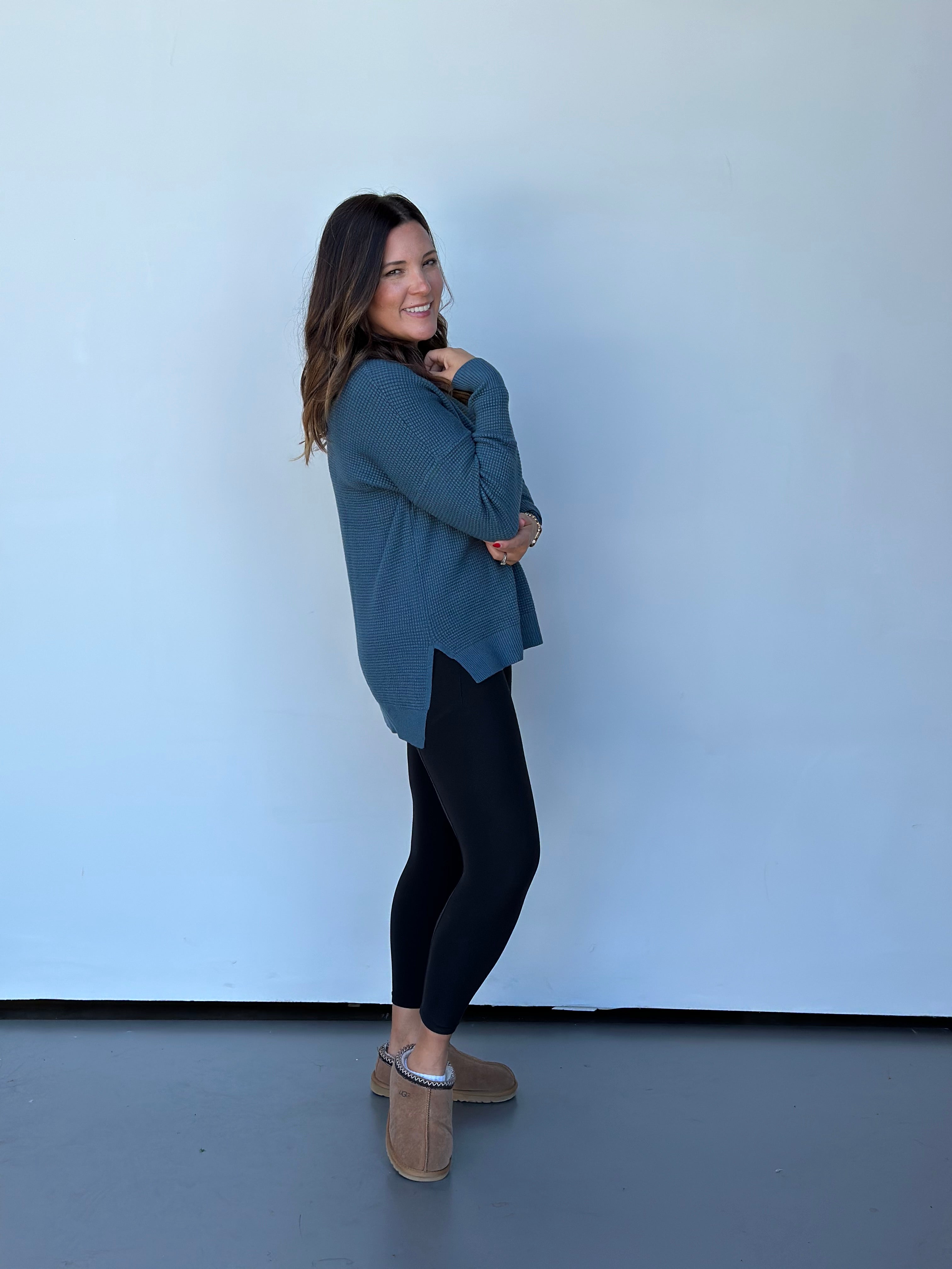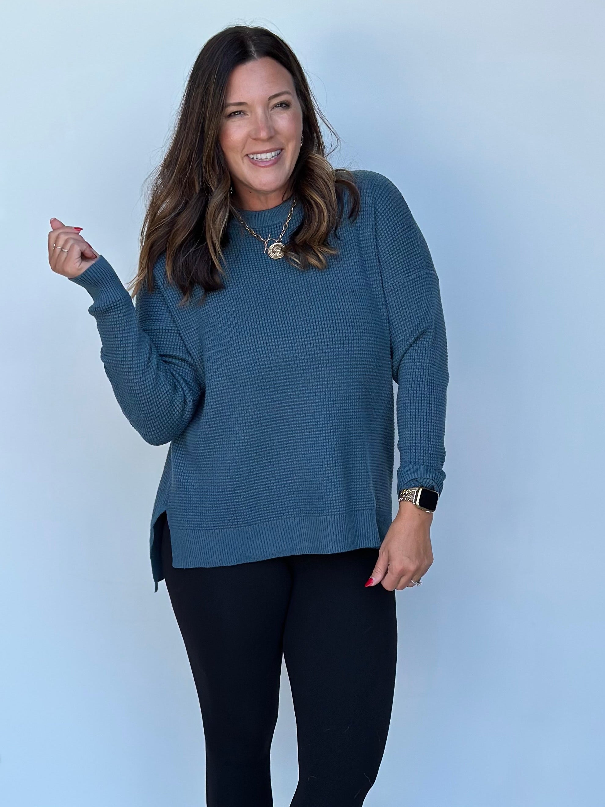 This long-sleeve waffle-knit sweater in a gorgeous blue fall shade is a perfect addition to any autumn wardrobe. Its medium weight makes it versatile for layering or wearing on its own, providing just the right amount of warmth for cooler days. The waffle-knit texture adds a touch of coziness and visual interest, while the rich blue color is both striking and seasonally appropriate. Whether paired with leggings for a laid-back look or with jeans for a more polished vibe, this sweater effortlessly combines comfort and style for fall.