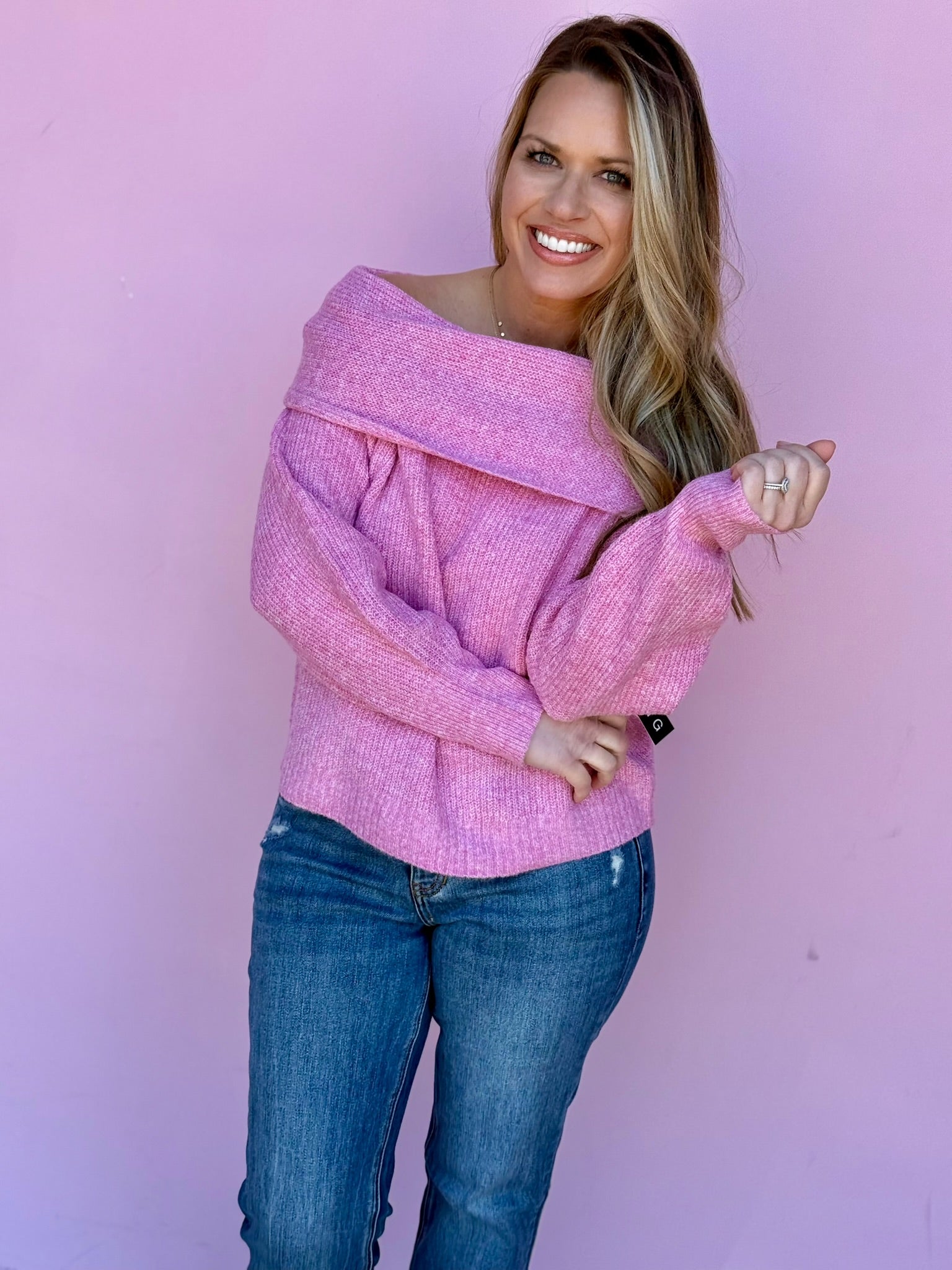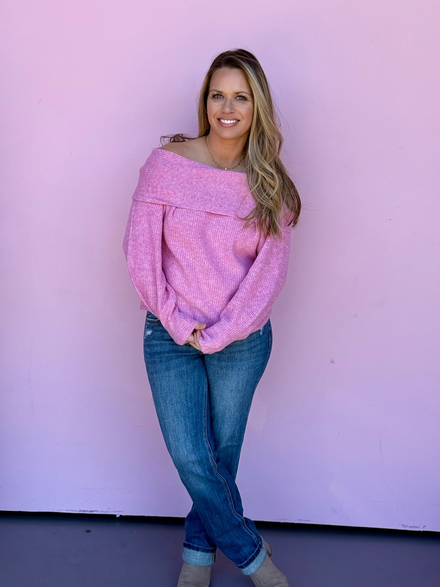 Slip into sweetness with our Pink Candy Off Shoulder Sweater—a lightweight layer that's as fun as it is flattering. The effortless off-shoulder silhouette brings a flirty edge to any outfit, while the airy knit keeps you comfortable all day long. True to size and ready to become your new go-to piece for casual charm and cozy vibes. We recommend sizing up if between sizes!