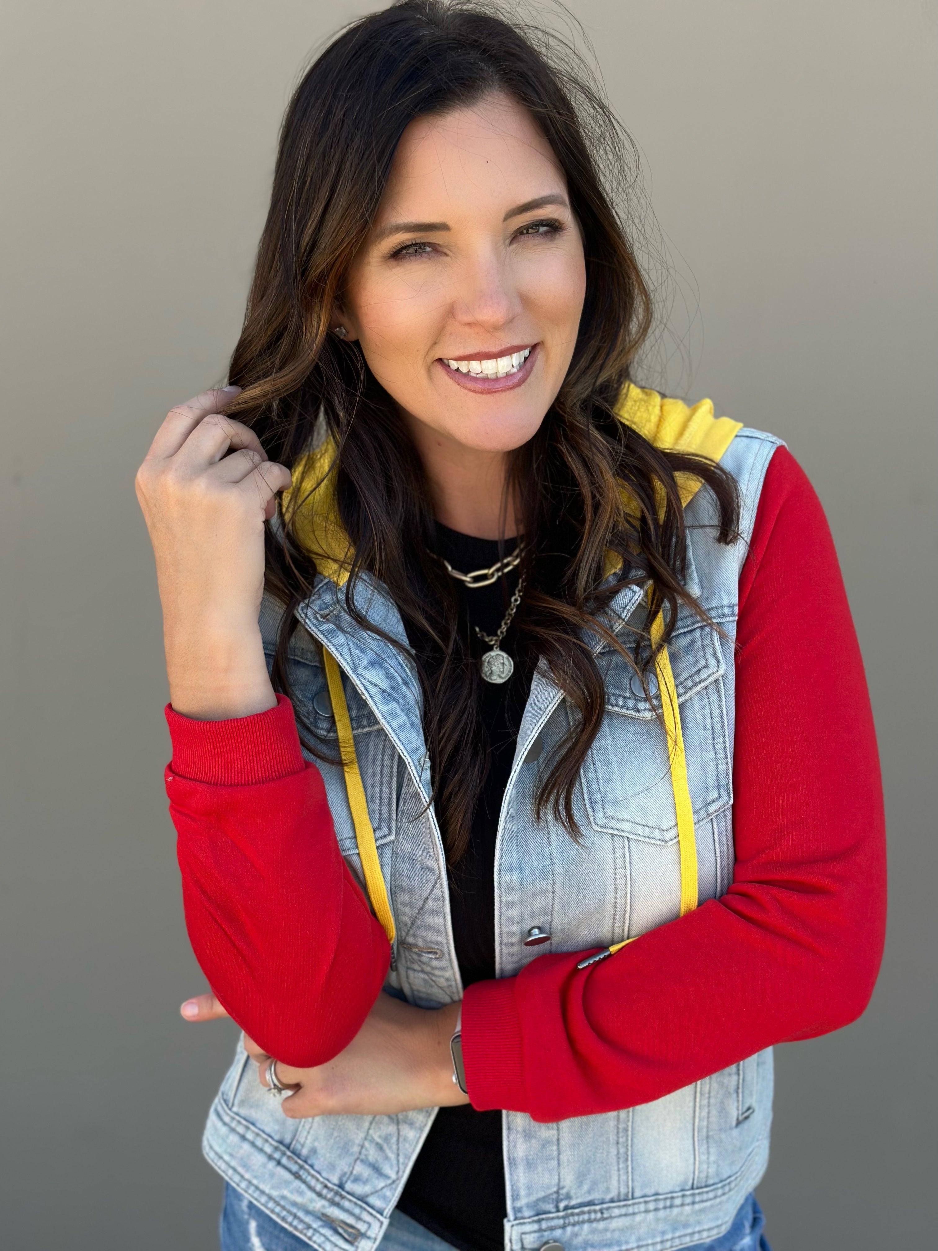 The must have item from our mailer THE CUSTOM JEAN JACKET!!!! We’ve created another unique & cool Love Letters exclusive that everyone is sure to adore! Our new jean jacket has a light wash denim body and sweatshirt style sleeves & hood, of course, our favorite Red & Gold colors!