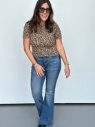 This expertly crafted Leopard Ribbed Top features a classic round neck and distinctive merrow edge hem for a polished finish. The form-fitting ribbed design accentuates your silhouette while the timeless leopard pattern adds versatile style to your wardrobe. For a more relaxed fit, consider sizing up one or two sizes from your standard measurement.